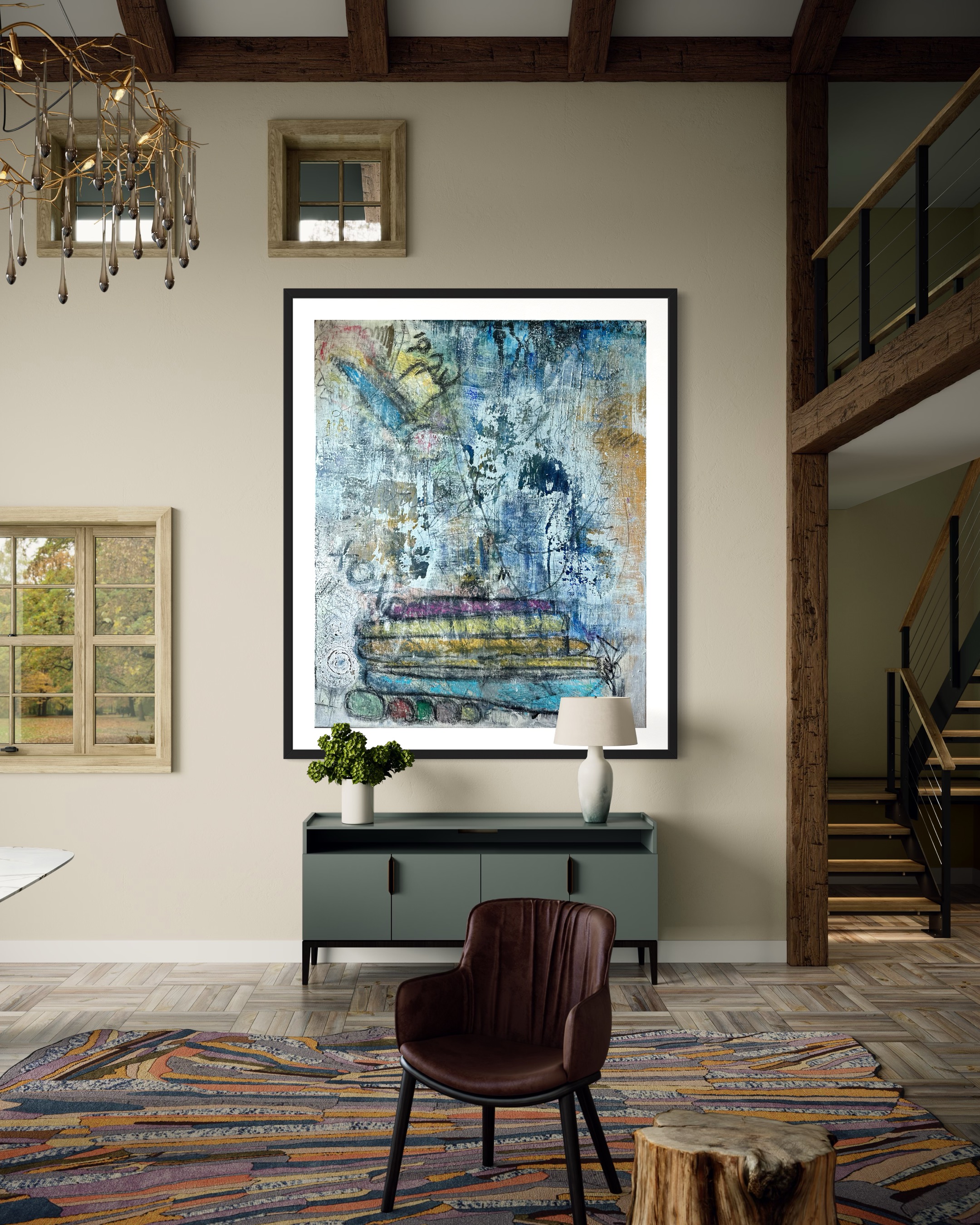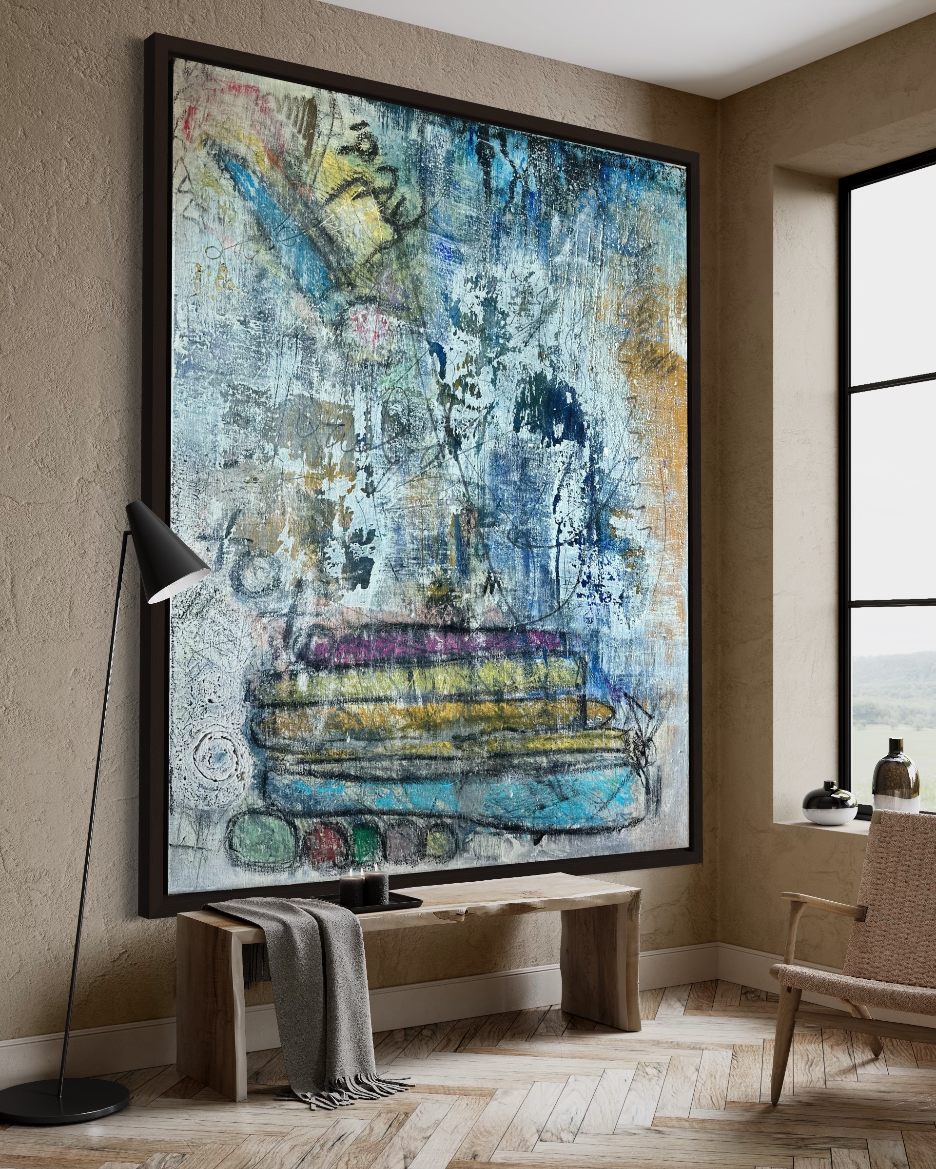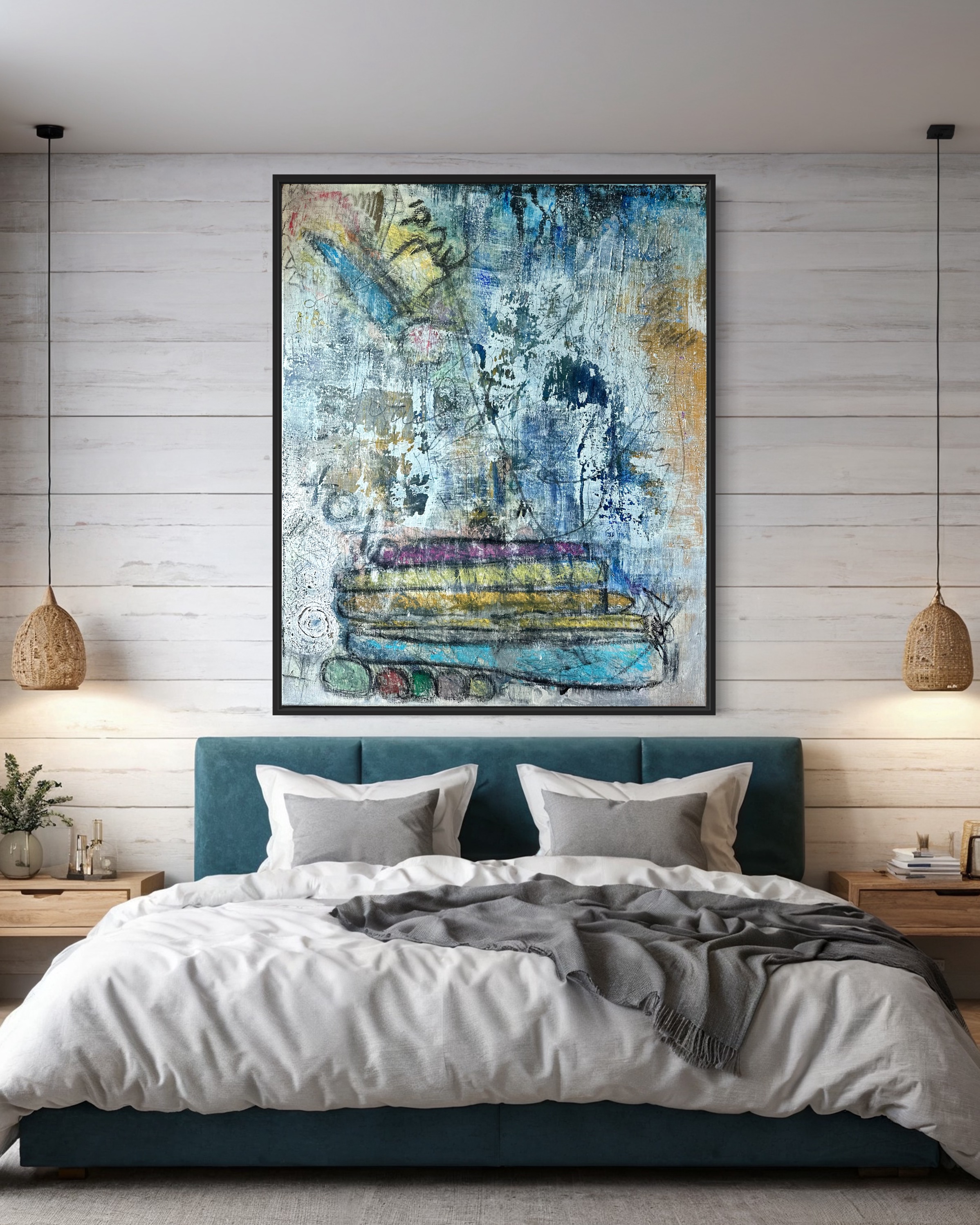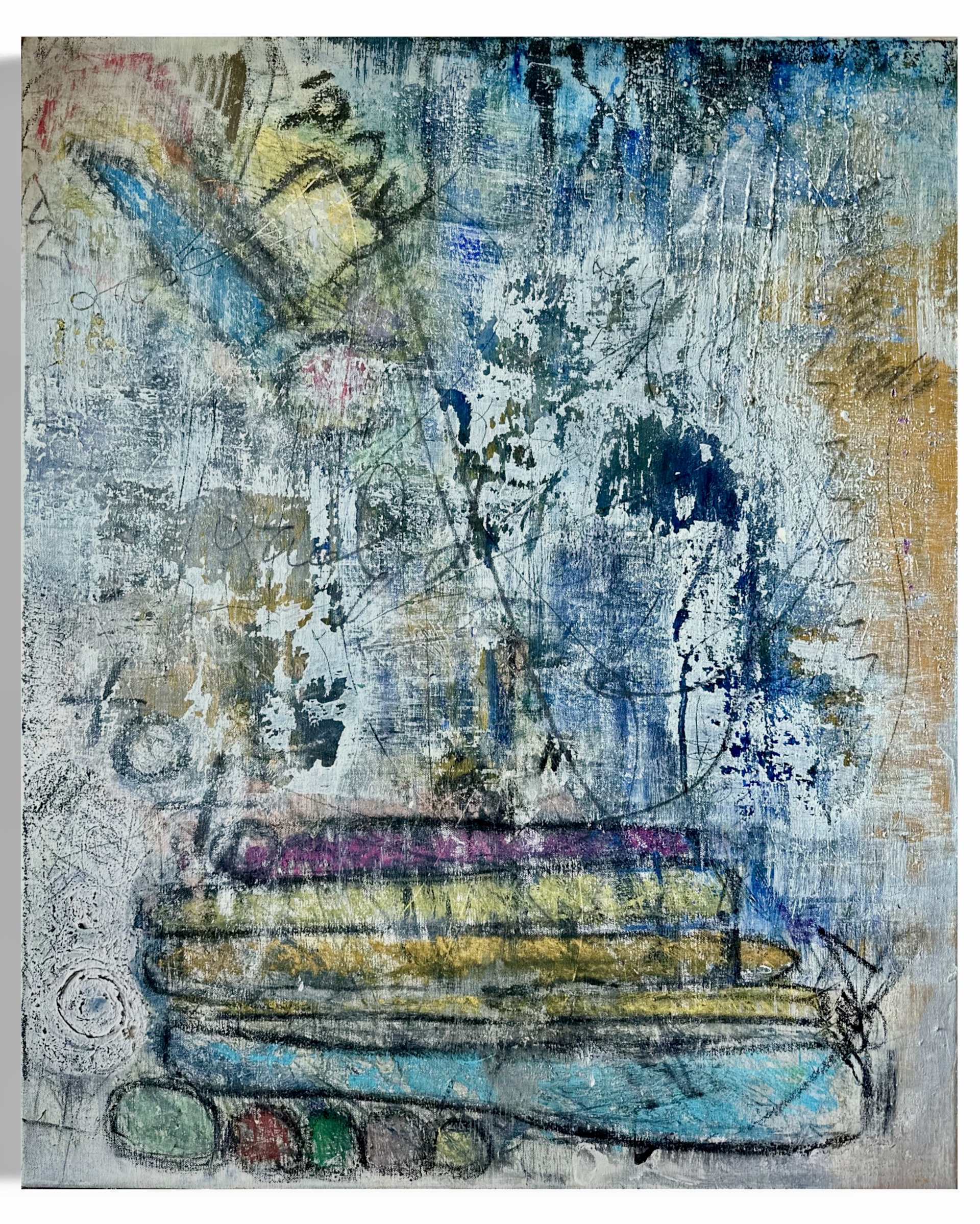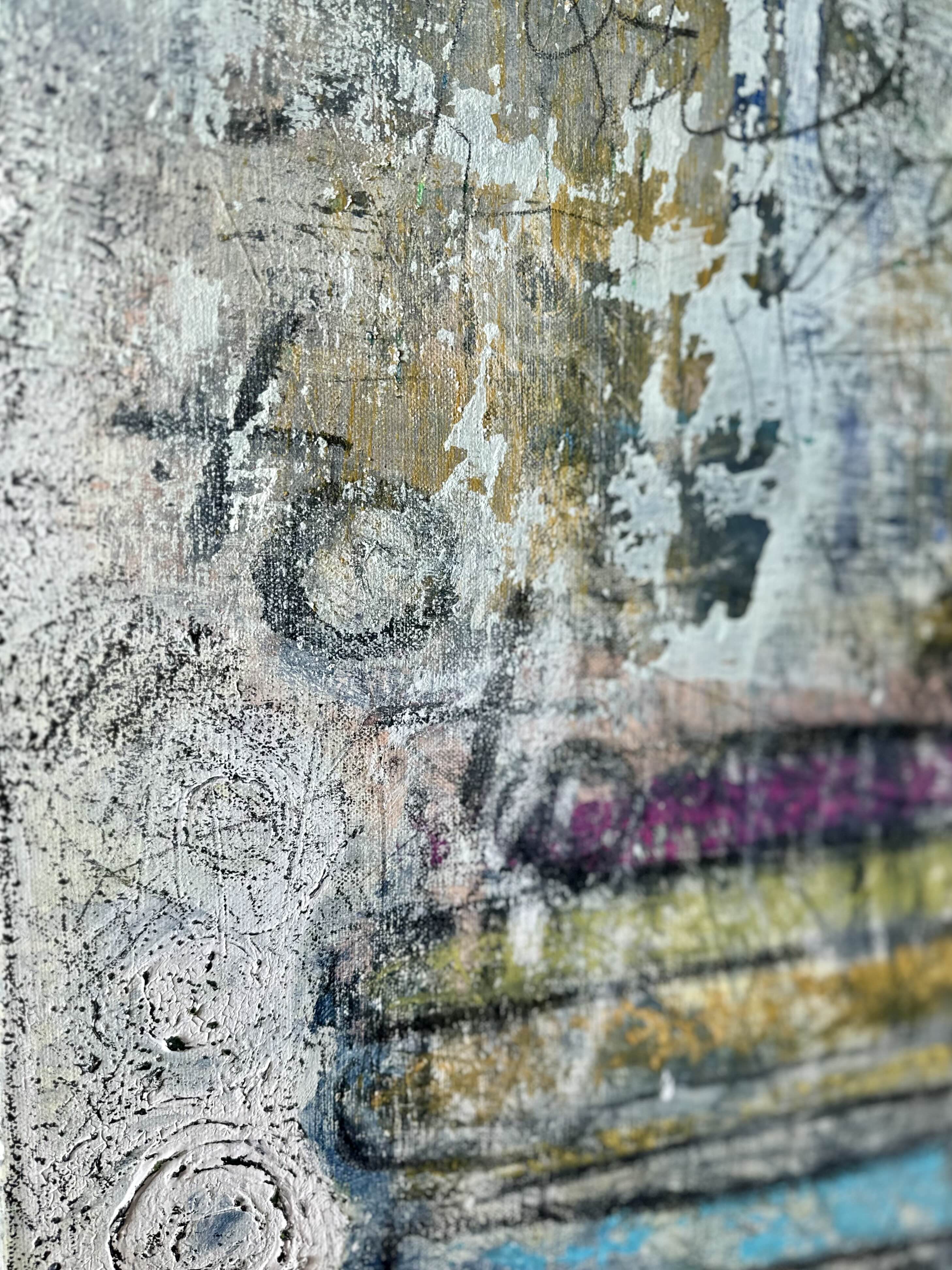 In creating this piece, I delved into a realm where abstract forms and symbols converge. I used acrylics, pencils, charcoal, oil pastels, and ink to layer sentiments of the past with glimpses of metaphysical explorations. This artwork embodies a rich tapestry of history and mystery, inviting viewers to contemplate the deeper connections between time, memory, and existence. Each stroke and color blend not only adds visual depth but also narratively threads together the old and the enigmatic, enriching any space with its thought-provoking presence.
