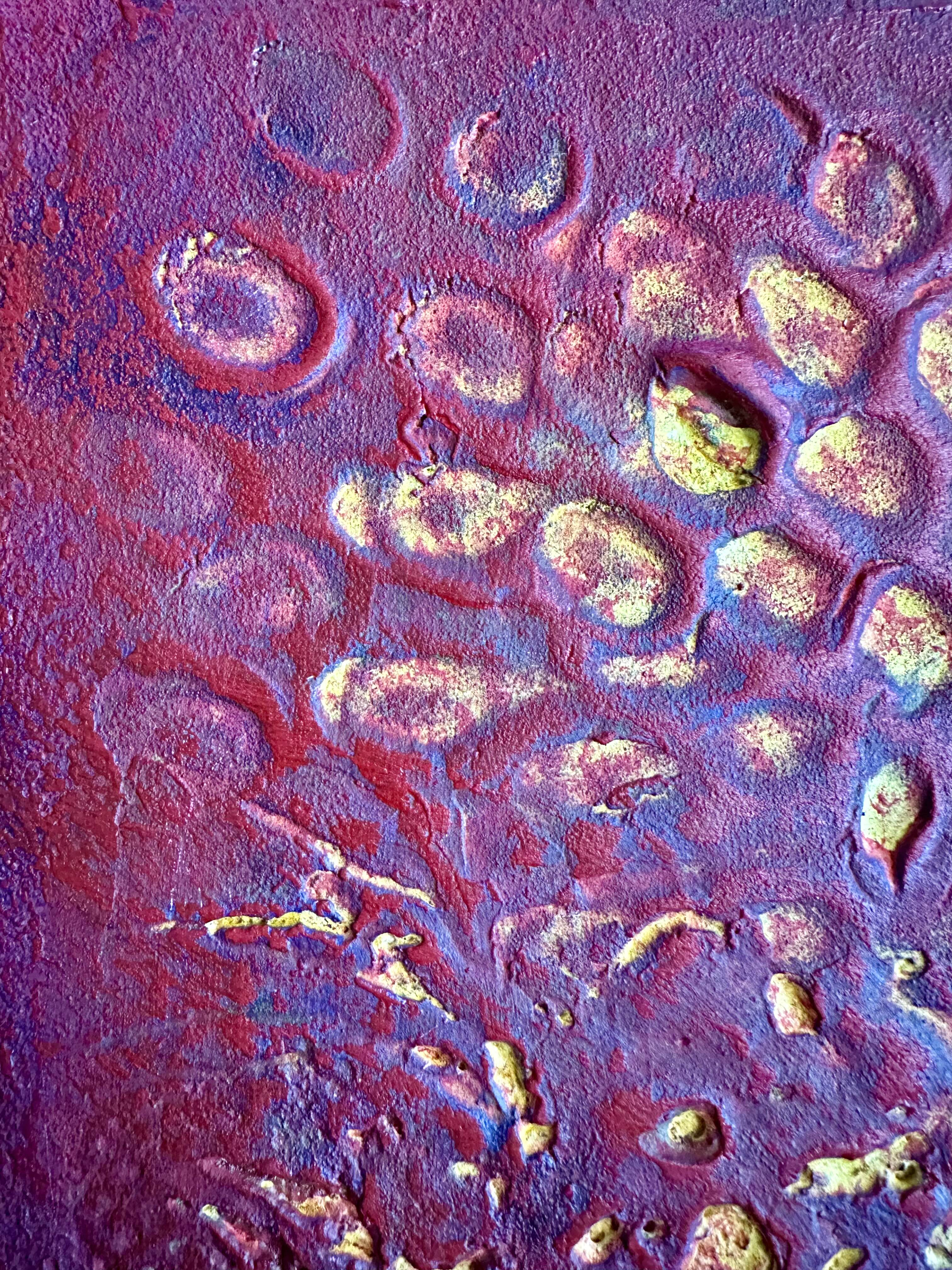 이 작품을 만들 때, 나는 색과 질감의 감정적인 힘을 탐구했고, 아크릴을 사용하여 잊혀진 이야기와 풍화된 영혼을 속삭이는 추상적인 풍경을 조각했다. 녹슨 붉은색과 생동감 넘치는 금색이 함께 피를 흘리며, 원시적이고 표현주의적인 에너지와 얽힌 빈티지 향수를 불러일으앴다. 각각의 붓놀림과 질감은 영혼을 자극하고 그것이 우아하게 하는 어떤 공간에서도 내성에 불을 붙이는 것을 목표로 하는 기억의 재탄생이다.