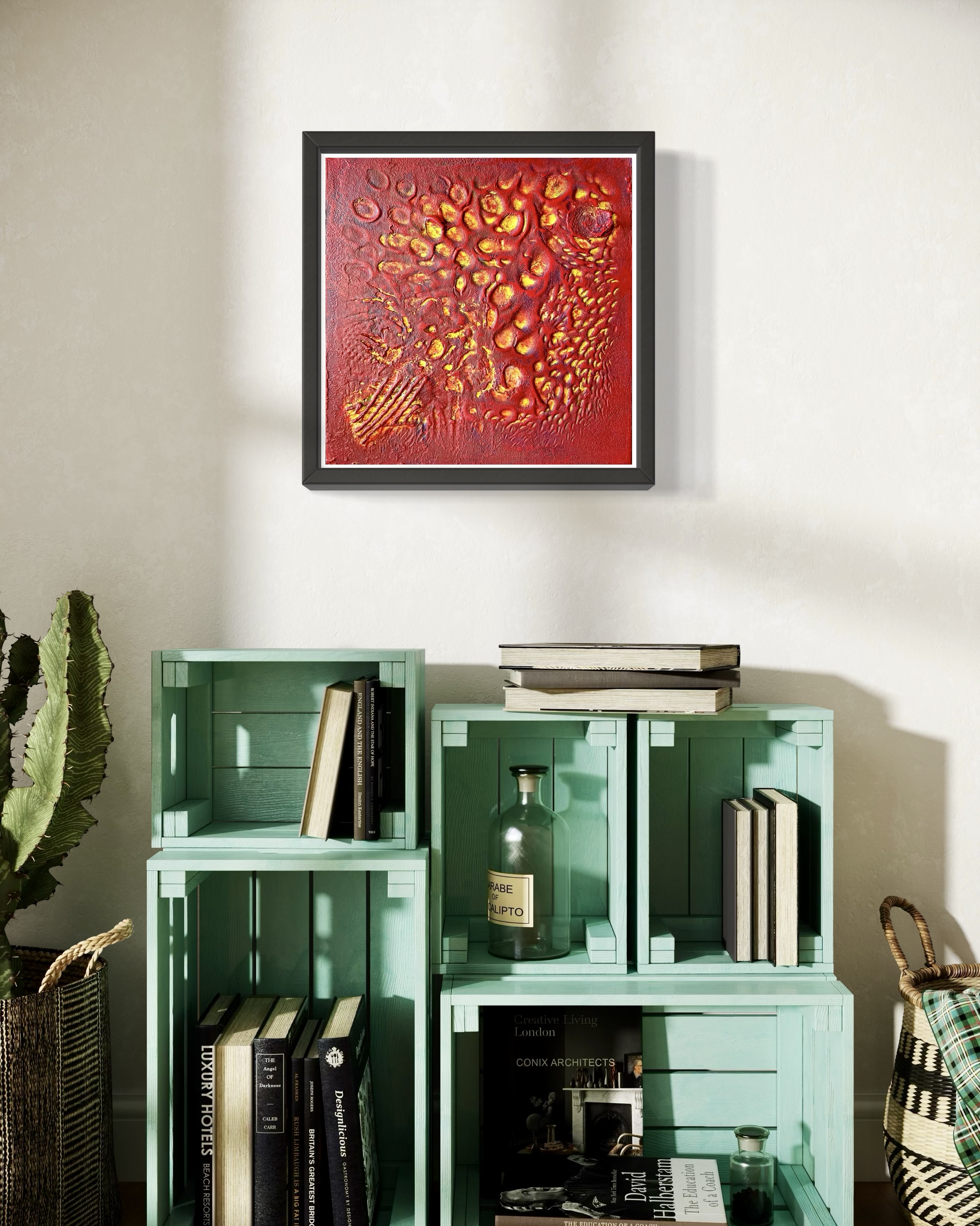 In creating this piece, I delved into the emotive power of color and texture, employing acrylics to sculpt an abstract landscape that whispers of forgotten tales and weathered spirits. The rusty reds and vibrant golds bleed together, eliciting a sense of vintage nostalgia intertwined with a raw, expressionistic energy. Each brushstroke and texture is a memory reborn, aimed to stir the soul and ignite introspection in any space it graces.