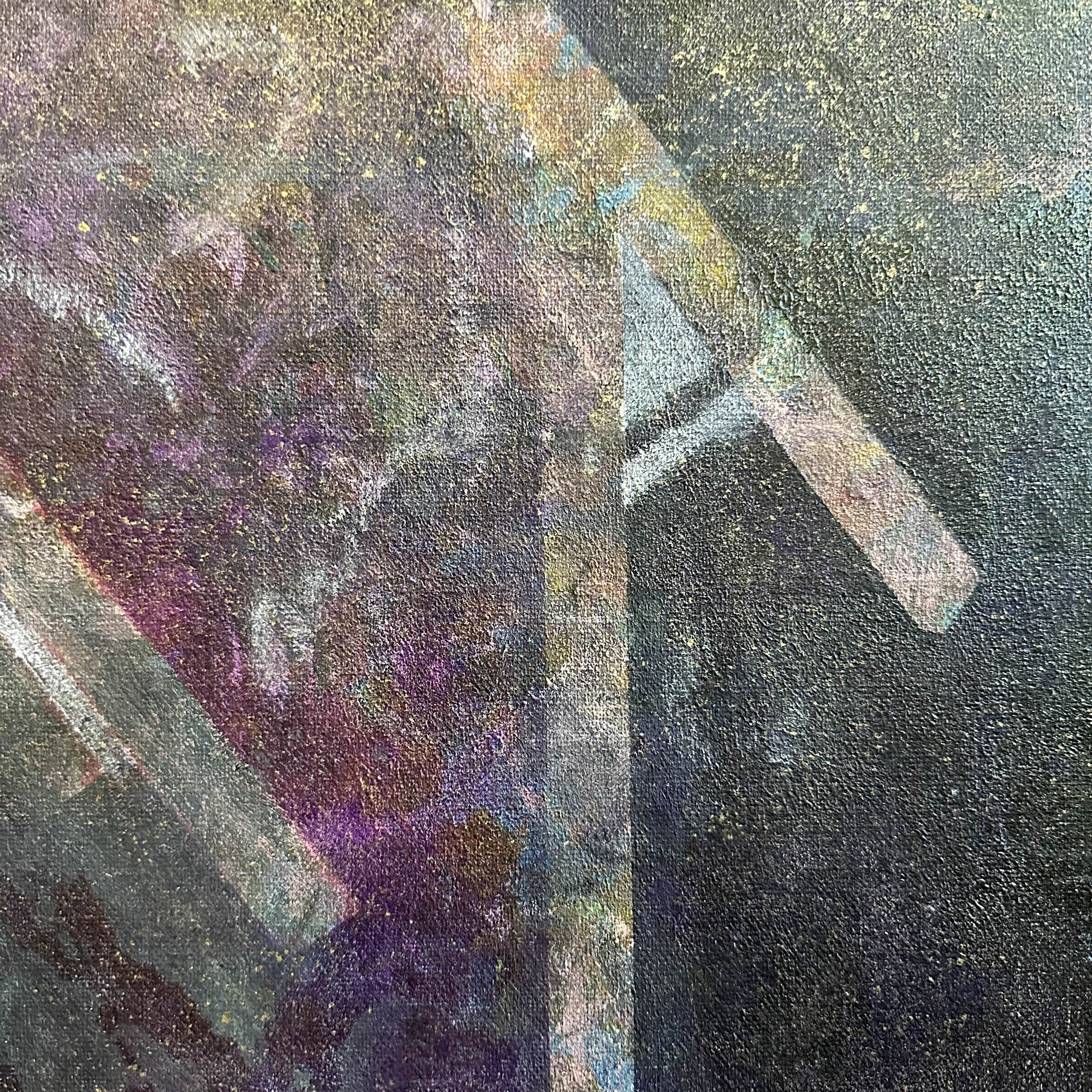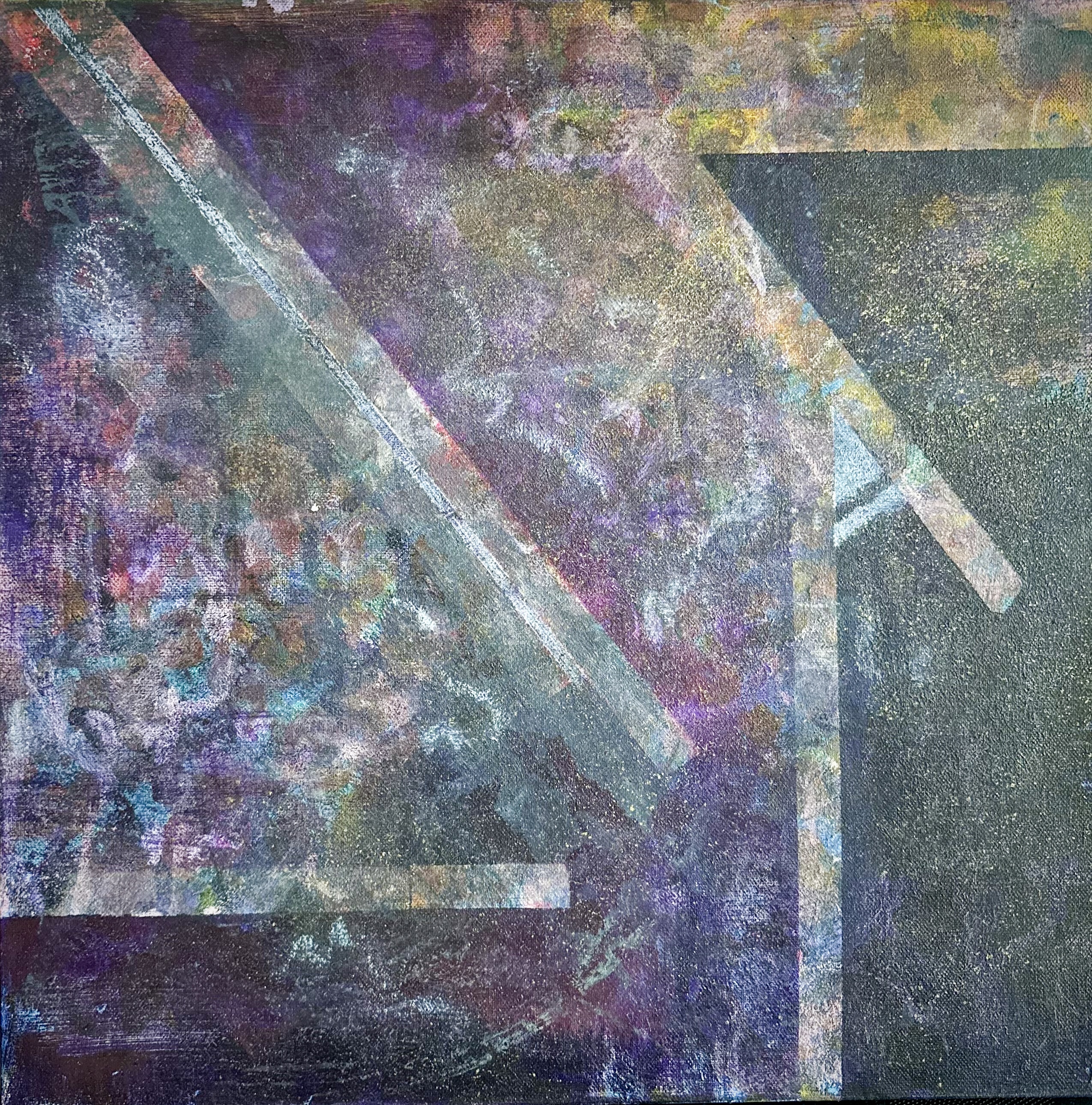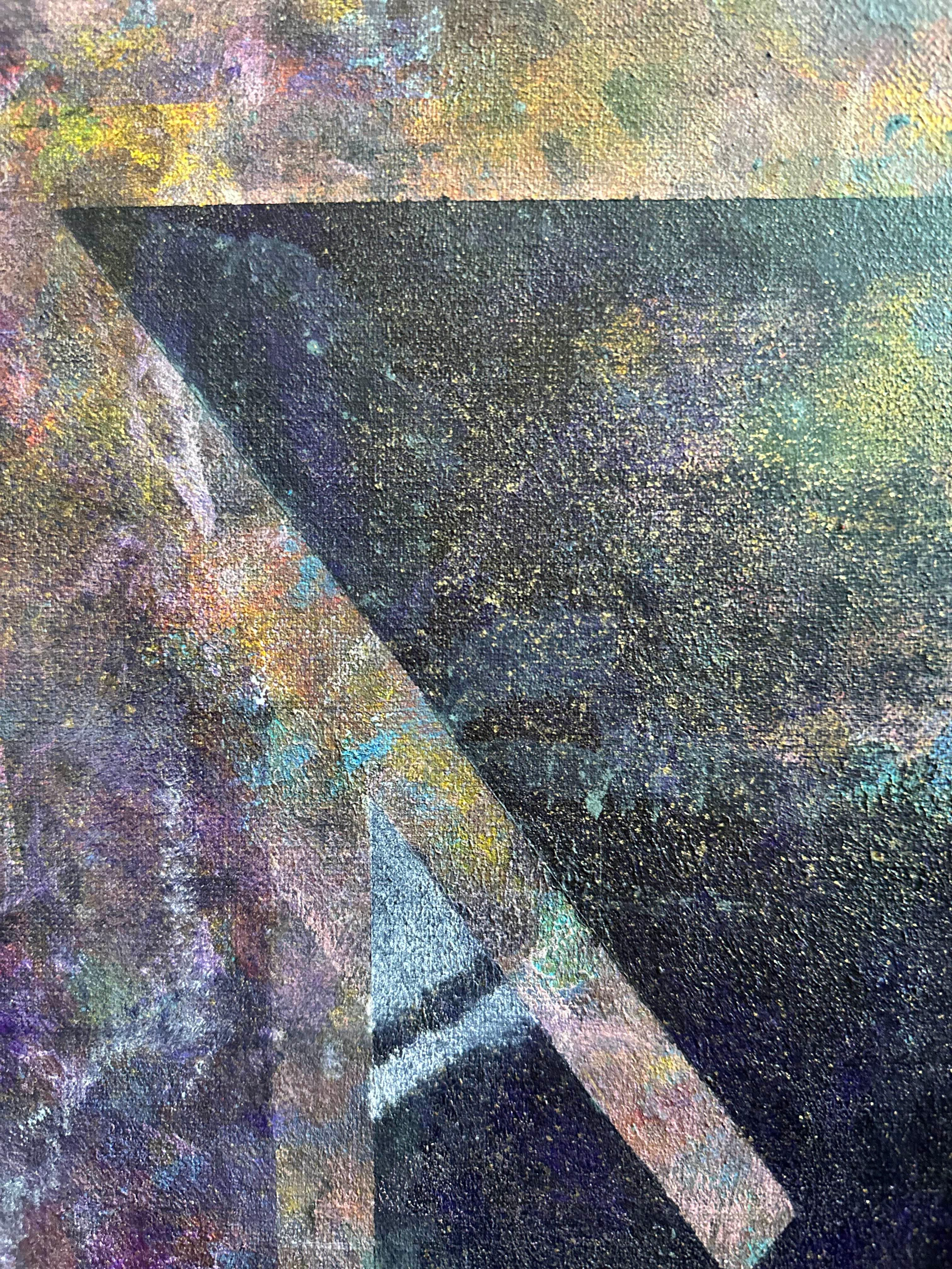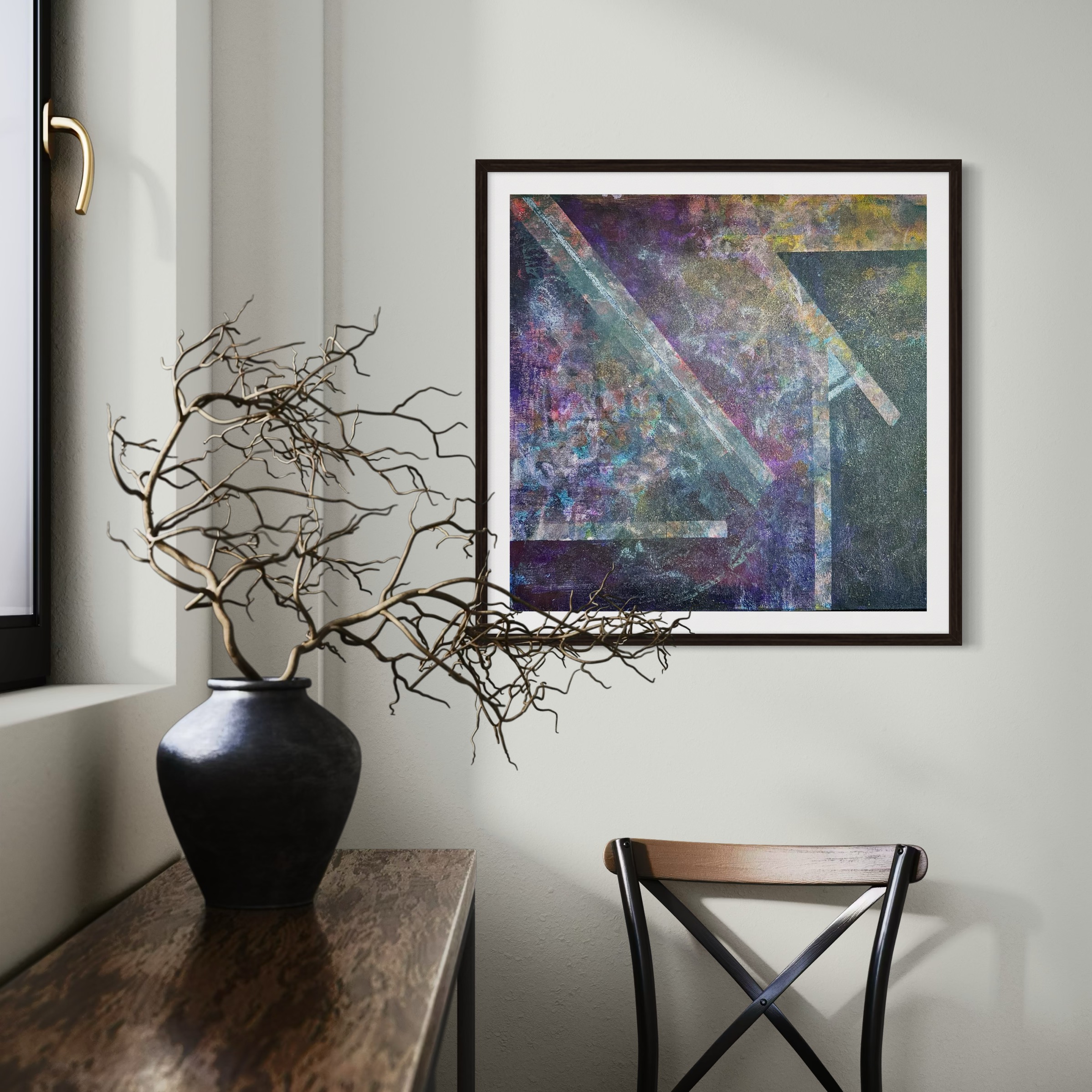 In this piece, I've layered acrylics to create a textured interplay of abstract shapes and symbols, evoking a sense of timelessness and mystique. The deep purples and yellow, contrasted by sharp lines, conjure the resilience and unyielding spirit of human endeavors against historical and cultural currents. It's a spirited reminder of perseverance and the rich tapestry of human experience. This artwork promises to imbue any space with a vibrant, thought-provoking aura.