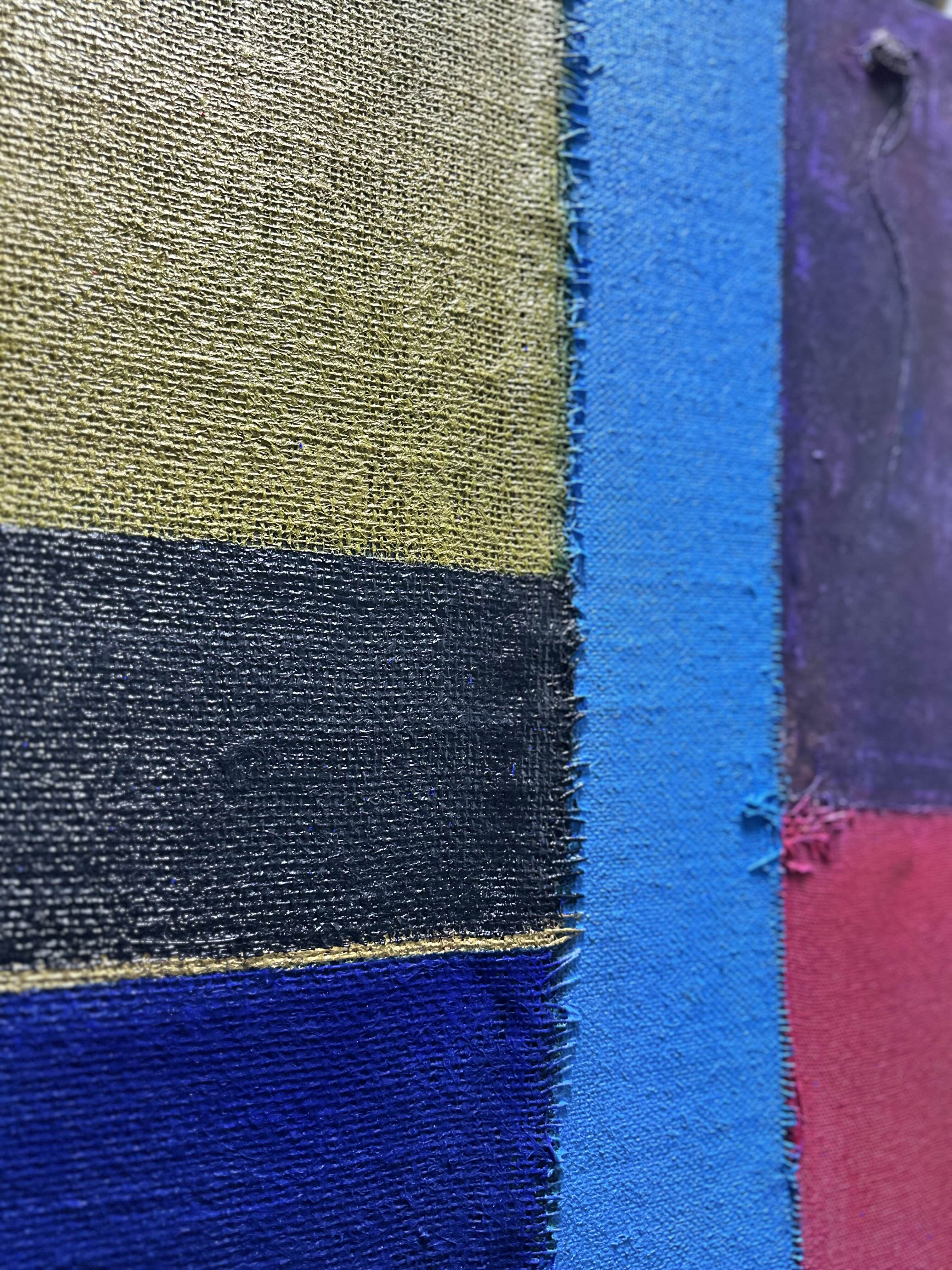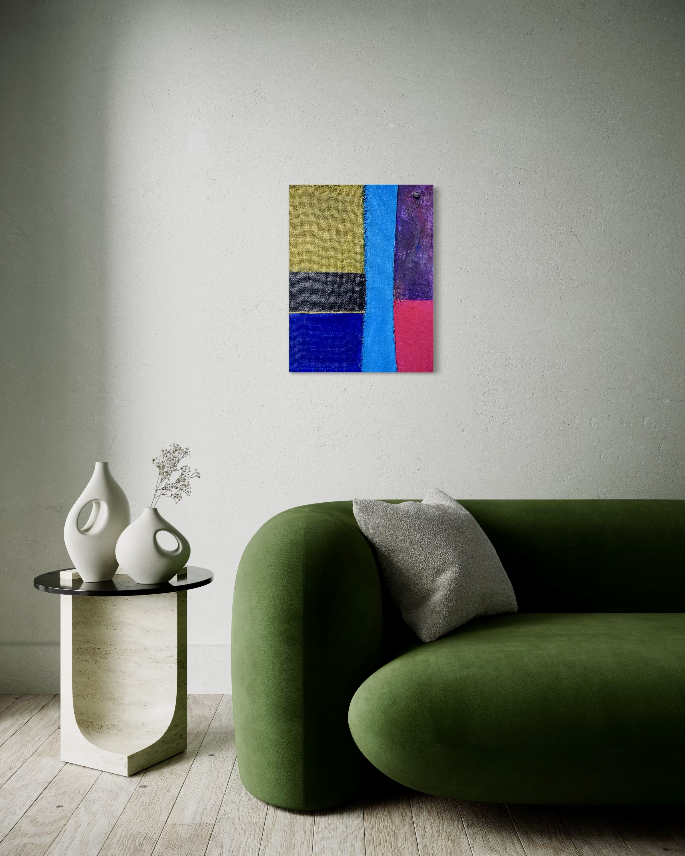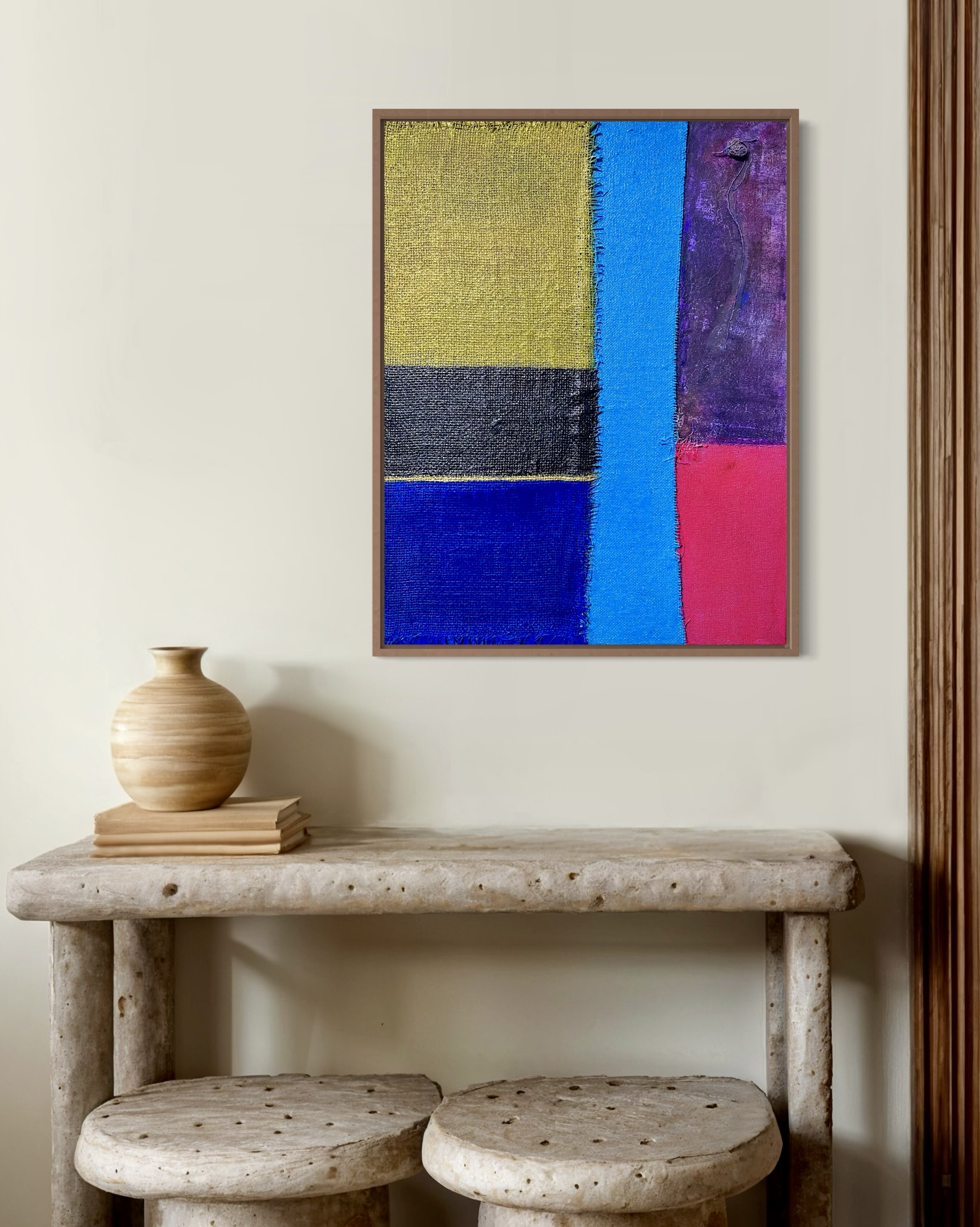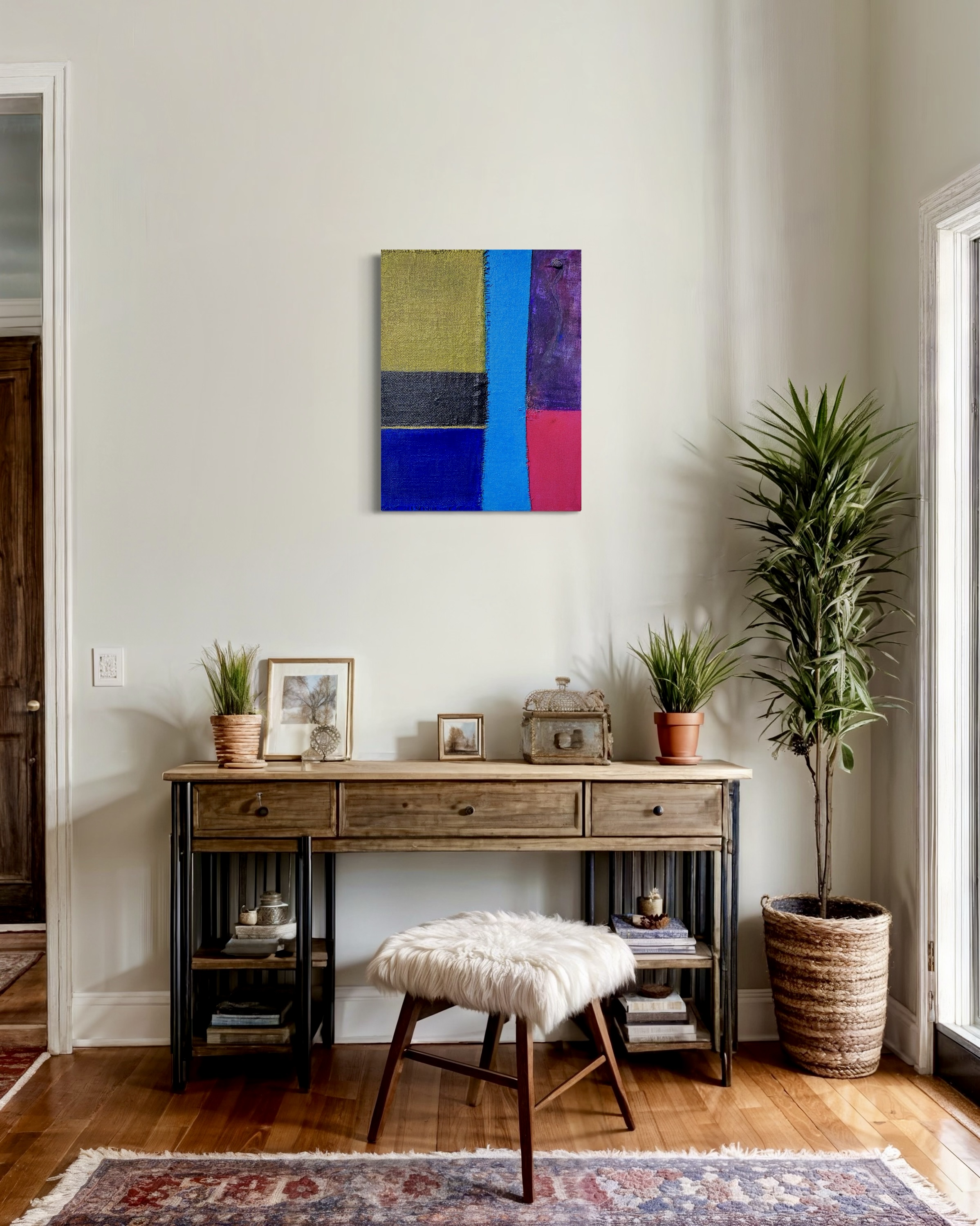 In creating this piece, I manipulated acrylics and incorporated collage elements with organic touches, seizing on the interplay of textures and patches of color. My intention was to evoke nostalgia while capturing an abstract, symbolic representation of memory and time. Each band of color and material type was chosen to evoke different emotional resonances—like echoes of past eras fused into modern sensibilities—challenging the viewer to feel and reflect deeply. Its presence in a home brings a powerful reminder of the beauty and complexity of layered histories.