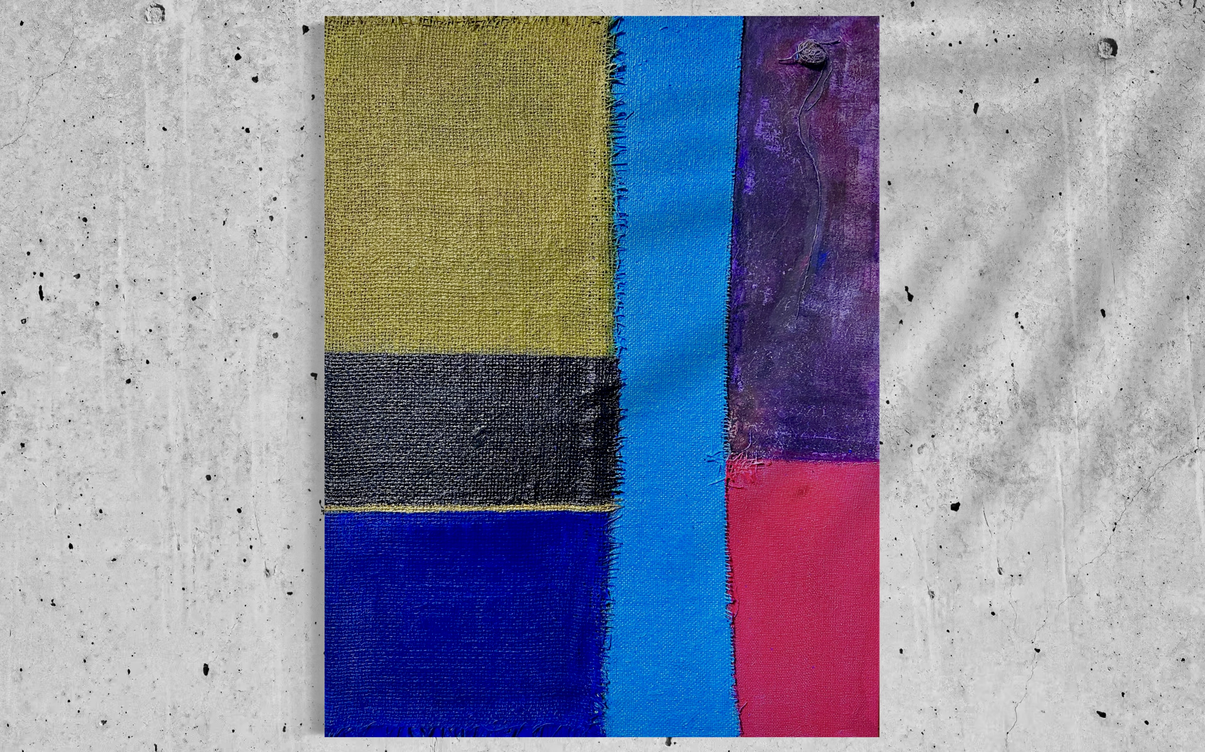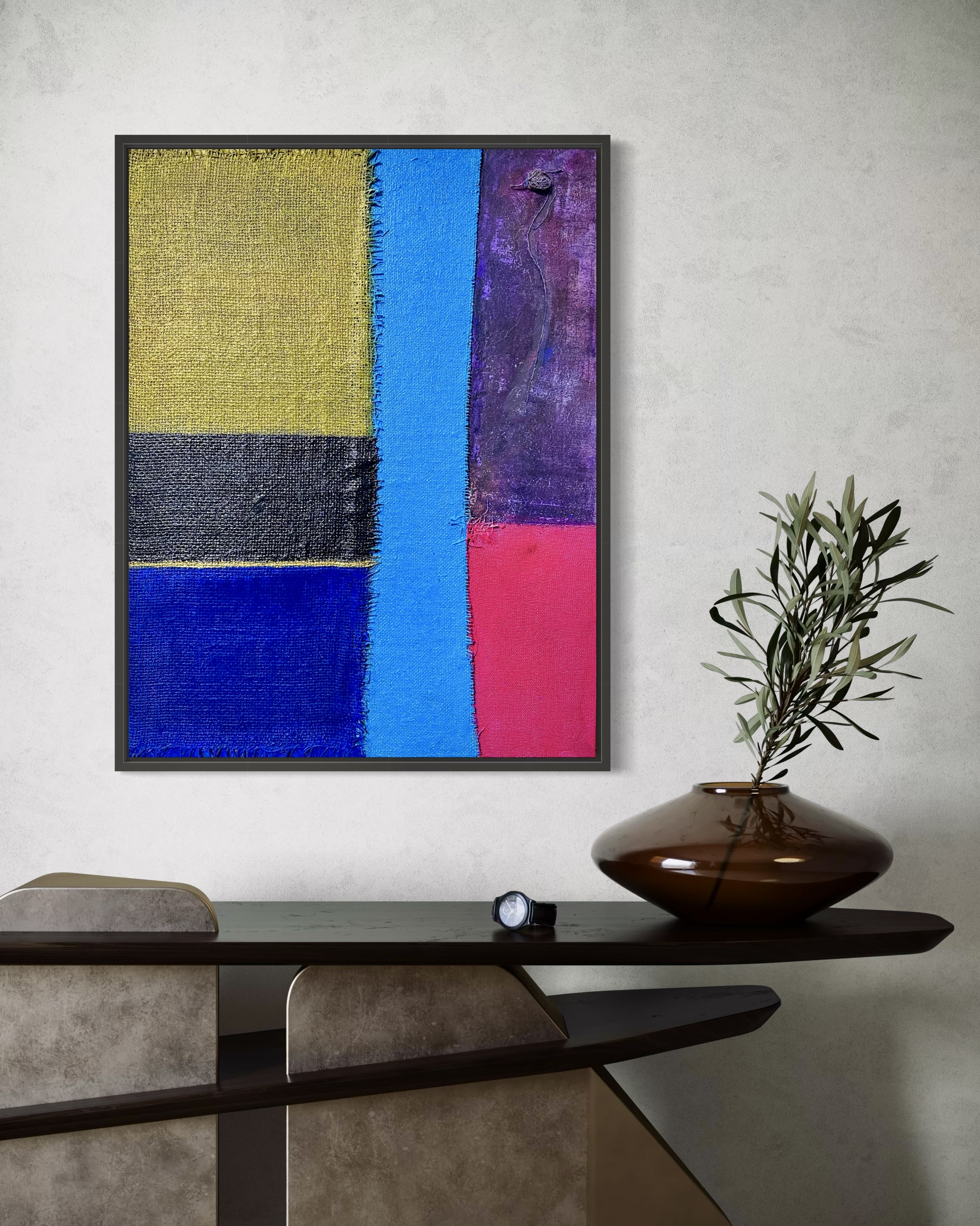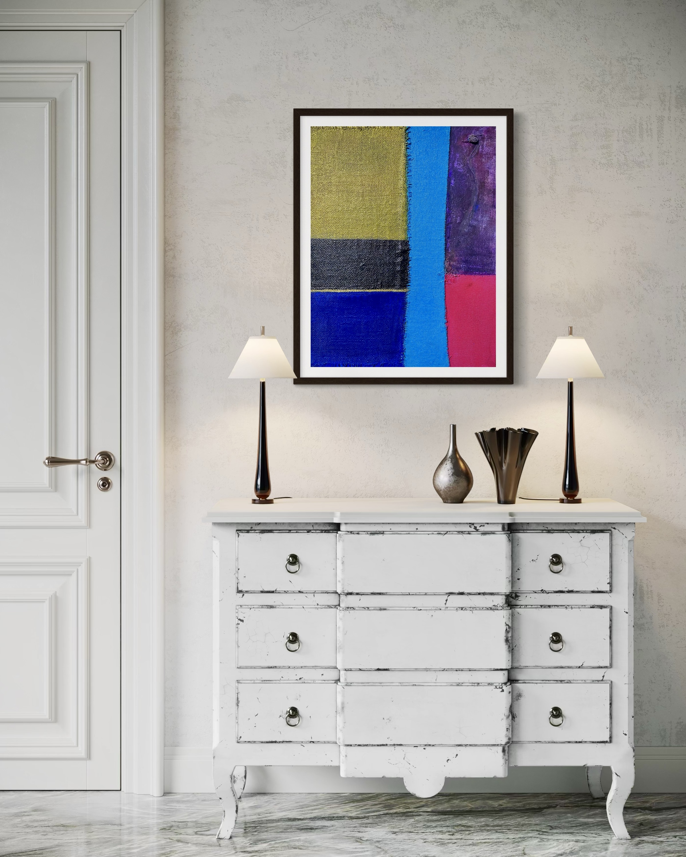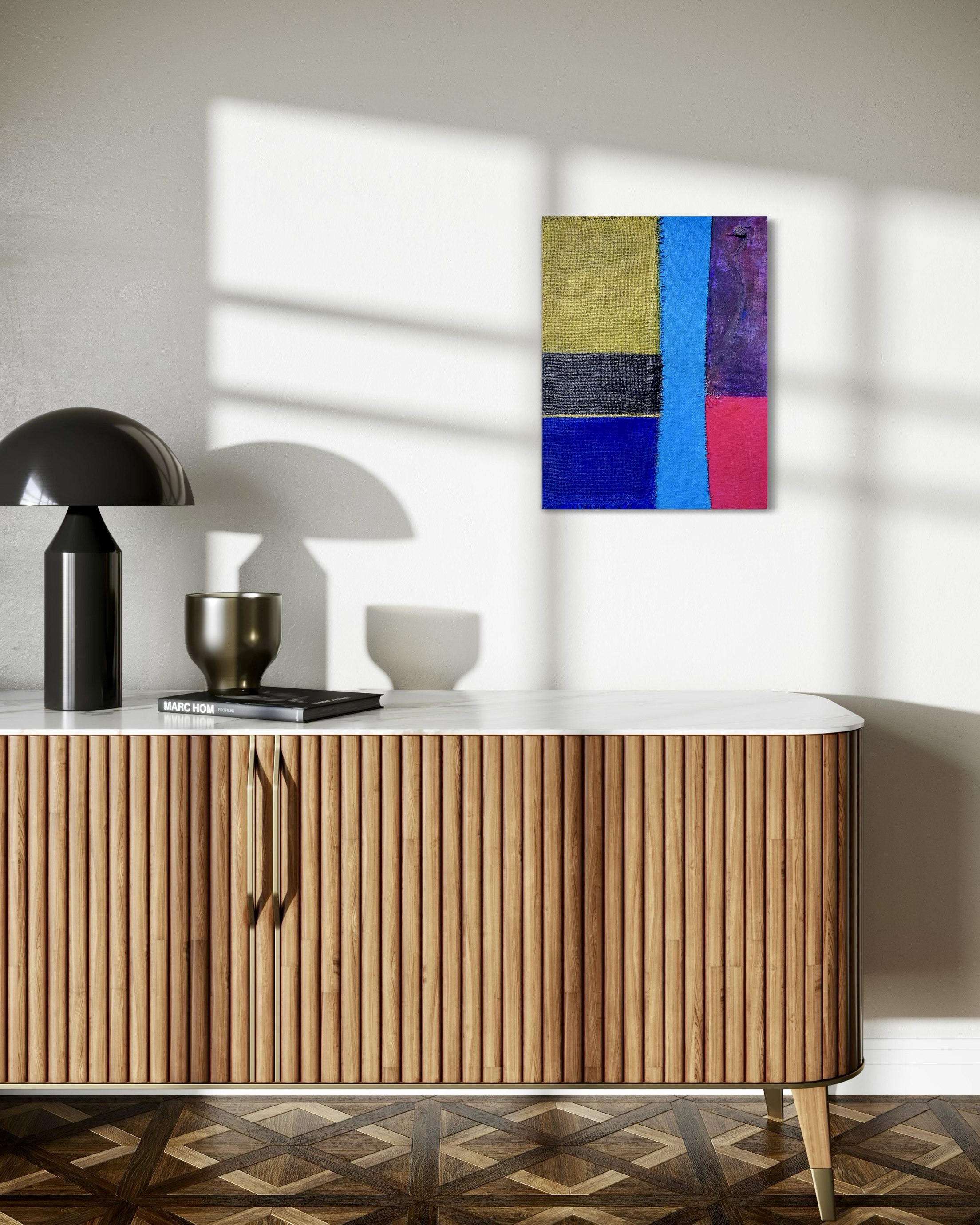 In creating this piece, I manipulated acrylics and incorporated collage elements with organic touches, seizing on the interplay of textures and patches of color. My intention was to evoke nostalgia while capturing an abstract, symbolic representation of memory and time. Each band of color and material type was chosen to evoke different emotional resonances—like echoes of past eras fused into modern sensibilities—challenging the viewer to feel and reflect deeply. Its presence in a home brings a powerful reminder of the beauty and complexity of layered histories.