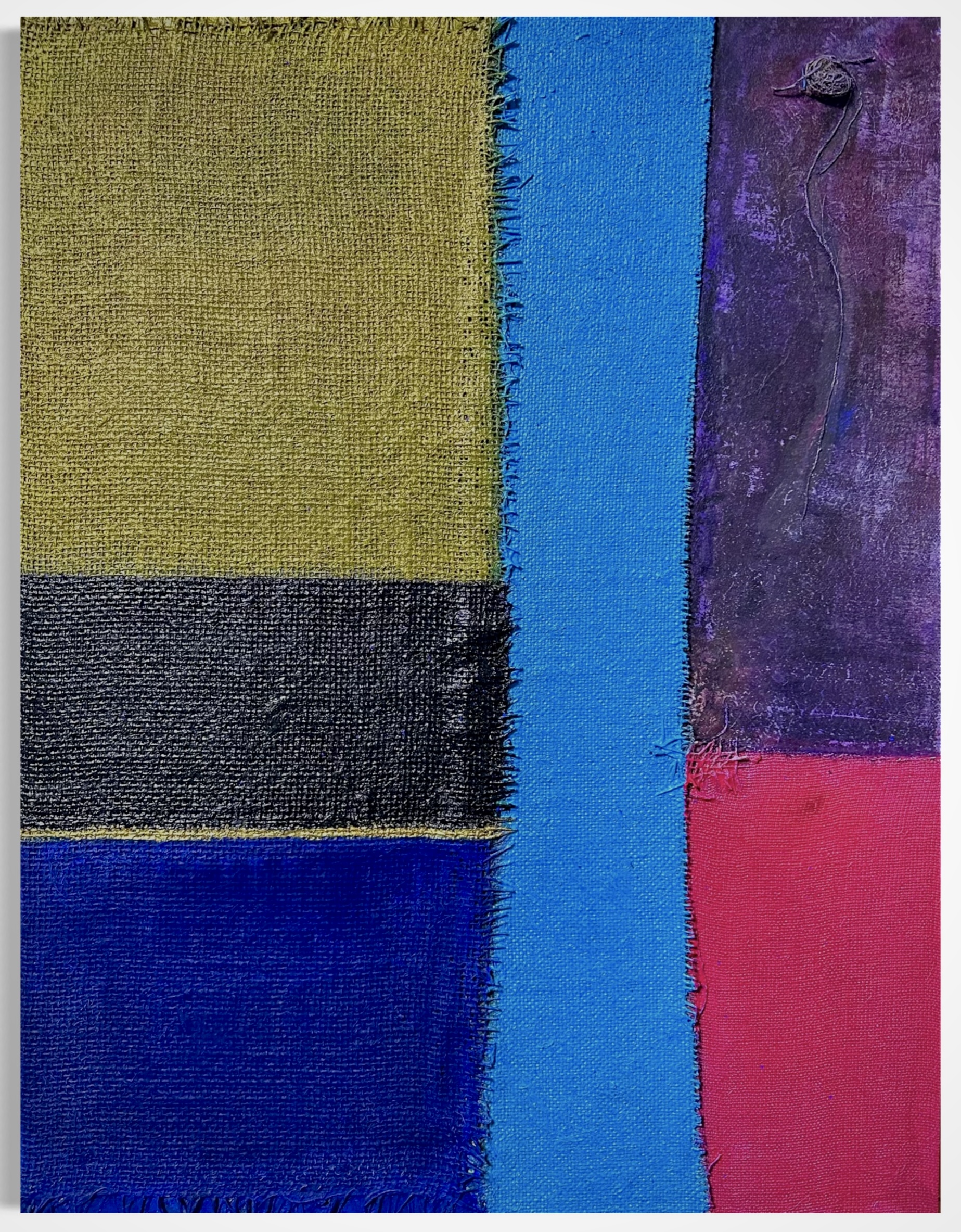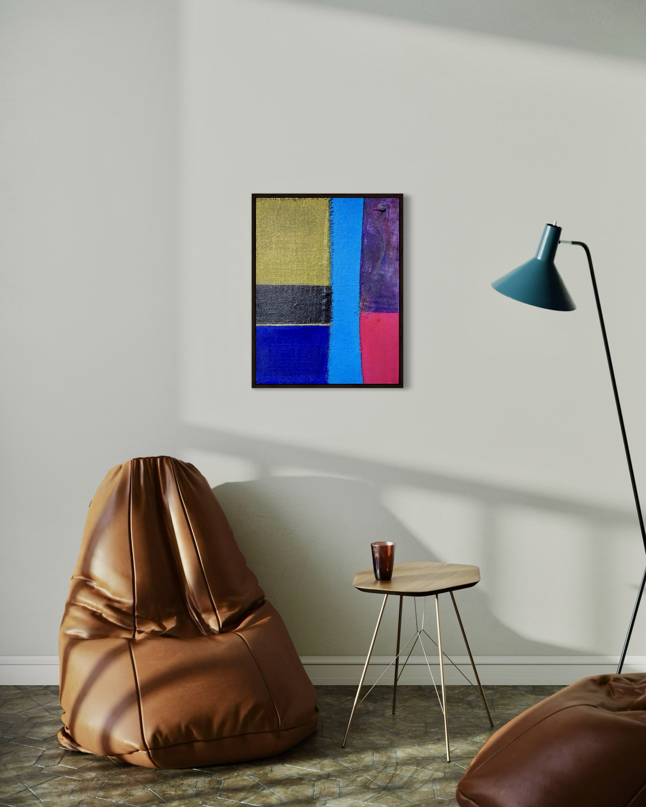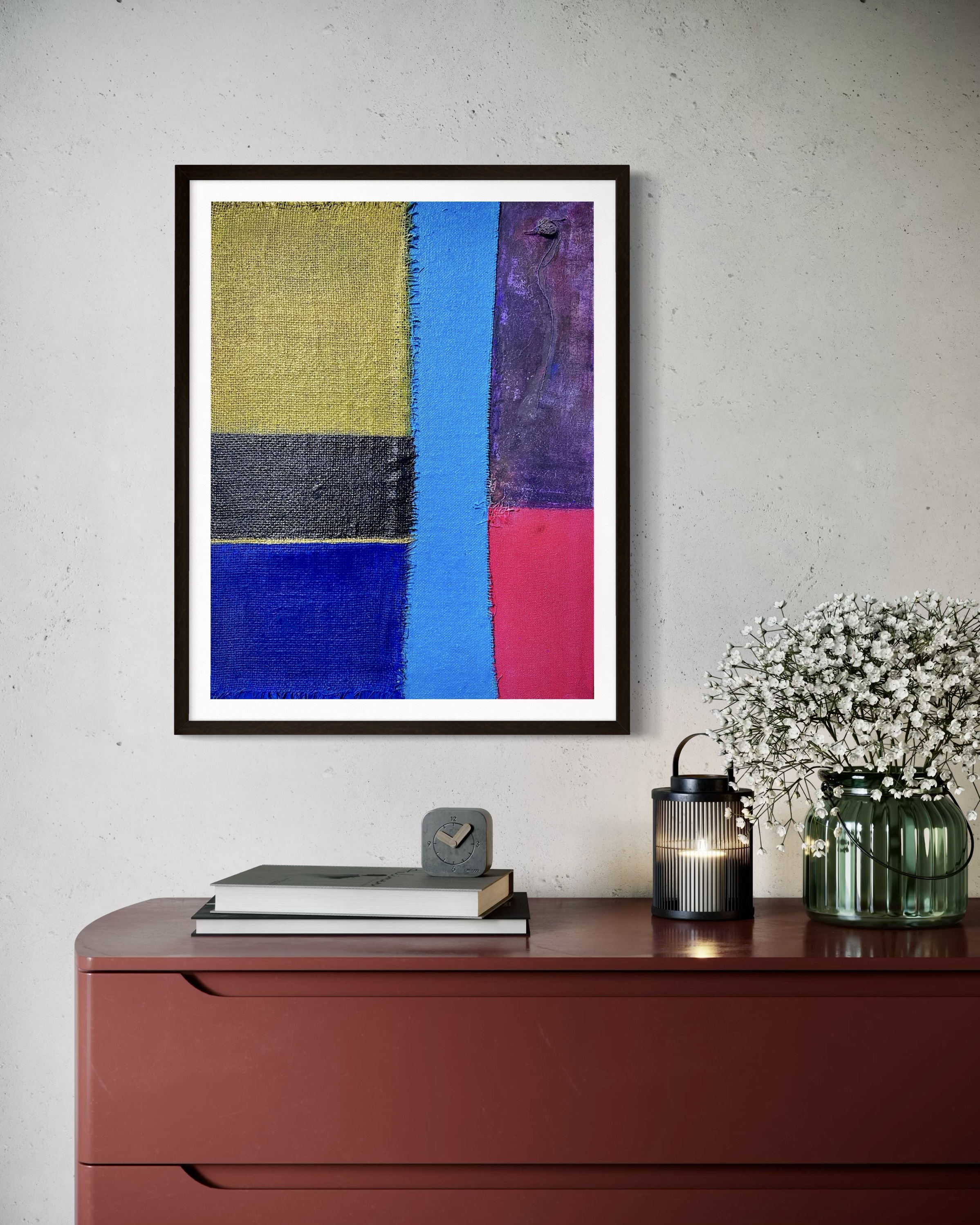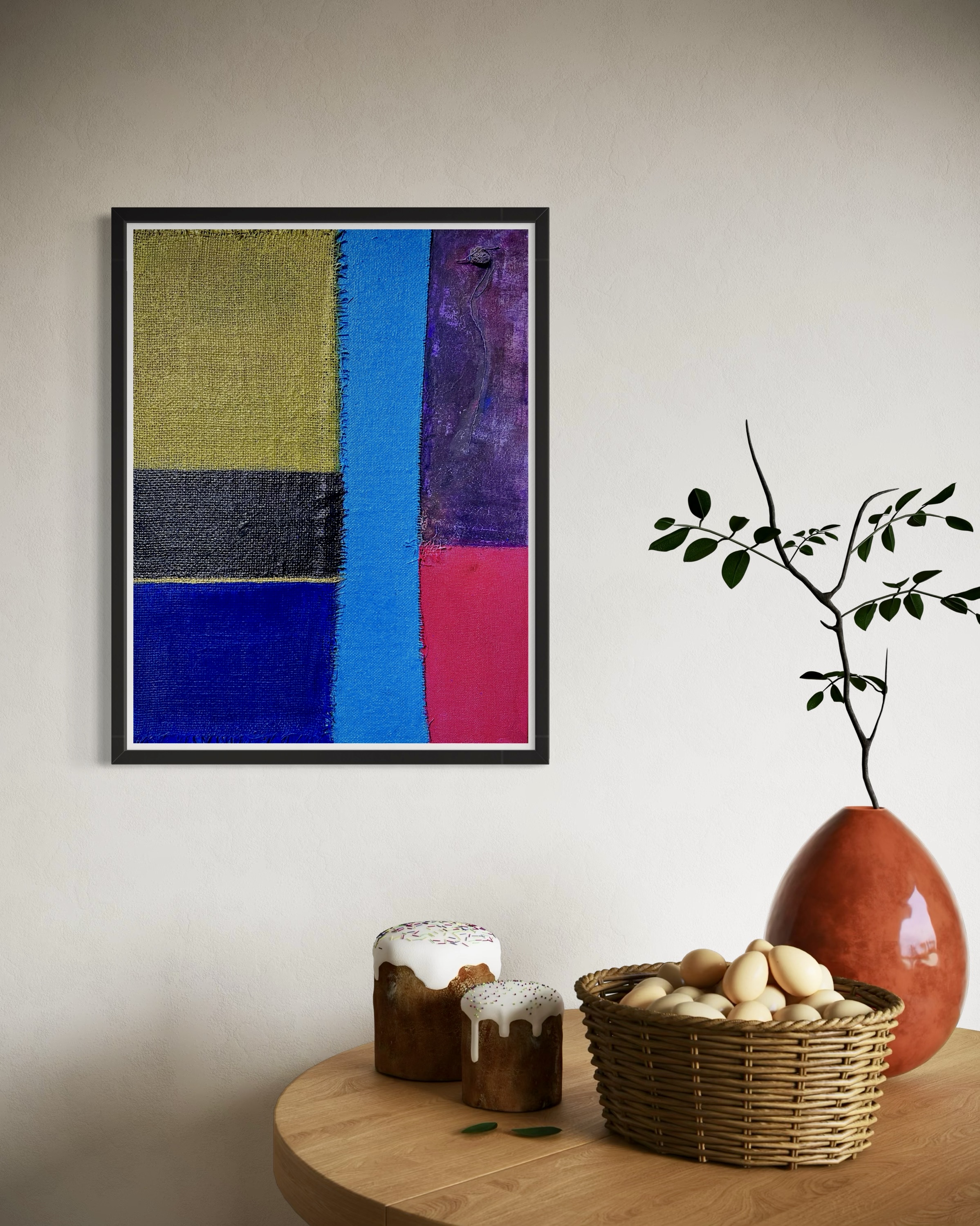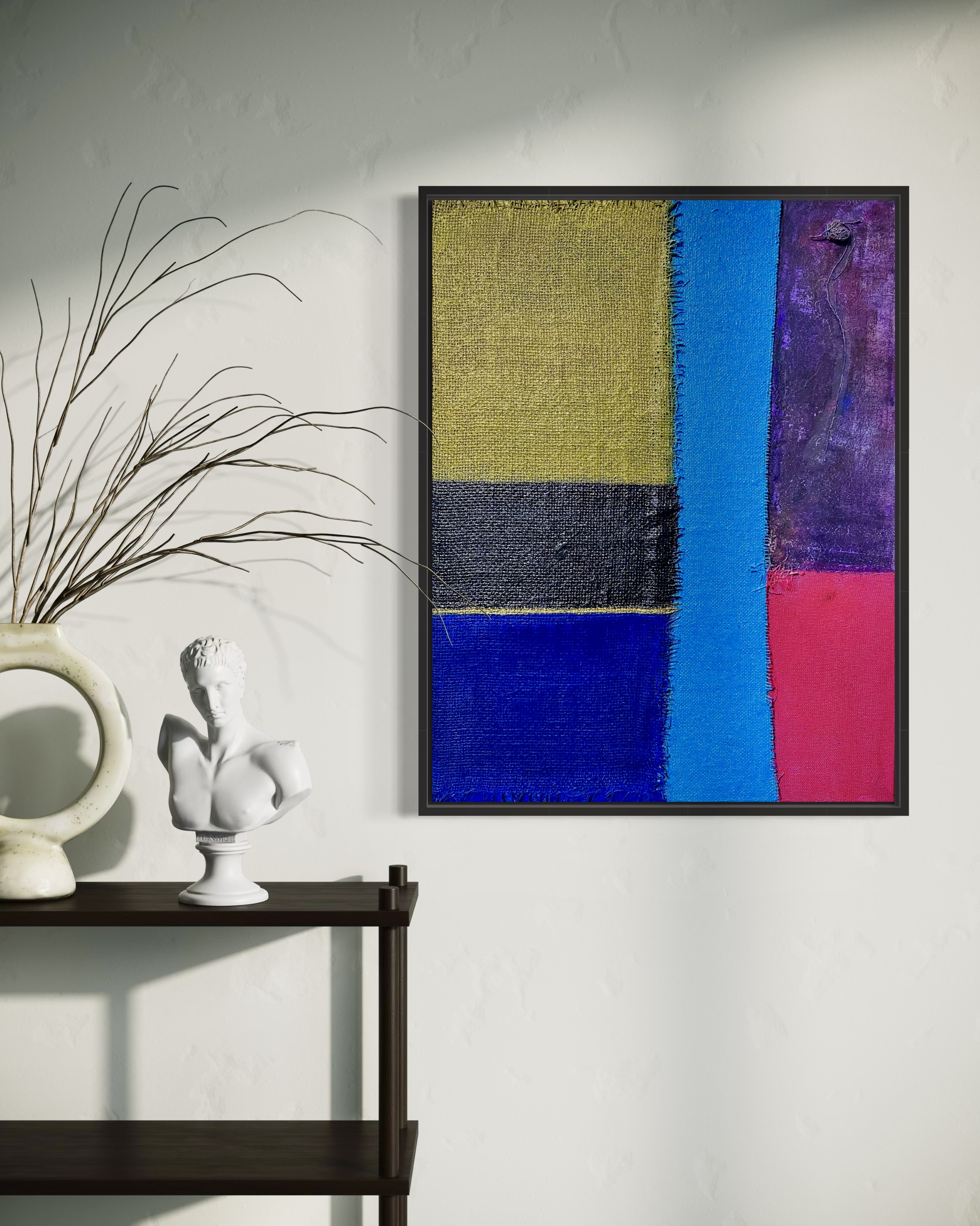 In creating this piece, I manipulated acrylics and incorporated collage elements with organic touches, seizing on the interplay of textures and patches of color. My intention was to evoke nostalgia while capturing an abstract, symbolic representation of memory and time. Each band of color and material type was chosen to evoke different emotional resonances—like echoes of past eras fused into modern sensibilities—challenging the viewer to feel and reflect deeply. Its presence in a home brings a powerful reminder of the beauty and complexity of layered histories.