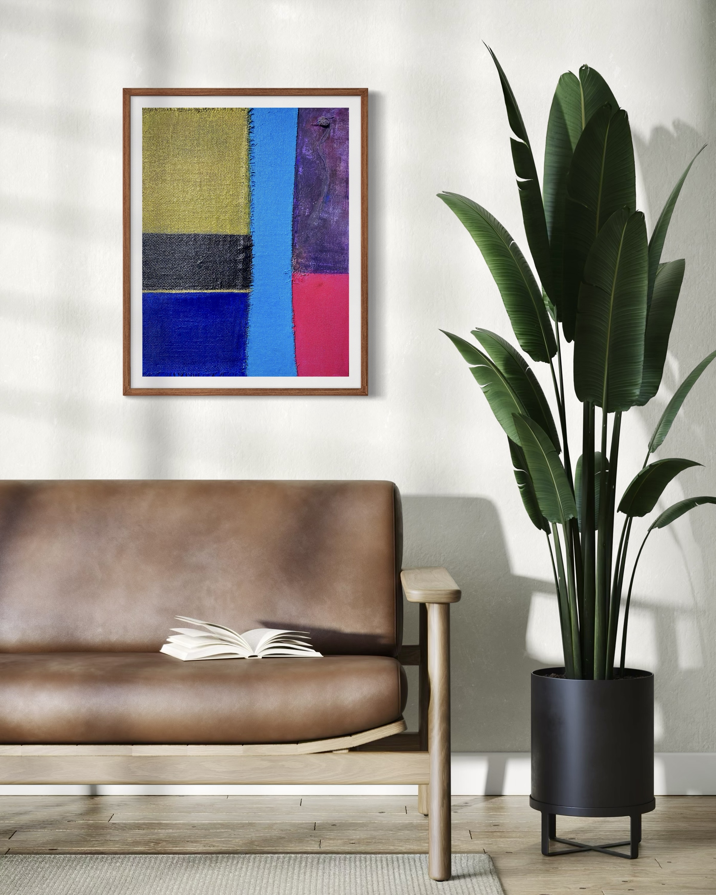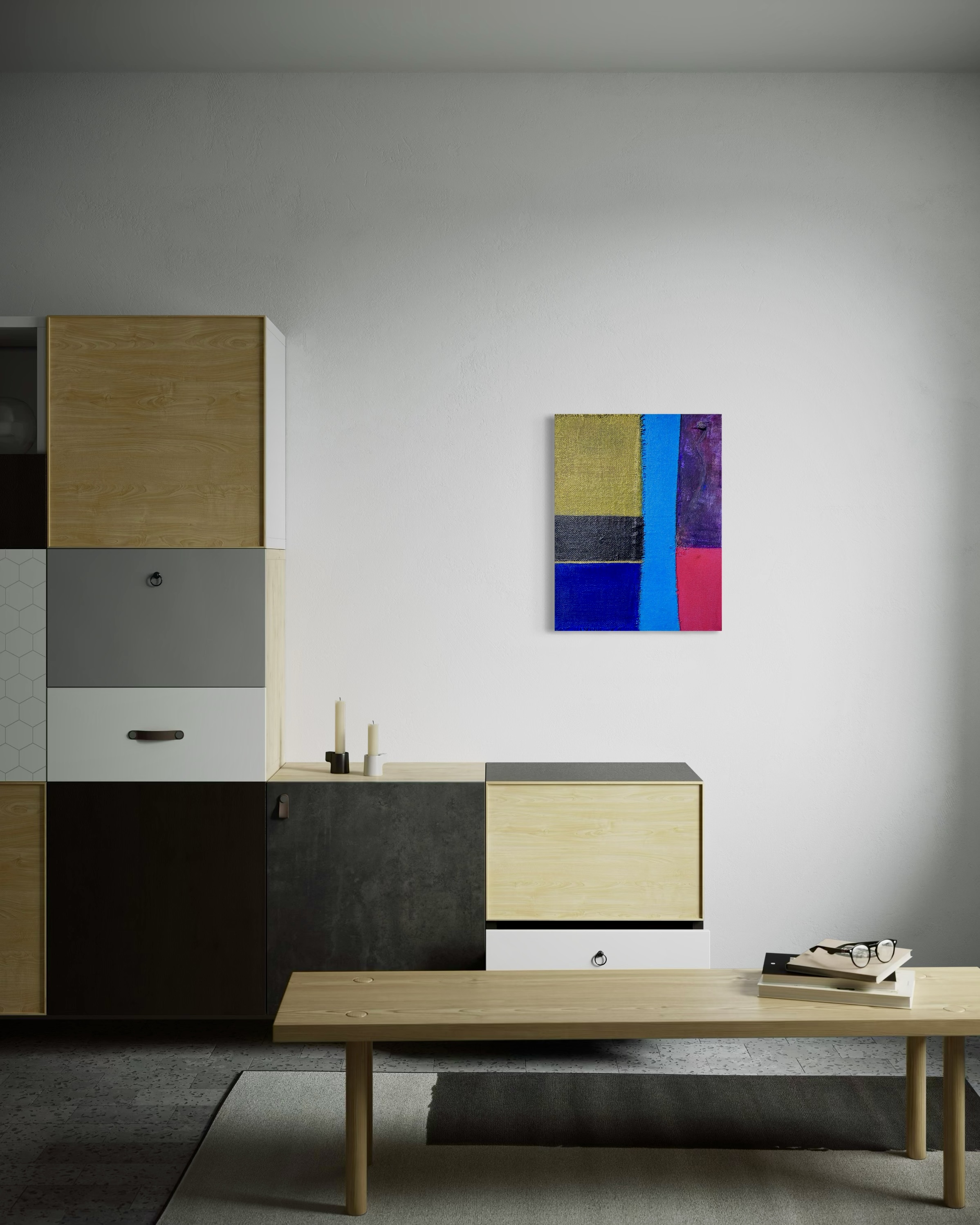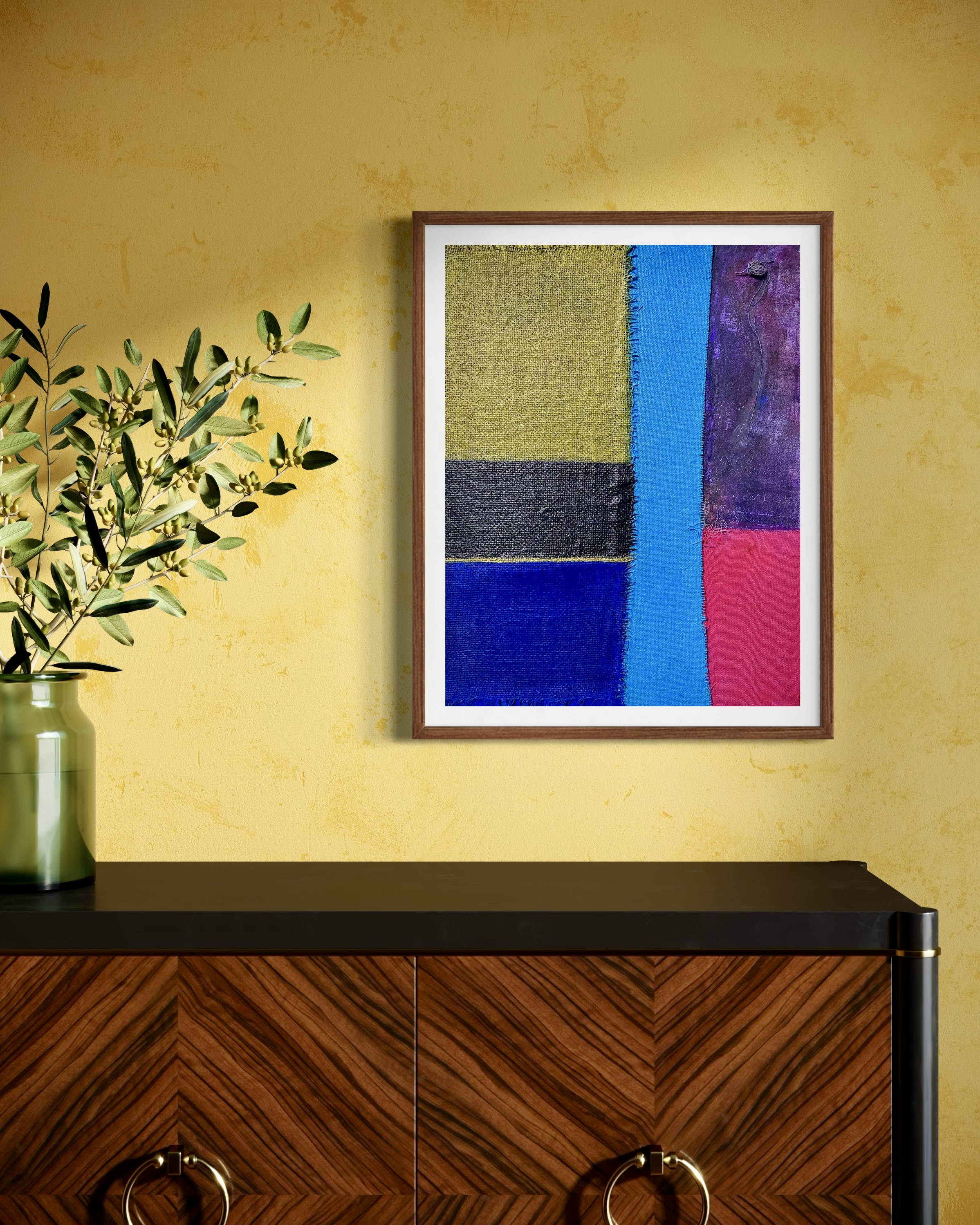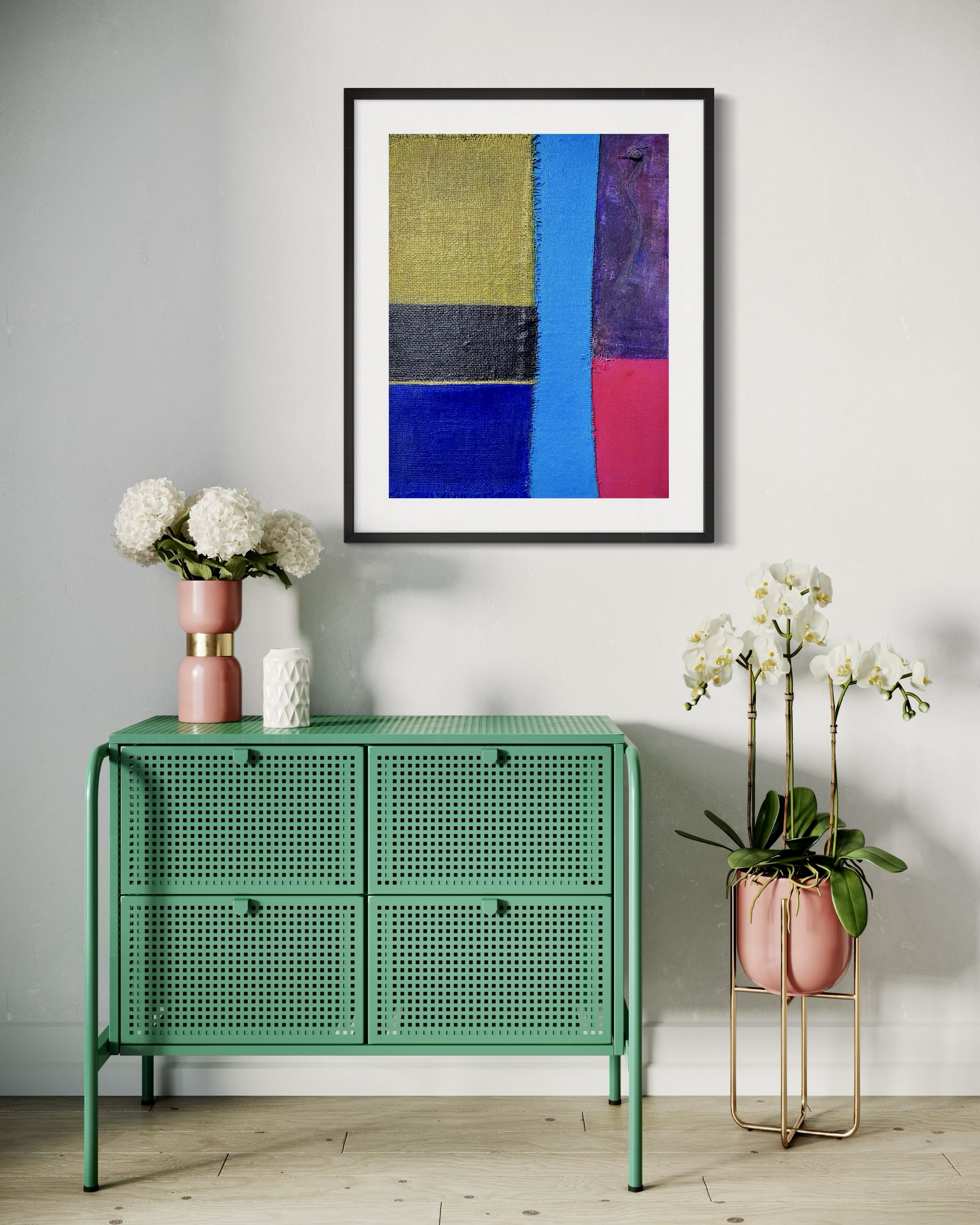 In creating this piece, I manipulated acrylics and incorporated collage elements with organic touches, seizing on the interplay of textures and patches of color. My intention was to evoke nostalgia while capturing an abstract, symbolic representation of memory and time. Each band of color and material type was chosen to evoke different emotional resonances—like echoes of past eras fused into modern sensibilities—challenging the viewer to feel and reflect deeply. Its presence in a home brings a powerful reminder of the beauty and complexity of layered histories.