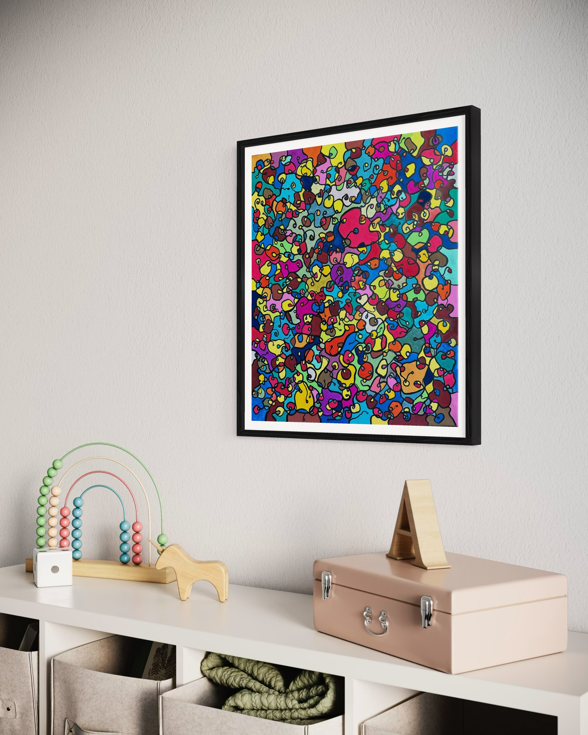 이 그림에서, 나는 유기적인 형태가 기발한 춤으로 얽혀 있는 활기차고 활기찬 세계를 만드는 데 열정을 쏟아부었다. 동양 예술에서 영감을 받은, 각각의 획과 색상은 기쁨과 해방의 정신을 포착합니다. 이 예술 작품은 단지 벽에 걸기 위한 것이 아닙니다. 그것은 당신의 공간에 생명의 맥박과 색의 폭발을 가져오도록 설계되었으며, 그것을 보는 모든 사람들이 가장 활기찬 자아를 포용하고 마음껏 피어나도록 격려합니다.