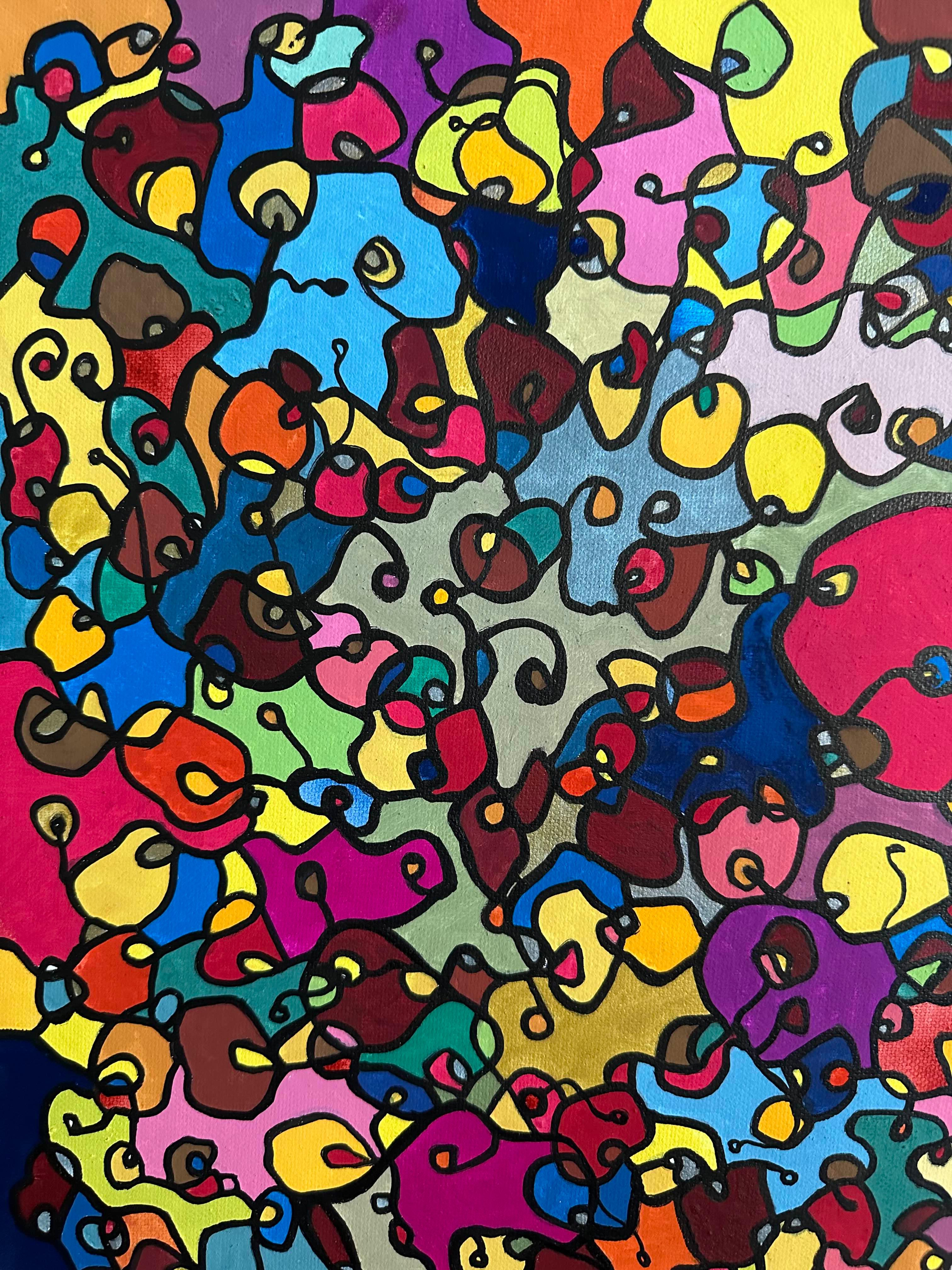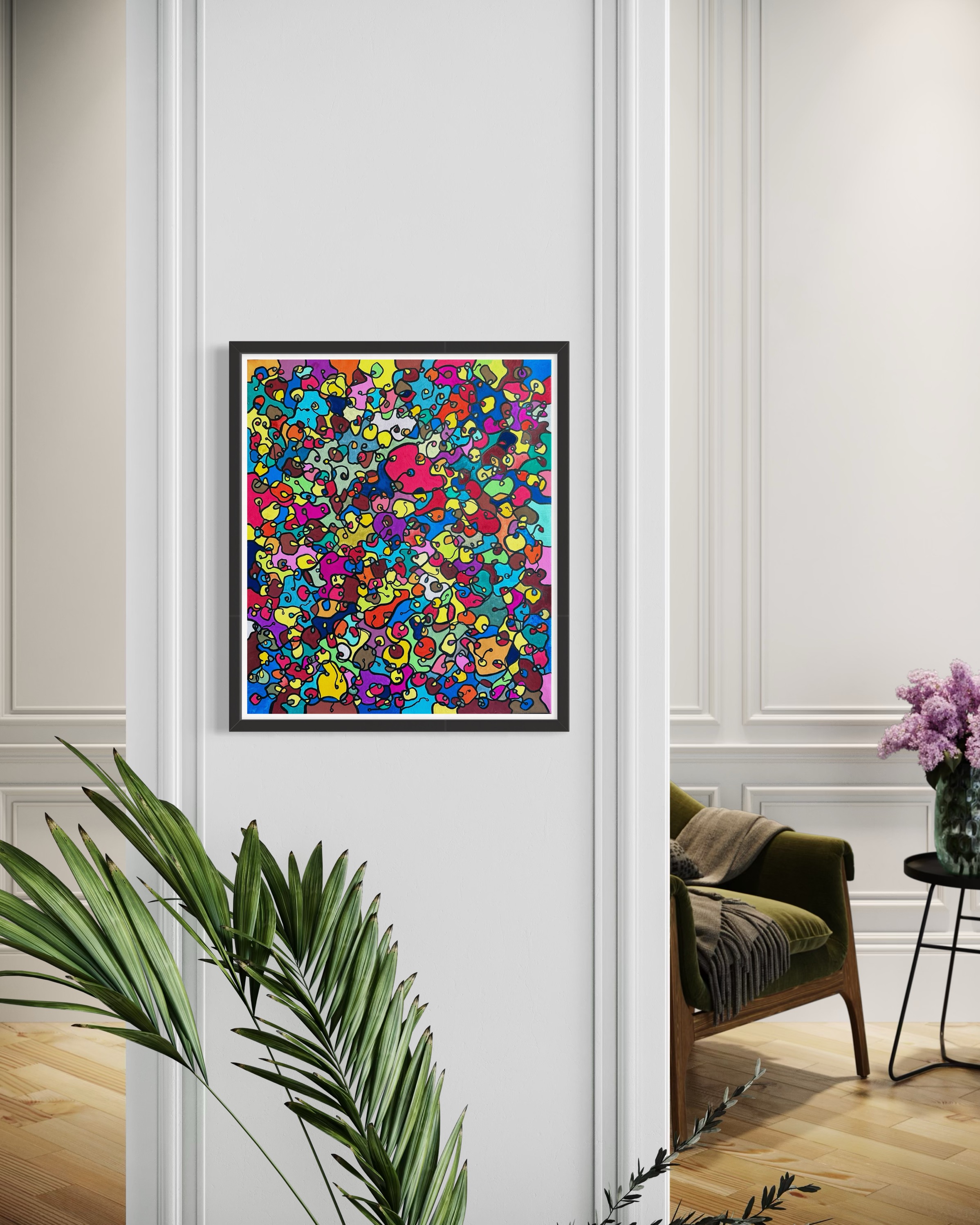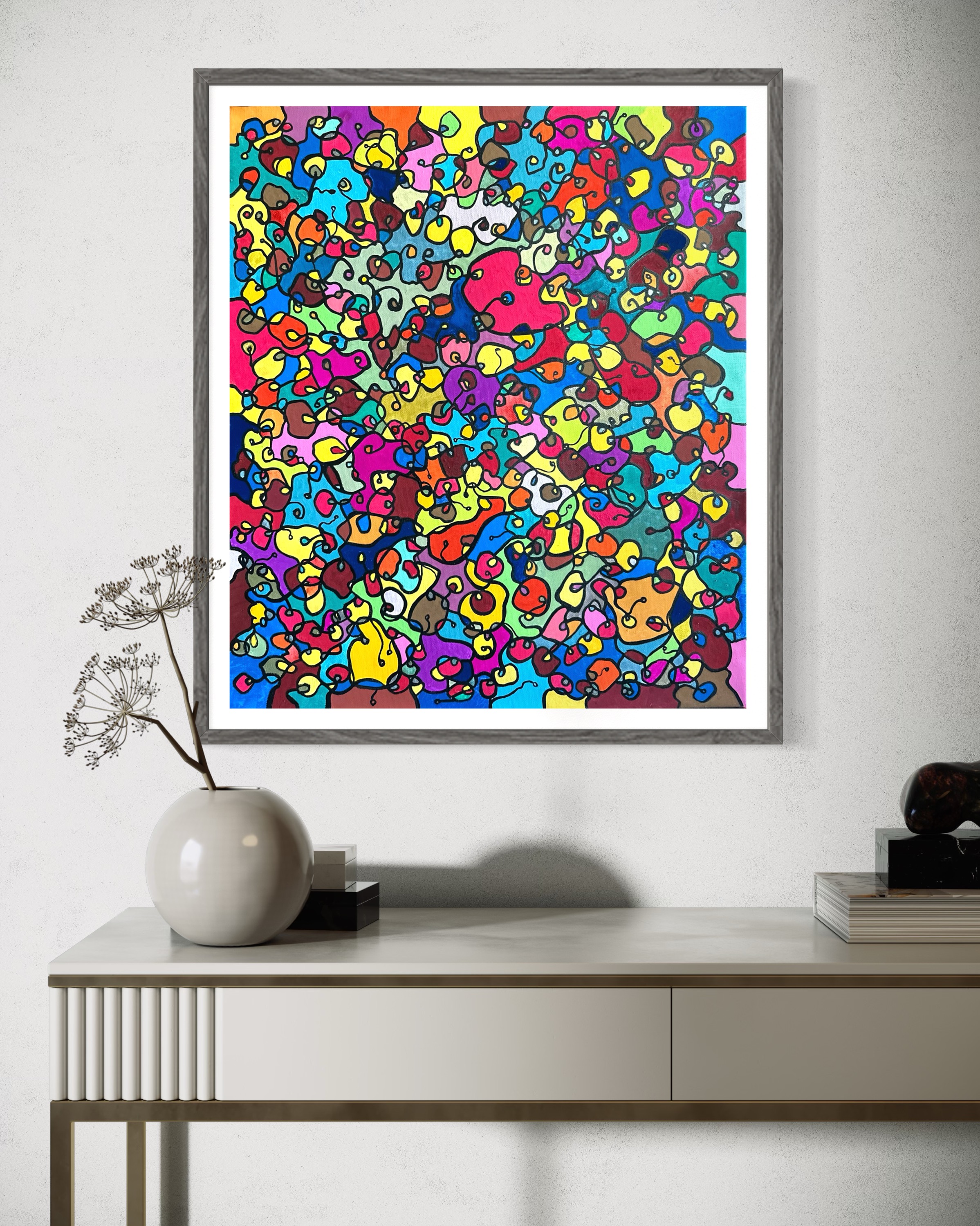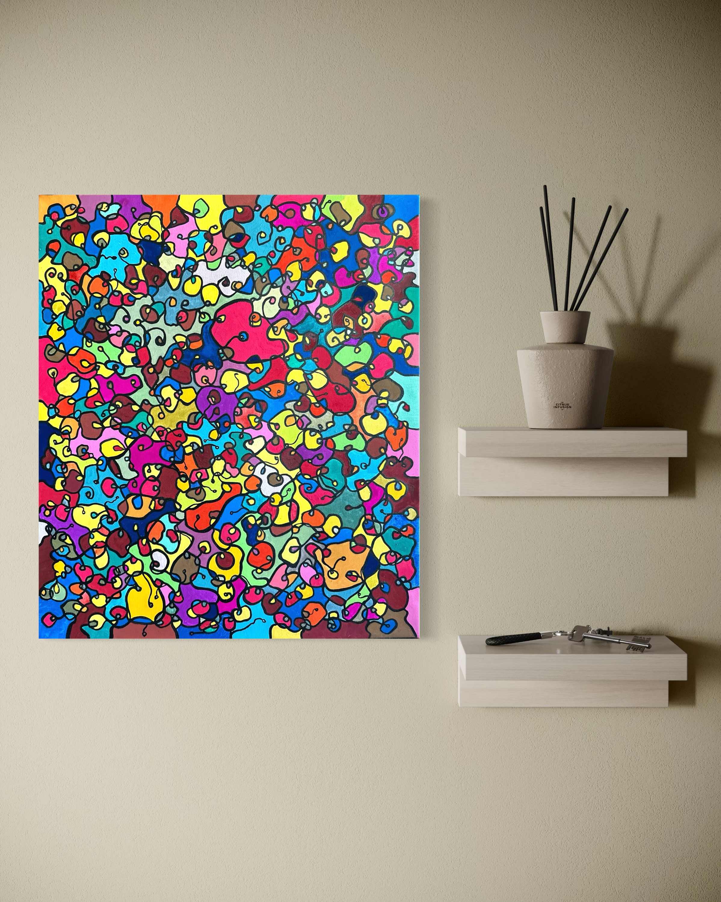 In this painting, I've poured my passion into creating a vibrant, energetic world where organic forms intertwine in a whimsical dance. Inspired by oriental art, each stroke and color captures a spirit of joy and liberation. This artwork isn't just meant to hang on a wall—it's designed to bring a pulse of life and an explosion of color into your space, encouraging everyone who sees it to embrace their most vibrant selves and bloom to their heart's content.