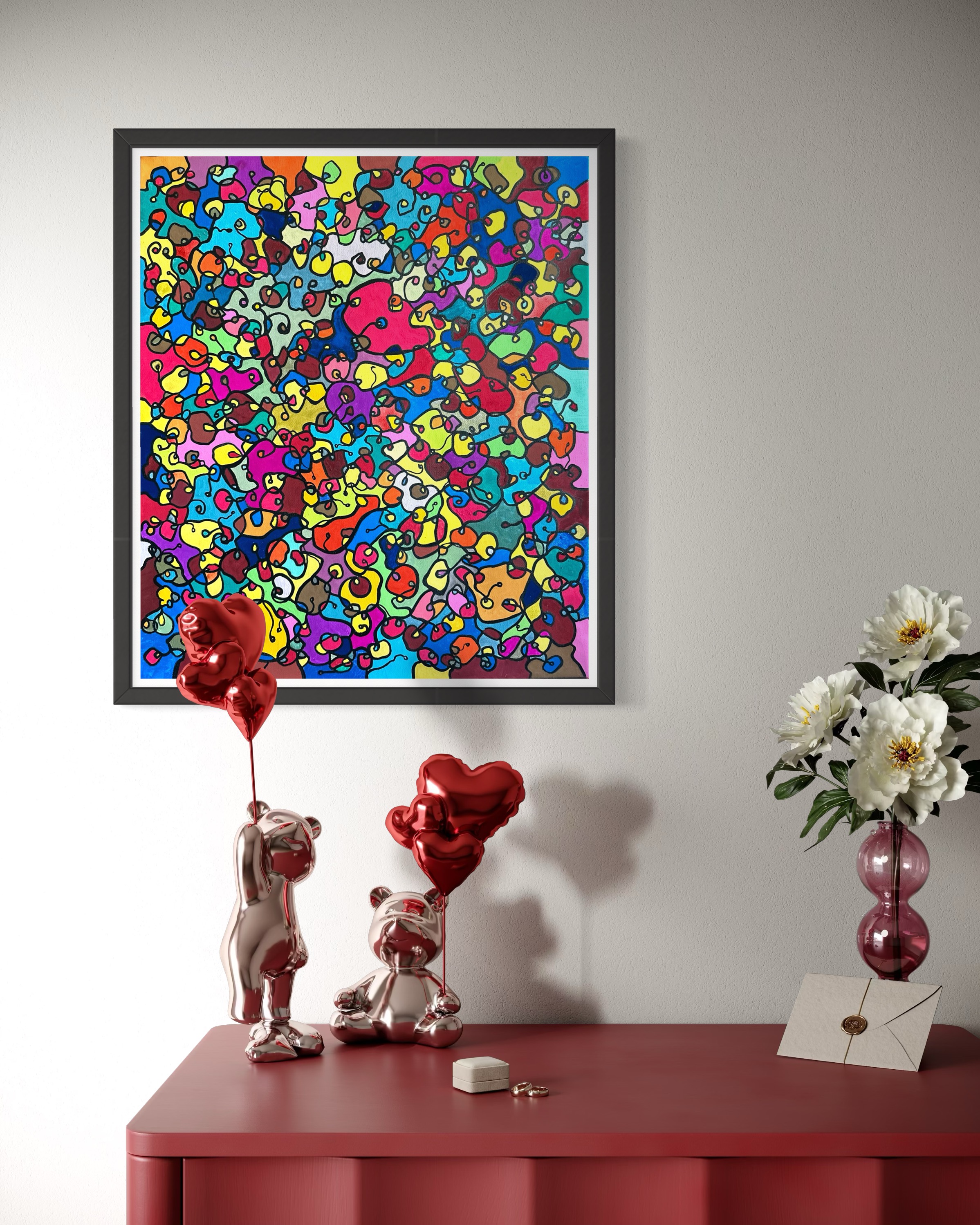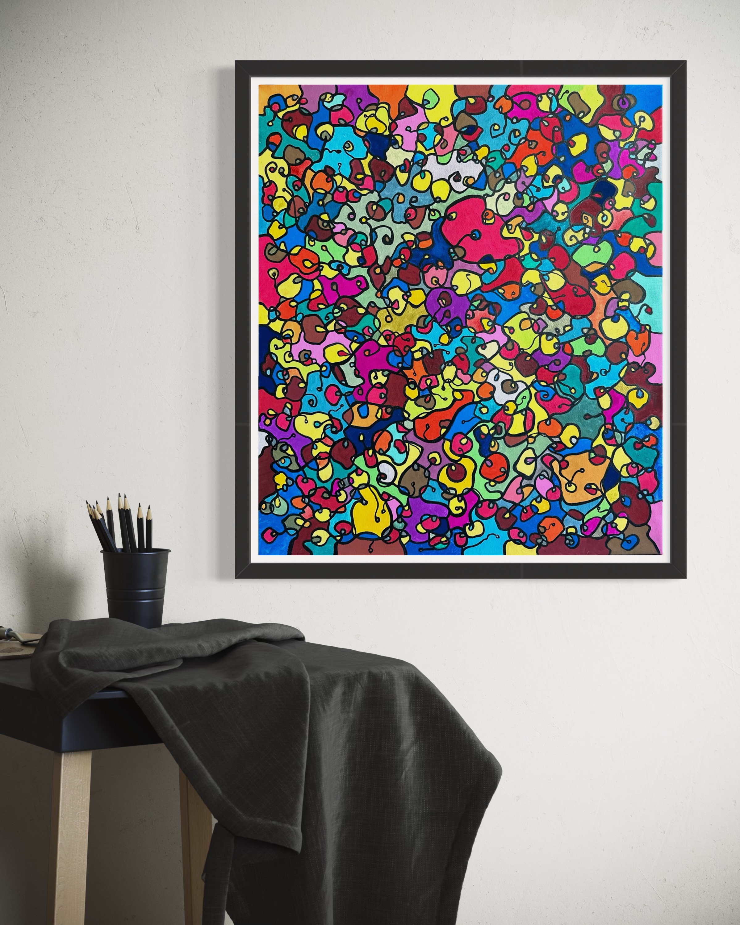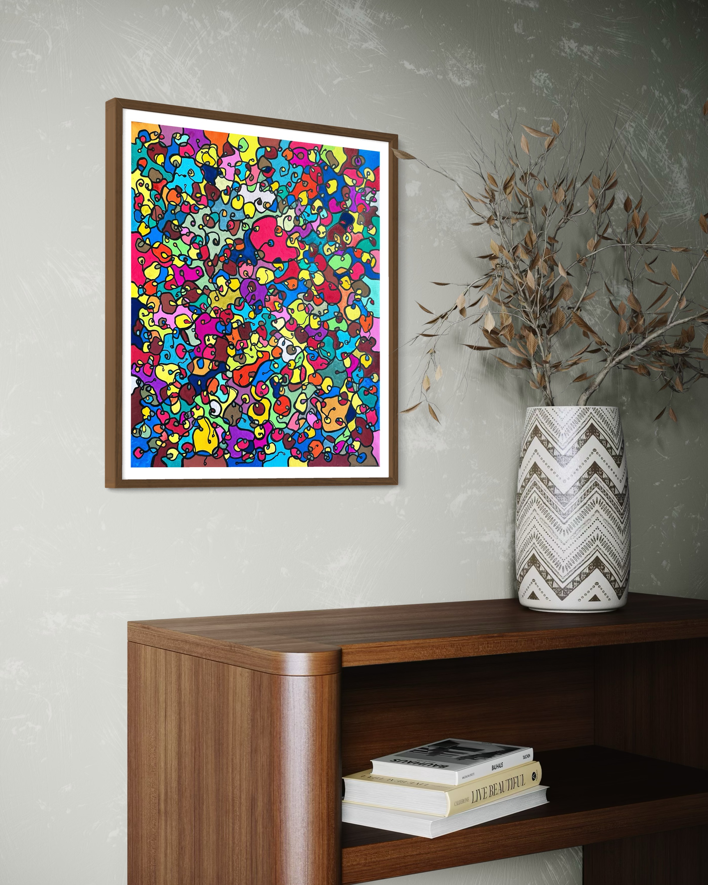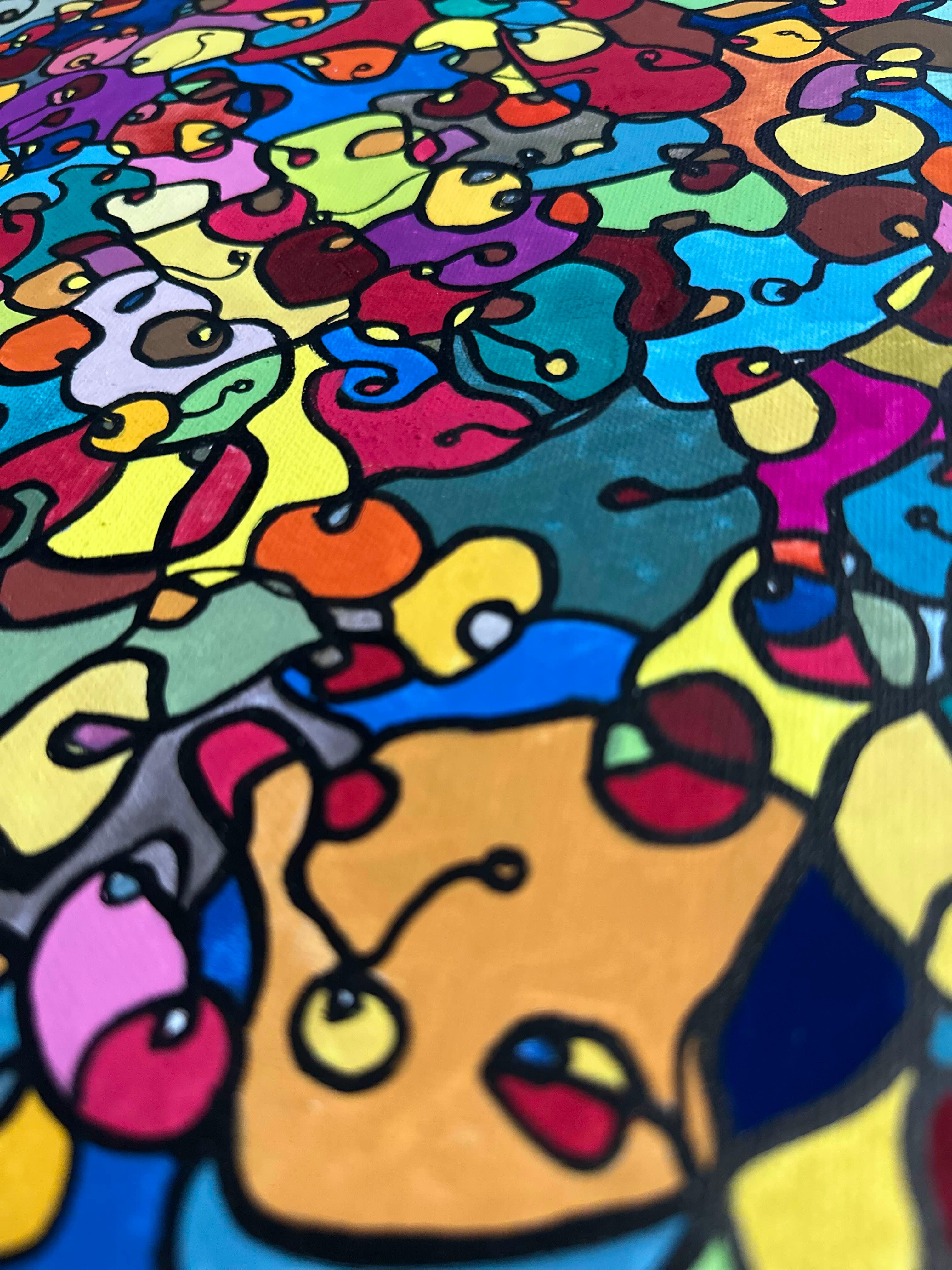 In this painting, I've poured my passion into creating a vibrant, energetic world where organic forms intertwine in a whimsical dance. Inspired by oriental art, each stroke and color captures a spirit of joy and liberation. This artwork isn't just meant to hang on a wall—it's designed to bring a pulse of life and an explosion of color into your space, encouraging everyone who sees it to embrace their most vibrant selves and bloom to their heart's content.