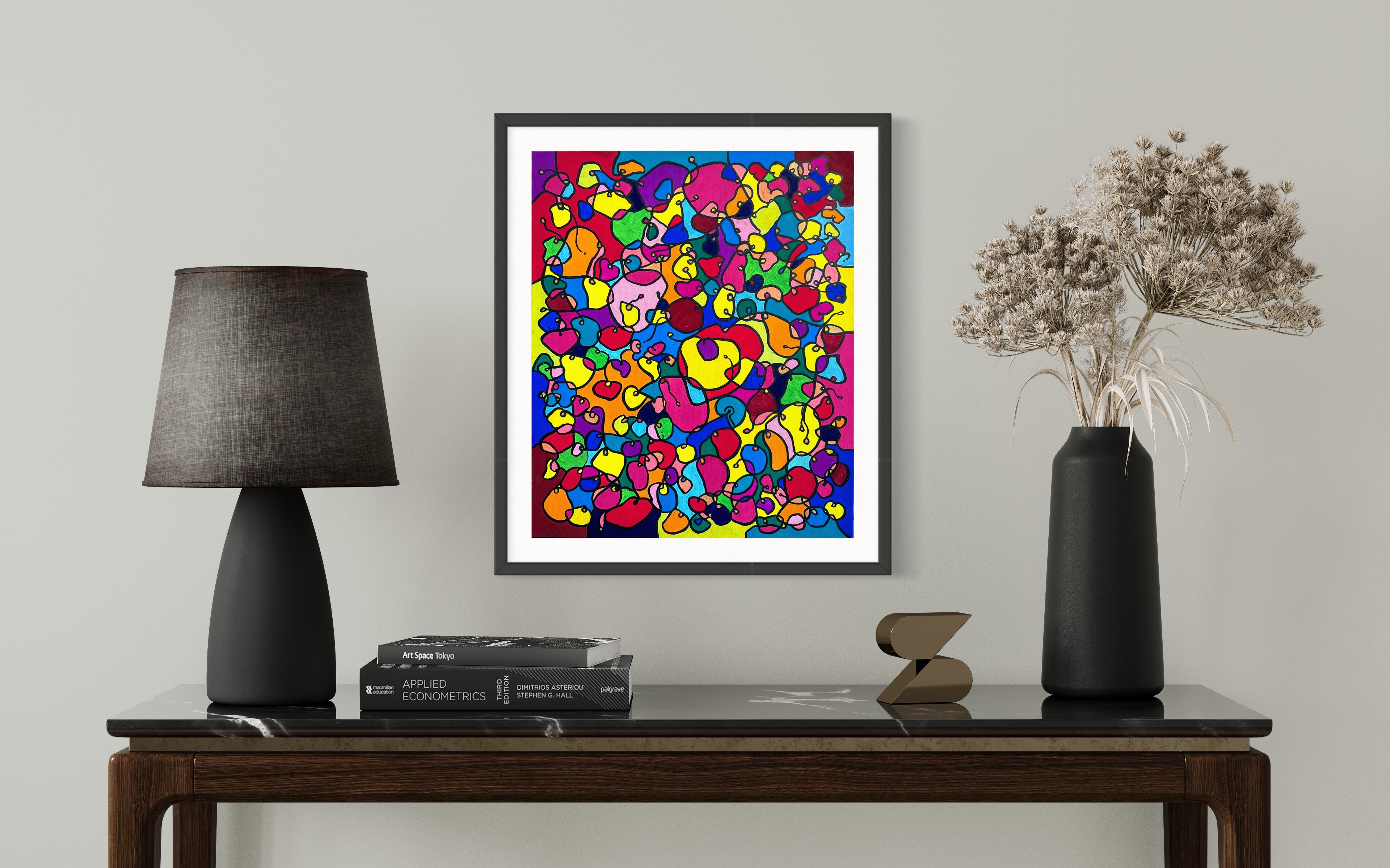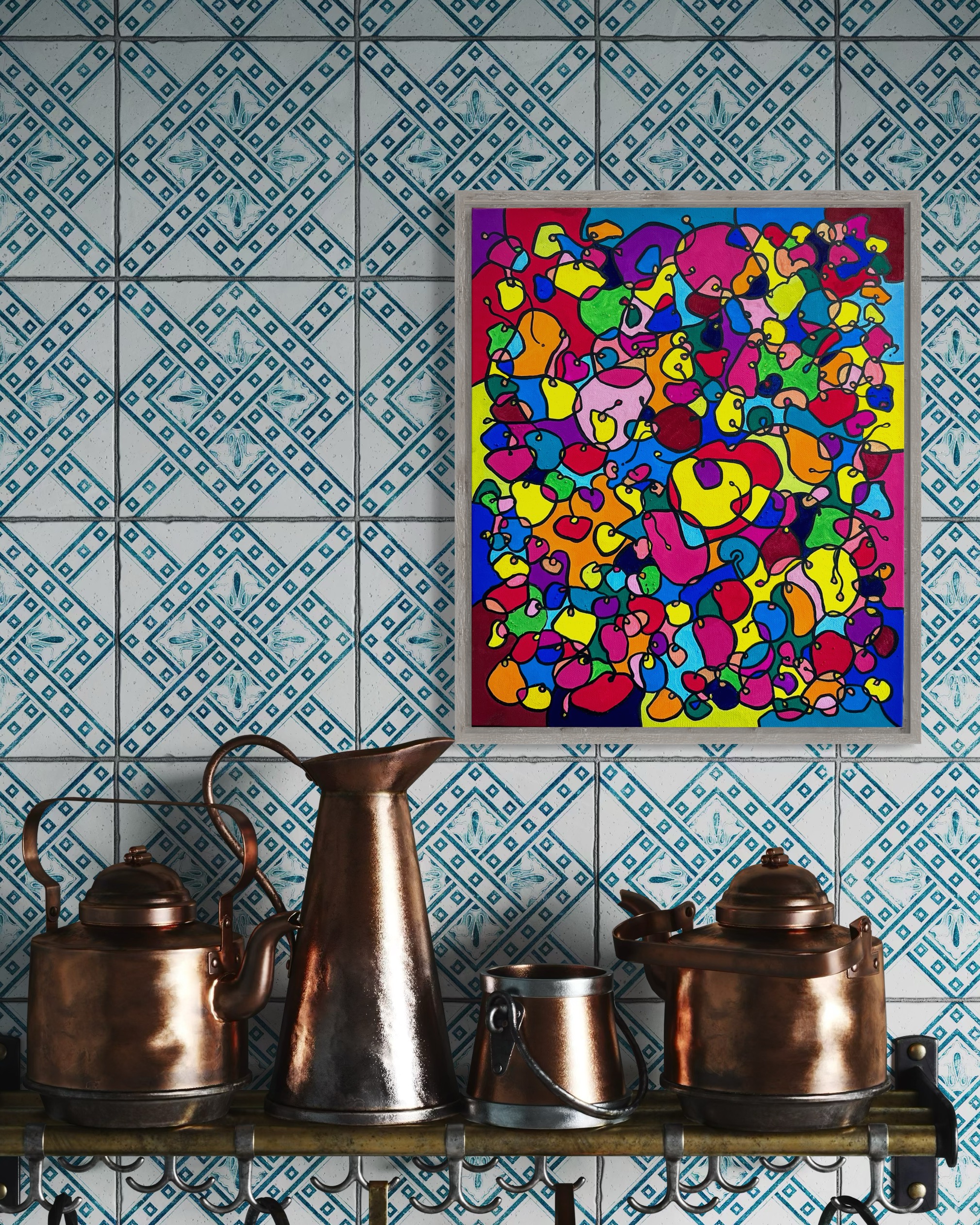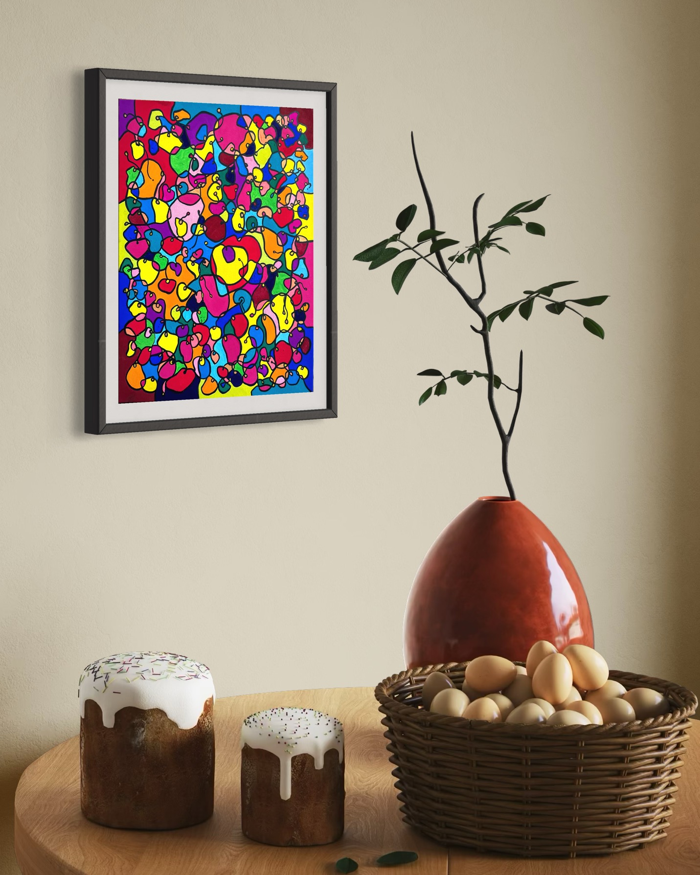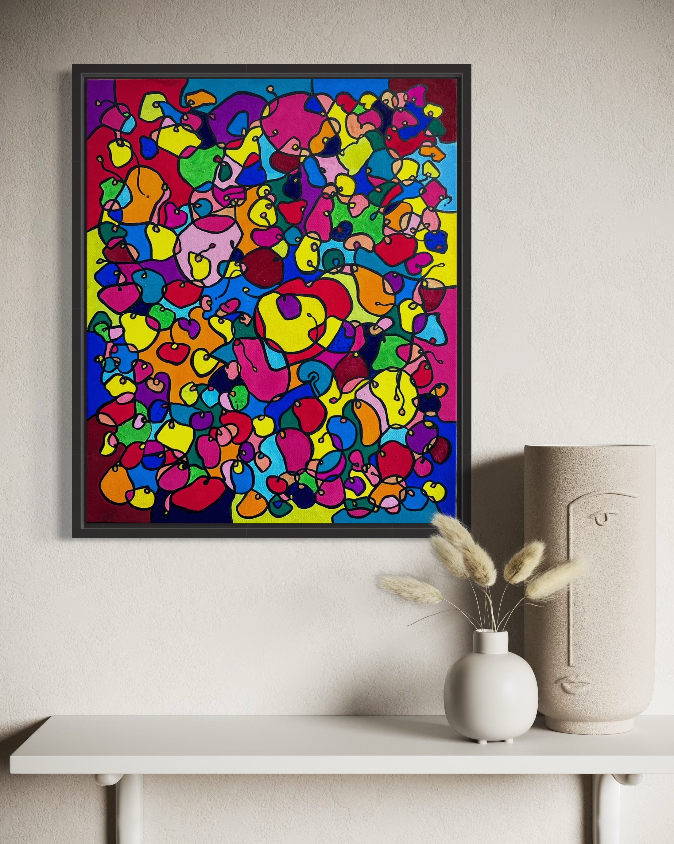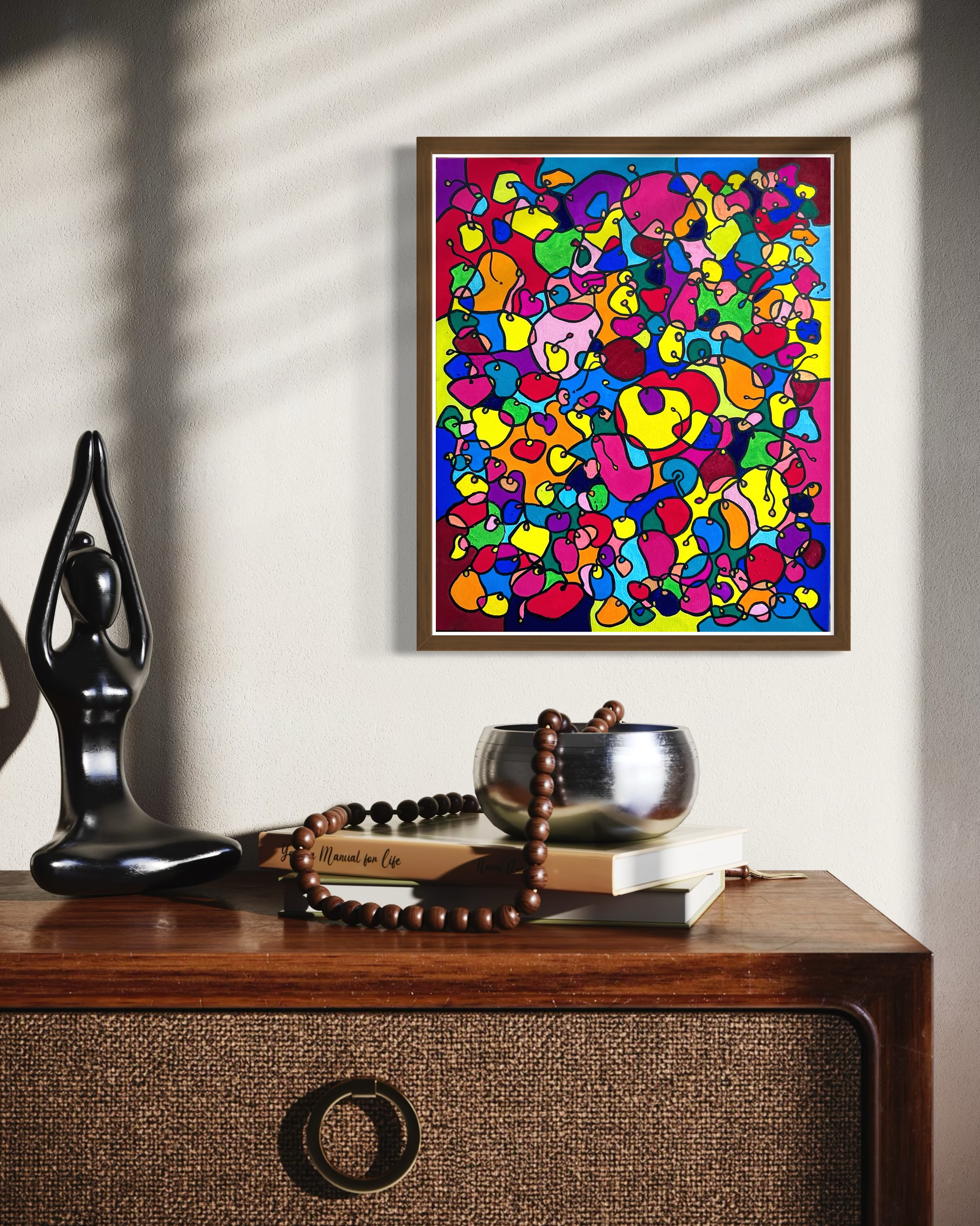 In this painting, I've embraced the vibrancy and fluidity of organic materials, channeling the essence of oriental art through a playful dance of colors and shapes. Each stroke and hue bursts with joy, creating a lively energy that captivates and uplifts. My intention was to weave together tradition and spontaneity, inviting viewers into a world where freedom and harmony coexist brightly on canvas, infusing their space with a spirit of whimsy and inspiration.