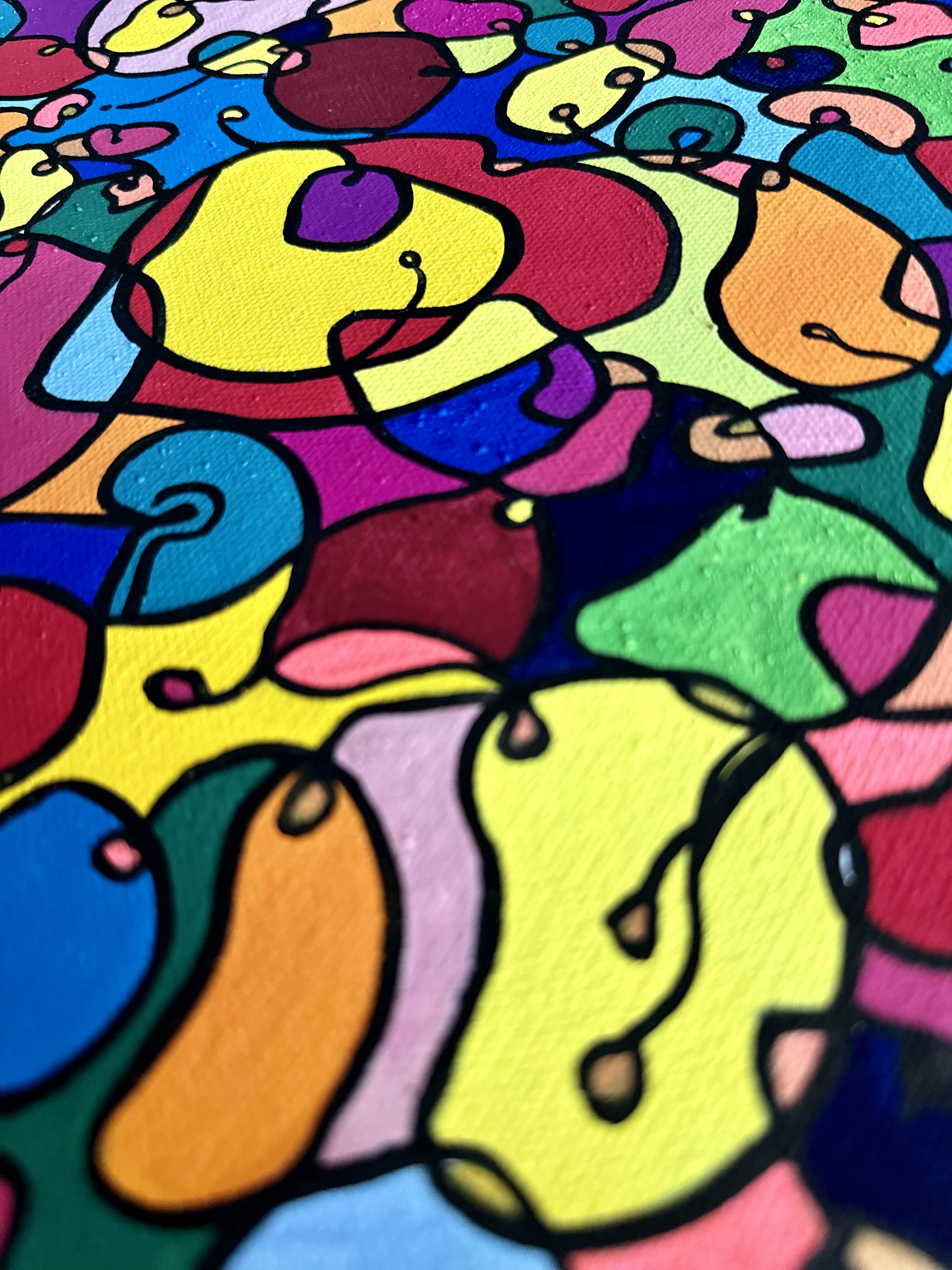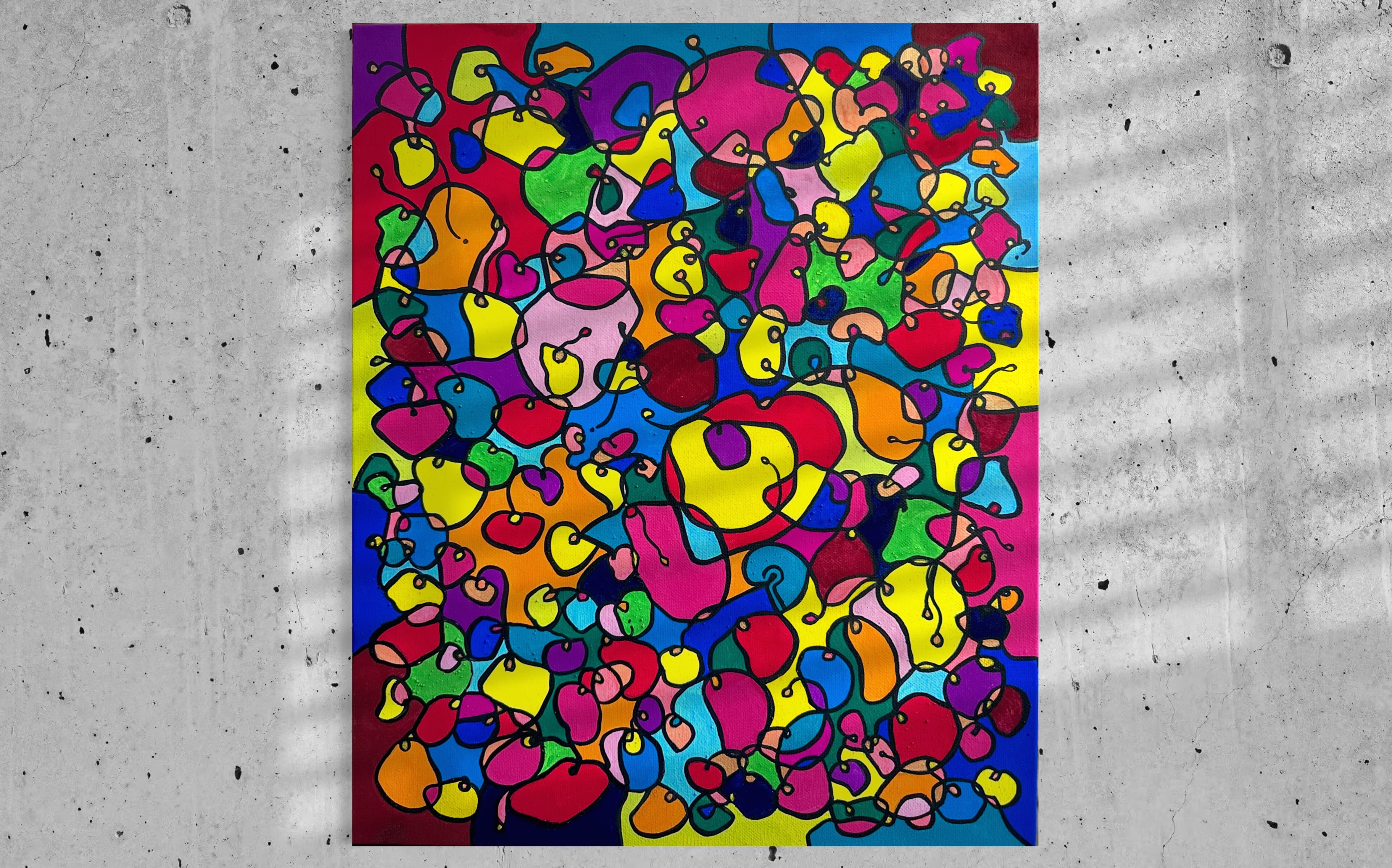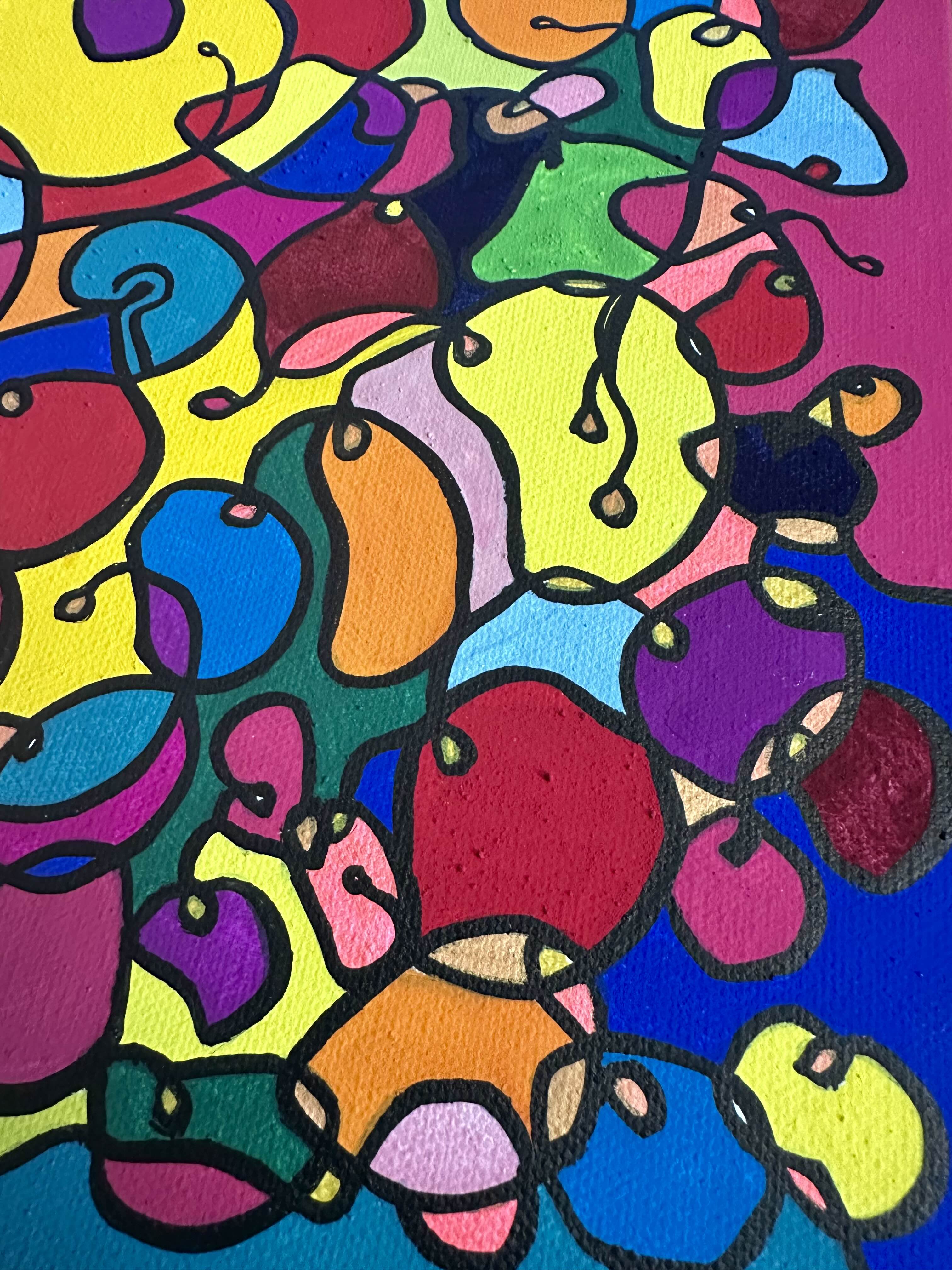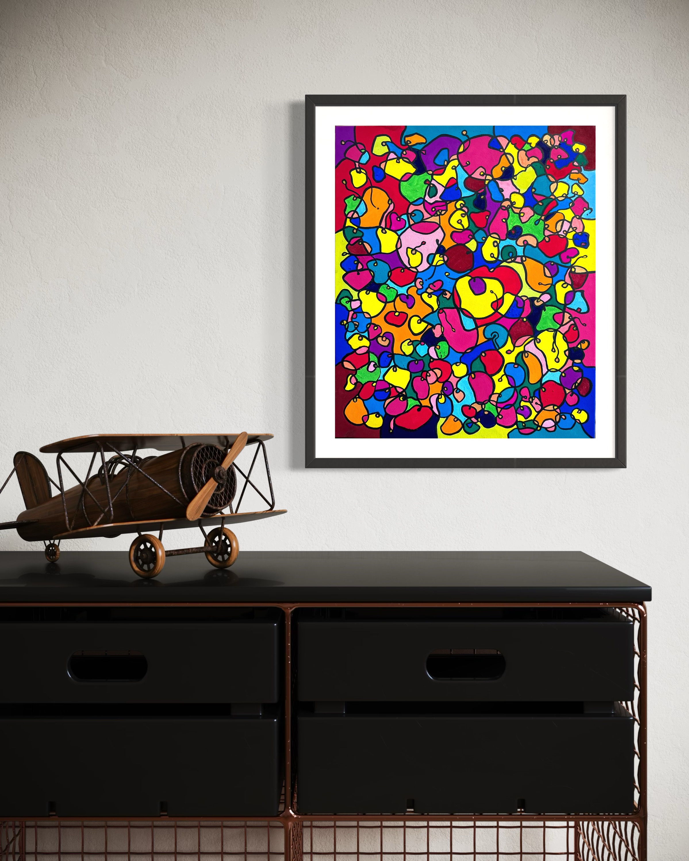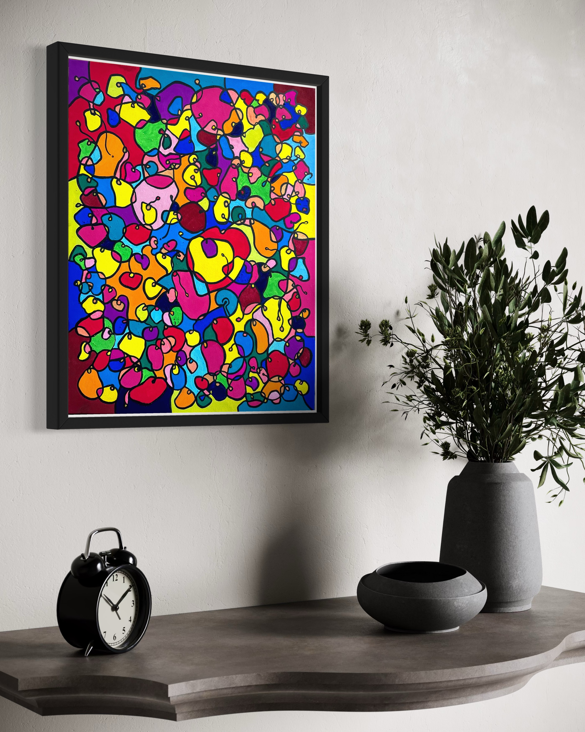 In this painting, I've embraced the vibrancy and fluidity of organic materials, channeling the essence of oriental art through a playful dance of colors and shapes. Each stroke and hue bursts with joy, creating a lively energy that captivates and uplifts. My intention was to weave together tradition and spontaneity, inviting viewers into a world where freedom and harmony coexist brightly on canvas, infusing their space with a spirit of whimsy and inspiration.