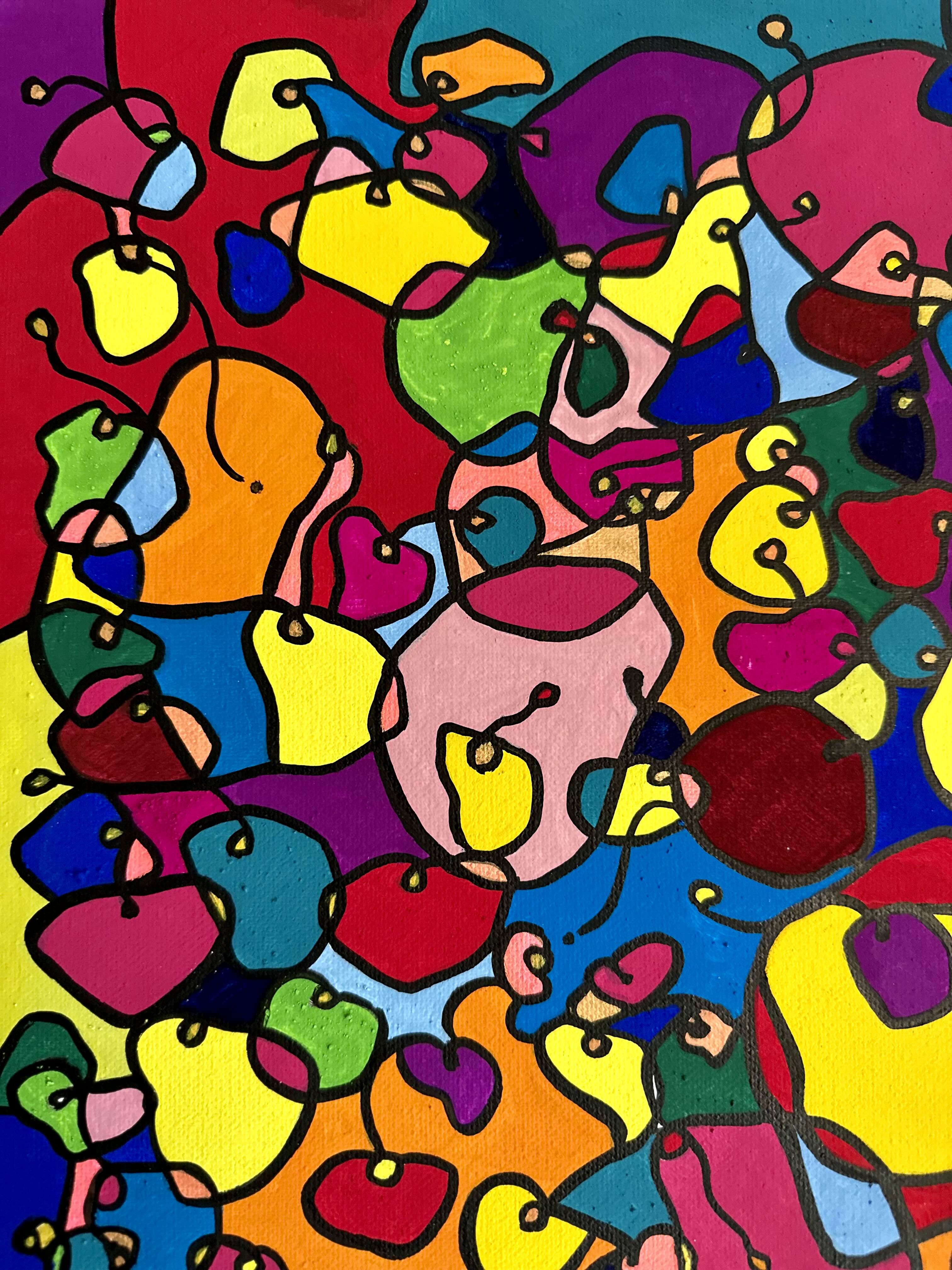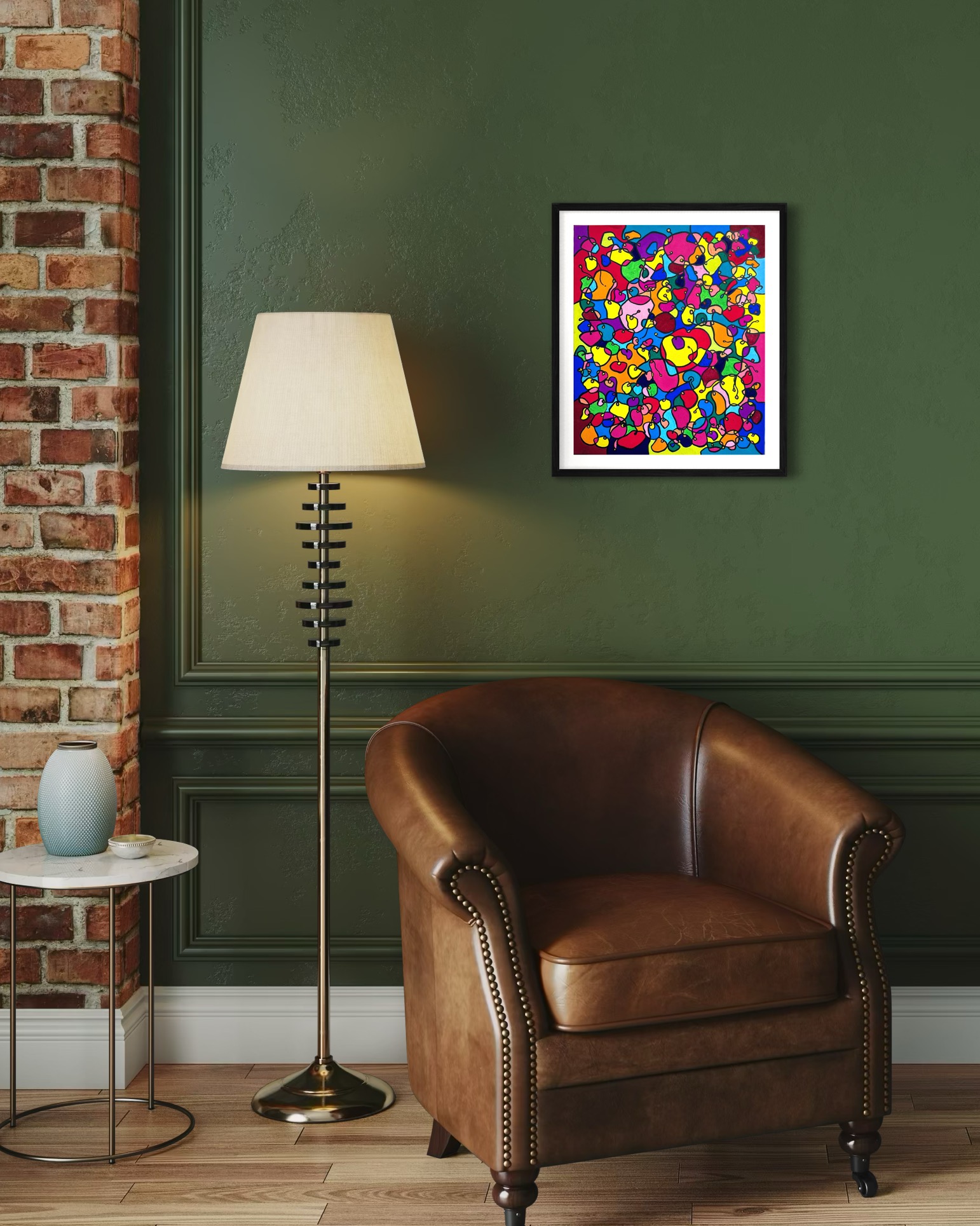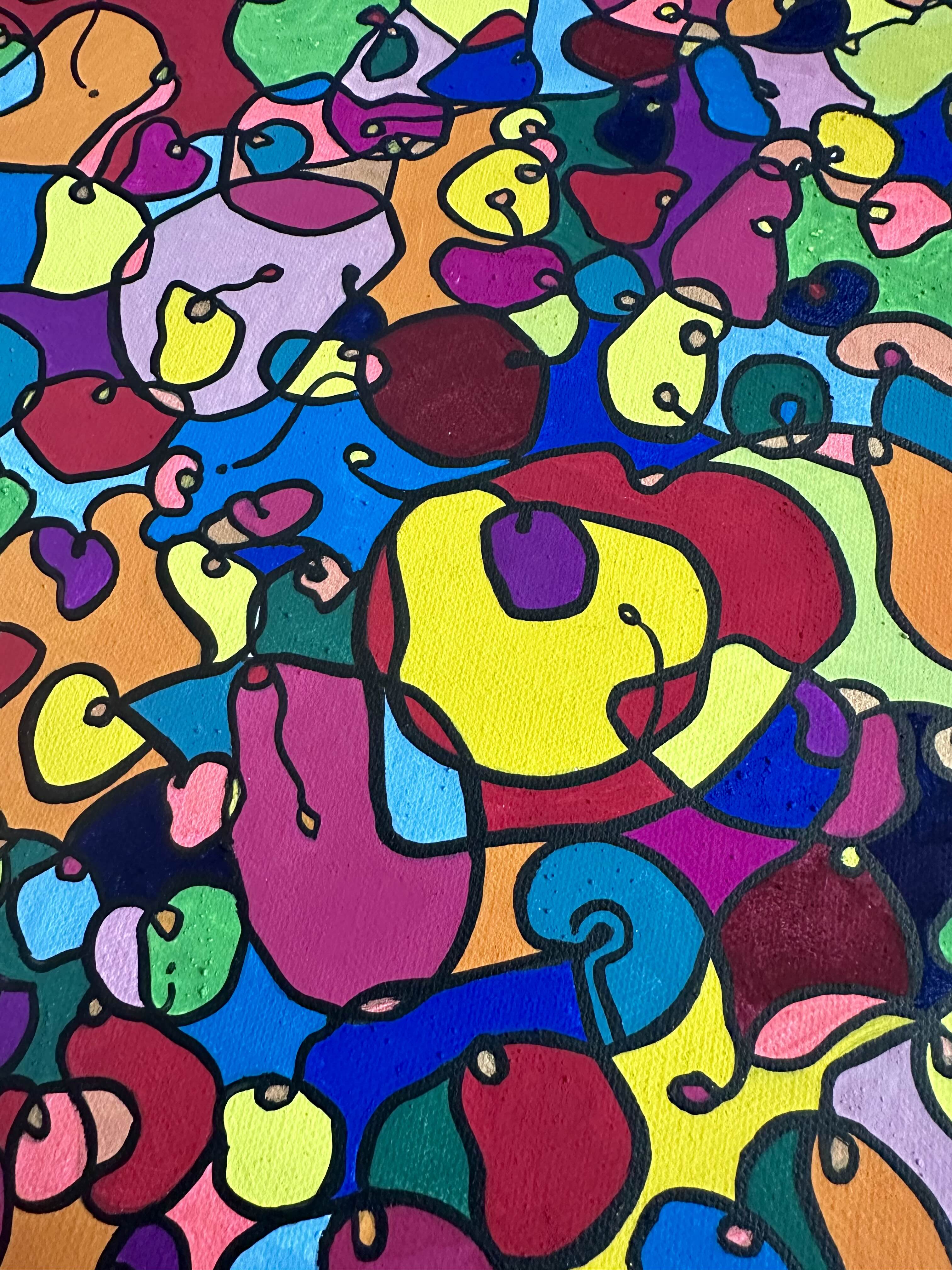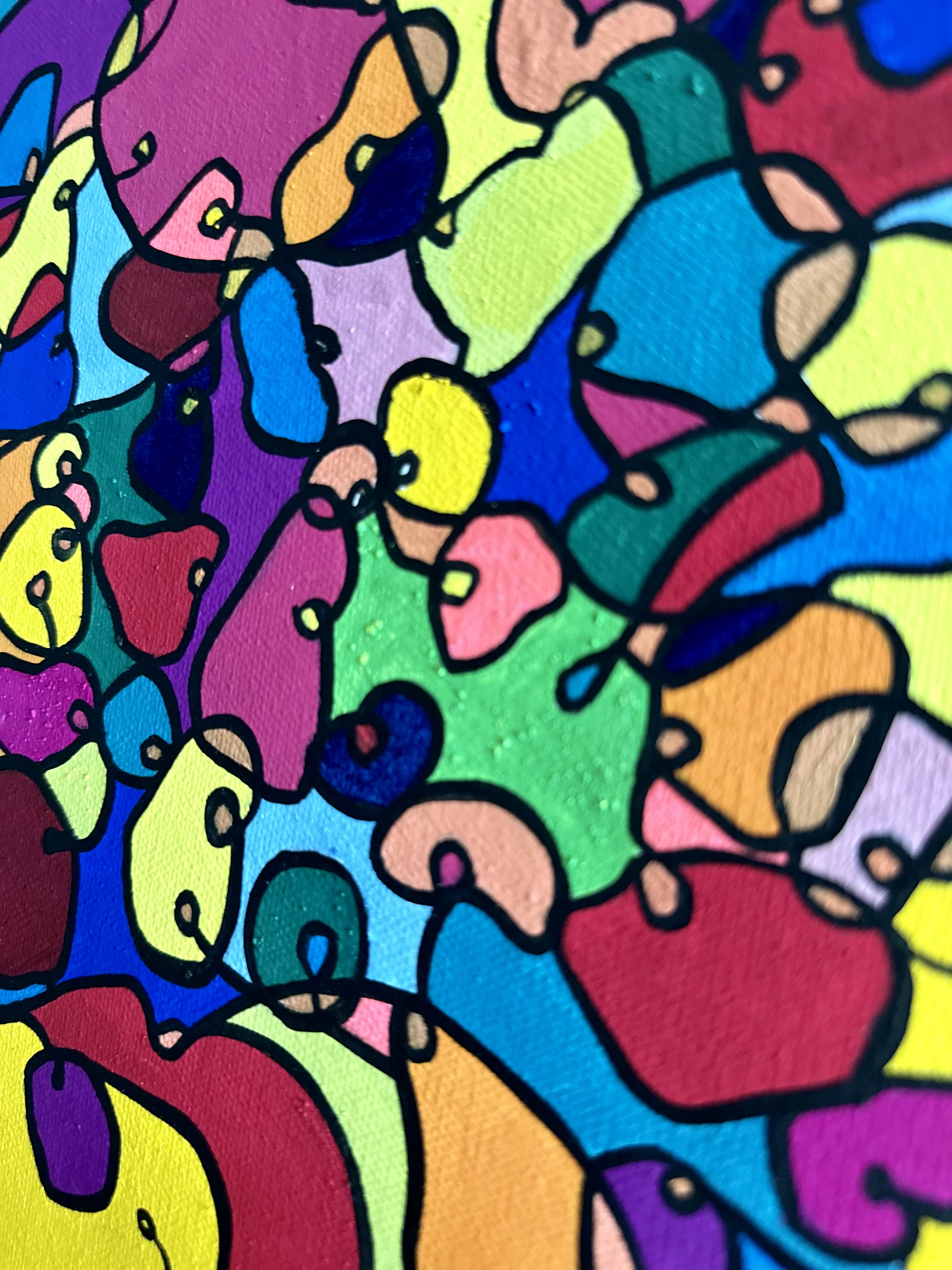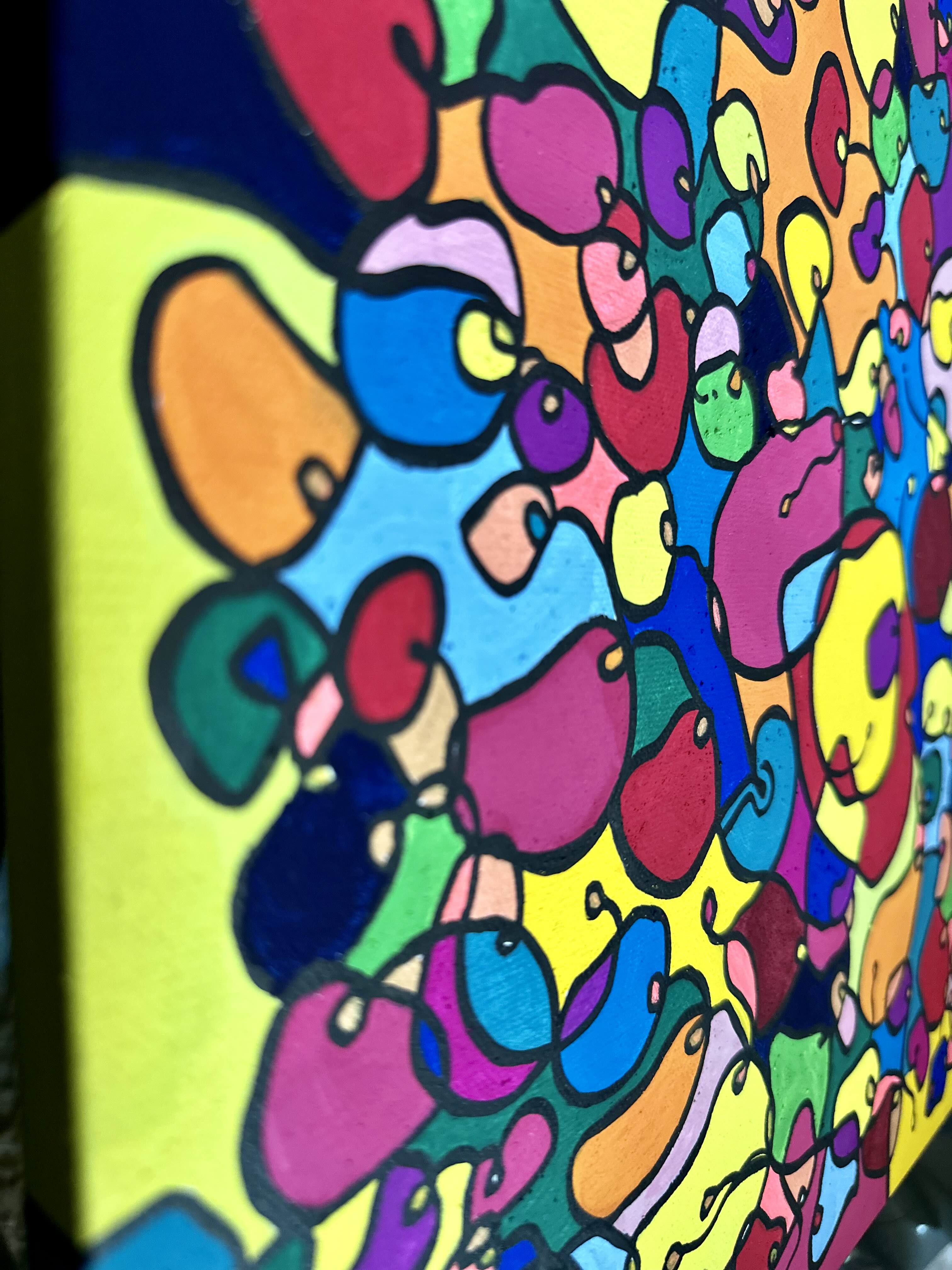 In this painting, I've embraced the vibrancy and fluidity of organic materials, channeling the essence of oriental art through a playful dance of colors and shapes. Each stroke and hue bursts with joy, creating a lively energy that captivates and uplifts. My intention was to weave together tradition and spontaneity, inviting viewers into a world where freedom and harmony coexist brightly on canvas, infusing their space with a spirit of whimsy and inspiration.