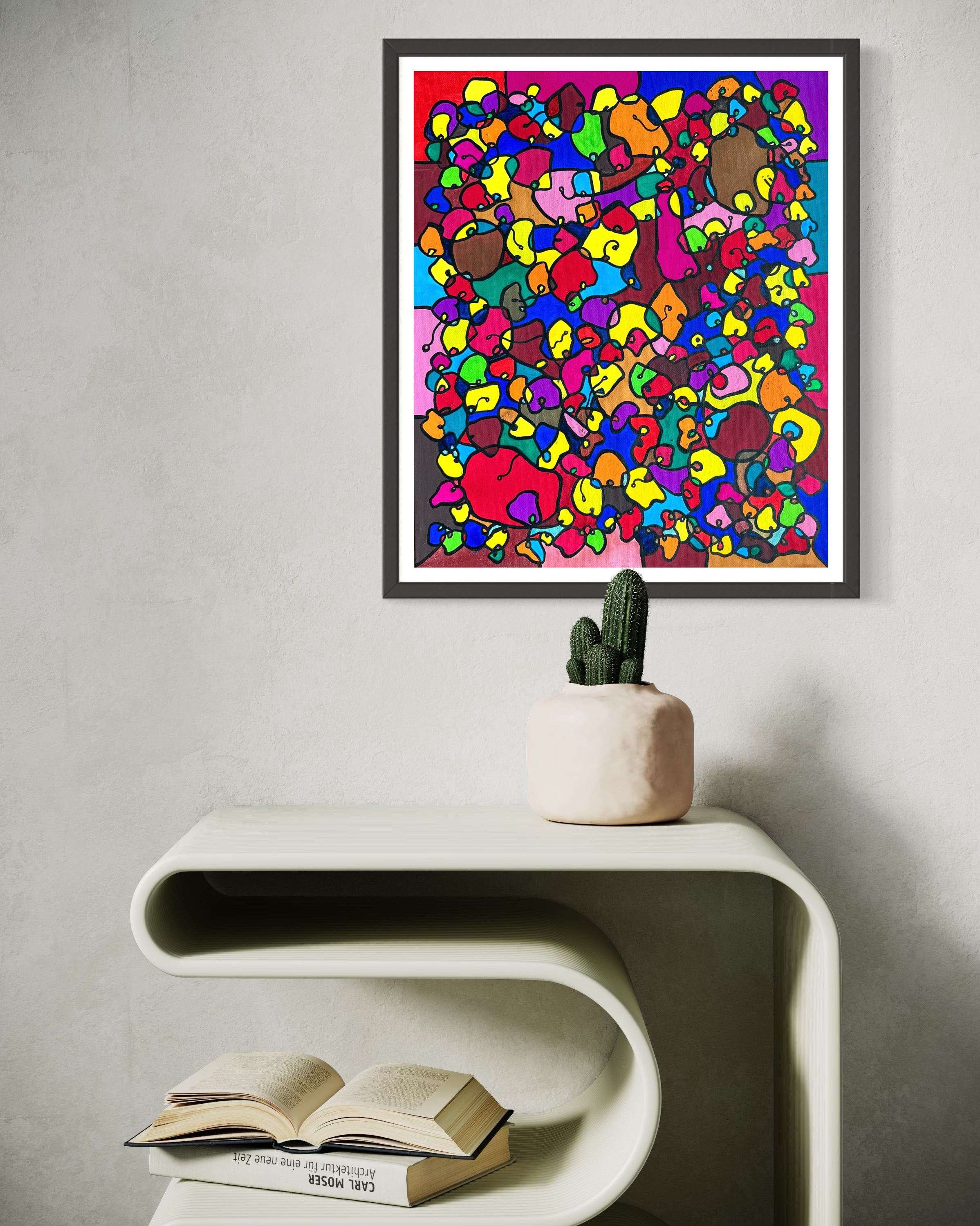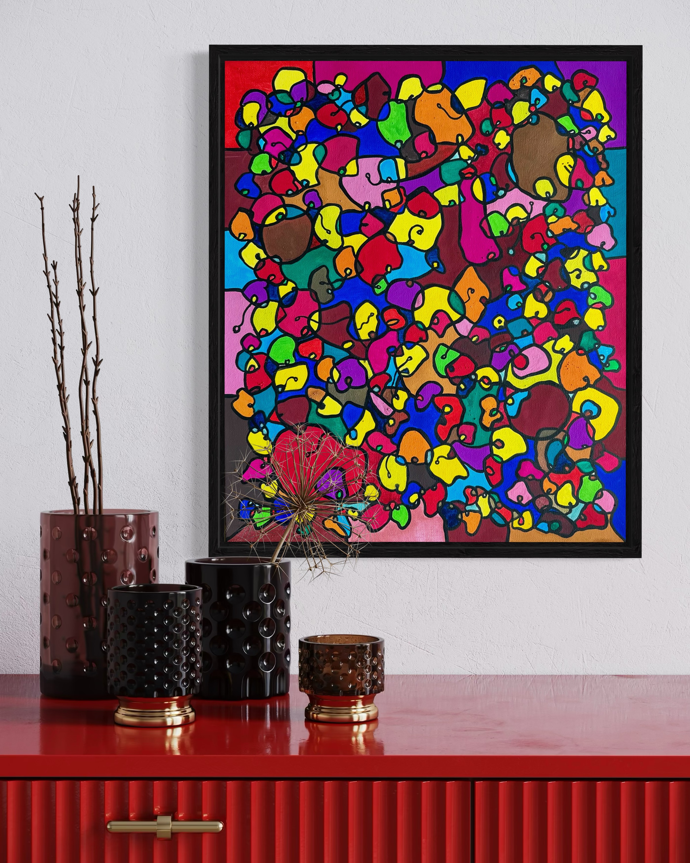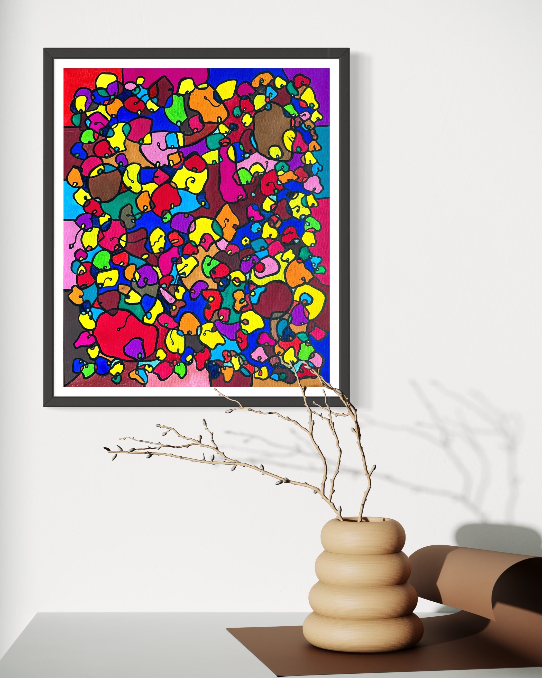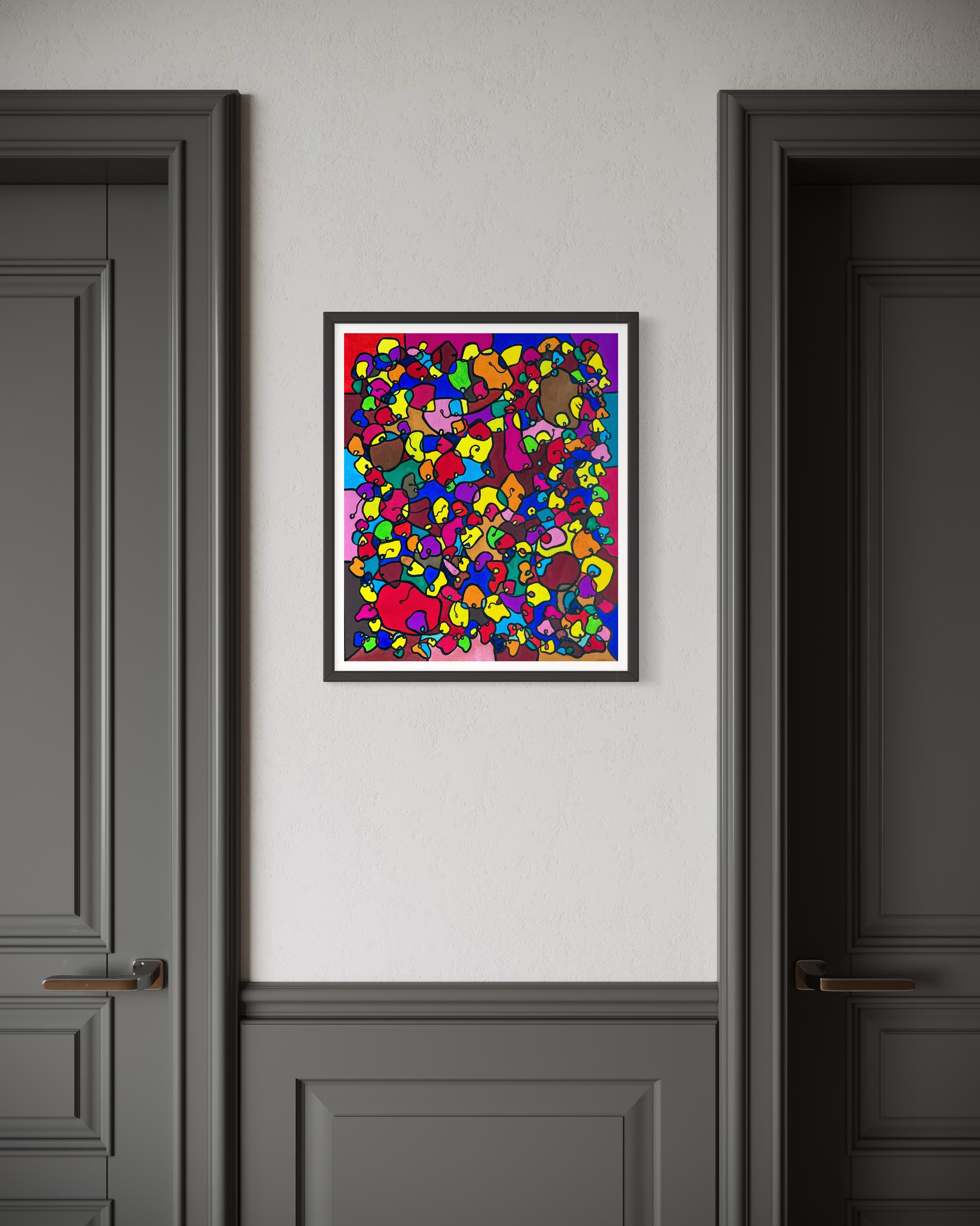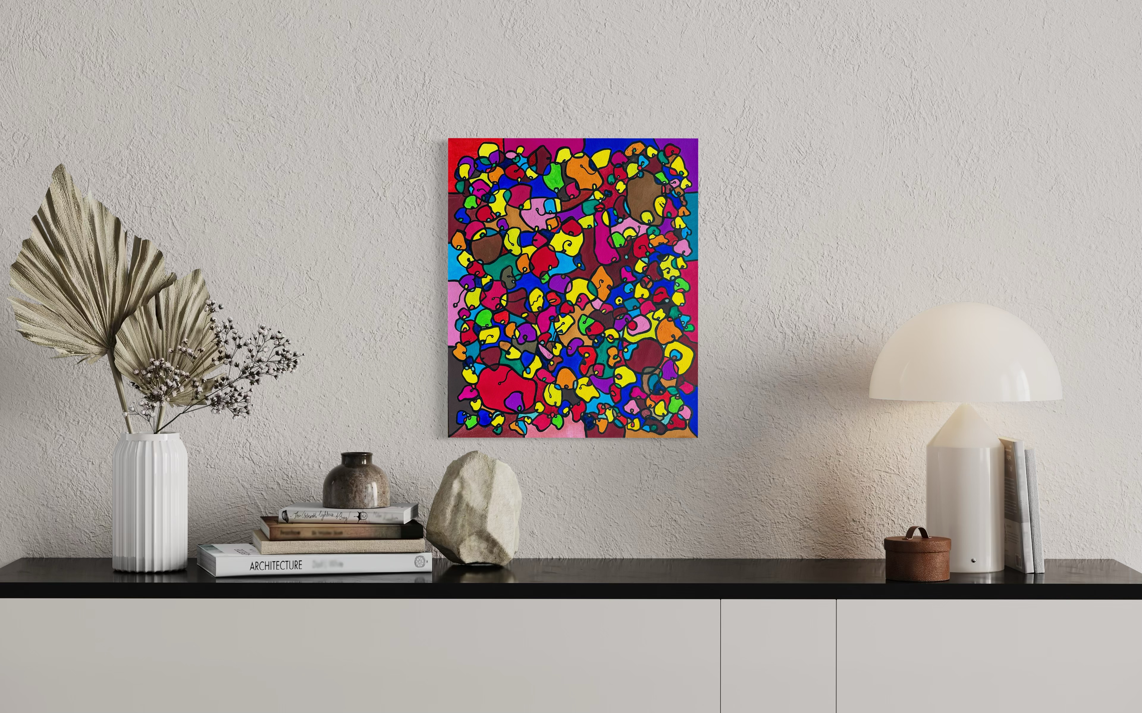 This artwork is a vivid celebration of color and organic flow, deeply inspired by oriental art. I employed organic materials to create a piece that balances the dynamic interaction of forms with serene harmony. Each shape and hue intertwines, symbolizing the interconnectedness of life and the vibrant diversity found in nature. It’s meant to bring a burst of energy and contemplative beauty to any space, engaging viewers in a visual dance of form and color.