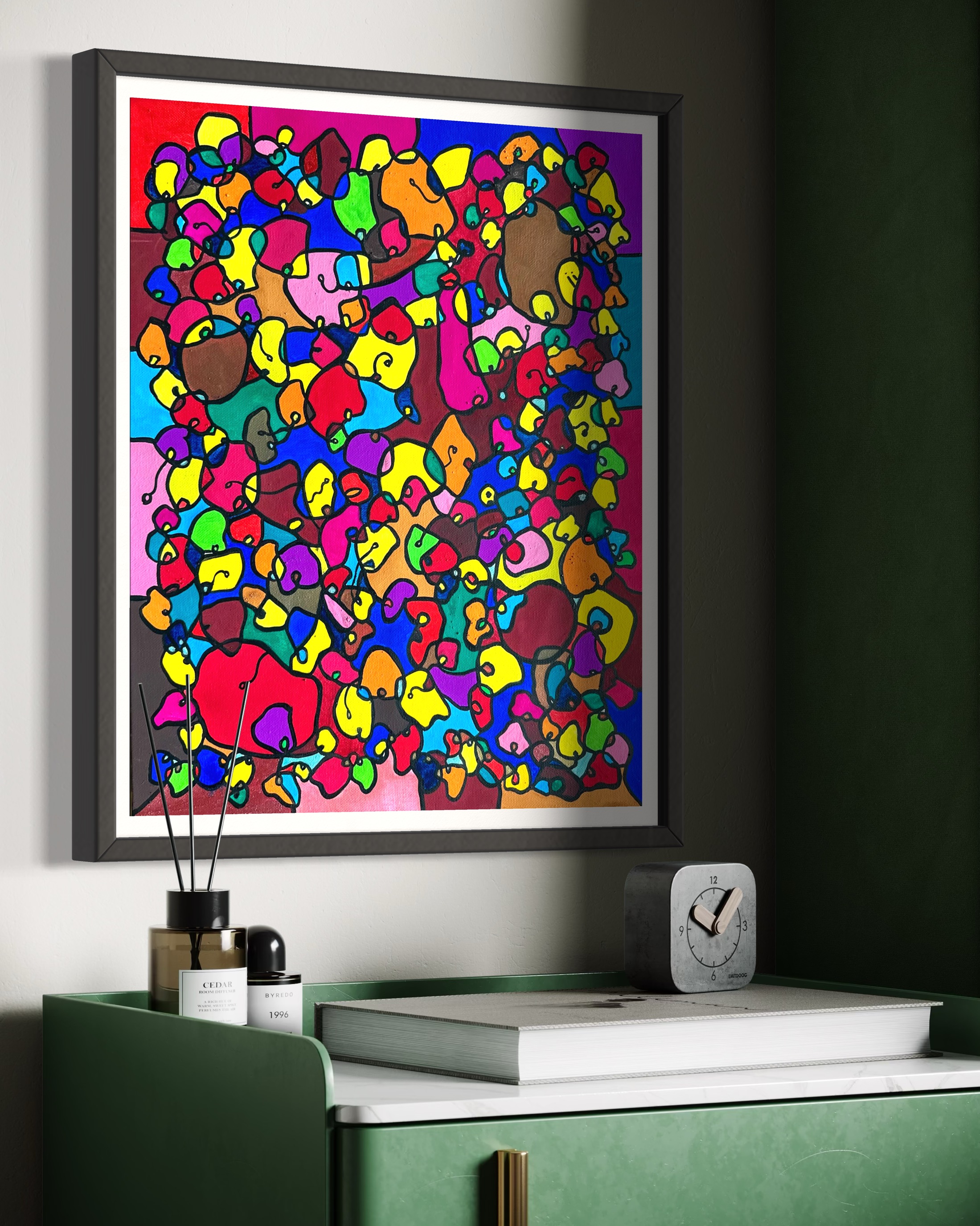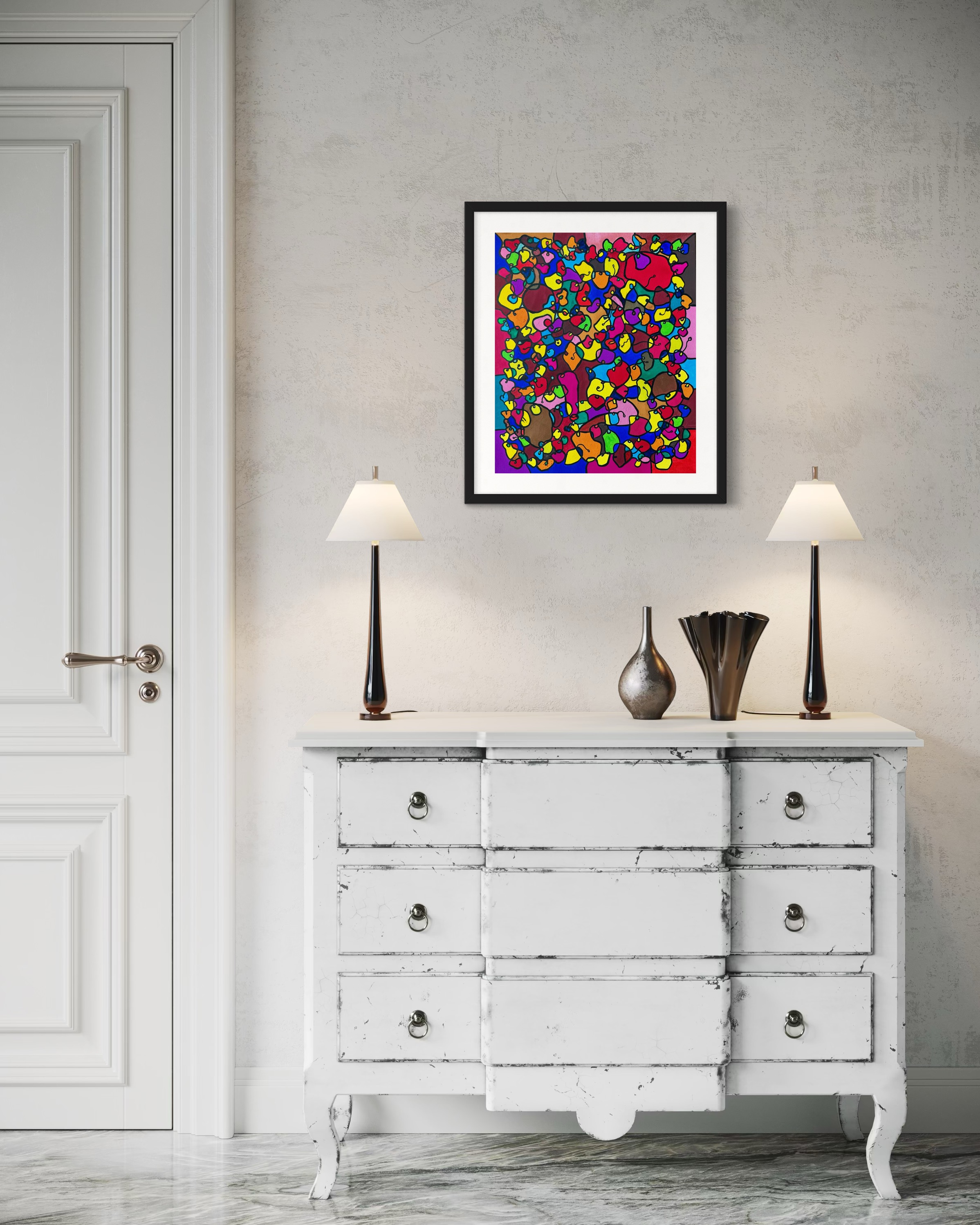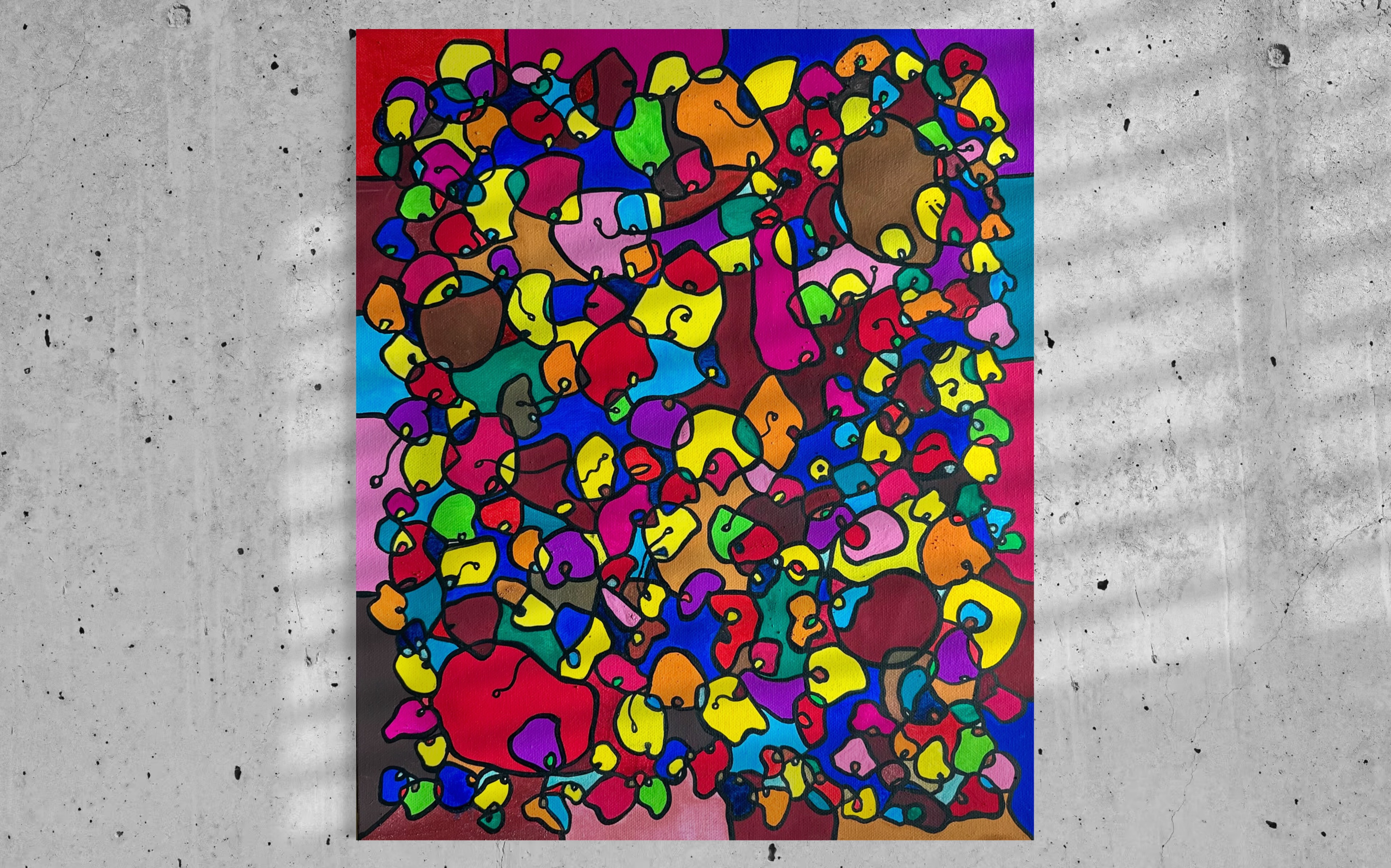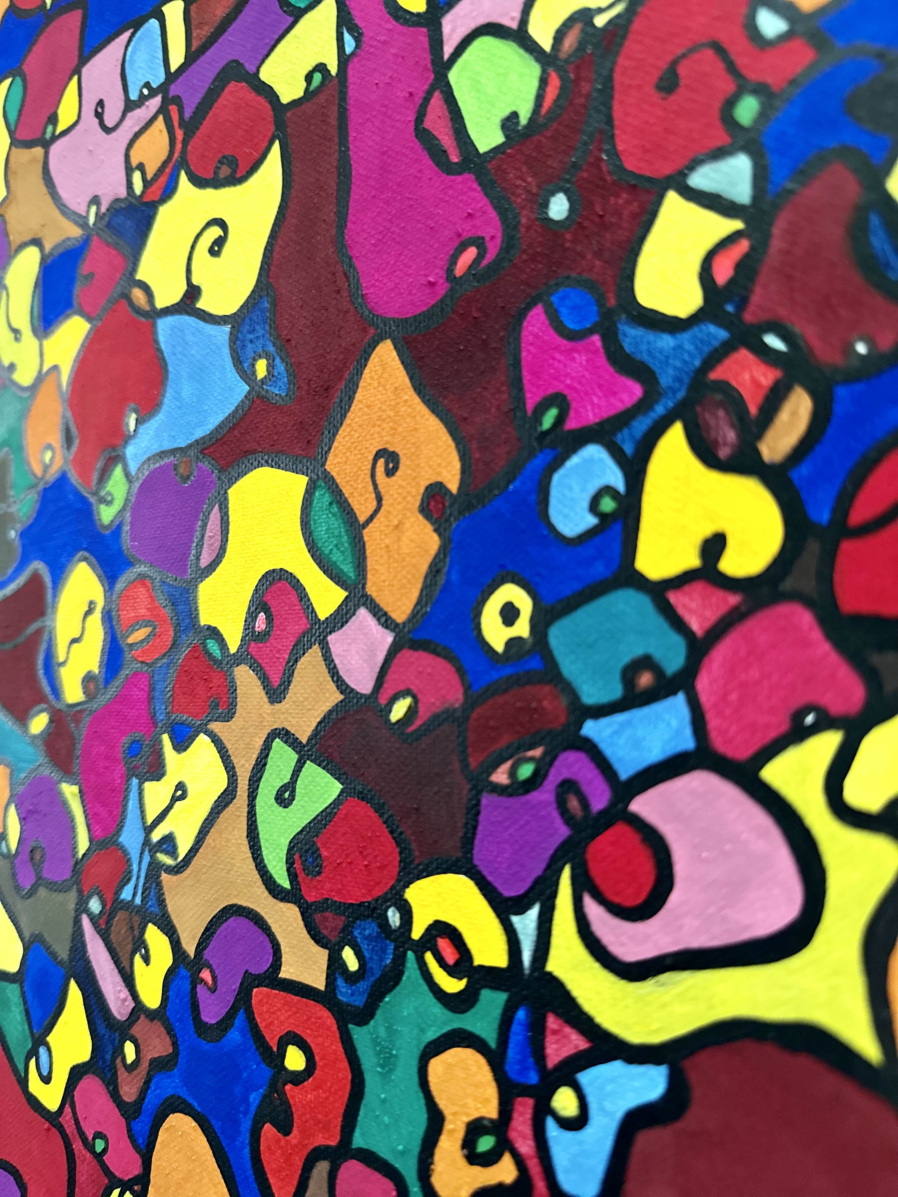 This artwork is a vivid celebration of color and organic flow, deeply inspired by oriental art. I employed organic materials to create a piece that balances the dynamic interaction of forms with serene harmony. Each shape and hue intertwines, symbolizing the interconnectedness of life and the vibrant diversity found in nature. It’s meant to bring a burst of energy and contemplative beauty to any space, engaging viewers in a visual dance of form and color.