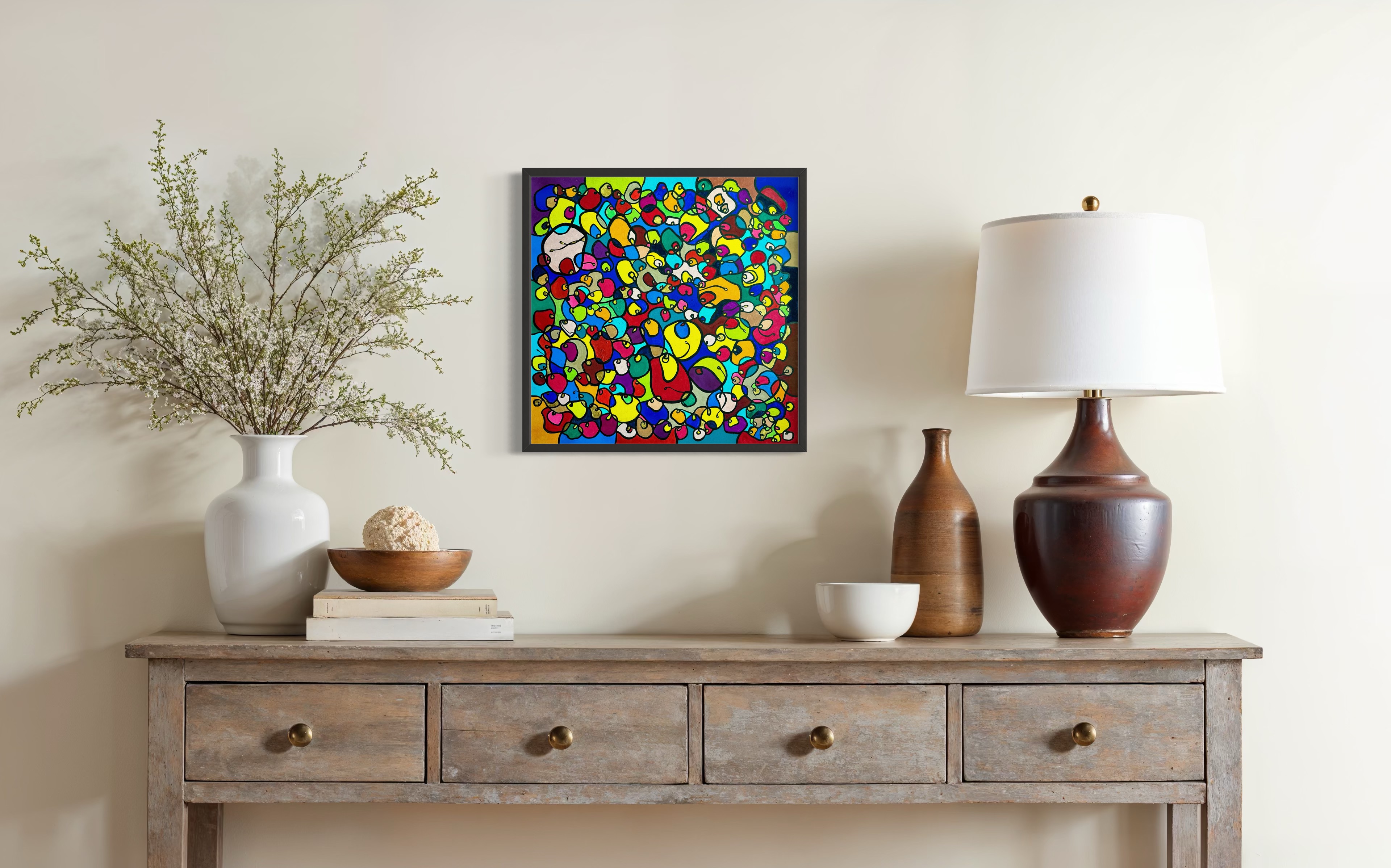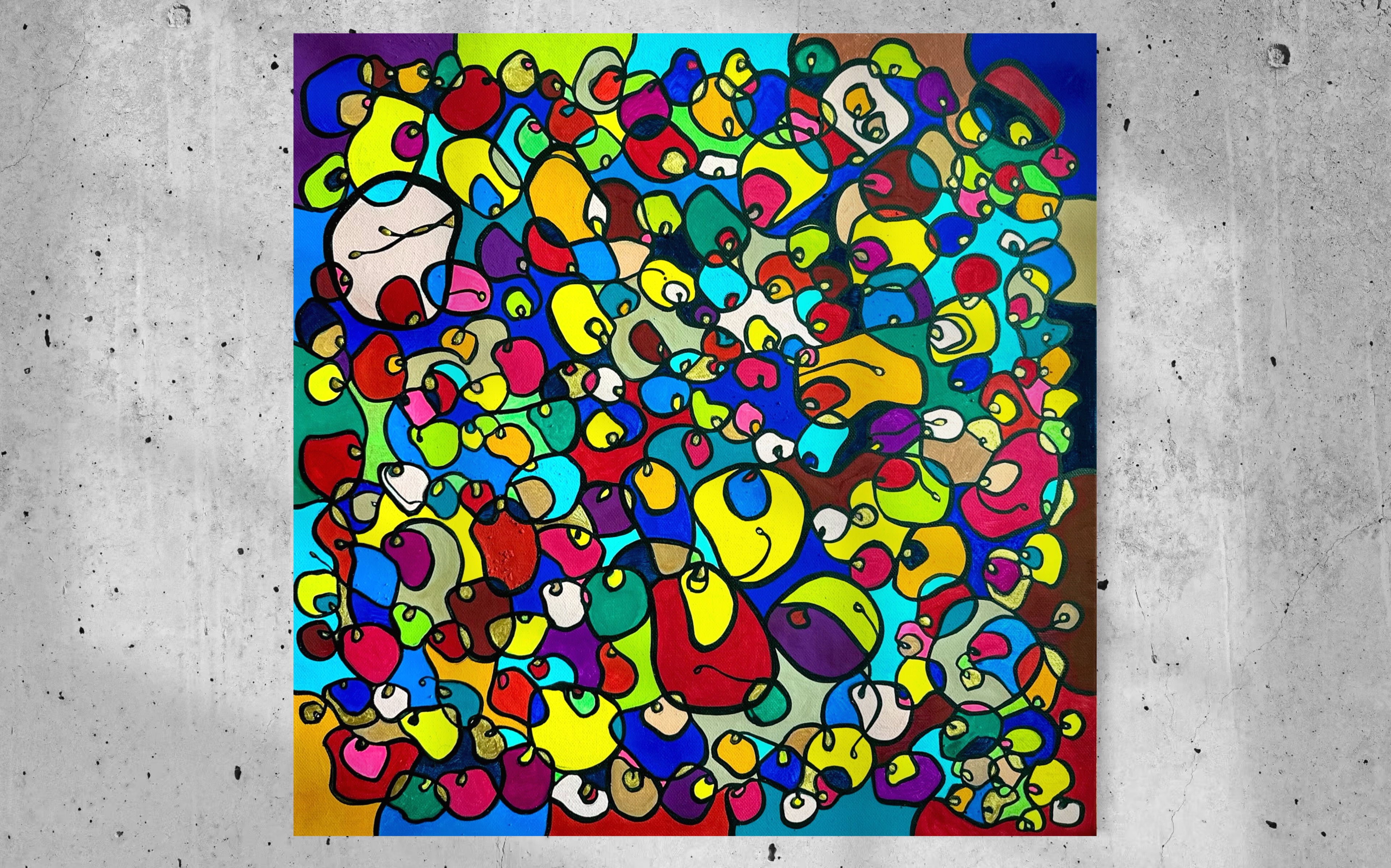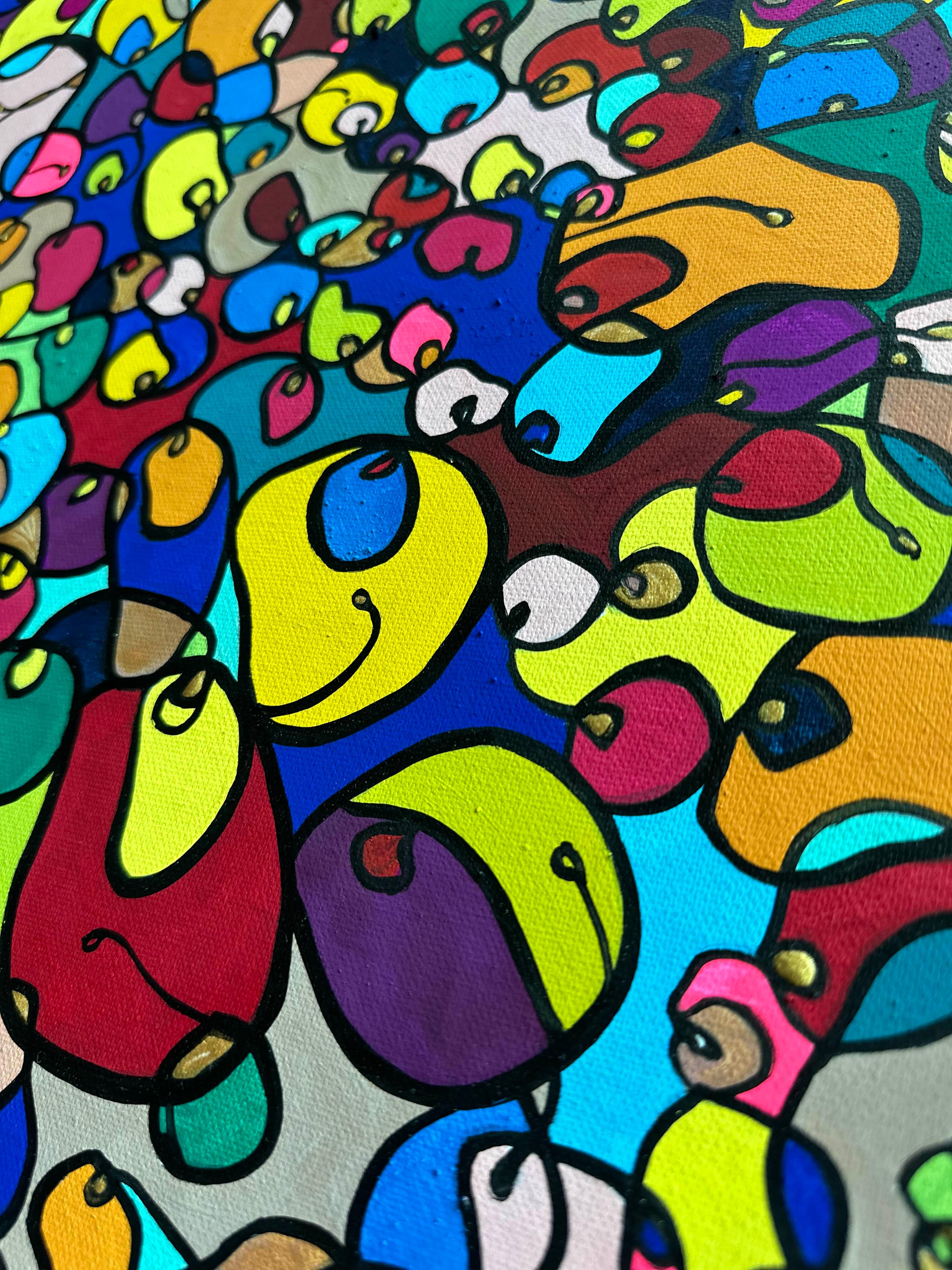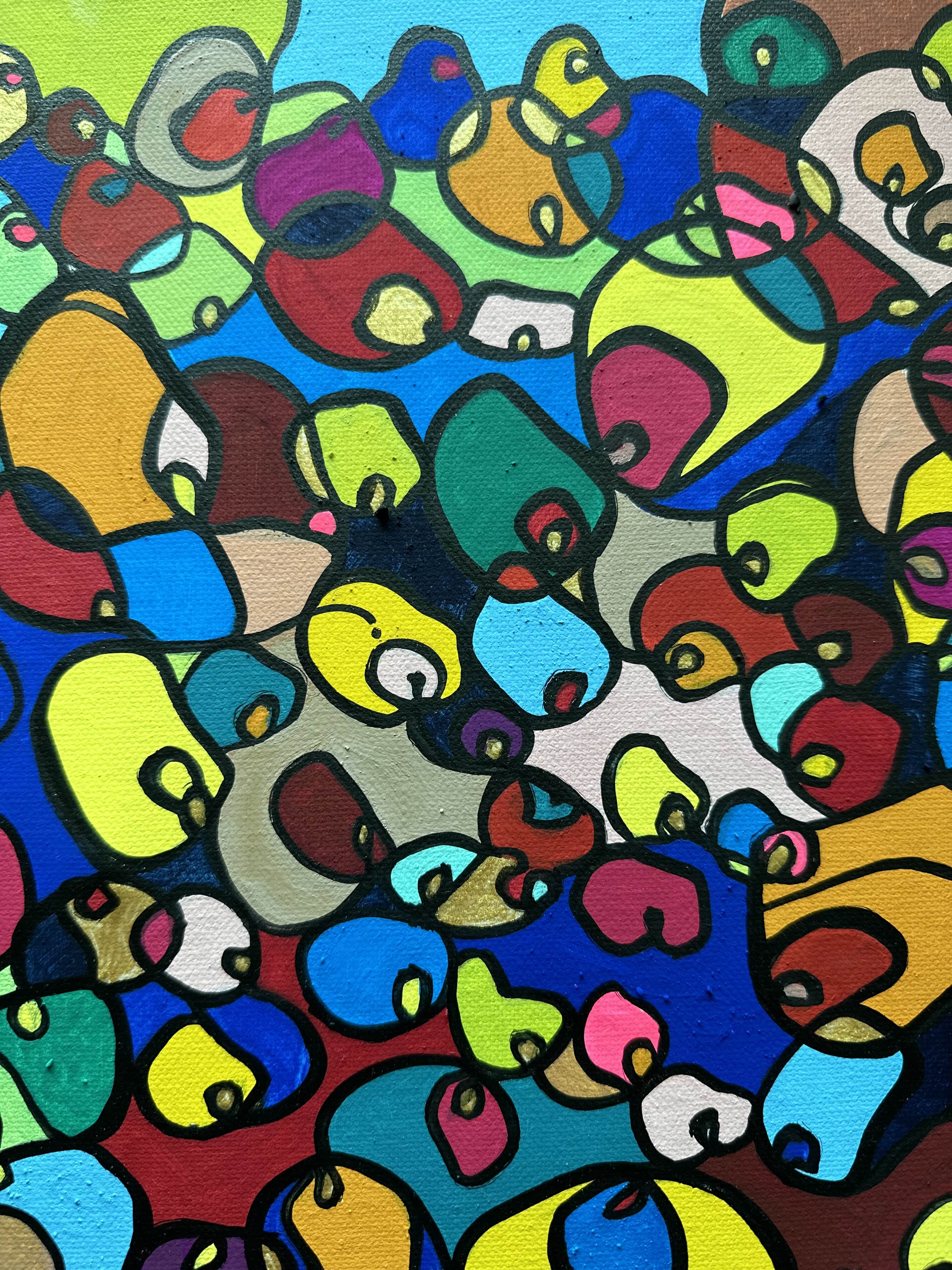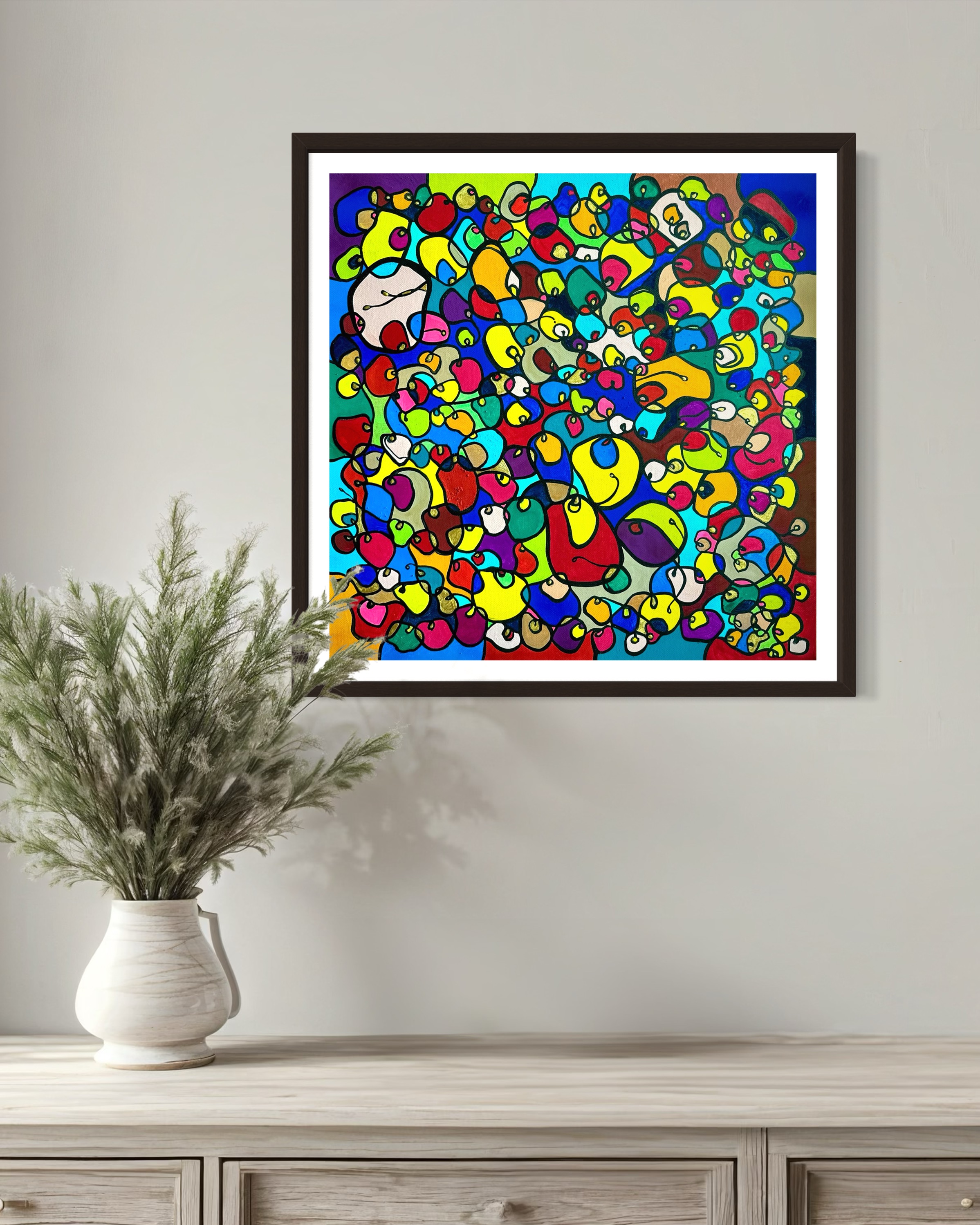 In this vibrant creation, I've painted a joyful mélange of shapes and colors that dance across the canvas in rich, organic textures. Drawing inspiration from oriental art, each element swirls harmoniously into the next, representing unity and the beauty of diversity. This artwork is meant to uplift the spirit and infuse any space with a burst of life and energy, encouraging onlookers to see the world in the optimistic hues of possibility and wonder.