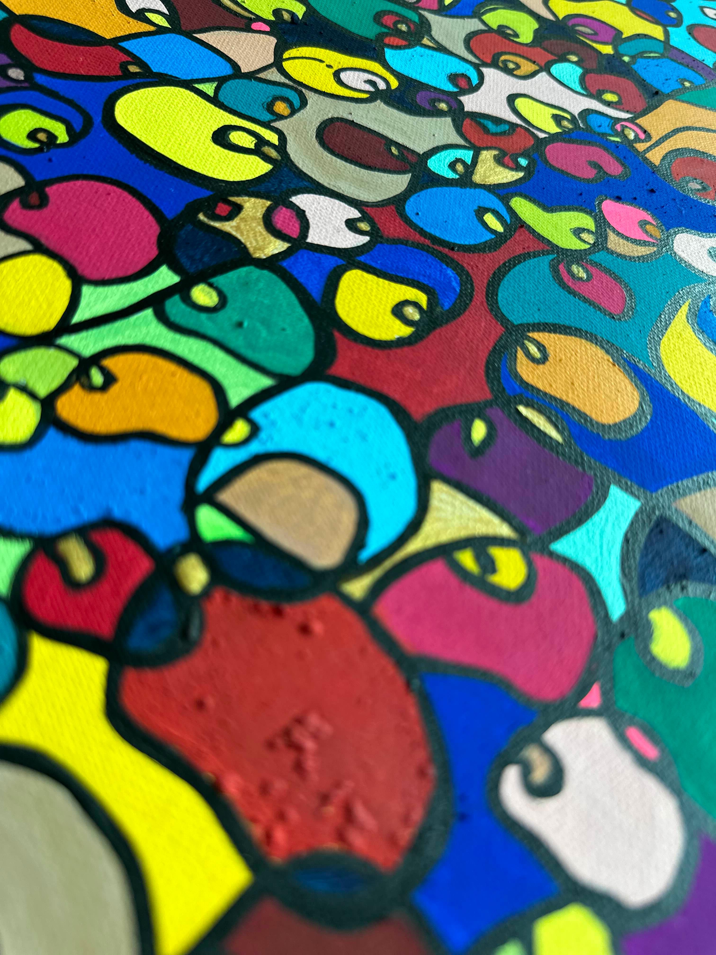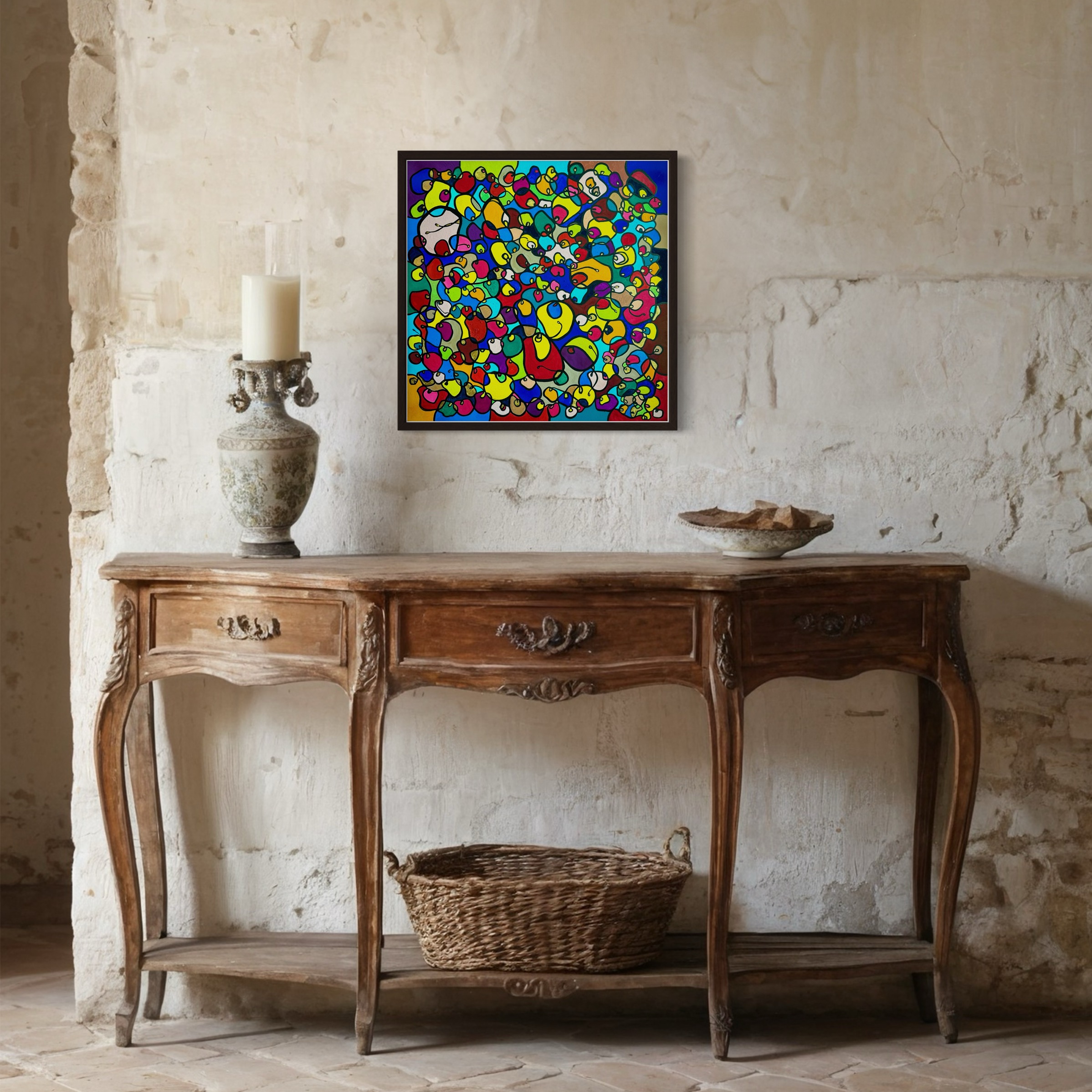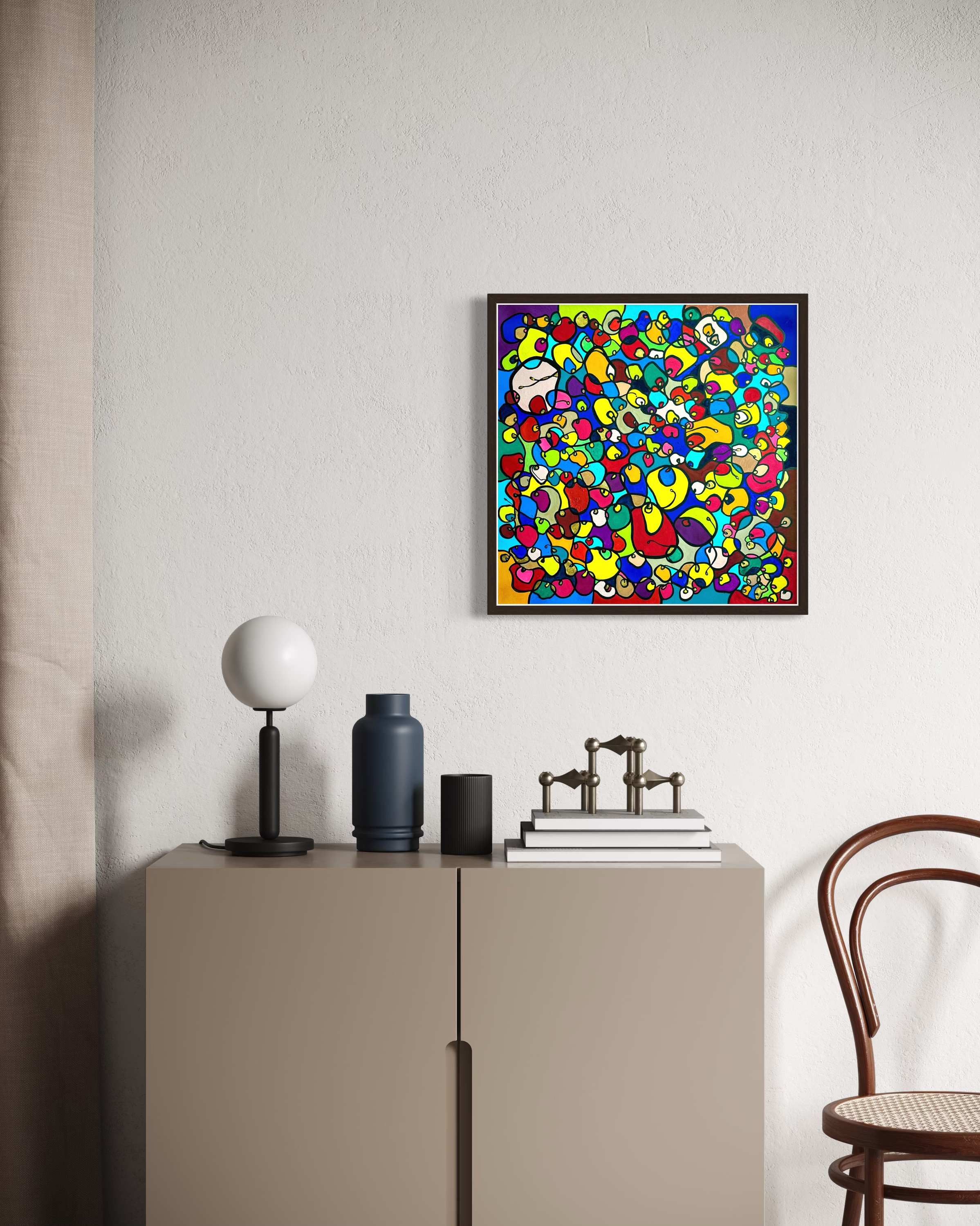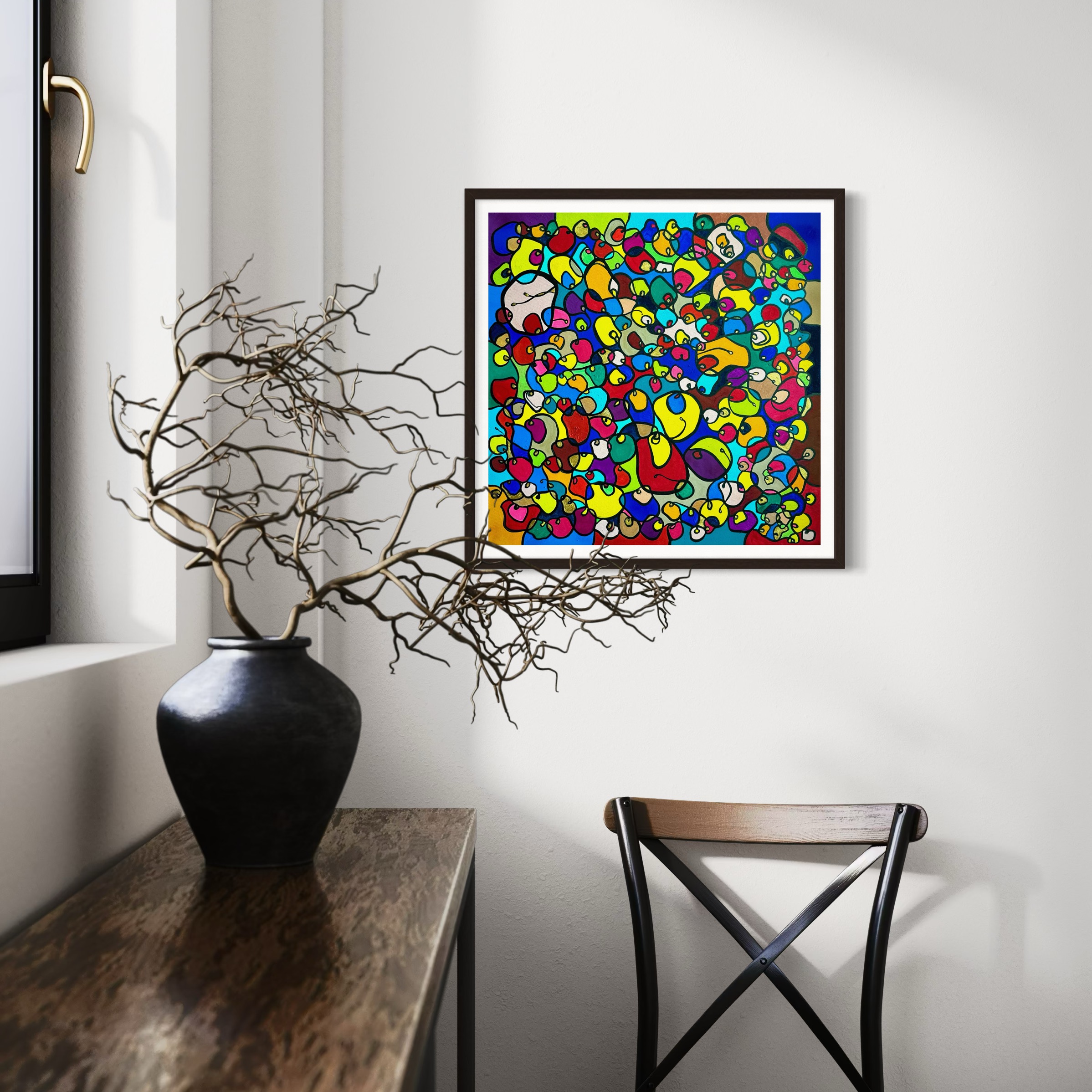In this vibrant creation, I've painted a joyful mélange of shapes and colors that dance across the canvas in rich, organic textures. Drawing inspiration from oriental art, each element swirls harmoniously into the next, representing unity and the beauty of diversity. This artwork is meant to uplift the spirit and infuse any space with a burst of life and energy, encouraging onlookers to see the world in the optimistic hues of possibility and wonder.