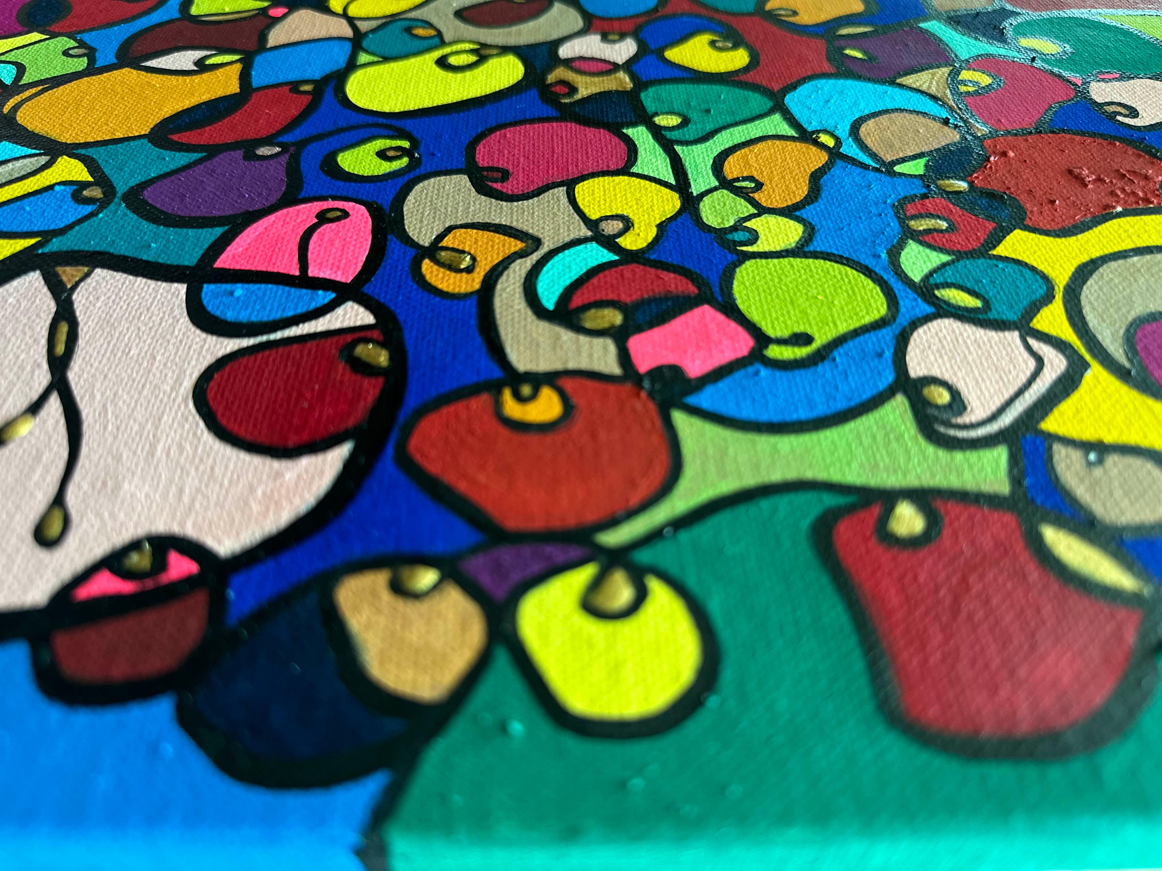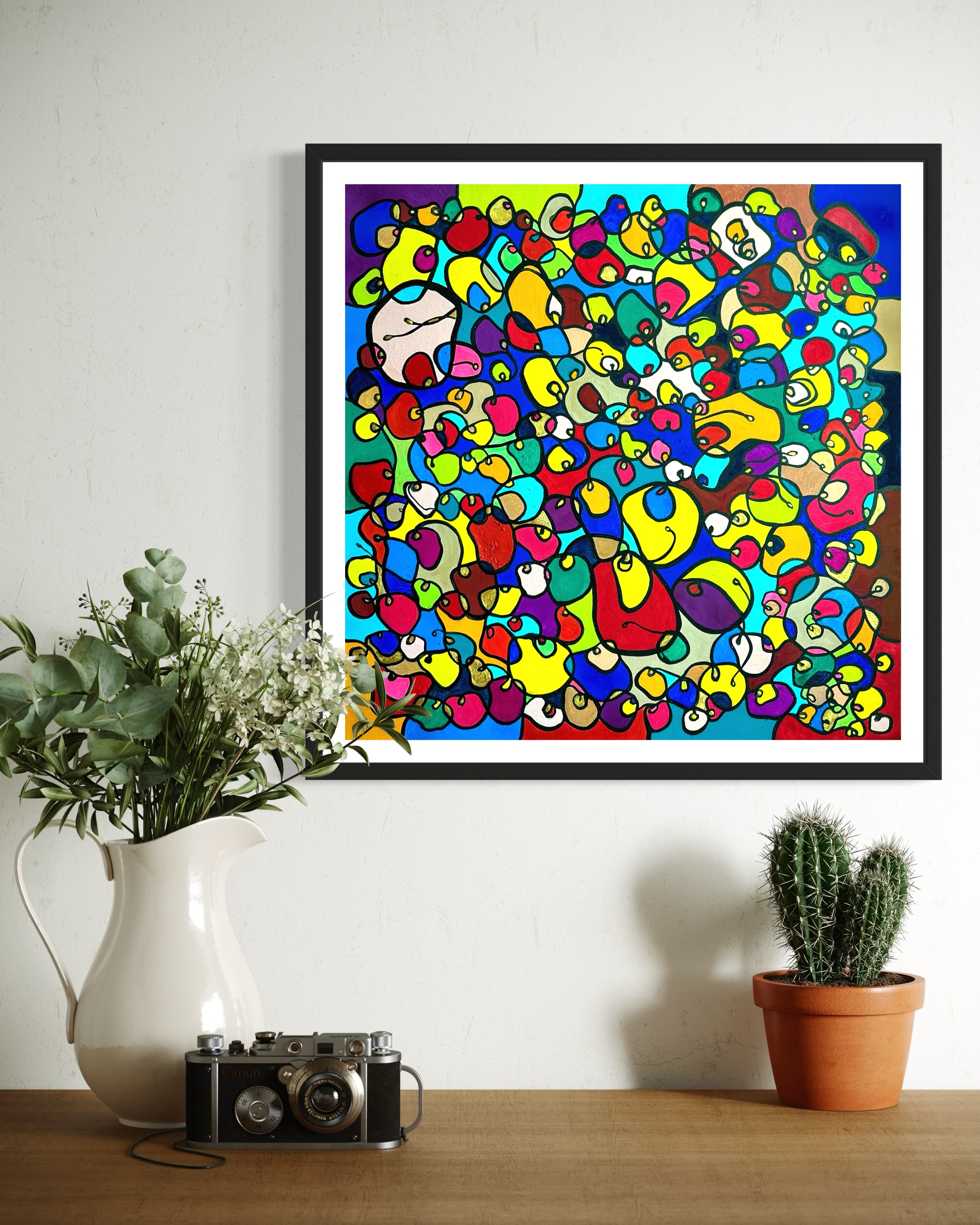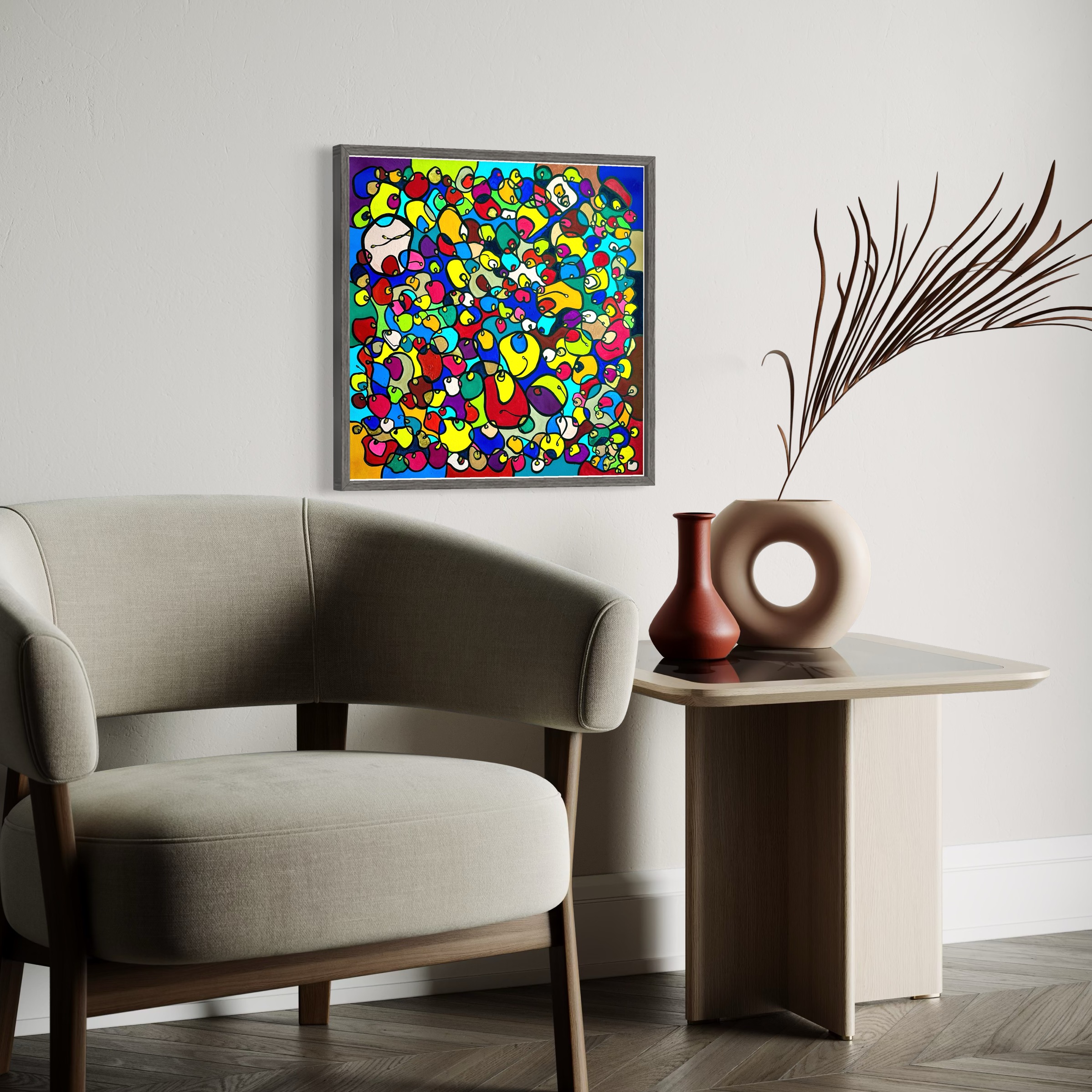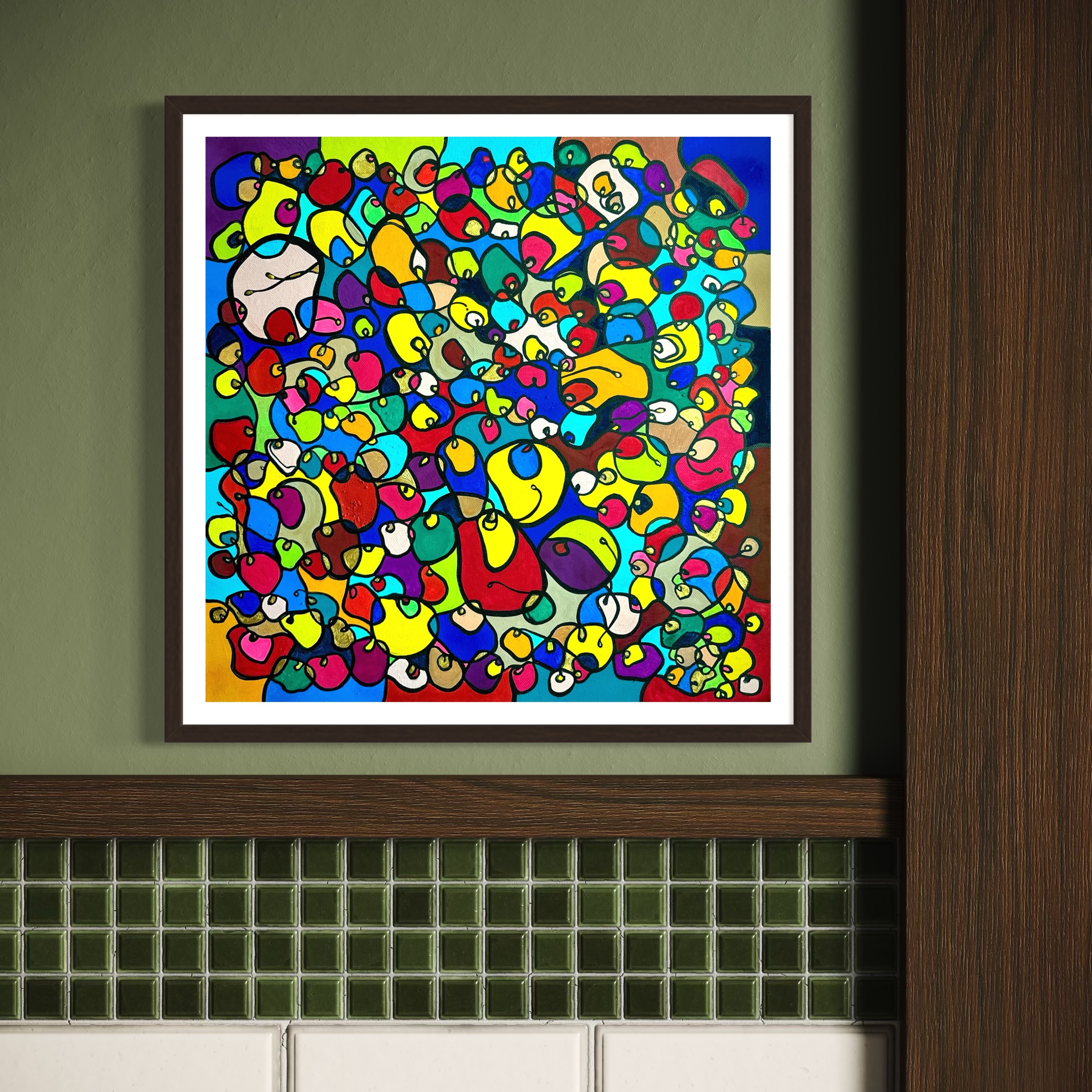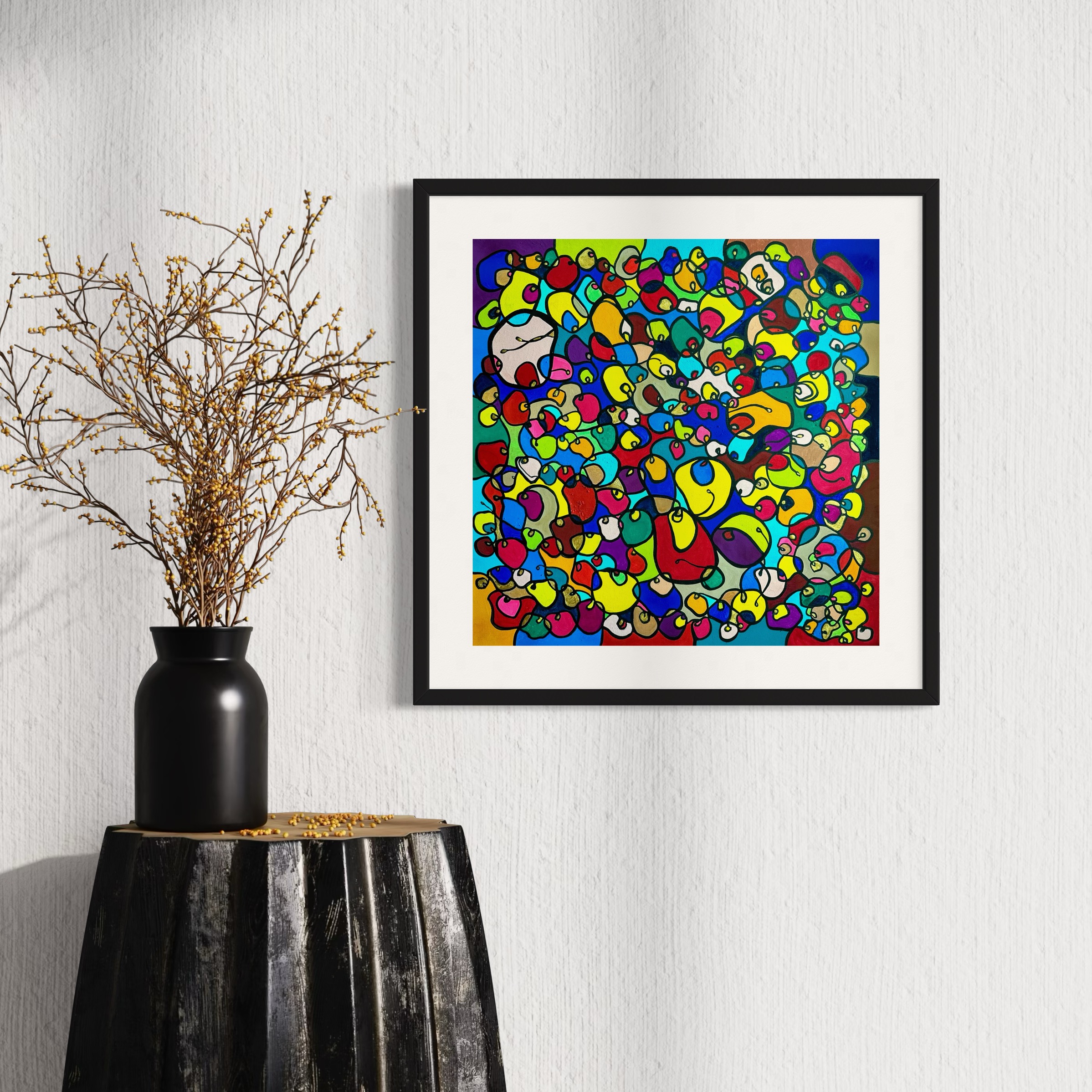 In this vibrant creation, I've painted a joyful mélange of shapes and colors that dance across the canvas in rich, organic textures. Drawing inspiration from oriental art, each element swirls harmoniously into the next, representing unity and the beauty of diversity. This artwork is meant to uplift the spirit and infuse any space with a burst of life and energy, encouraging onlookers to see the world in the optimistic hues of possibility and wonder.