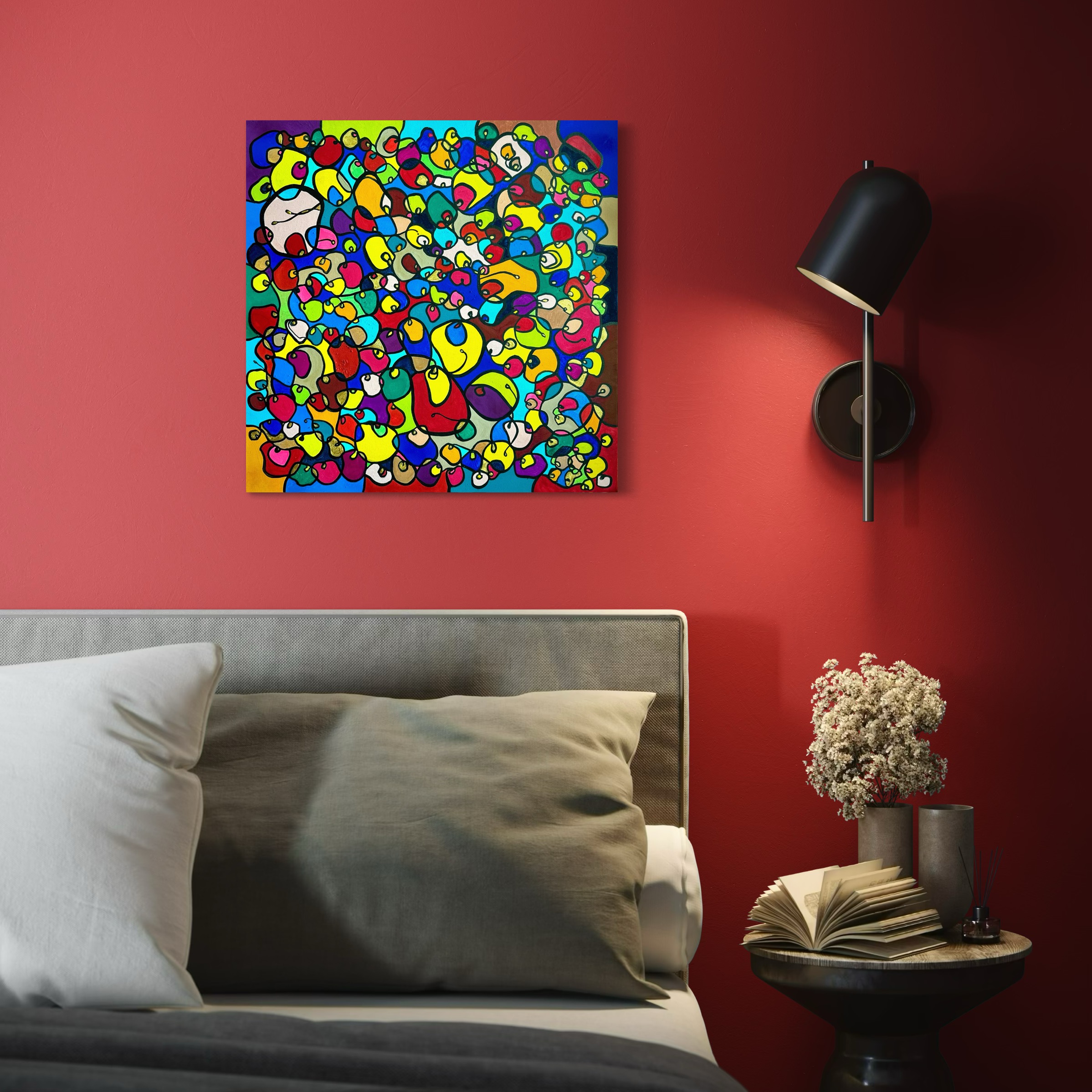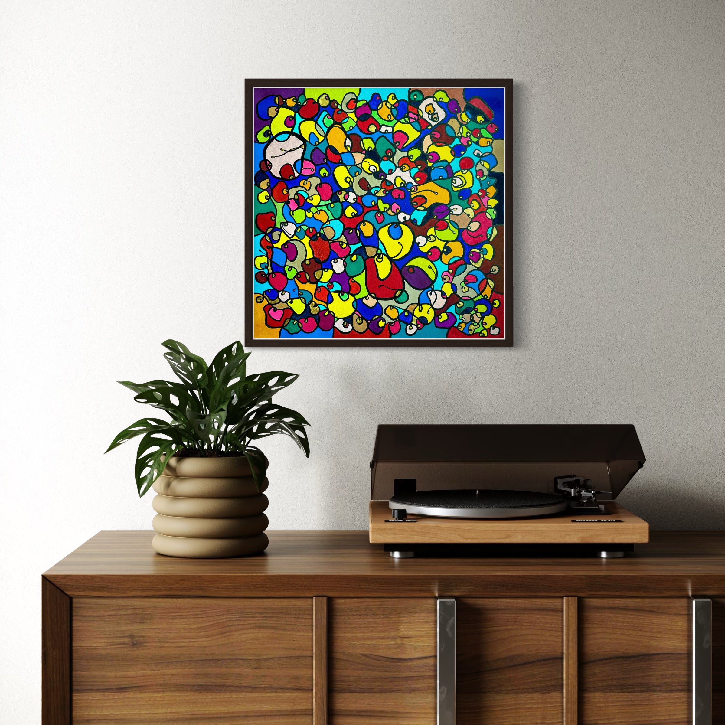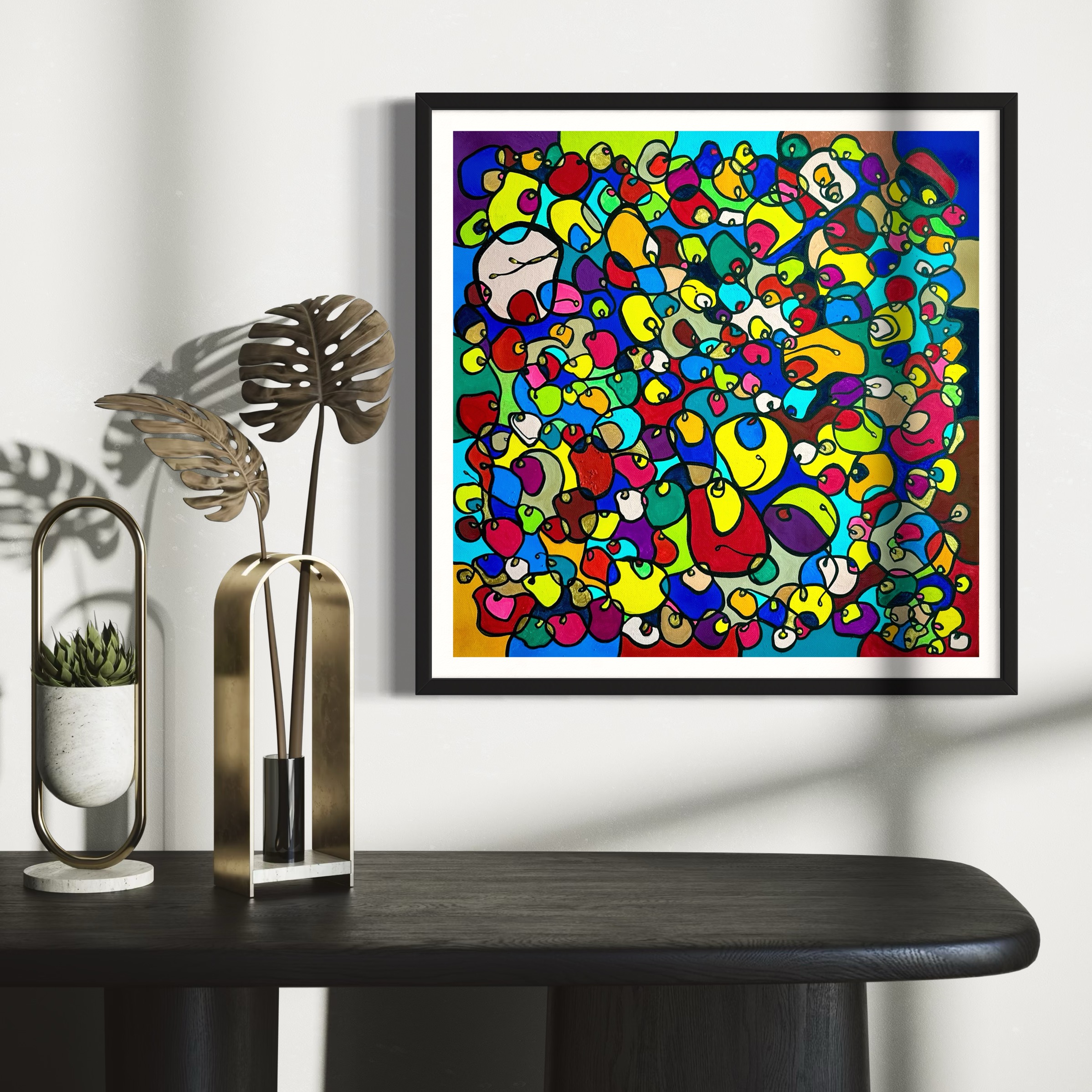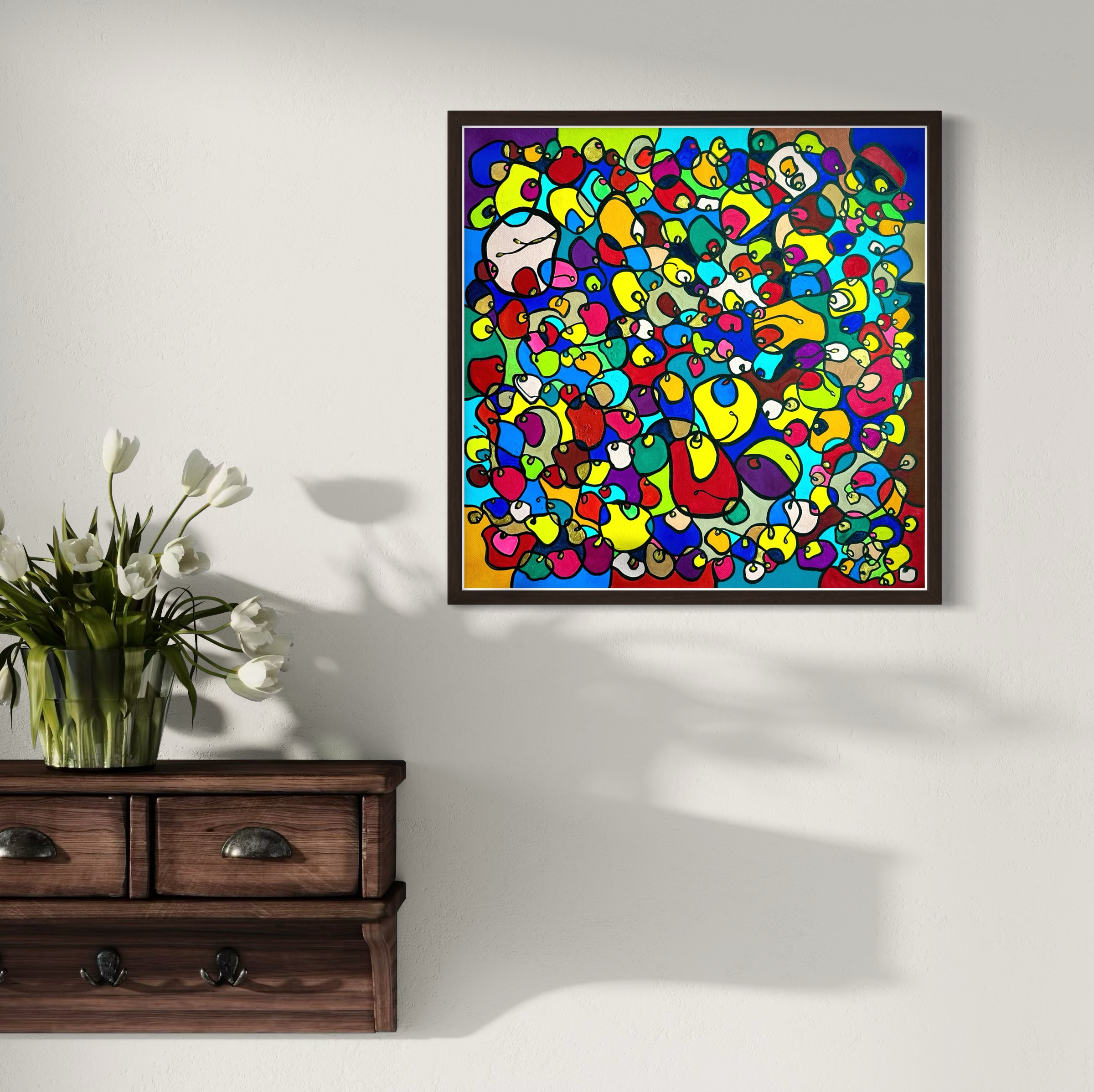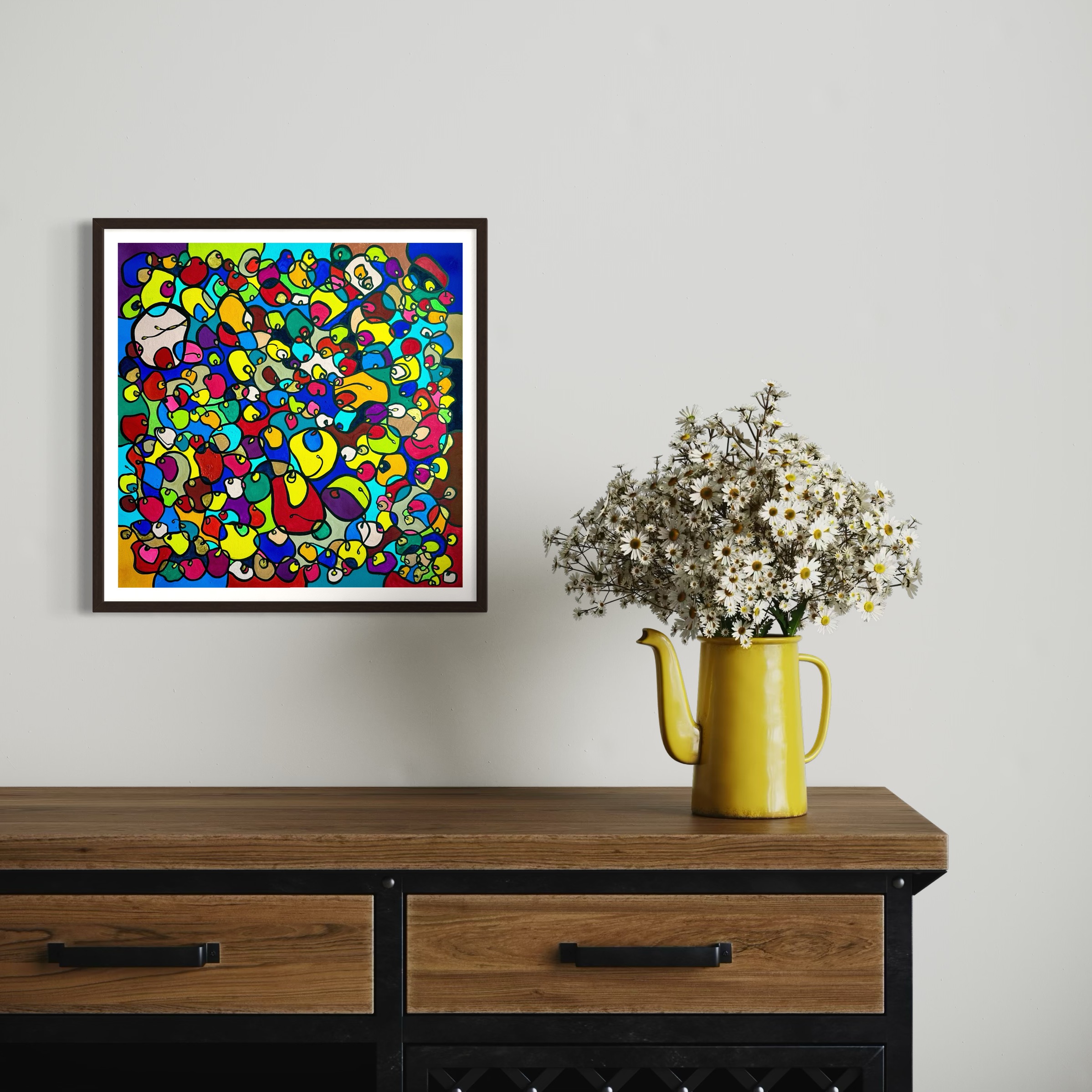 In this vibrant creation, I've painted a joyful mélange of shapes and colors that dance across the canvas in rich, organic textures. Drawing inspiration from oriental art, each element swirls harmoniously into the next, representing unity and the beauty of diversity. This artwork is meant to uplift the spirit and infuse any space with a burst of life and energy, encouraging onlookers to see the world in the optimistic hues of possibility and wonder.