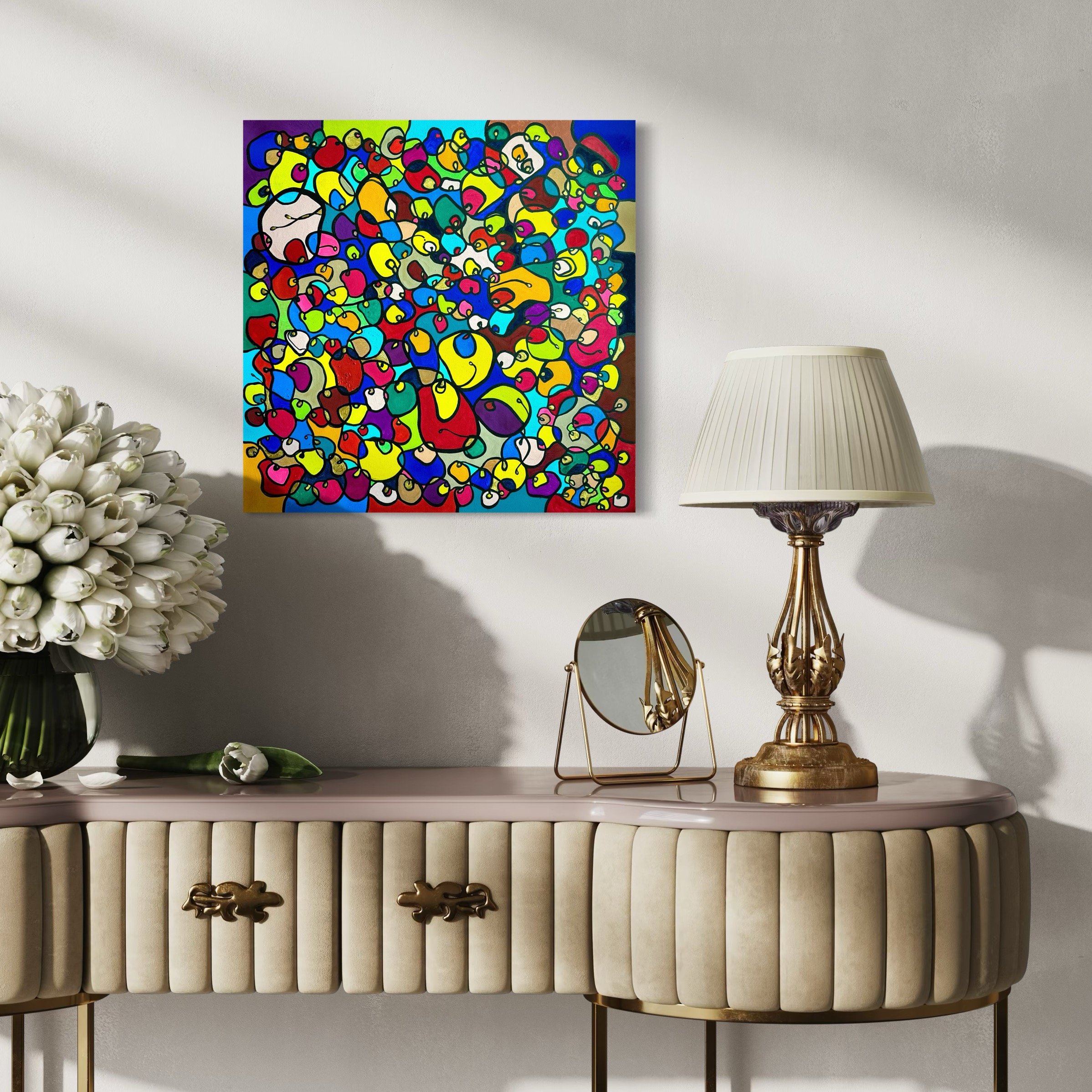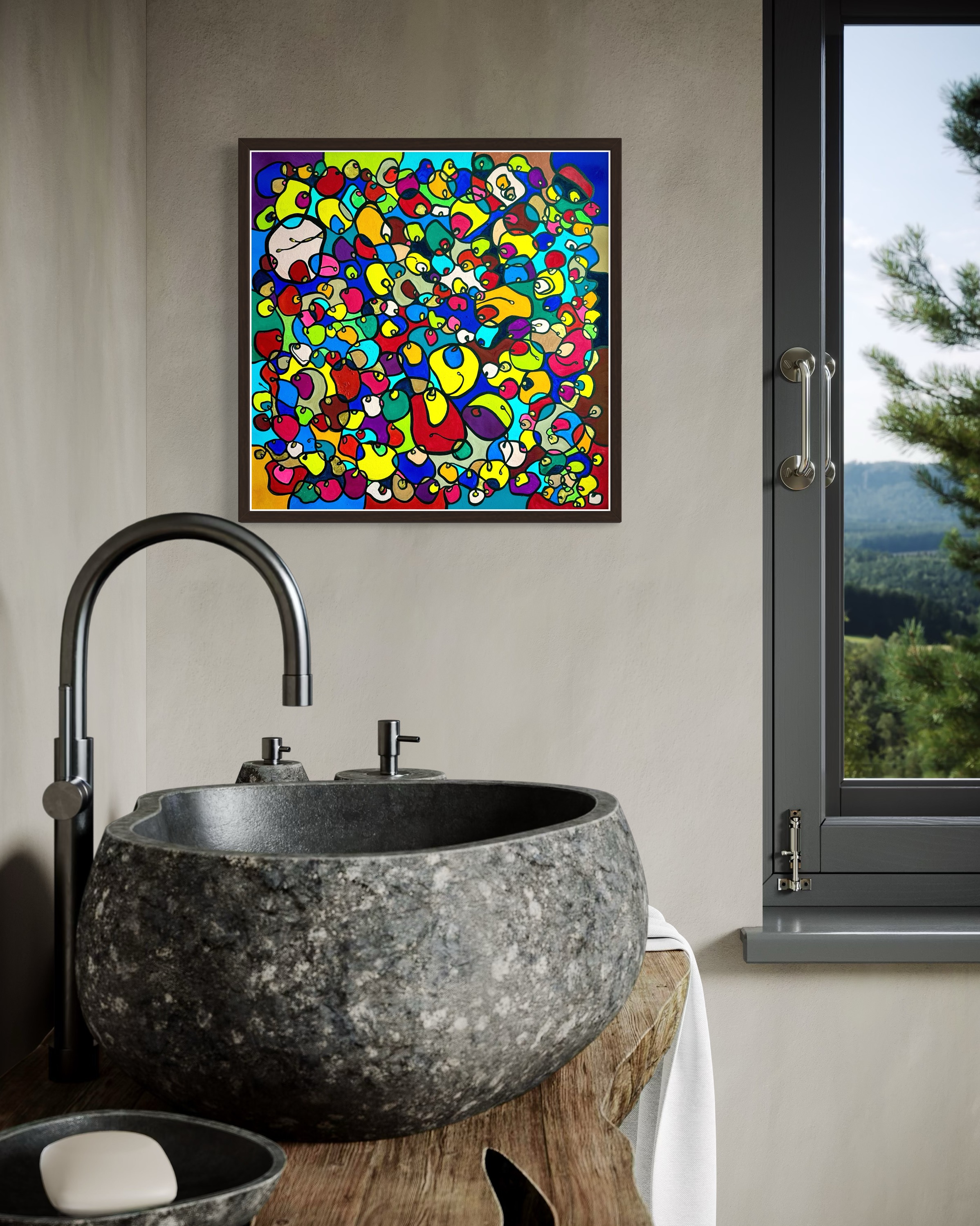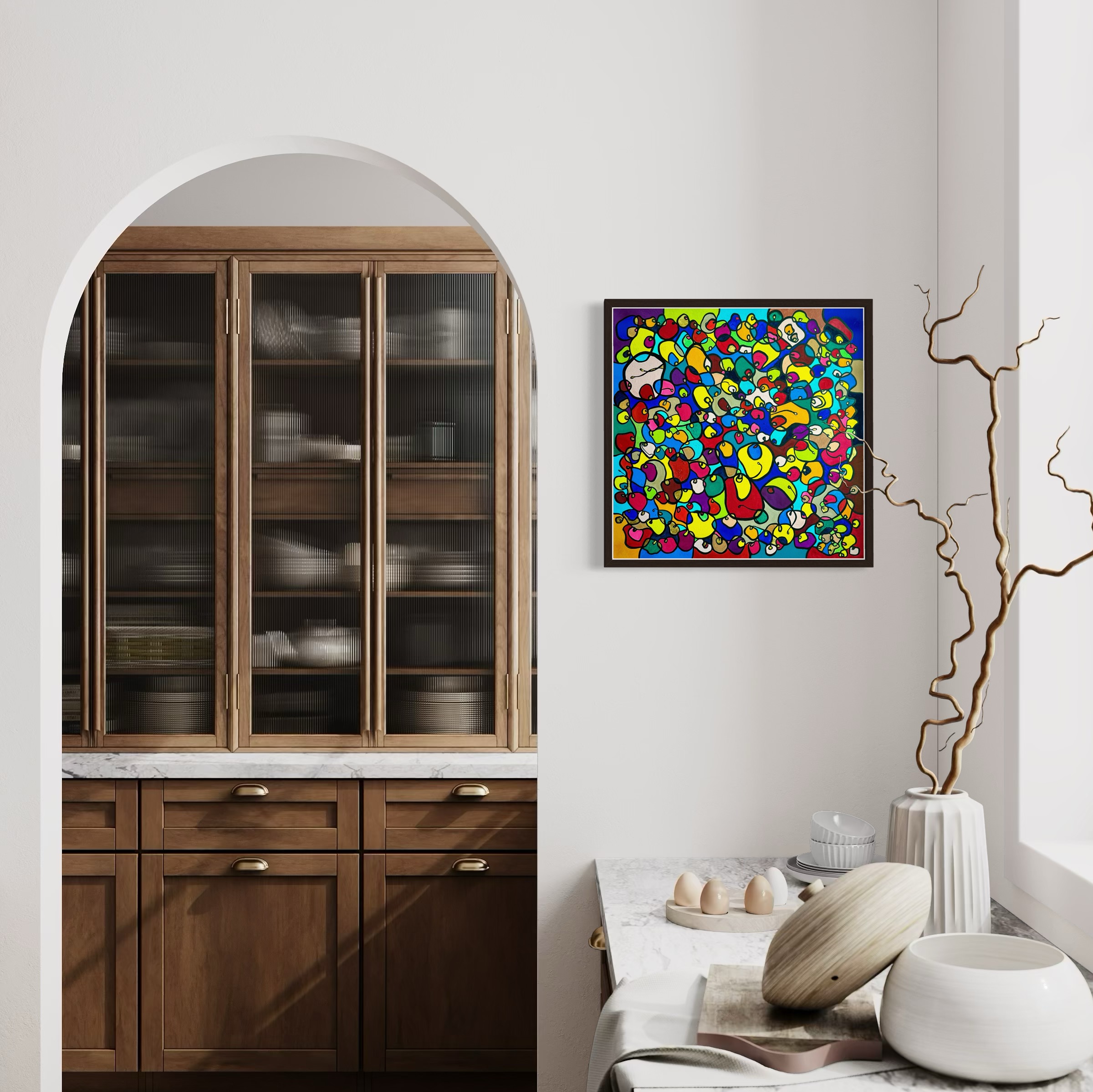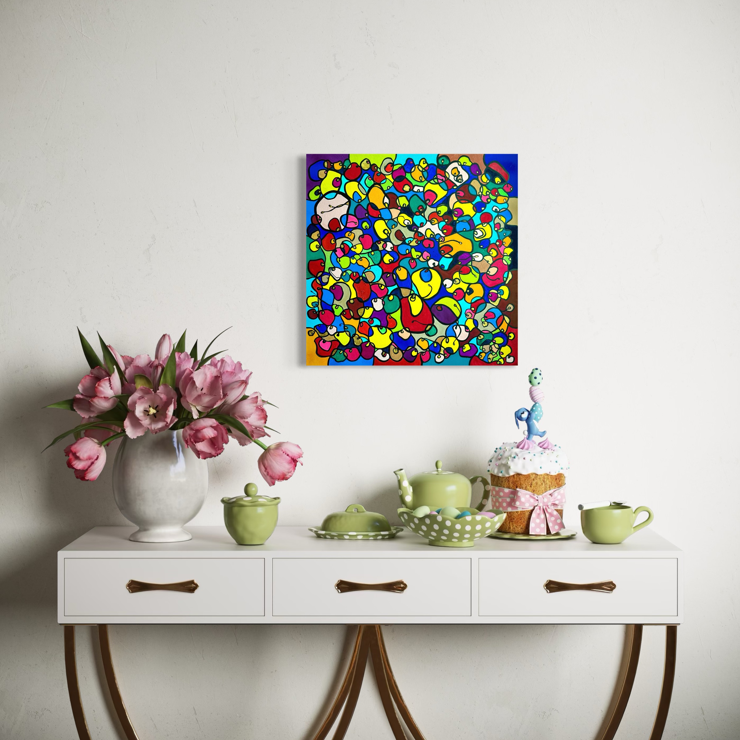 In this vibrant creation, I've painted a joyful mélange of shapes and colors that dance across the canvas in rich, organic textures. Drawing inspiration from oriental art, each element swirls harmoniously into the next, representing unity and the beauty of diversity. This artwork is meant to uplift the spirit and infuse any space with a burst of life and energy, encouraging onlookers to see the world in the optimistic hues of possibility and wonder.