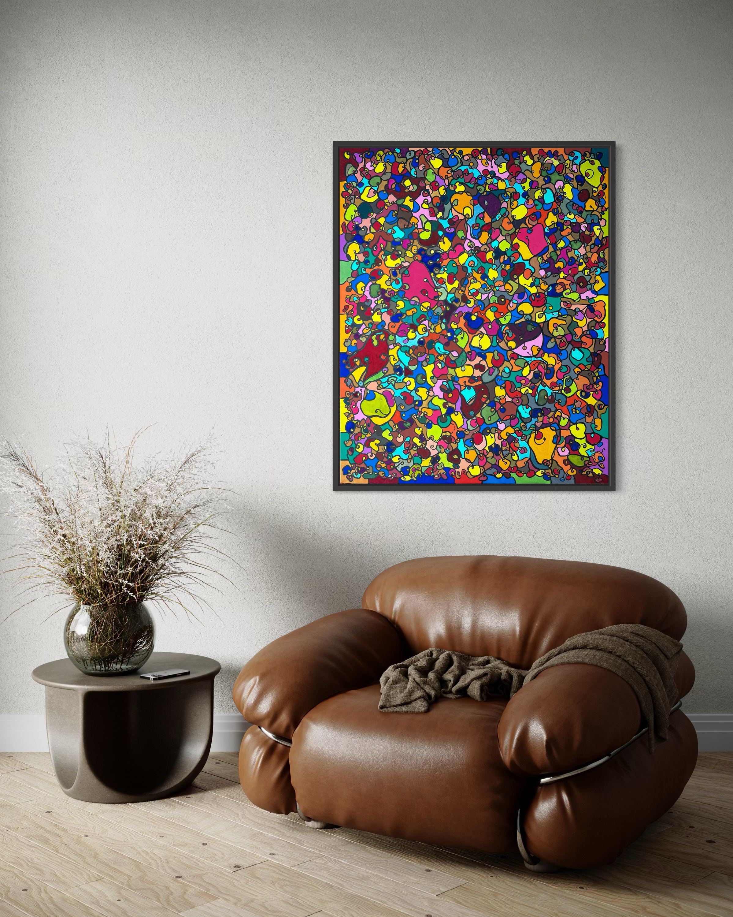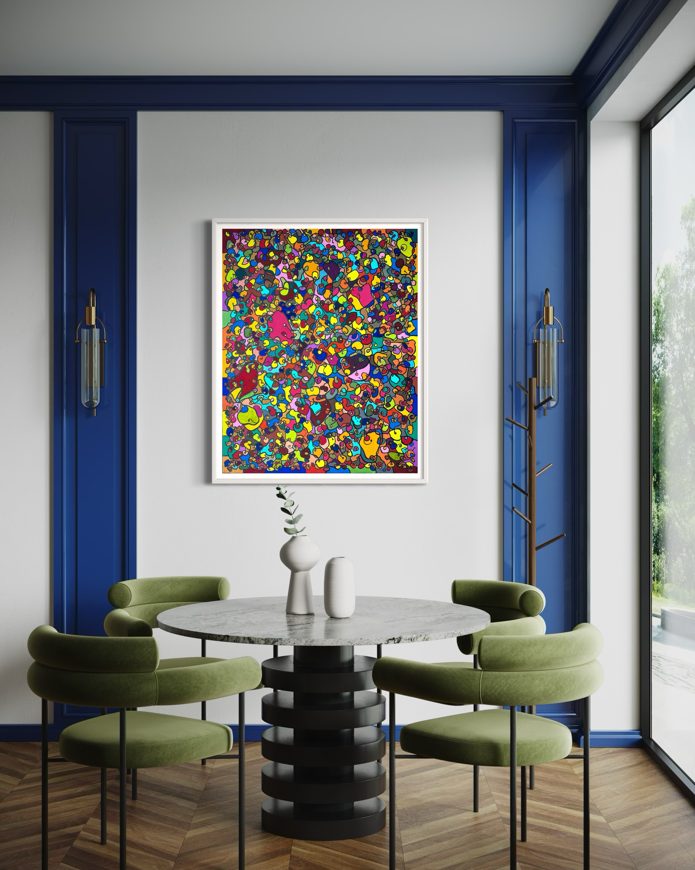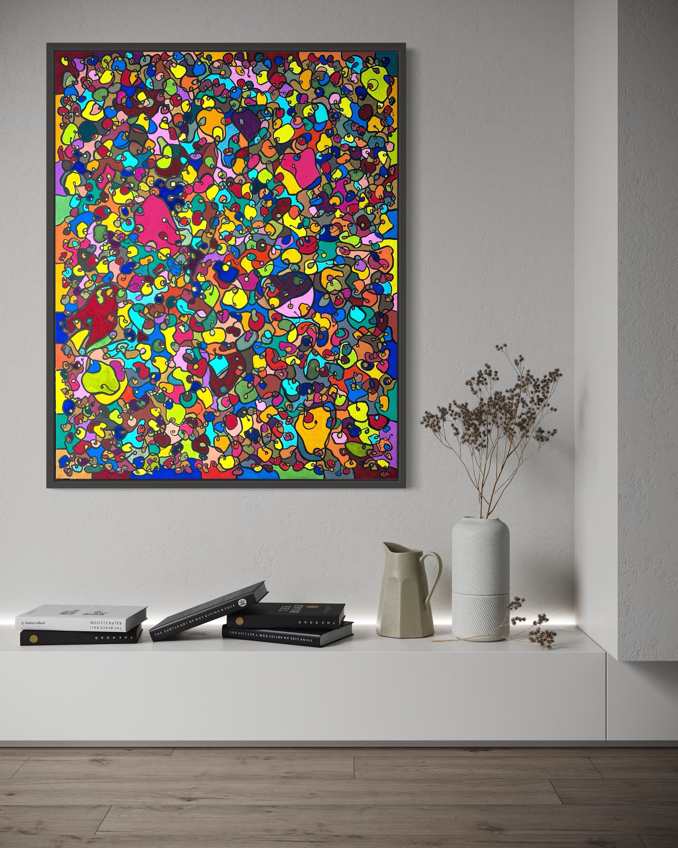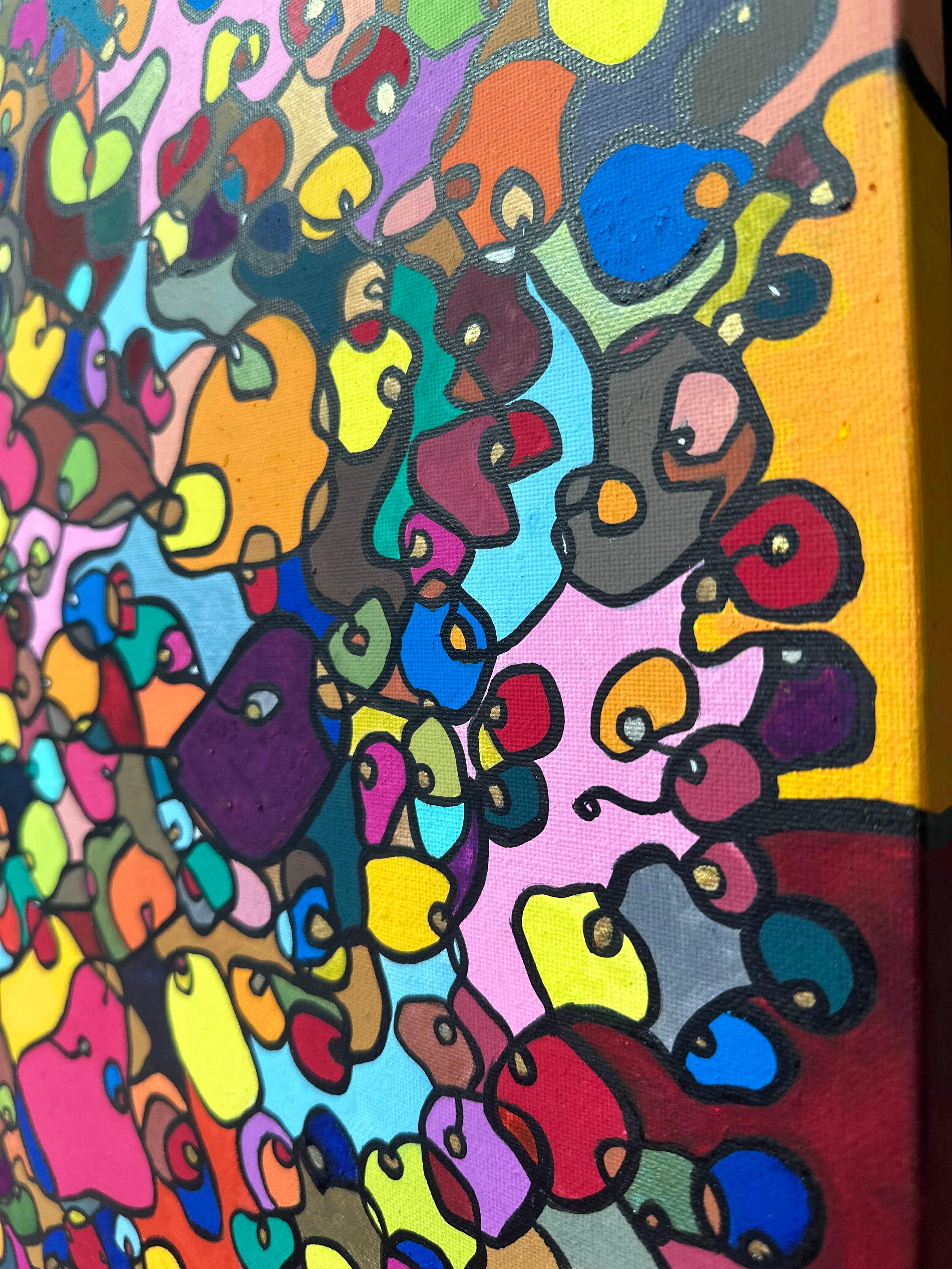 In creating this piece, I've poured vibrant emotions into an organic tapestry, embracing oriental art influences. My intent was to celebrate diversity through a mosaic of colors and shapes, each element distinct yet harmonious. This artwork embodies unity and connectivity, infusing any space with a dynamic, uplifting spirit. It's a visual feast that invites viewers to appreciate the beauty in variety and the strength in inclusiveness.