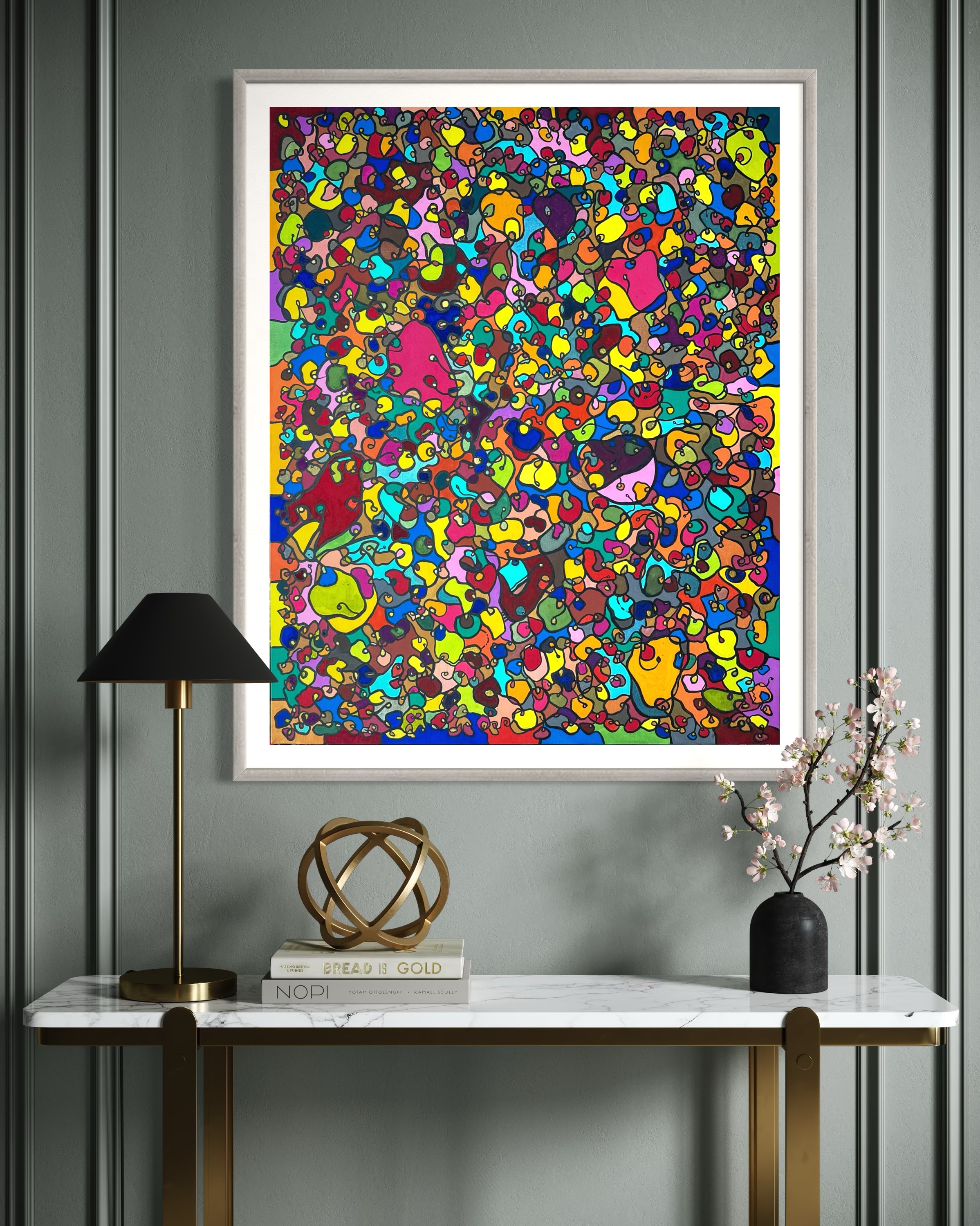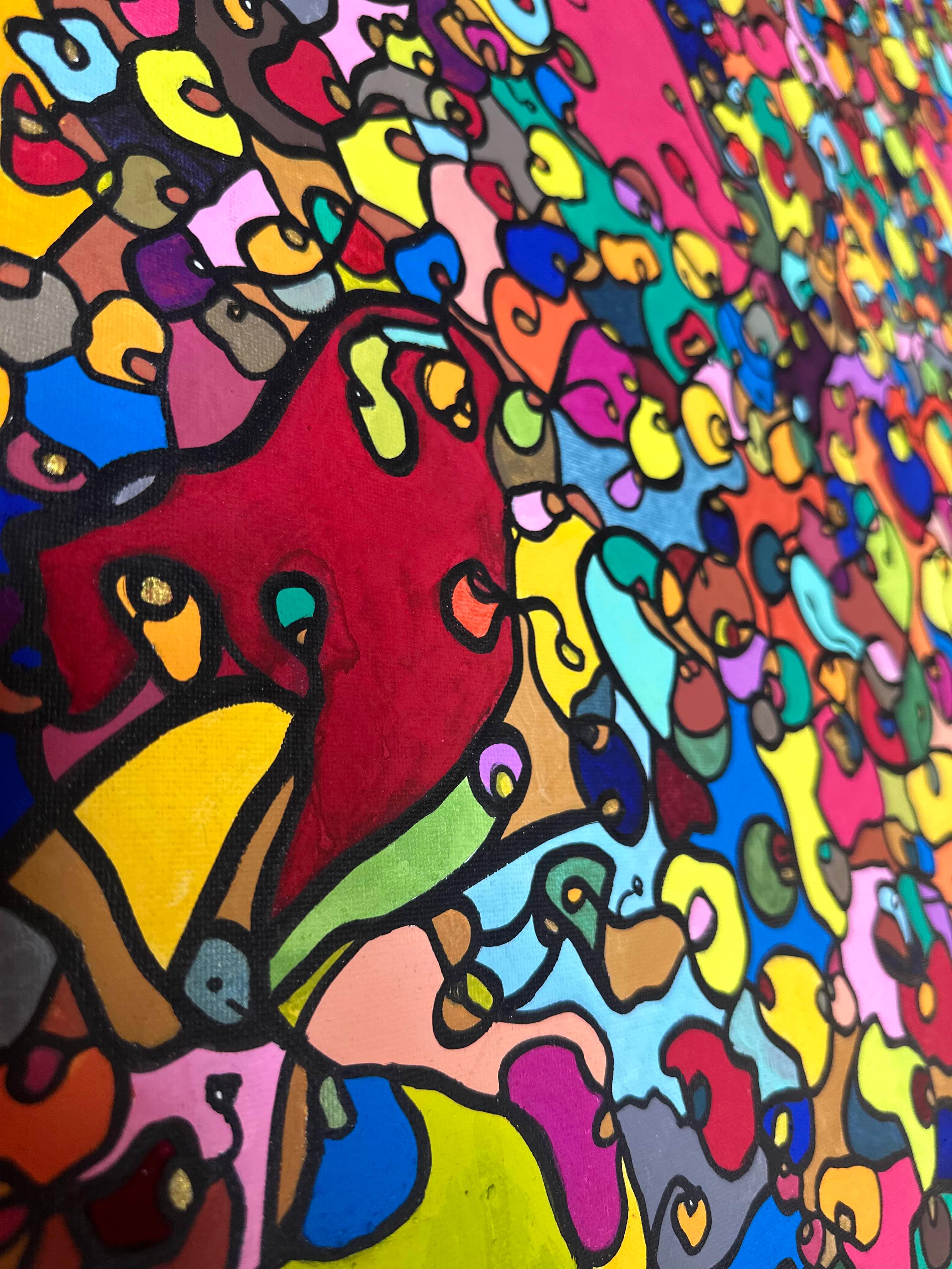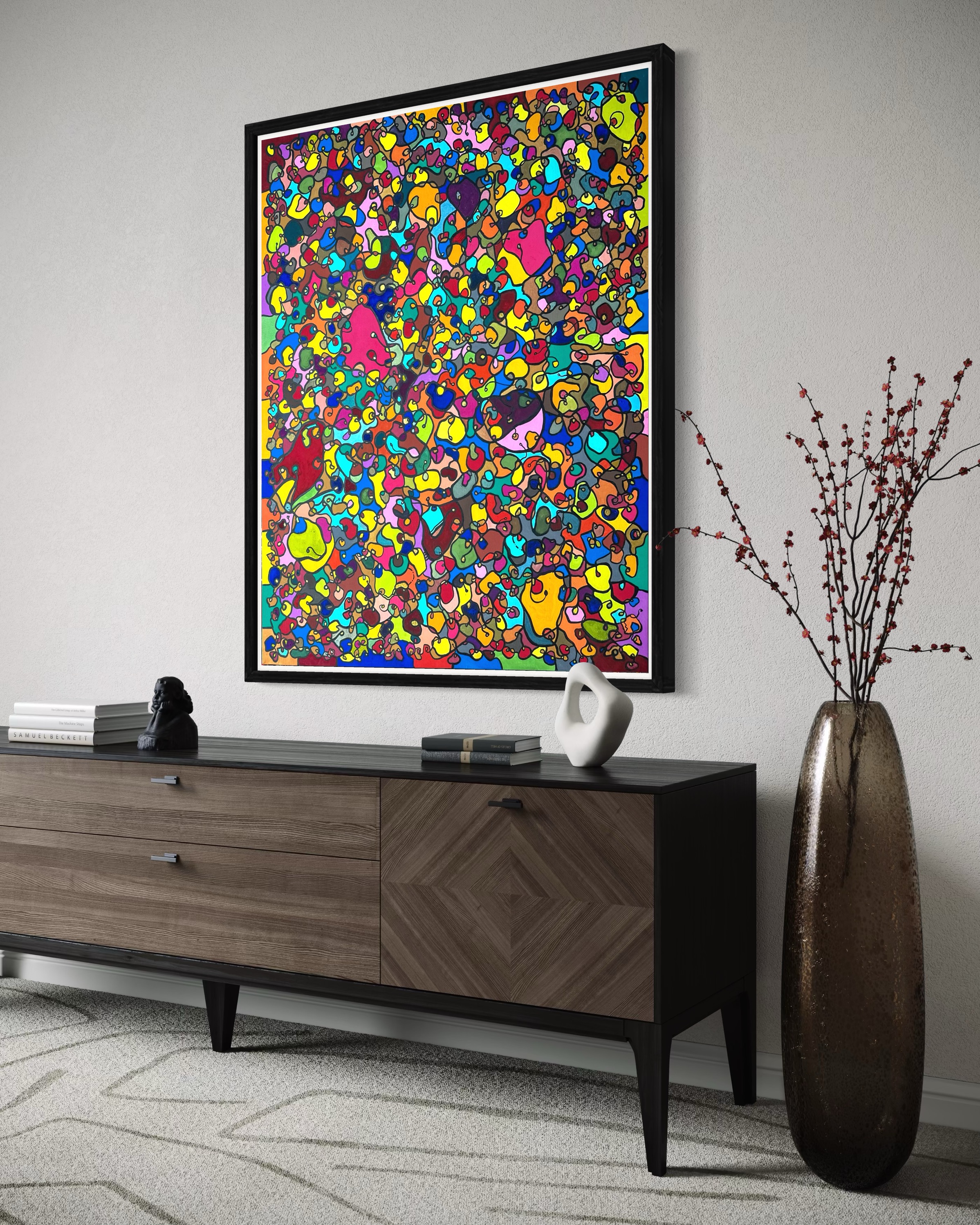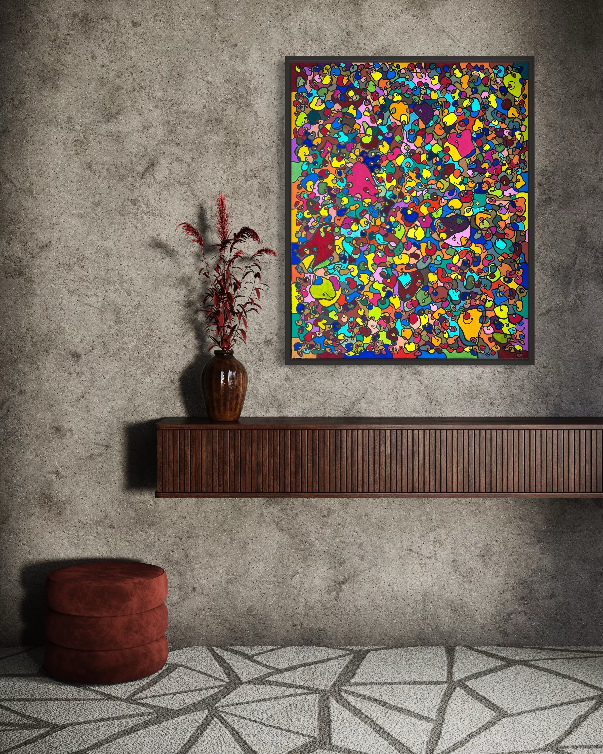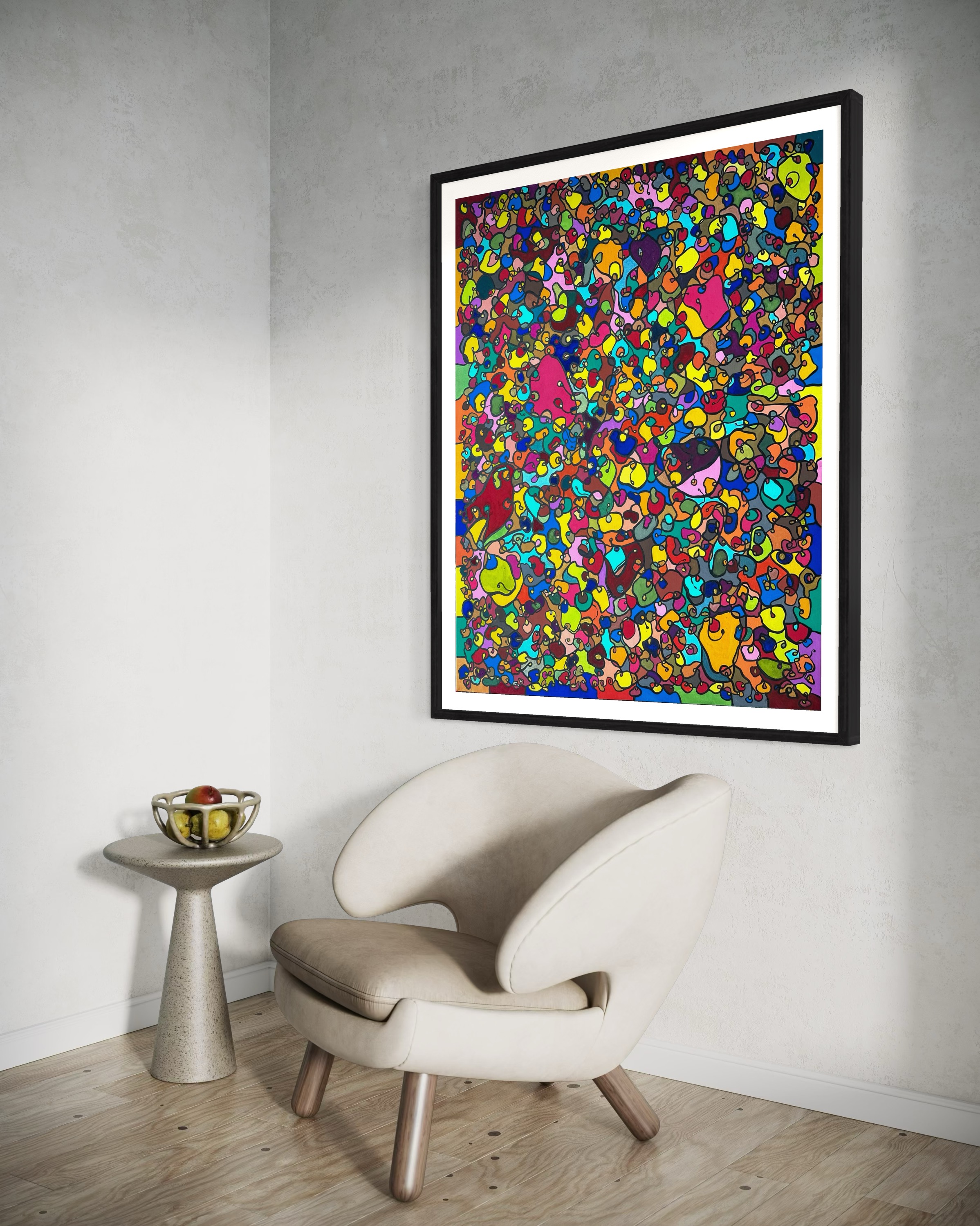 In creating this piece, I've poured vibrant emotions into an organic tapestry, embracing oriental art influences. My intent was to celebrate diversity through a mosaic of colors and shapes, each element distinct yet harmonious. This artwork embodies unity and connectivity, infusing any space with a dynamic, uplifting spirit. It's a visual feast that invites viewers to appreciate the beauty in variety and the strength in inclusiveness.