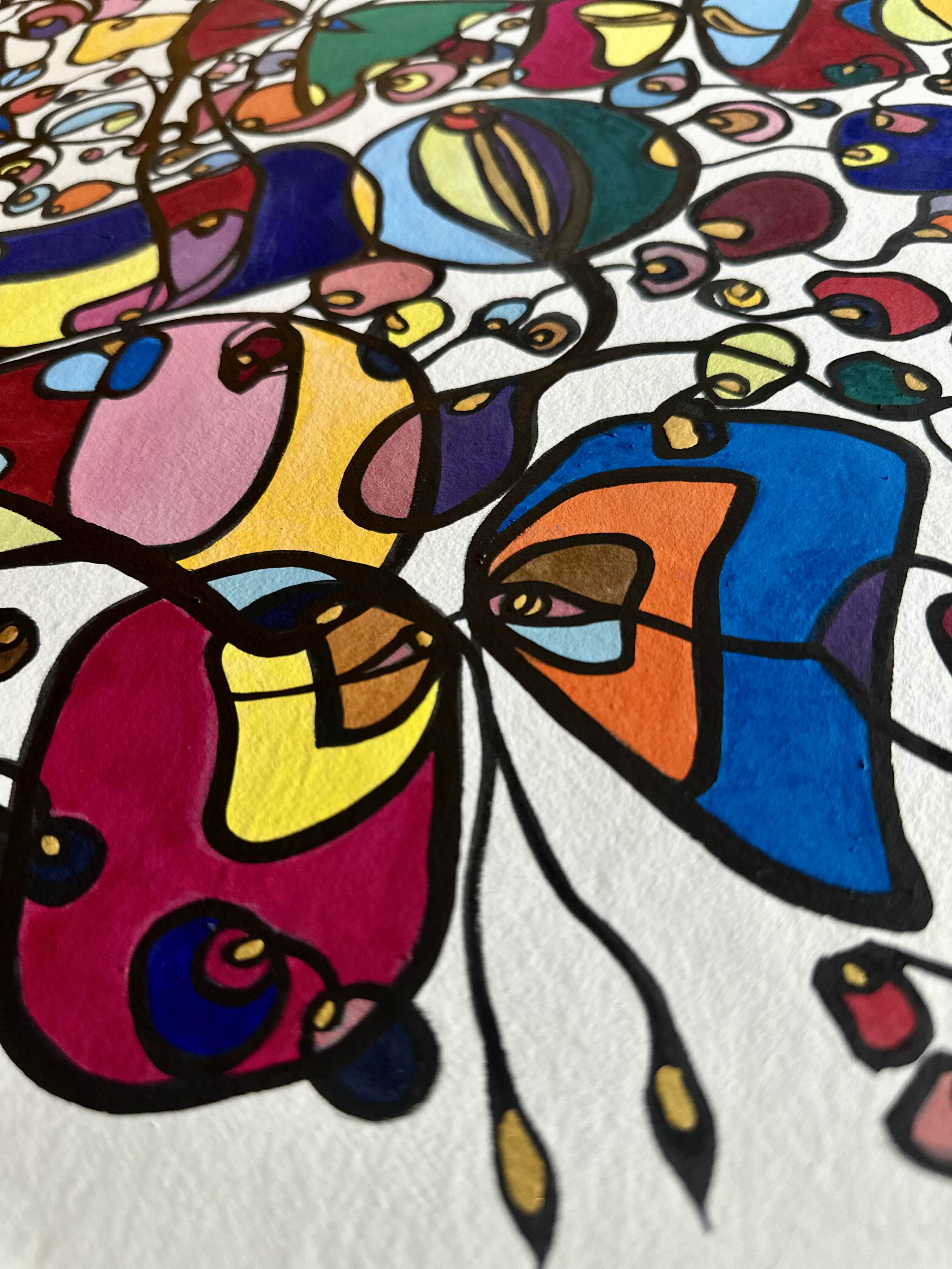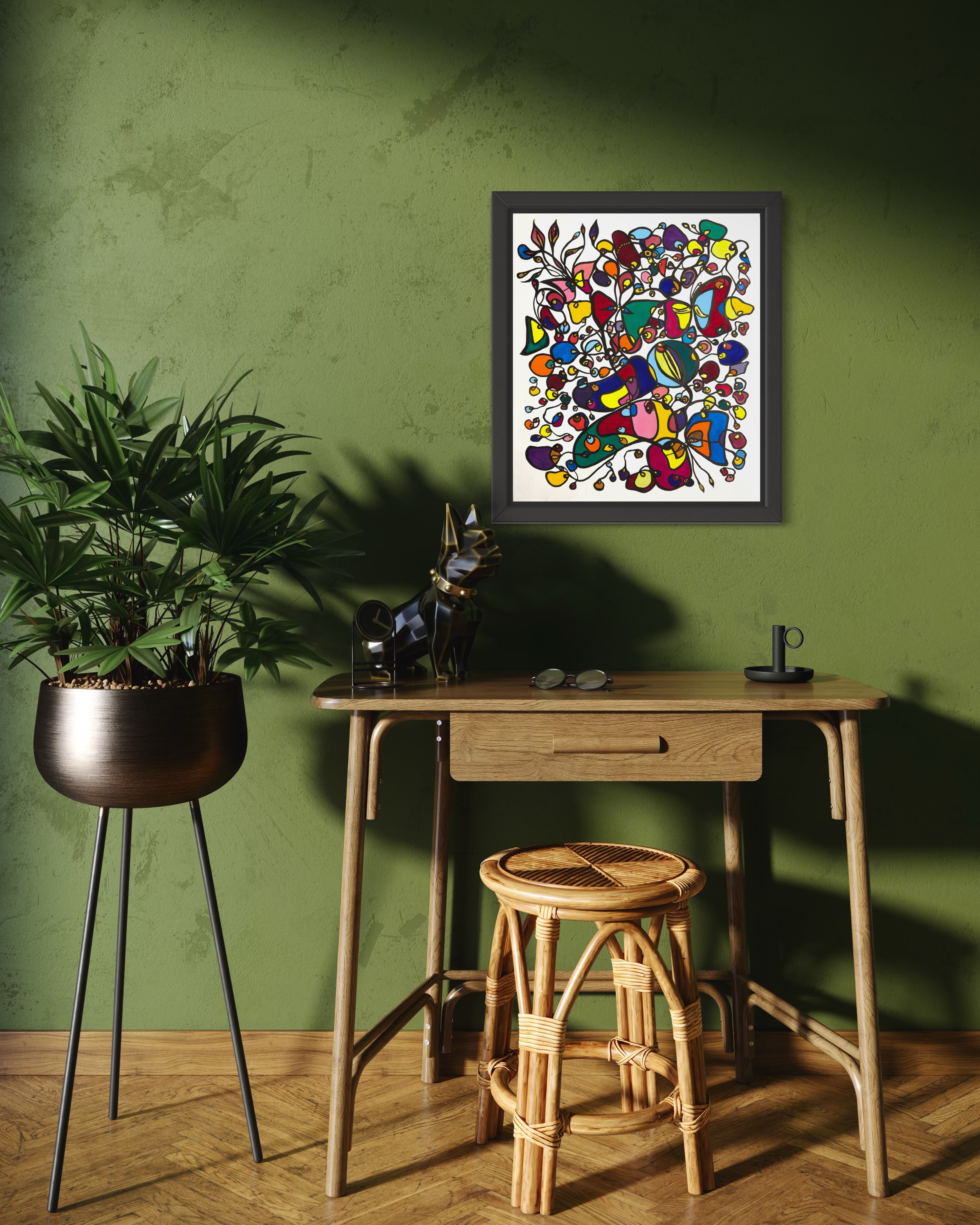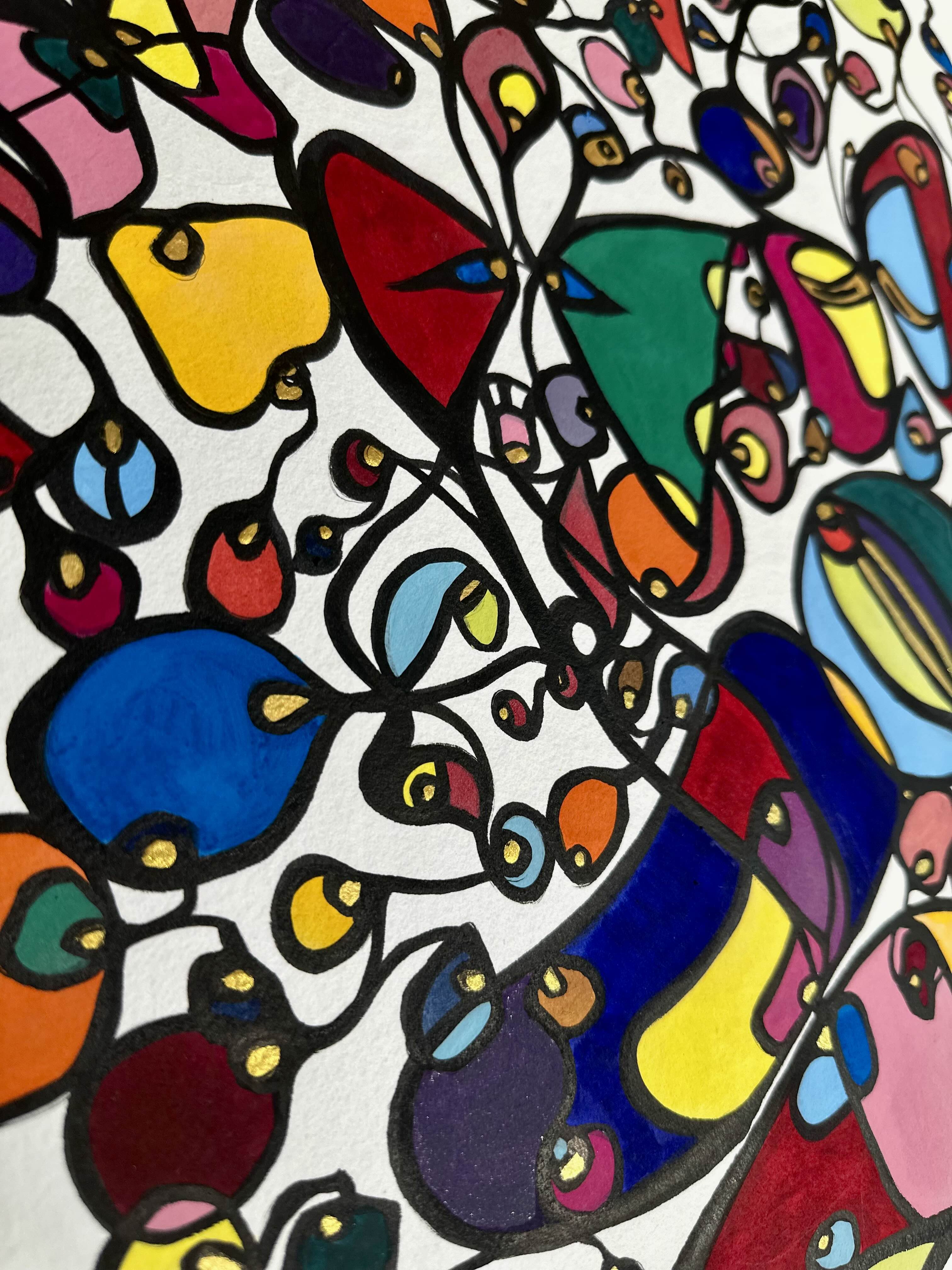The colors ride these lines like melodies, bold yet graceful, vibrant yet never violent. Primary and secondary hues dance together, occupying their space while coexisting in visual harmony. This is a utopia of cohabiting differences, a visual metaphor for empathy and diversity.