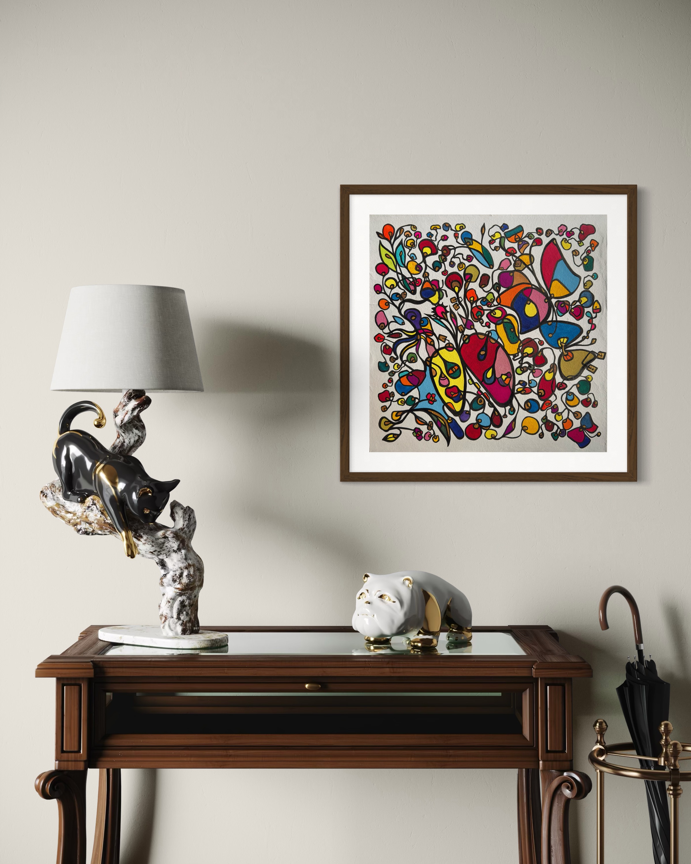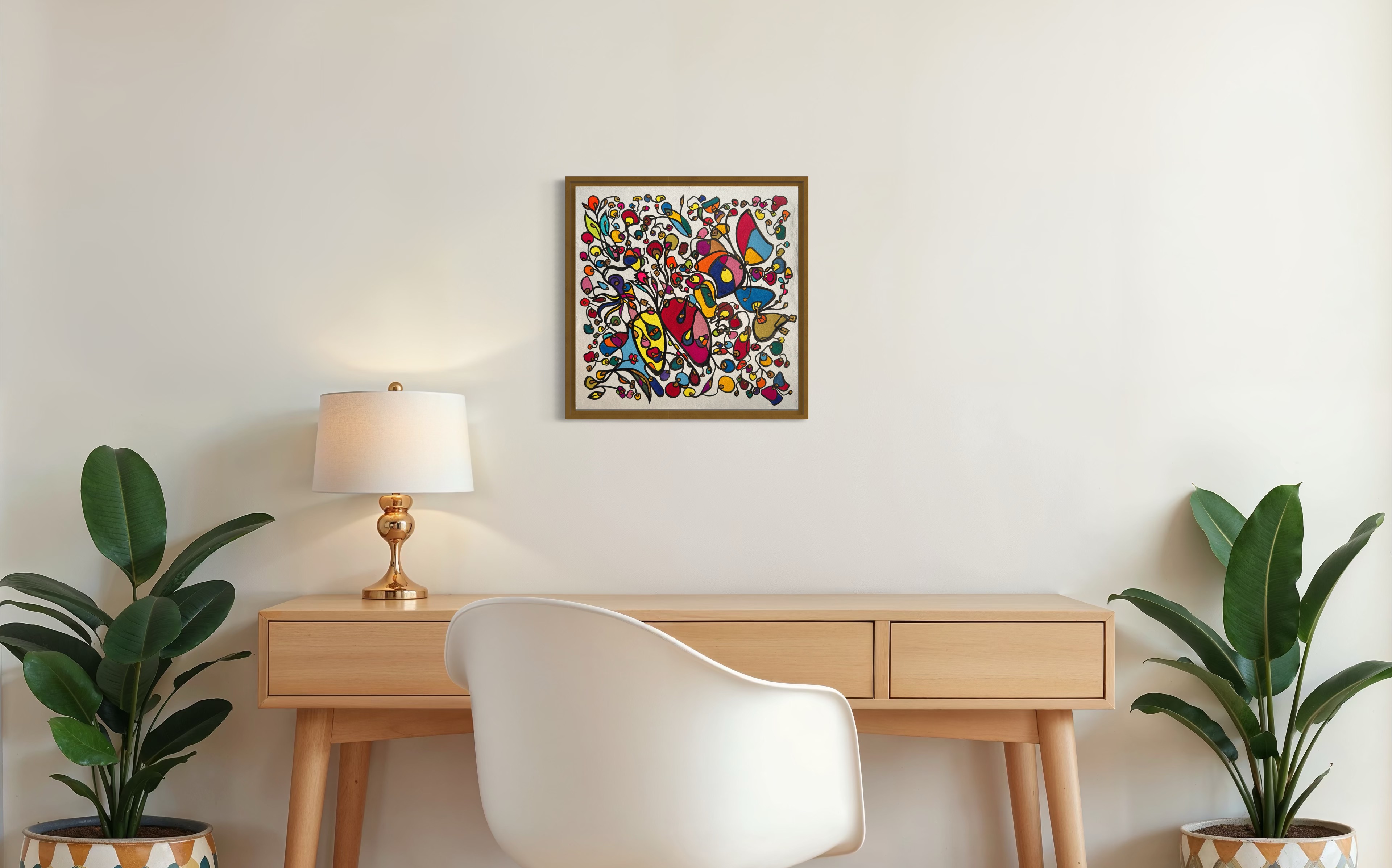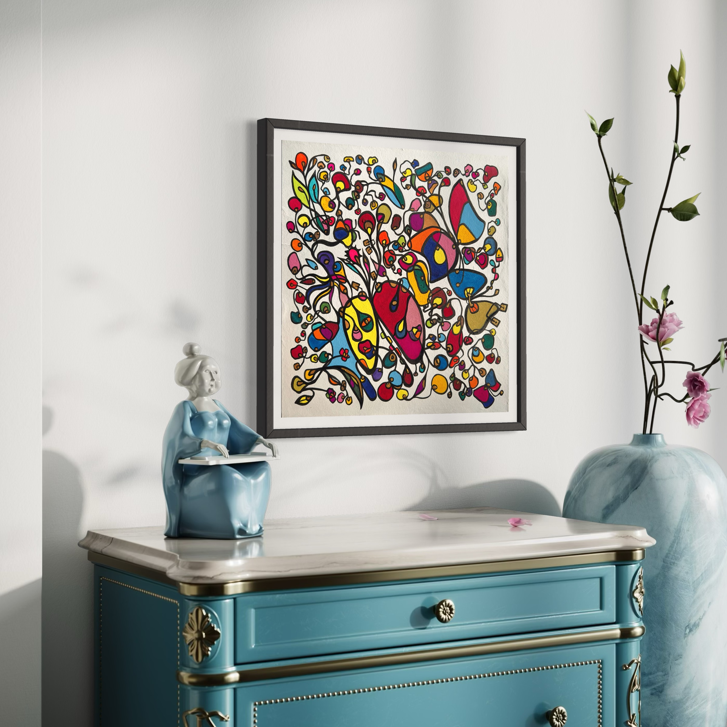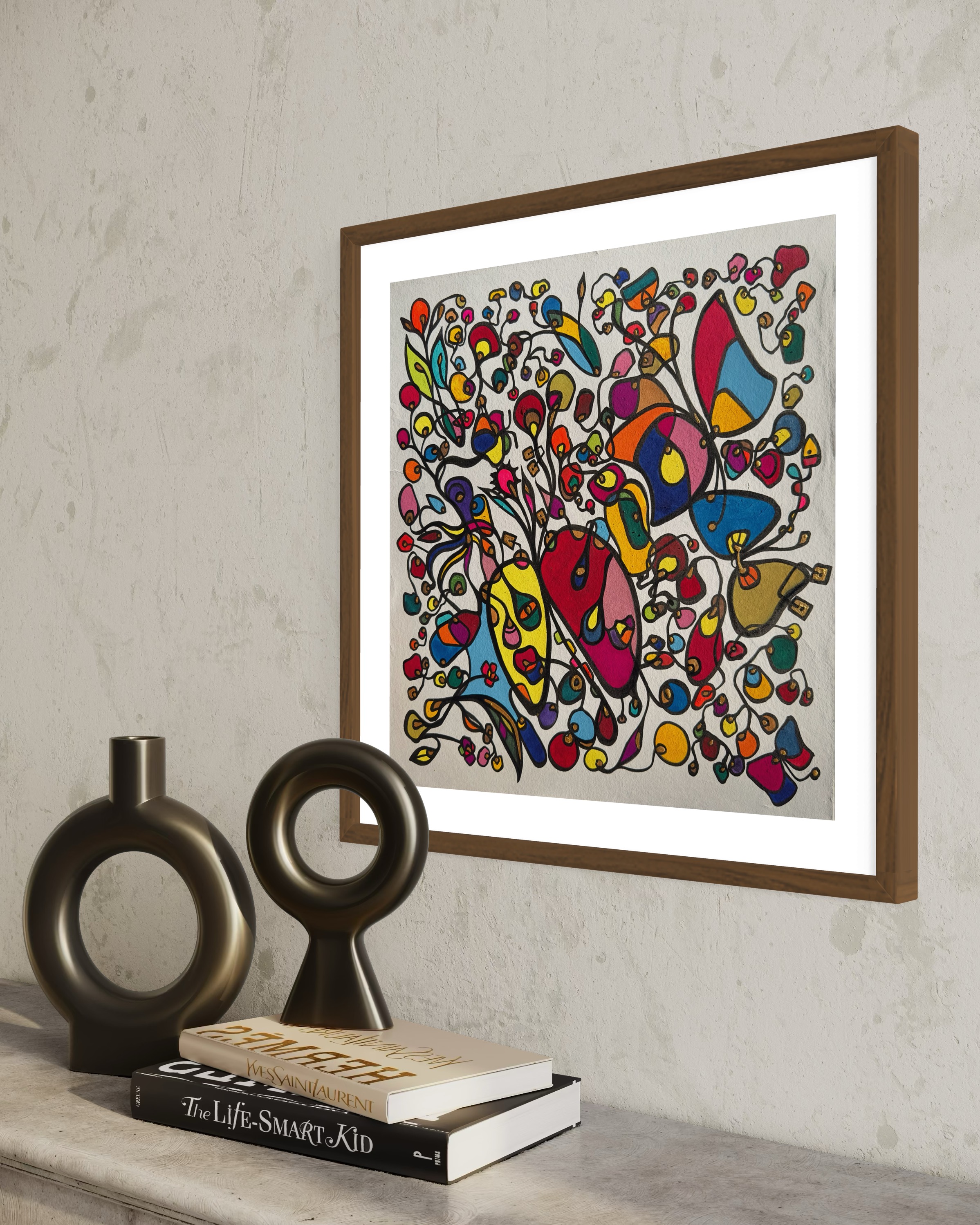 This piece bursts with vibrant energy and whimsical emotion, flowing through every organic curve and bold color. I wanted to capture the dance of life's chaotic beauty, blending expressionism with vintage symbolism to evoke joy and introspection. Its lively movement invites your space to pulse with creativity and warmth, turning any room into a sanctuary of inspired wonder.