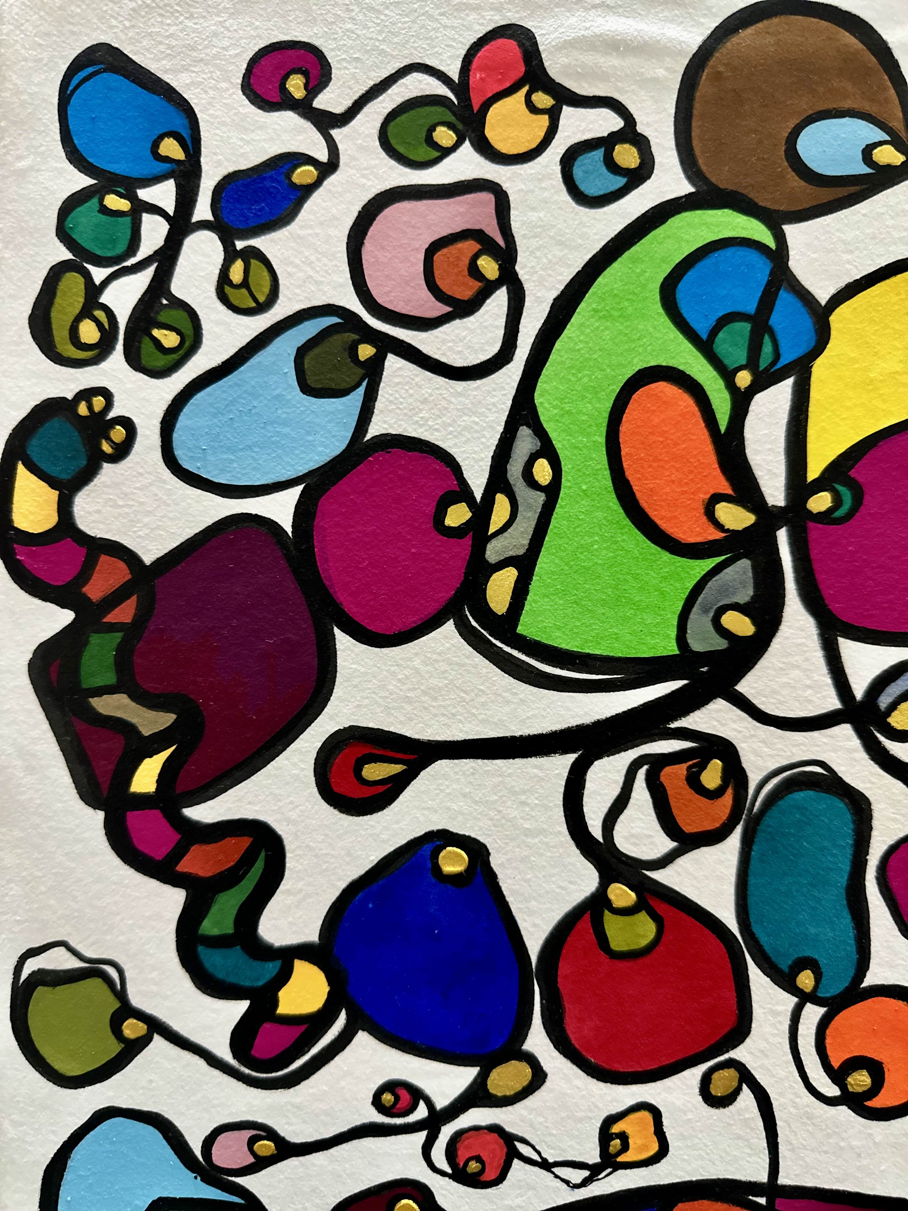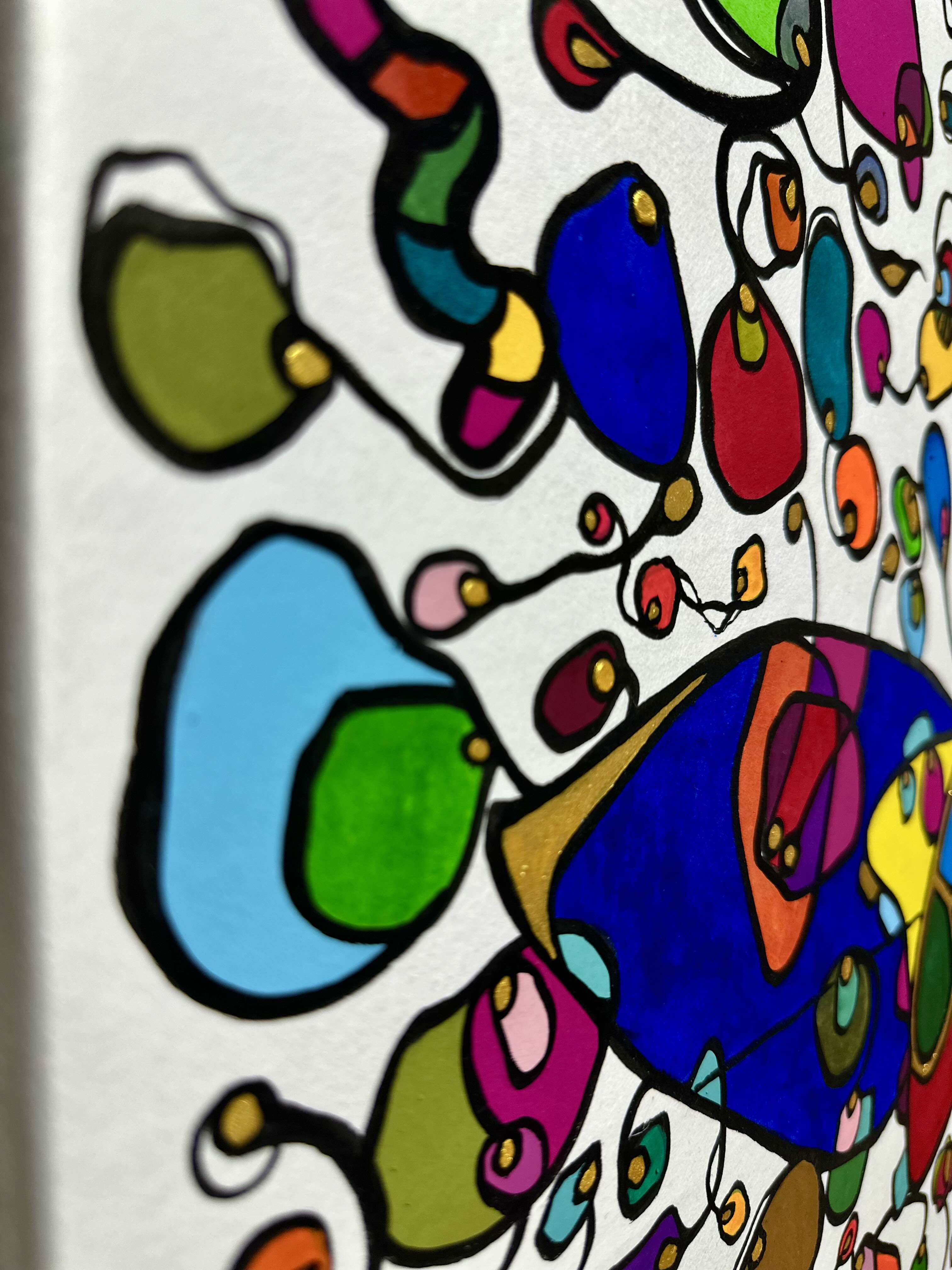 전통 한지 위에 흐르는 동양화 물감은 서구 매체로는 불가능한 침투와 확산을 보여준다. 색채는 종이 섬유 깊숙이 스며들어 숨을 쉬며, 그 투명성과 깊이는 마치 각 존재의 내면까지 들여다보는 듯하다. 먹펜으로 그어진 검은 선들은 이제 구속의 도구가 아닌 생명의 혈관이 되어, 모든 형상을 유기적으로 연결하며 에너지를 순환시킨다.