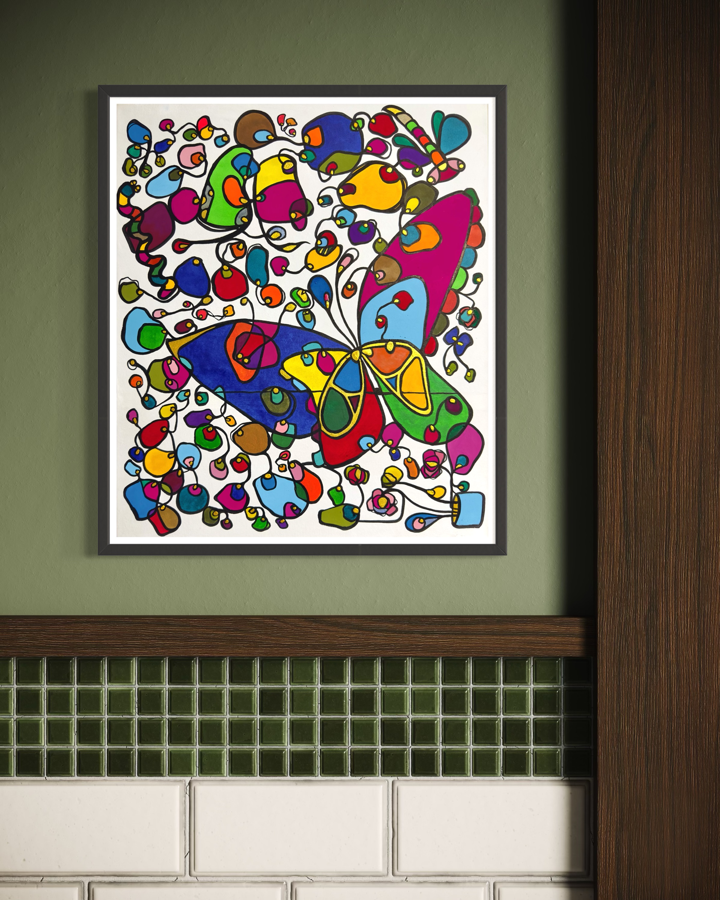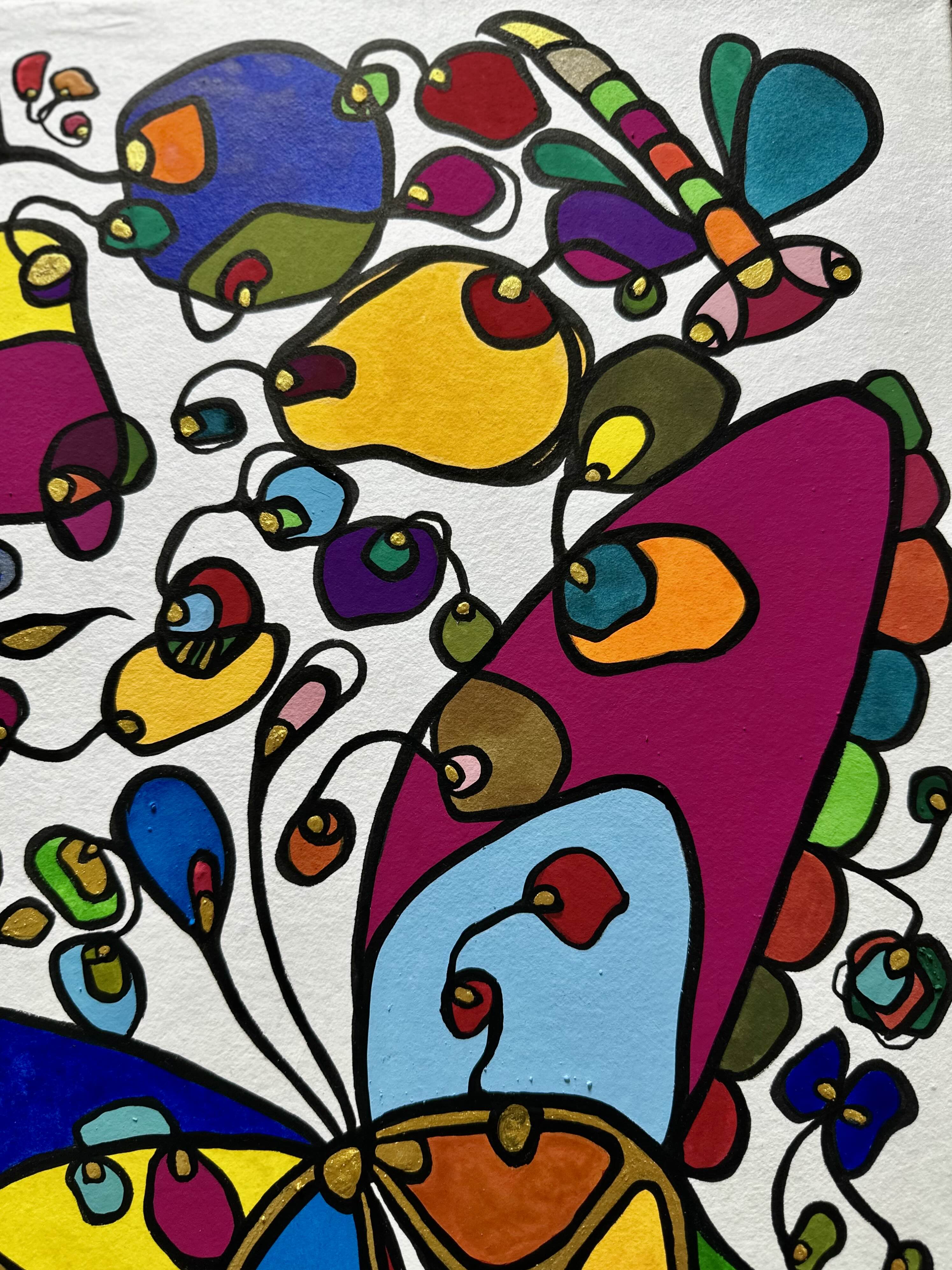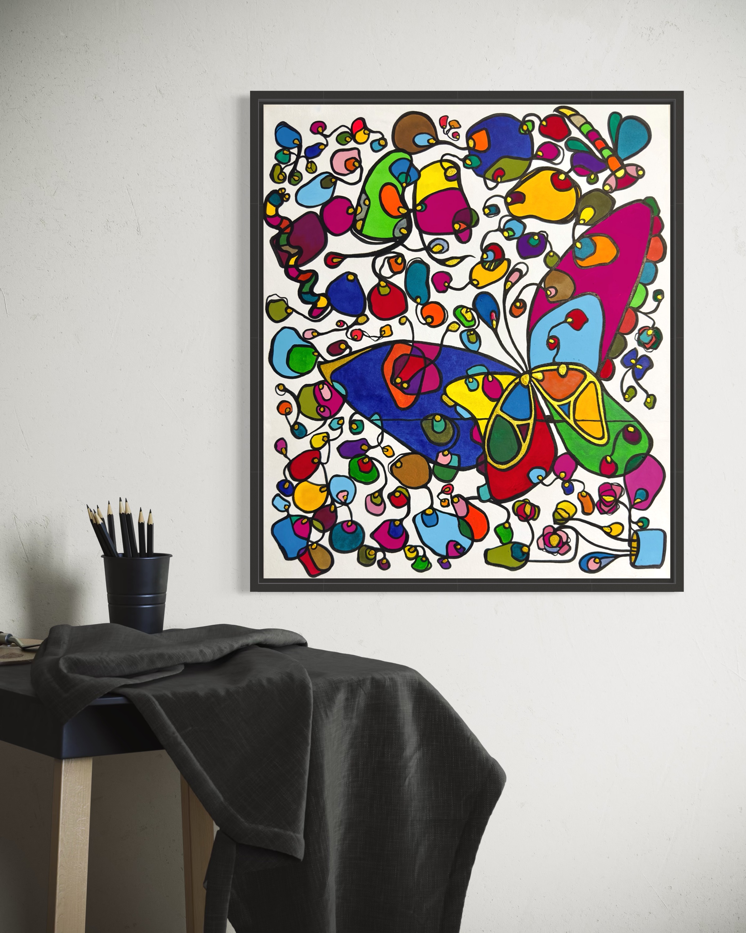 화면의 중심을 가로지르는 거대한 나비는 변태의 완성체다. 땅을 기던 애벌레가 하늘을 나는 존재로 거듭나는 순간, 그것은 단순한 생물학적 현상을 넘어 존재론적 혁명이 된다. 이 나비 주변으로 펼쳐진 무수한 결정체들—애벌레, 잠자리, 꽃봉오리, 점들—은 각자 서로 다른 변화의 단계에 있으면서도 모두 같은 해방의 에너지를 공유한다.