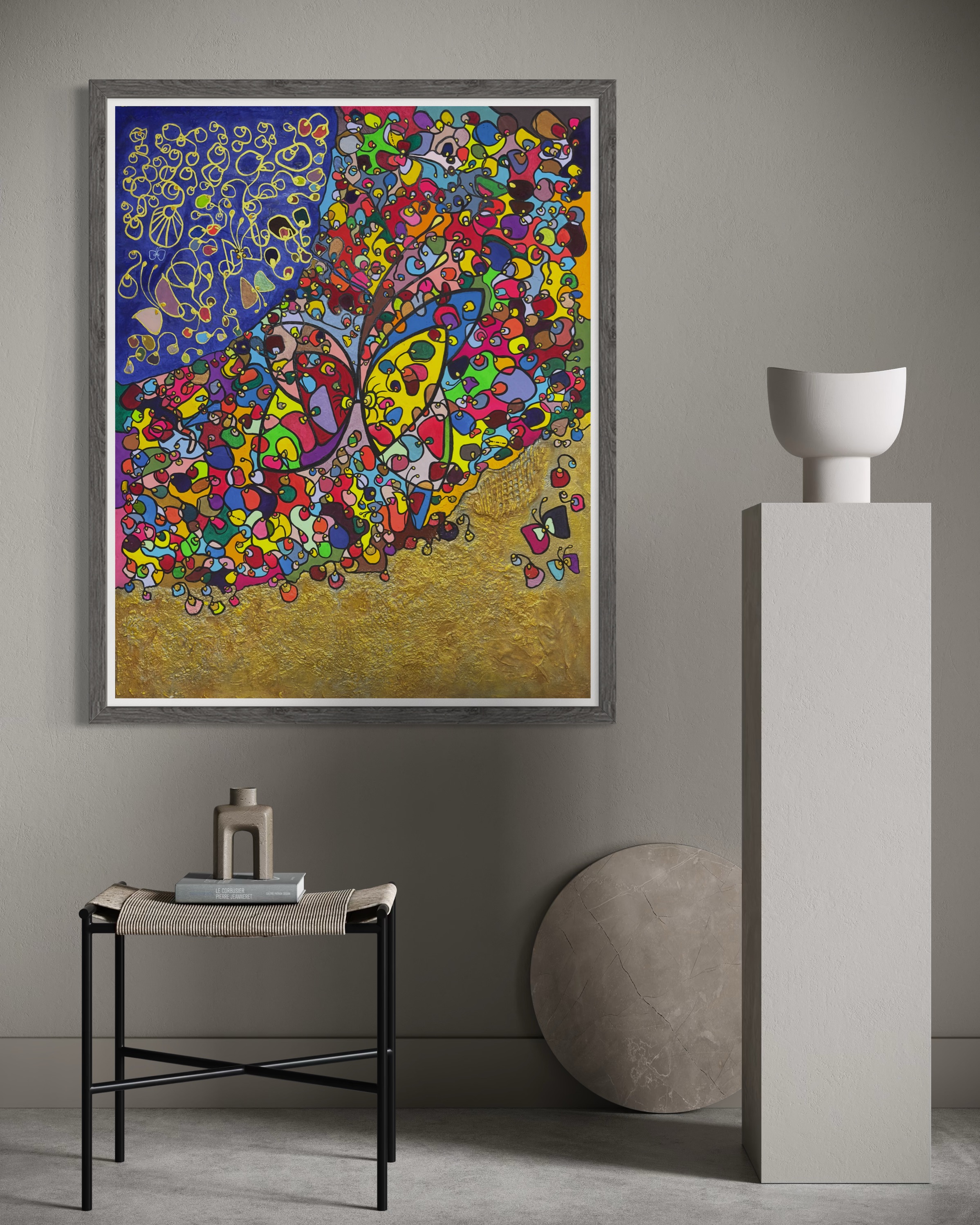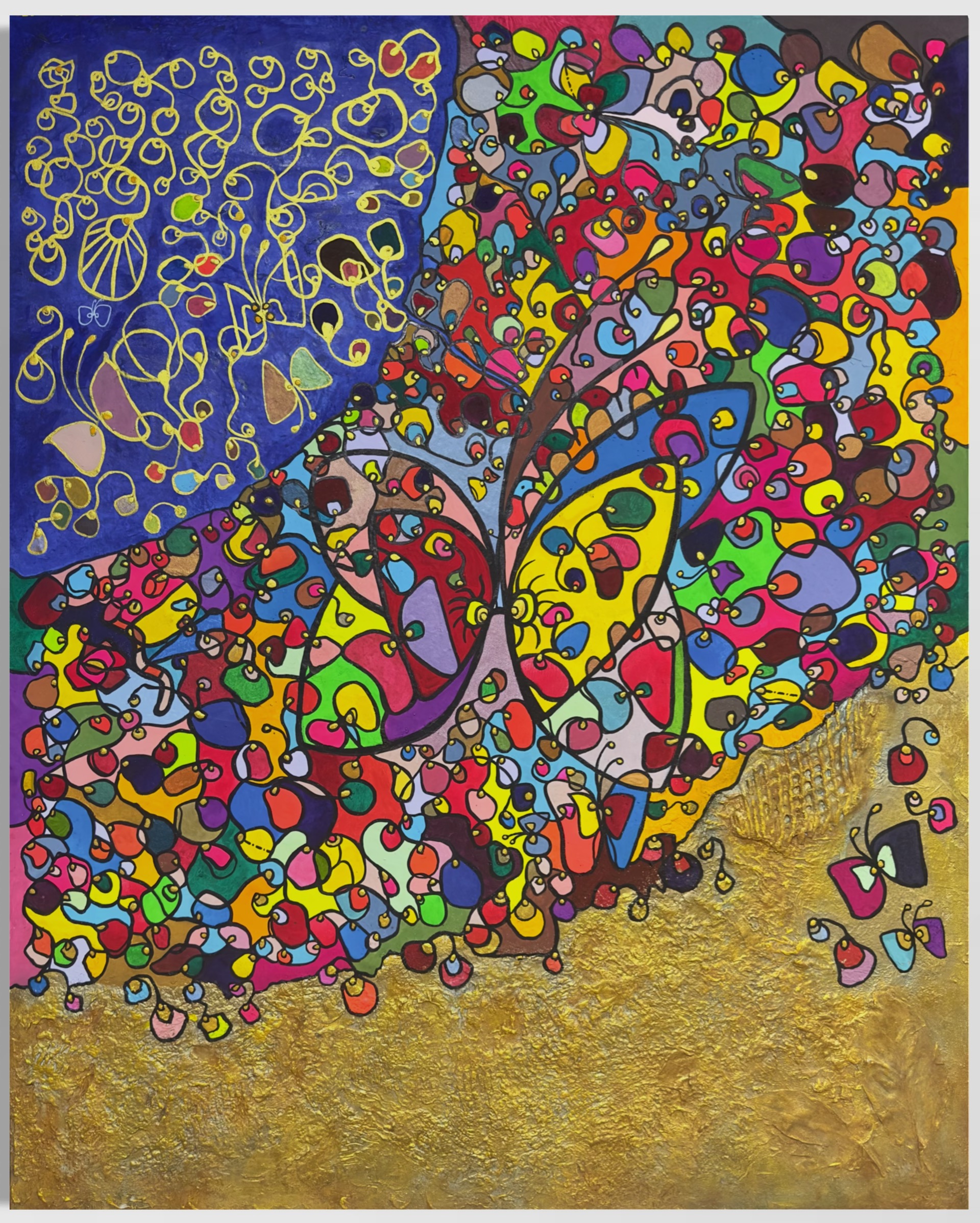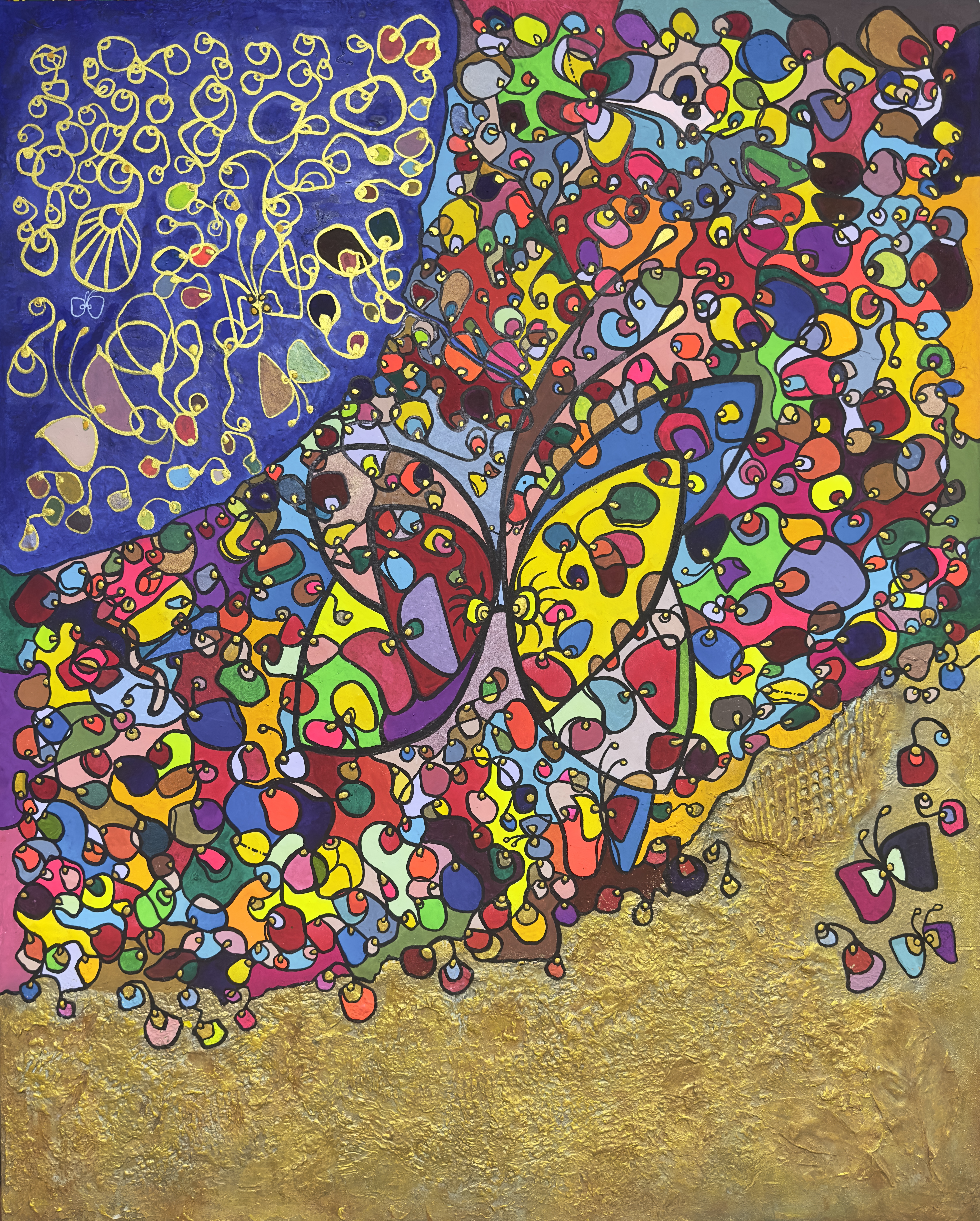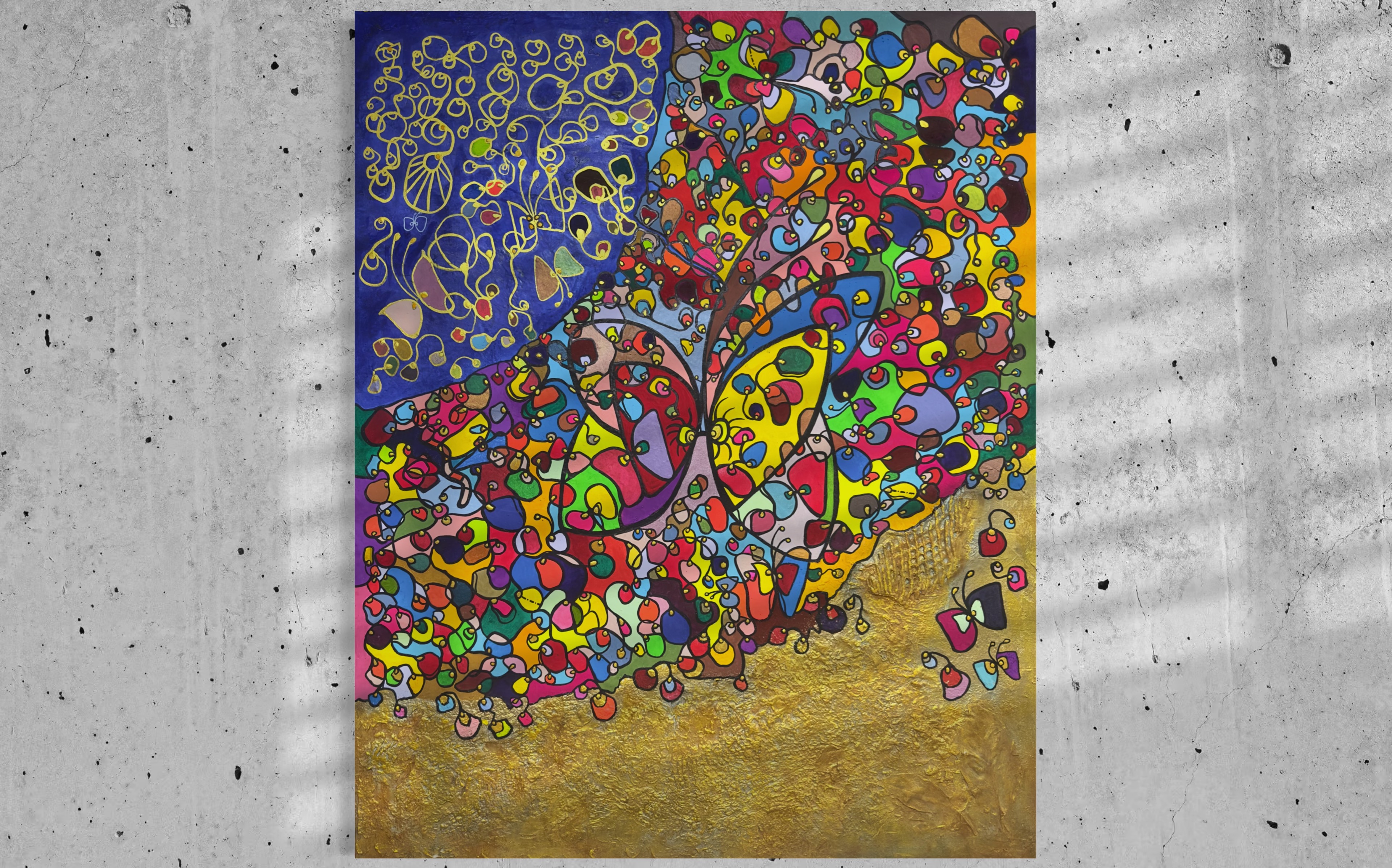 This work explores the temporal turning points of human consciousness through material metaphor. The corroded gold leaf at the bottom reveals the duality of the premodern era, compressing earth pigments to induce cracks that embody the sublimity and oppression of theocentric authority. From these fissures emerges the first resistant flutter of wings. The central section manifests the dynamic evolution of modern humanism, where individuality becomes a civilizational force. Confident ink strokes form a cellular matrix, with colors breathing in unique rhythms. Dripping traditional mineral pigments onto wetted hanji sparks spontaneous interactions, reflecting consciousness’s emergent nature and metaphysical resonance. Each cell spans the spectrum of metamorphosis—from ova to chrysalis. Golden points signify pure essence, yet their resonance through a black neural network reveals the paradox that individuality thrives only in relational contexts. The upper section shifts to a new temporal register, where cobalt powder and glue suggest technopia’s allure alongside a warning of algorithmic standardization. Materials—dismantled hanji, transformed Styrofoam—testify to time, posing the question: In which stratum does your consciousness reside, and do its golden points still hold wings of metamorphosis?