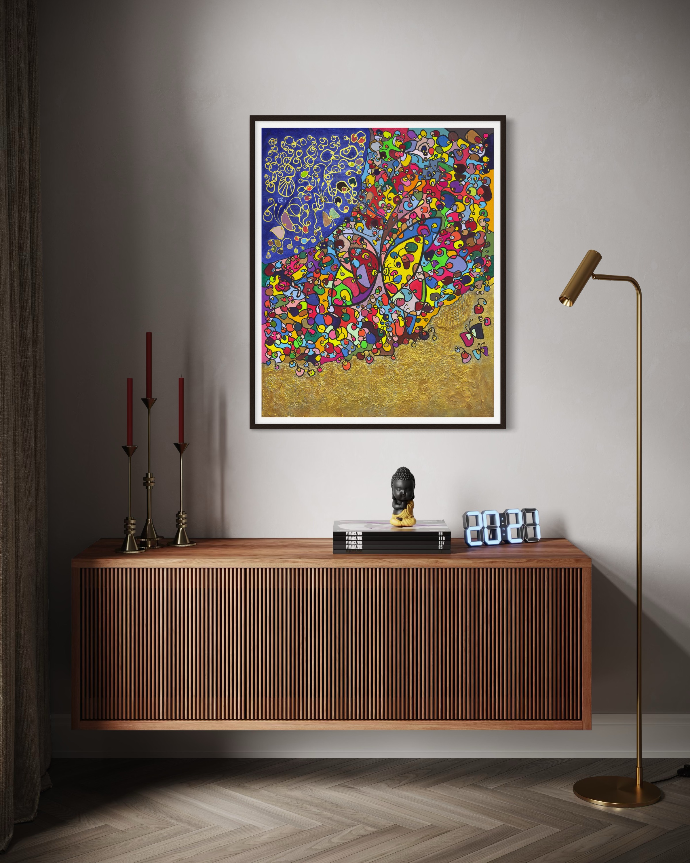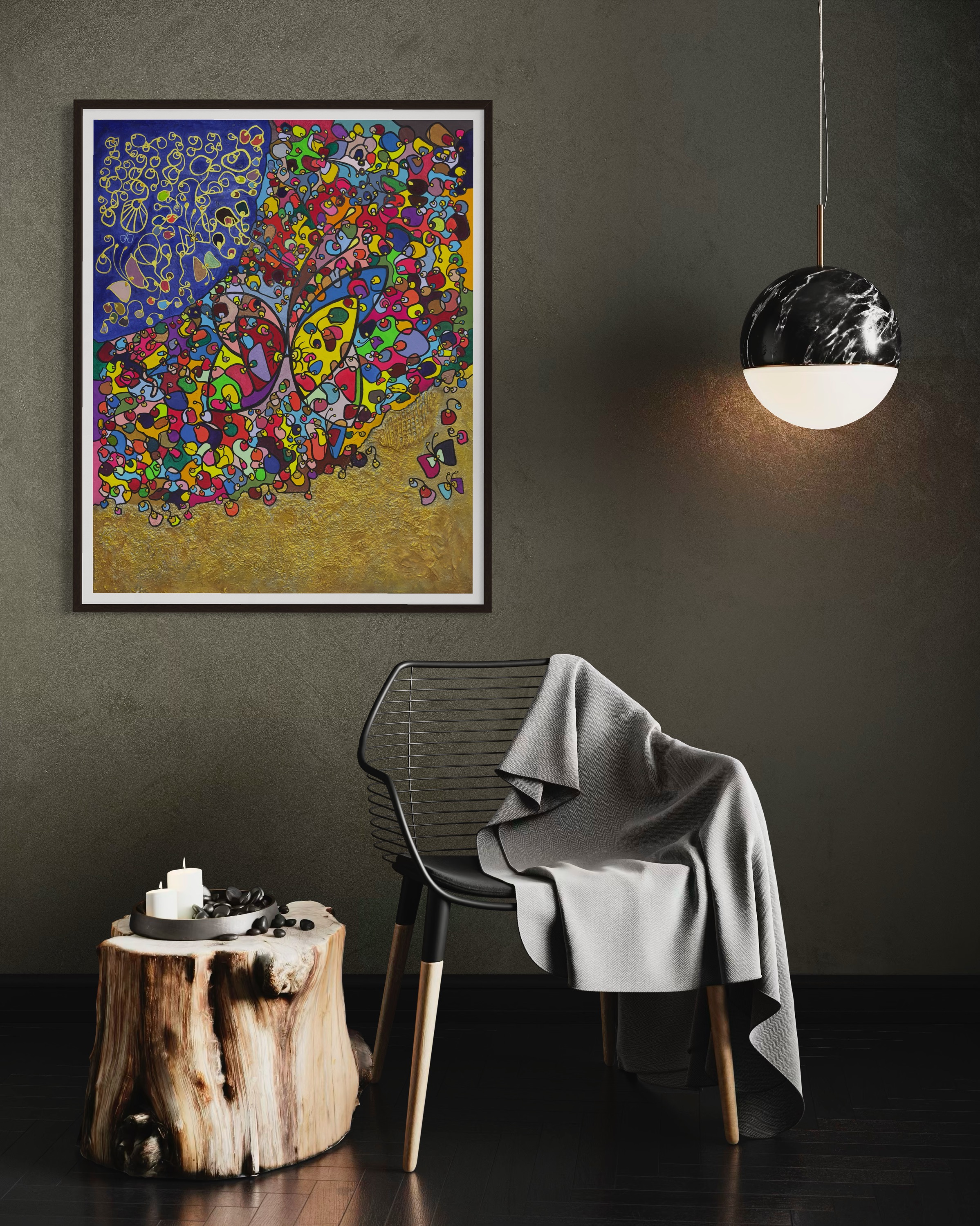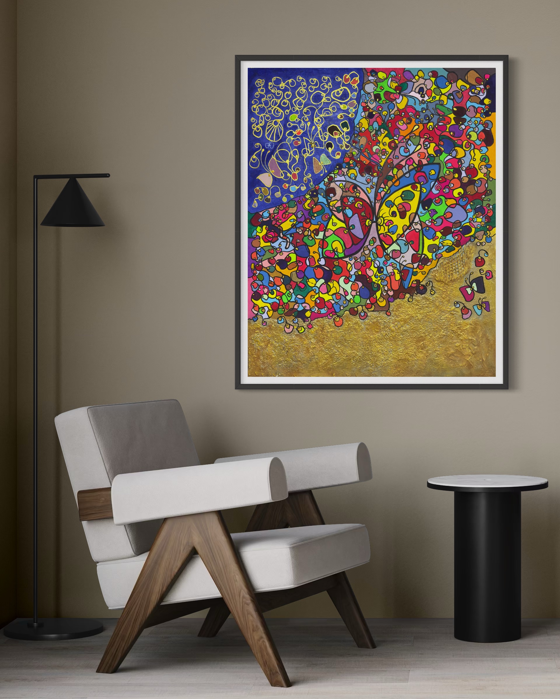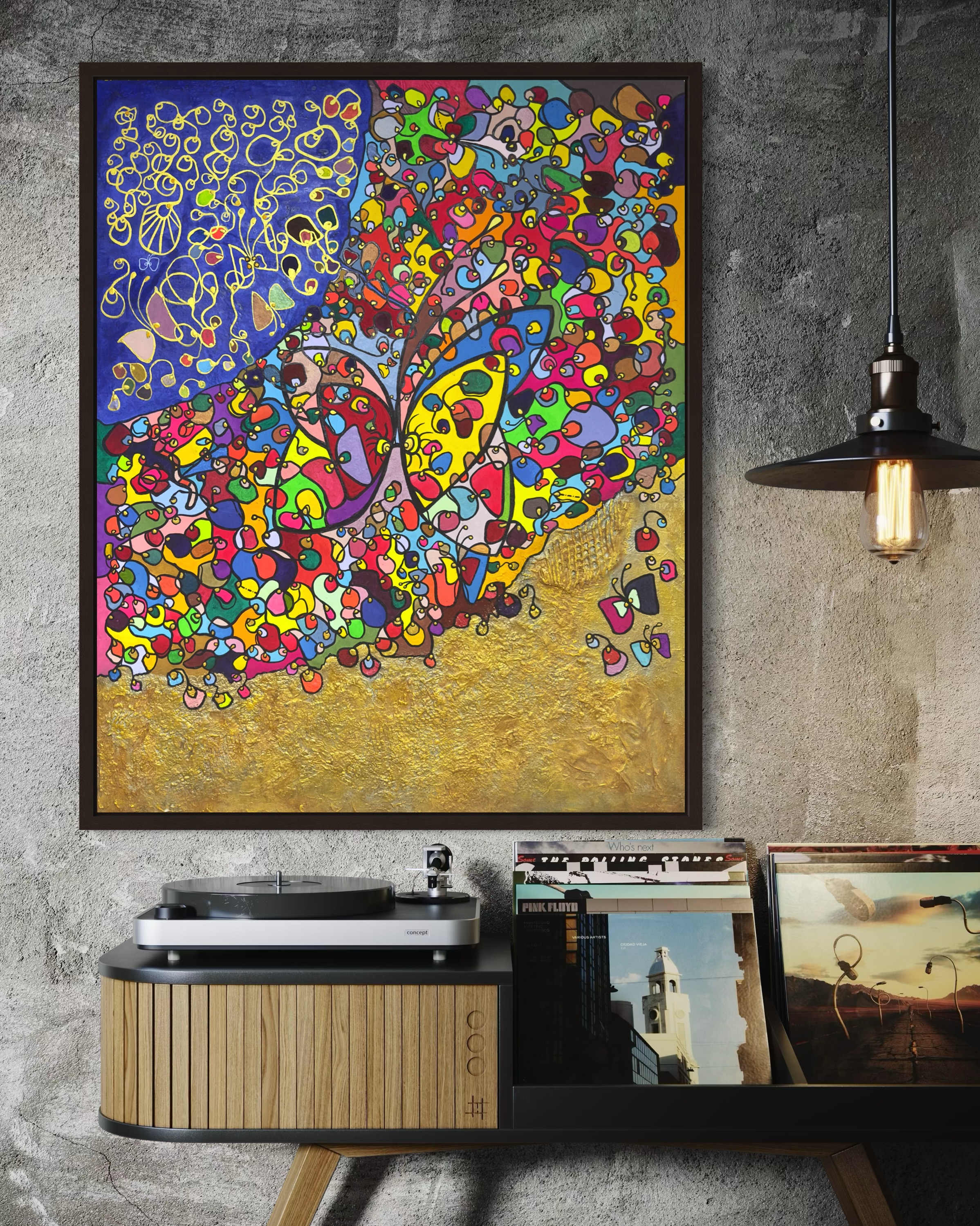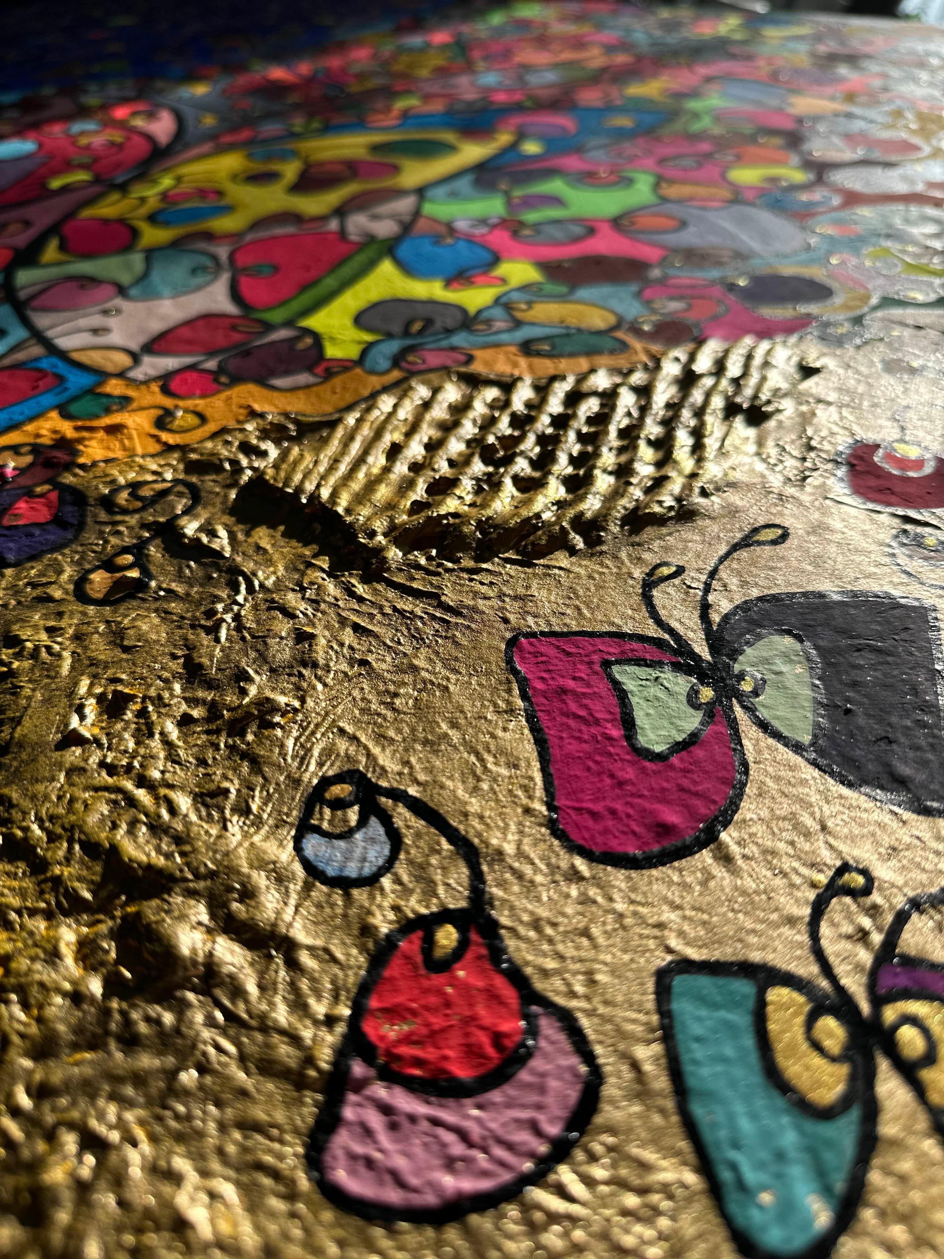 This work explores the temporal turning points of human consciousness through material metaphor. The corroded gold leaf at the bottom reveals the duality of the premodern era, compressing earth pigments to induce cracks that embody the sublimity and oppression of theocentric authority. From these fissures emerges the first resistant flutter of wings. The central section manifests the dynamic evolution of modern humanism, where individuality becomes a civilizational force. Confident ink strokes form a cellular matrix, with colors breathing in unique rhythms. Dripping traditional mineral pigments onto wetted hanji sparks spontaneous interactions, reflecting consciousness’s emergent nature and metaphysical resonance. Each cell spans the spectrum of metamorphosis—from ova to chrysalis. Golden points signify pure essence, yet their resonance through a black neural network reveals the paradox that individuality thrives only in relational contexts. The upper section shifts to a new temporal register, where cobalt powder and glue suggest technopia’s allure alongside a warning of algorithmic standardization. Materials—dismantled hanji, transformed Styrofoam—testify to time, posing the question: In which stratum does your consciousness reside, and do its golden points still hold wings of metamorphosis?