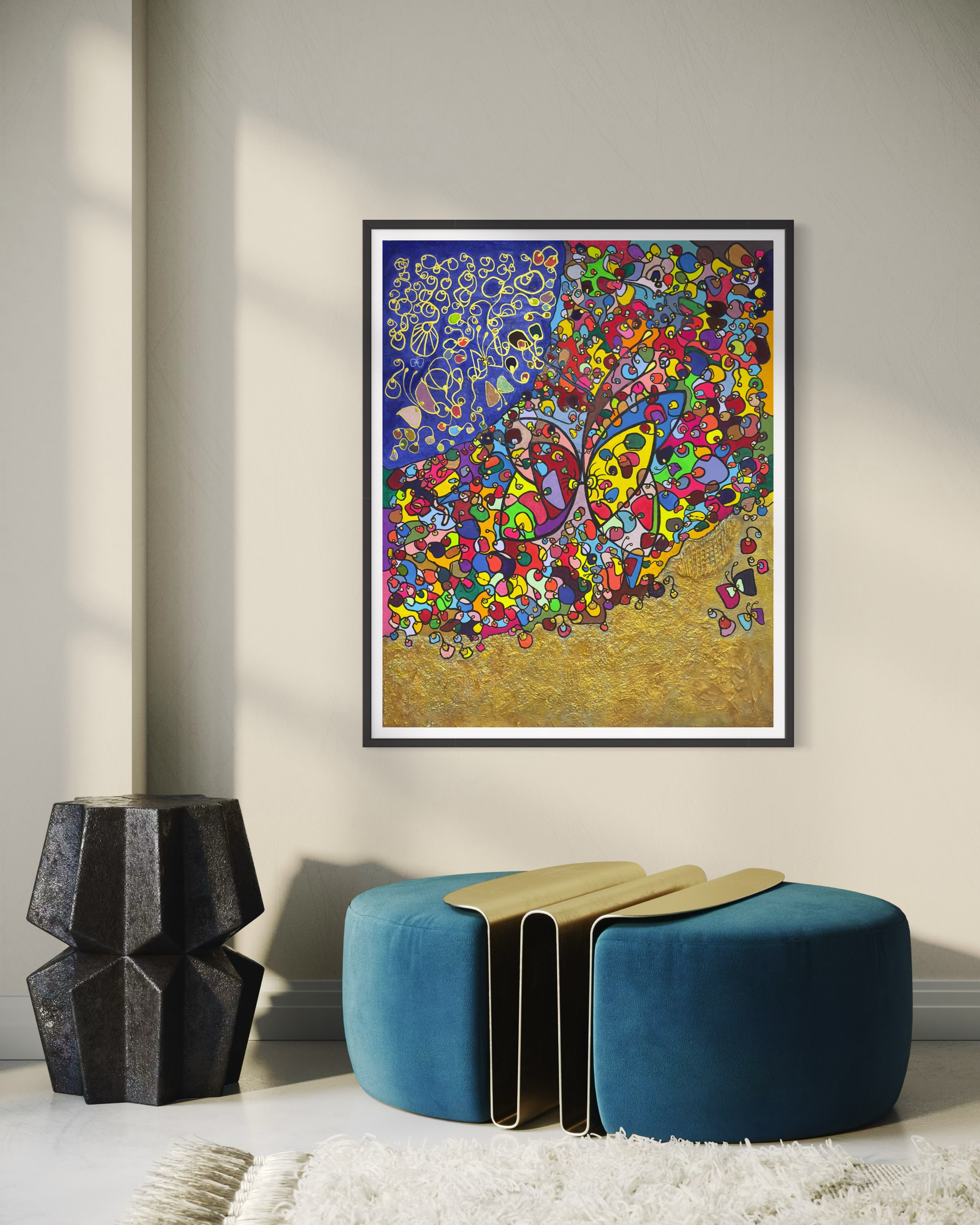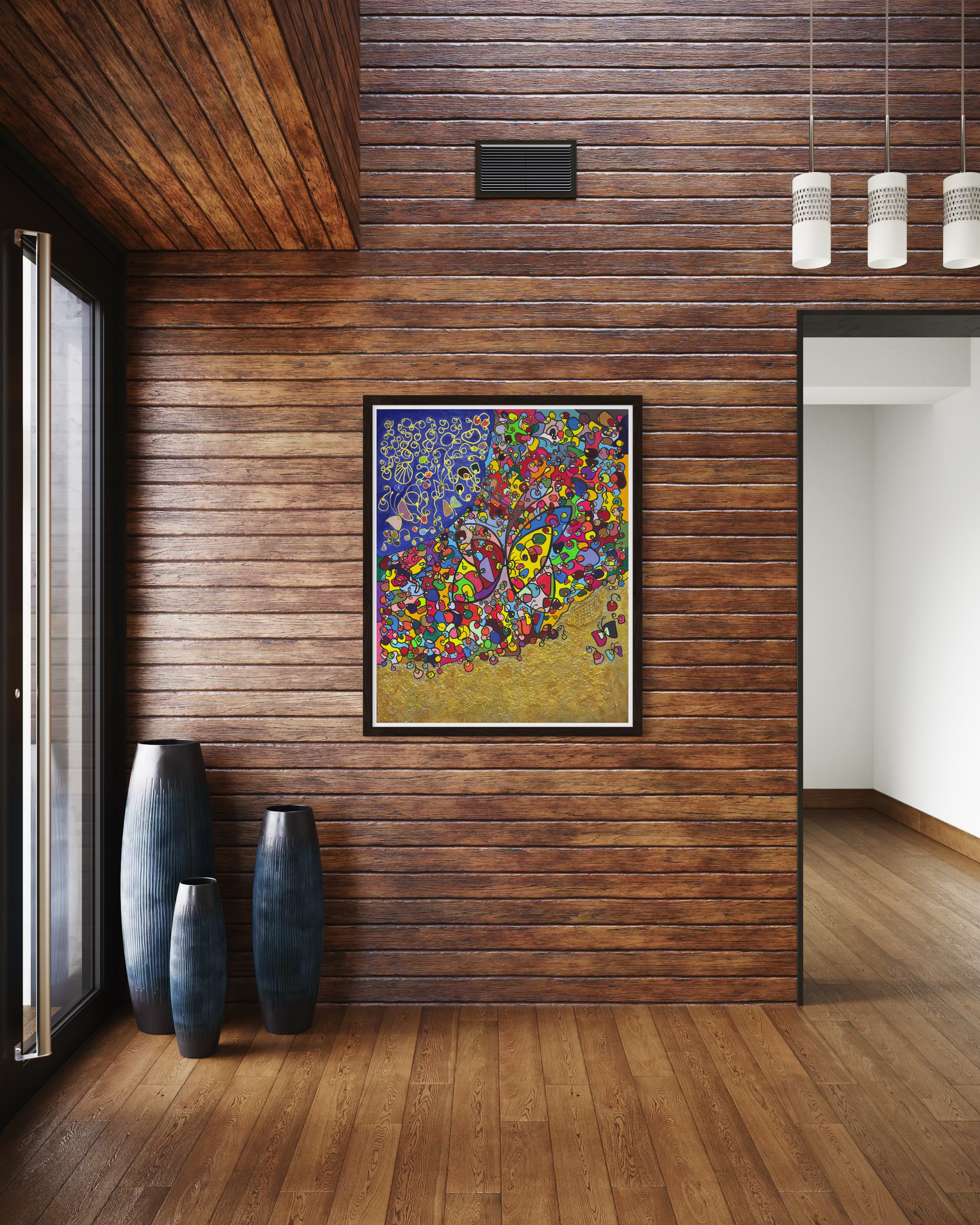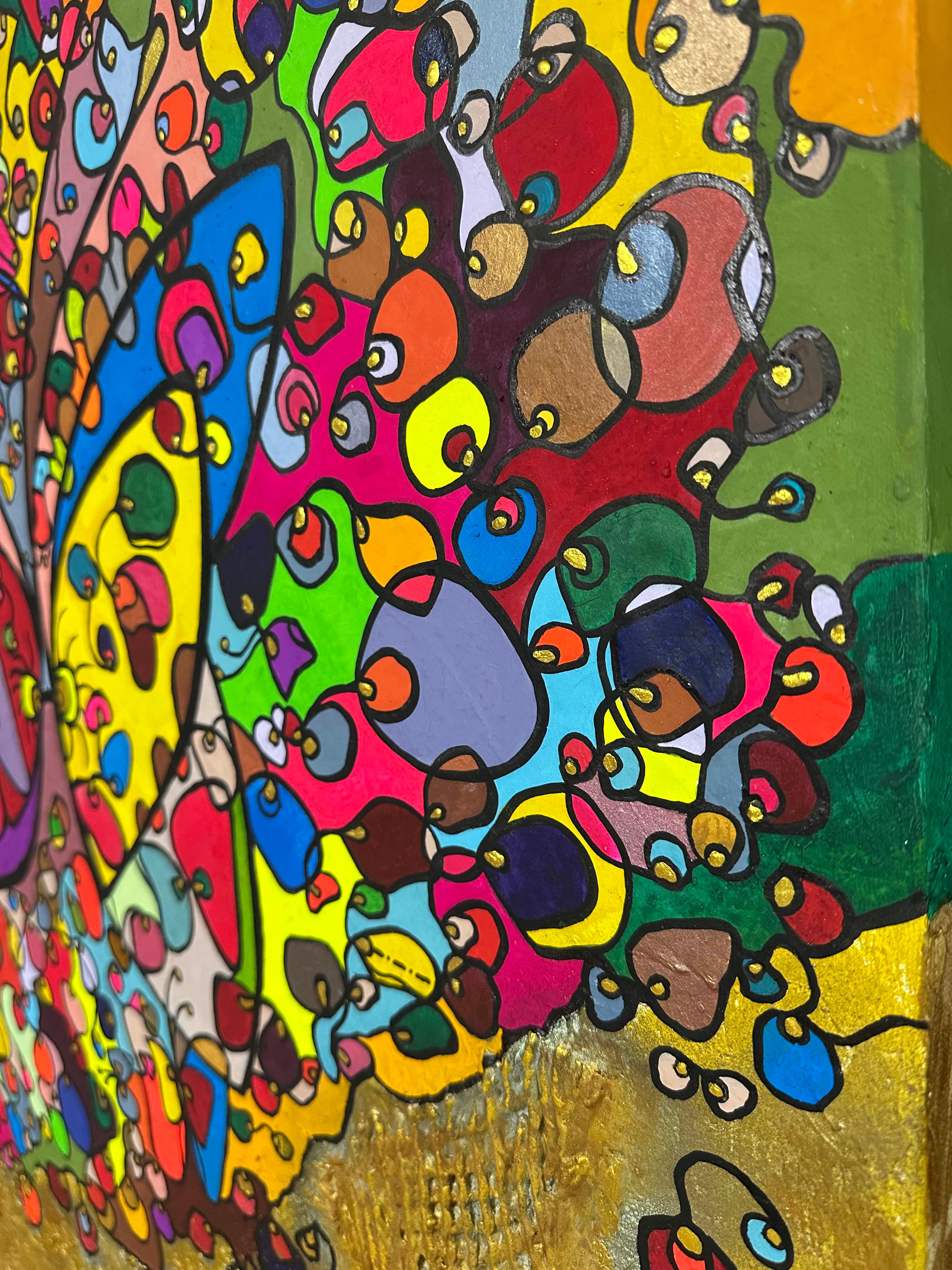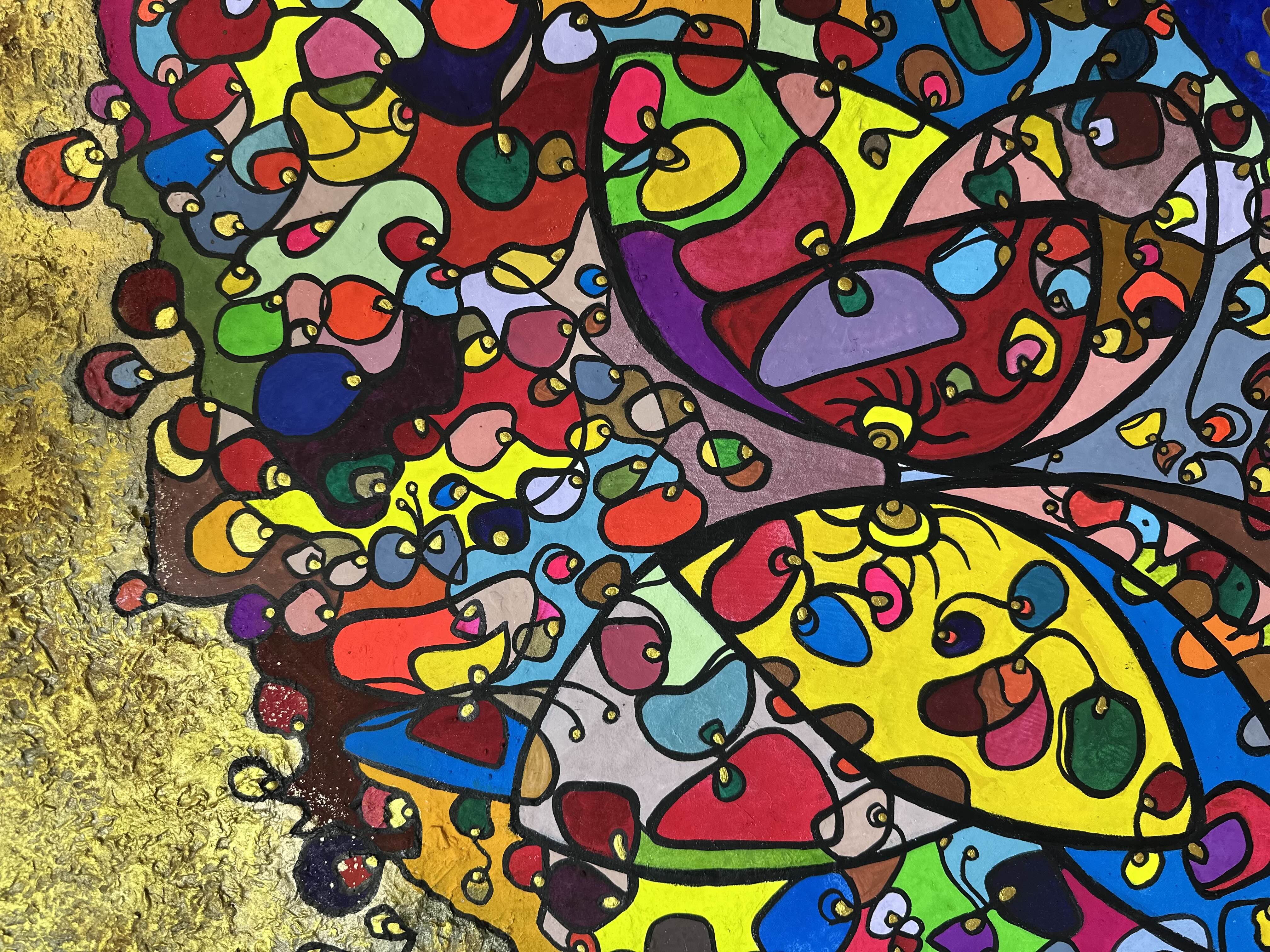 This work explores the temporal turning points of human consciousness through material metaphor. The corroded gold leaf at the bottom reveals the duality of the premodern era, compressing earth pigments to induce cracks that embody the sublimity and oppression of theocentric authority. From these fissures emerges the first resistant flutter of wings. The central section manifests the dynamic evolution of modern humanism, where individuality becomes a civilizational force. Confident ink strokes form a cellular matrix, with colors breathing in unique rhythms. Dripping traditional mineral pigments onto wetted hanji sparks spontaneous interactions, reflecting consciousness’s emergent nature and metaphysical resonance. Each cell spans the spectrum of metamorphosis—from ova to chrysalis. Golden points signify pure essence, yet their resonance through a black neural network reveals the paradox that individuality thrives only in relational contexts. The upper section shifts to a new temporal register, where cobalt powder and glue suggest technopia’s allure alongside a warning of algorithmic standardization. Materials—dismantled hanji, transformed Styrofoam—testify to time, posing the question: In which stratum does your consciousness reside, and do its golden points still hold wings of metamorphosis?