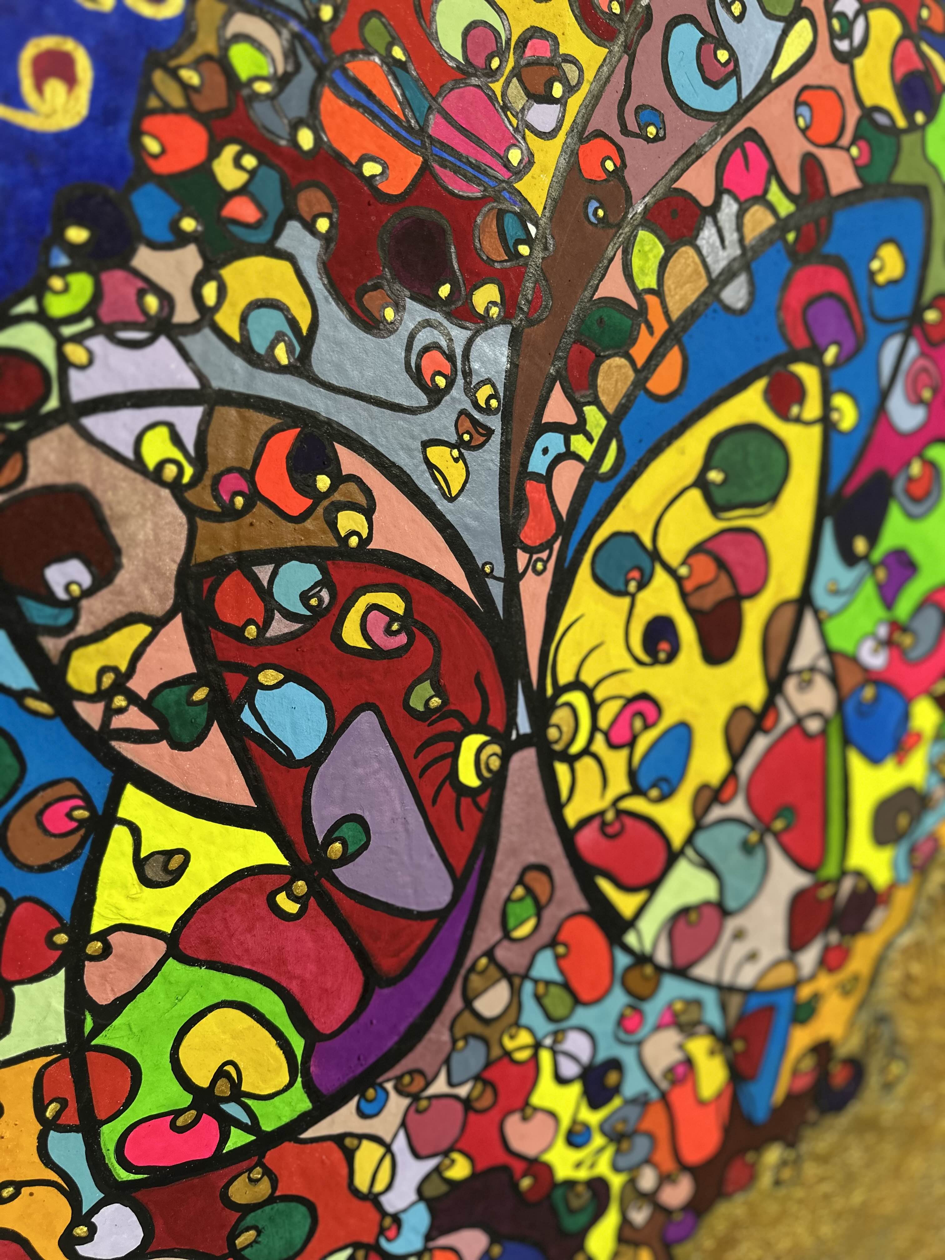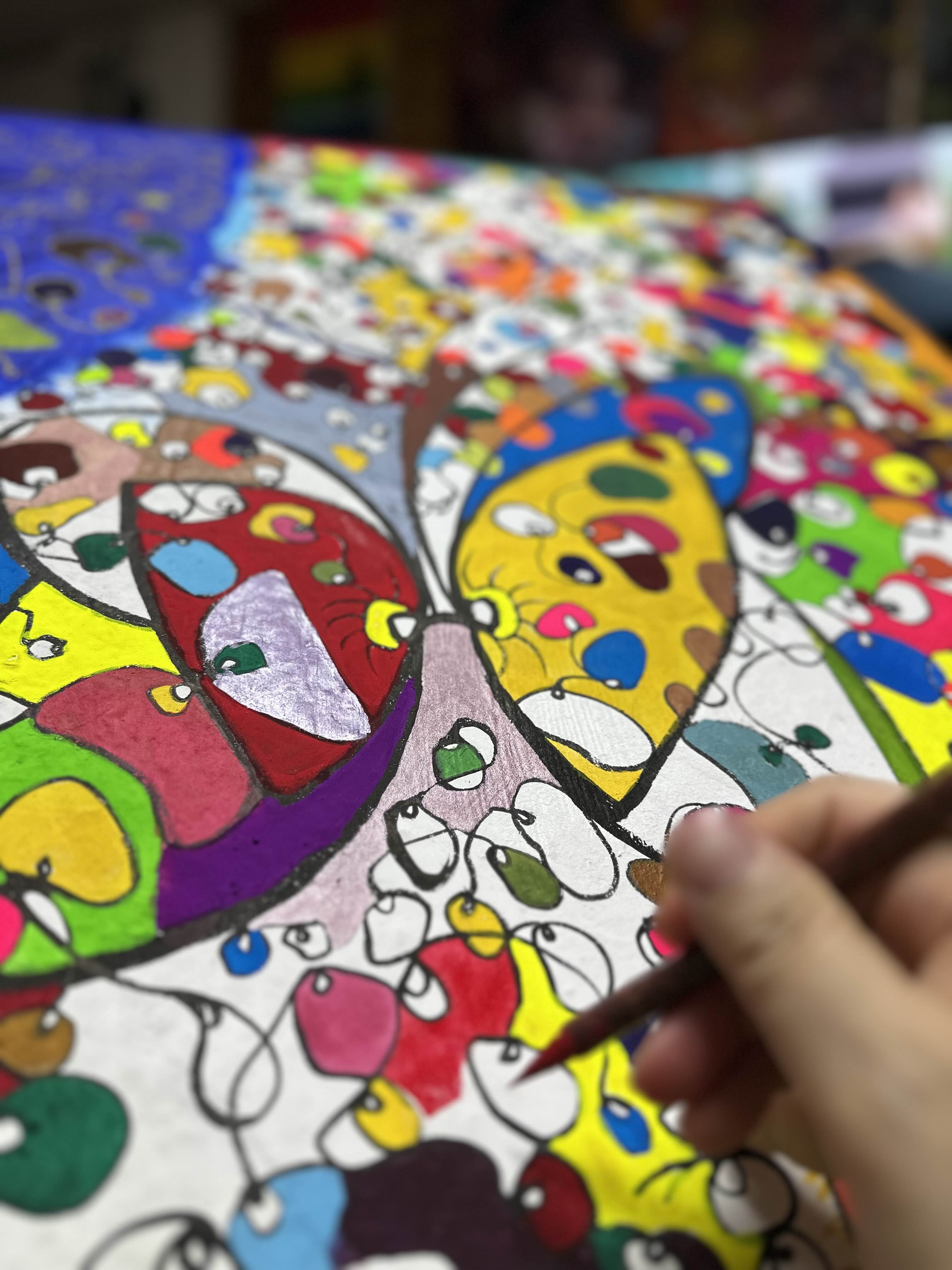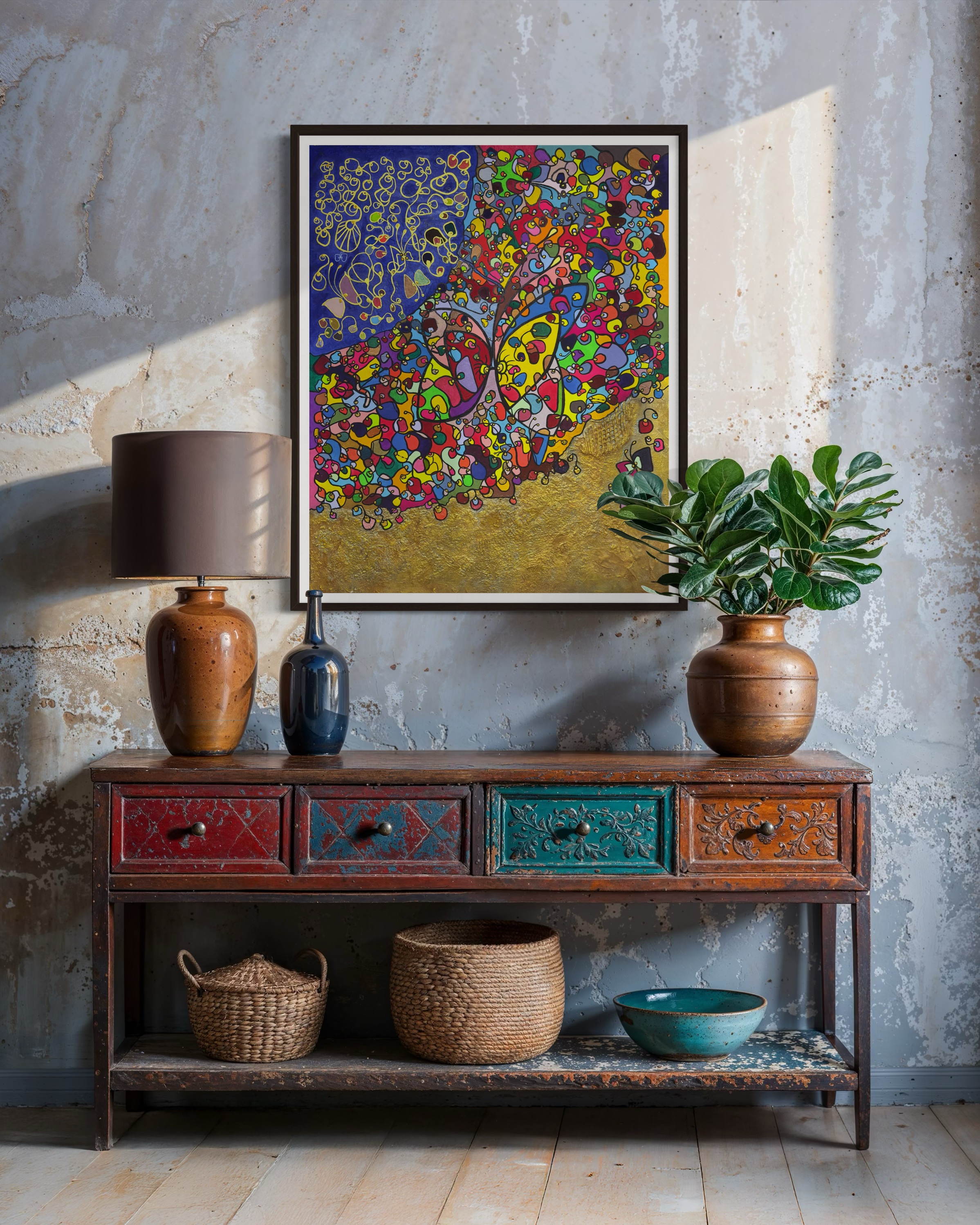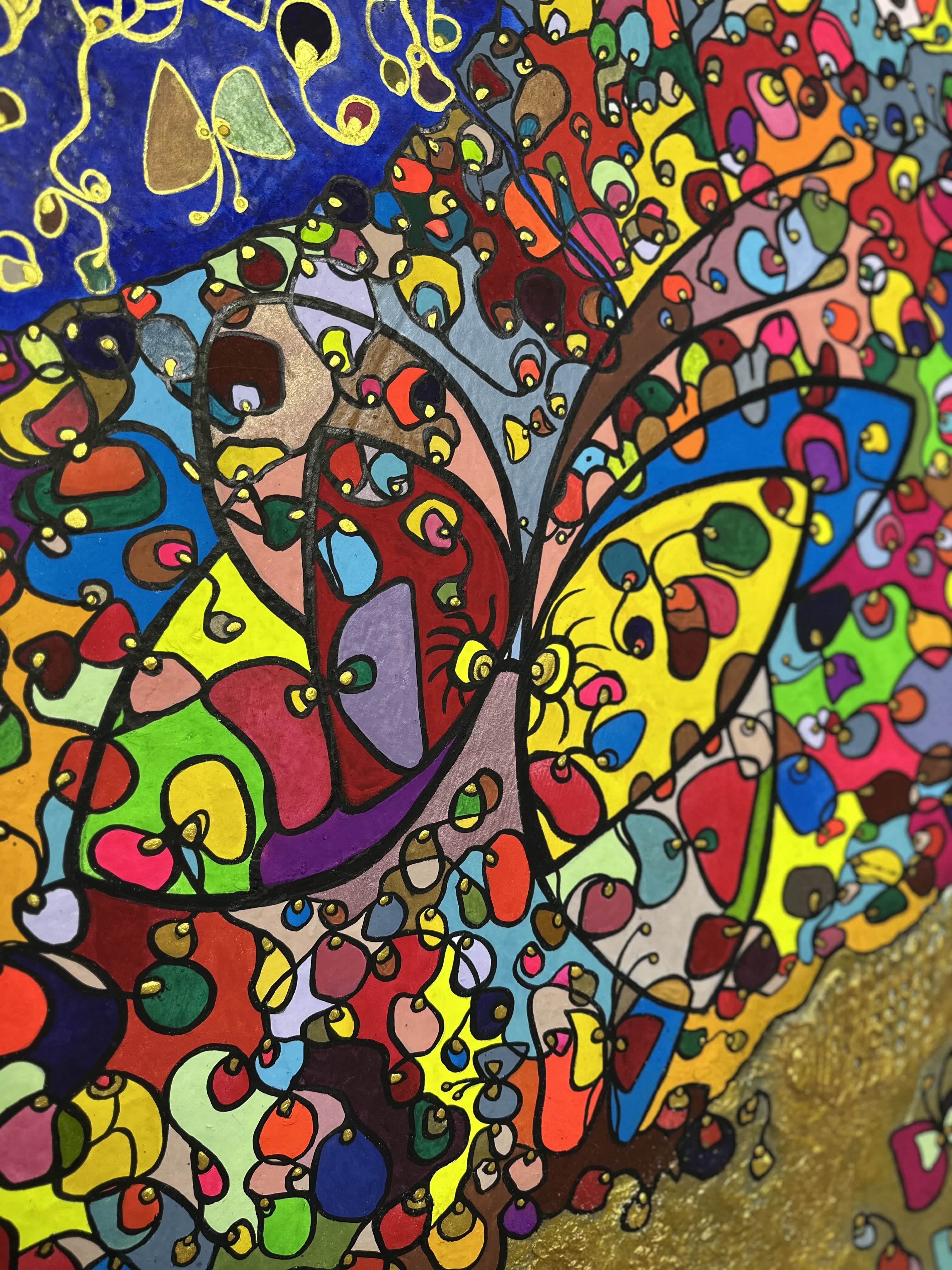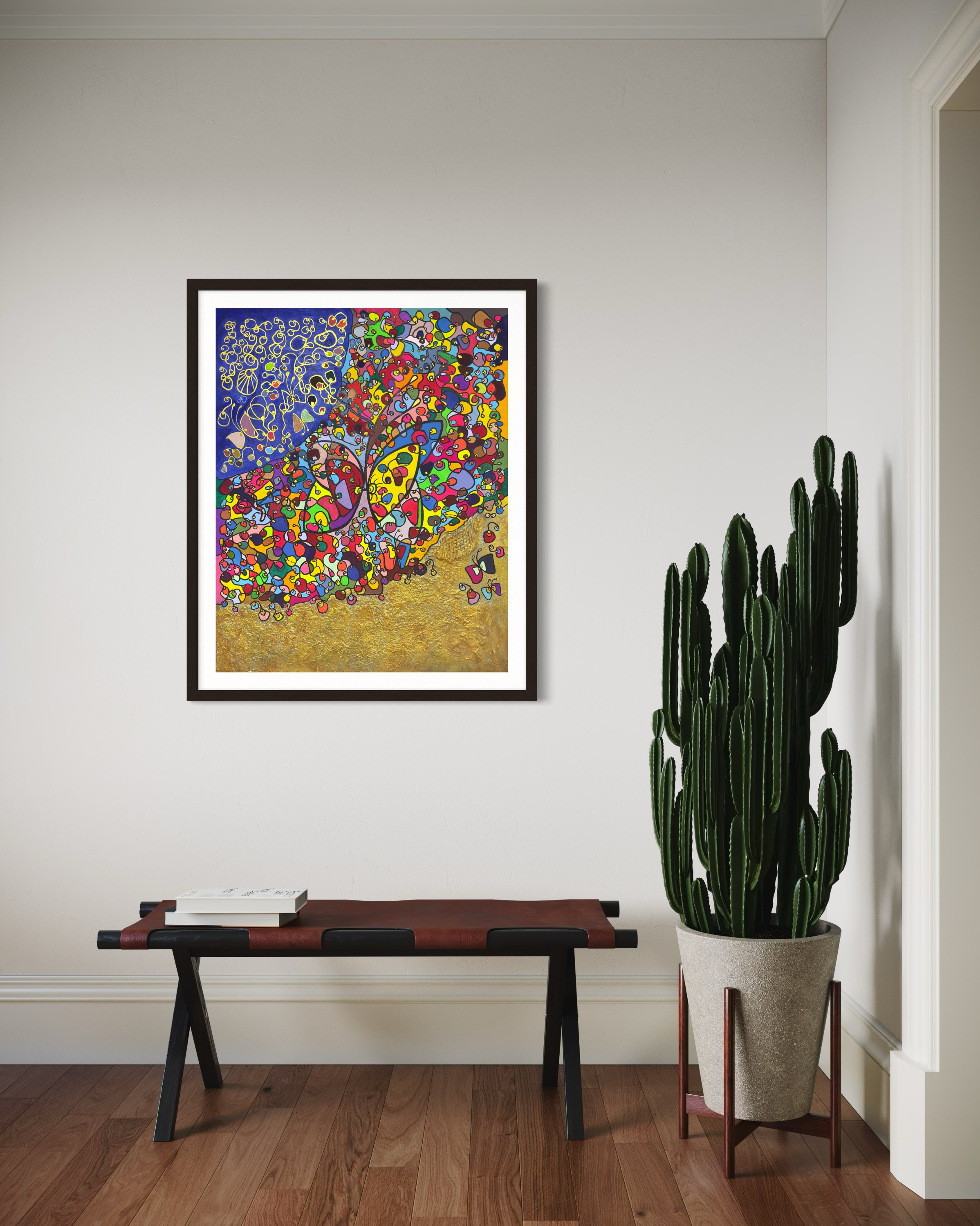 This work explores the temporal turning points of human consciousness through material metaphor. The corroded gold leaf at the bottom reveals the duality of the premodern era, compressing earth pigments to induce cracks that embody the sublimity and oppression of theocentric authority. From these fissures emerges the first resistant flutter of wings. The central section manifests the dynamic evolution of modern humanism, where individuality becomes a civilizational force. Confident ink strokes form a cellular matrix, with colors breathing in unique rhythms. Dripping traditional mineral pigments onto wetted hanji sparks spontaneous interactions, reflecting consciousness’s emergent nature and metaphysical resonance. Each cell spans the spectrum of metamorphosis—from ova to chrysalis. Golden points signify pure essence, yet their resonance through a black neural network reveals the paradox that individuality thrives only in relational contexts. The upper section shifts to a new temporal register, where cobalt powder and glue suggest technopia’s allure alongside a warning of algorithmic standardization. Materials—dismantled hanji, transformed Styrofoam—testify to time, posing the question: In which stratum does your consciousness reside, and do its golden points still hold wings of metamorphosis?