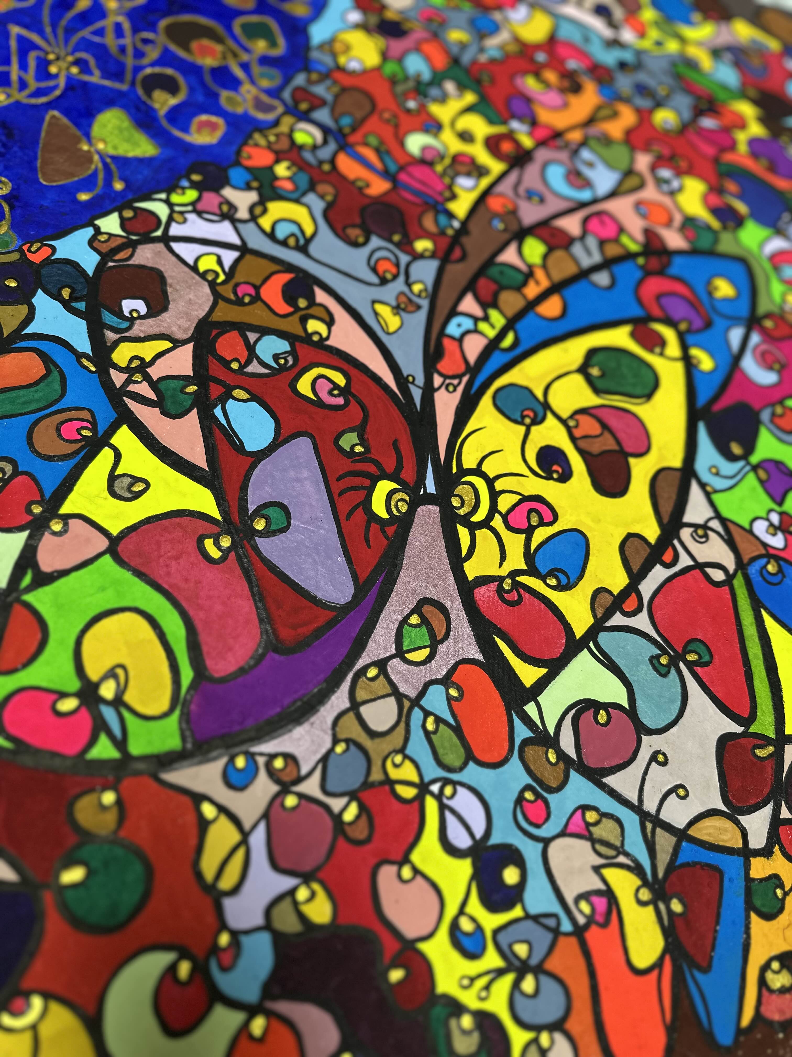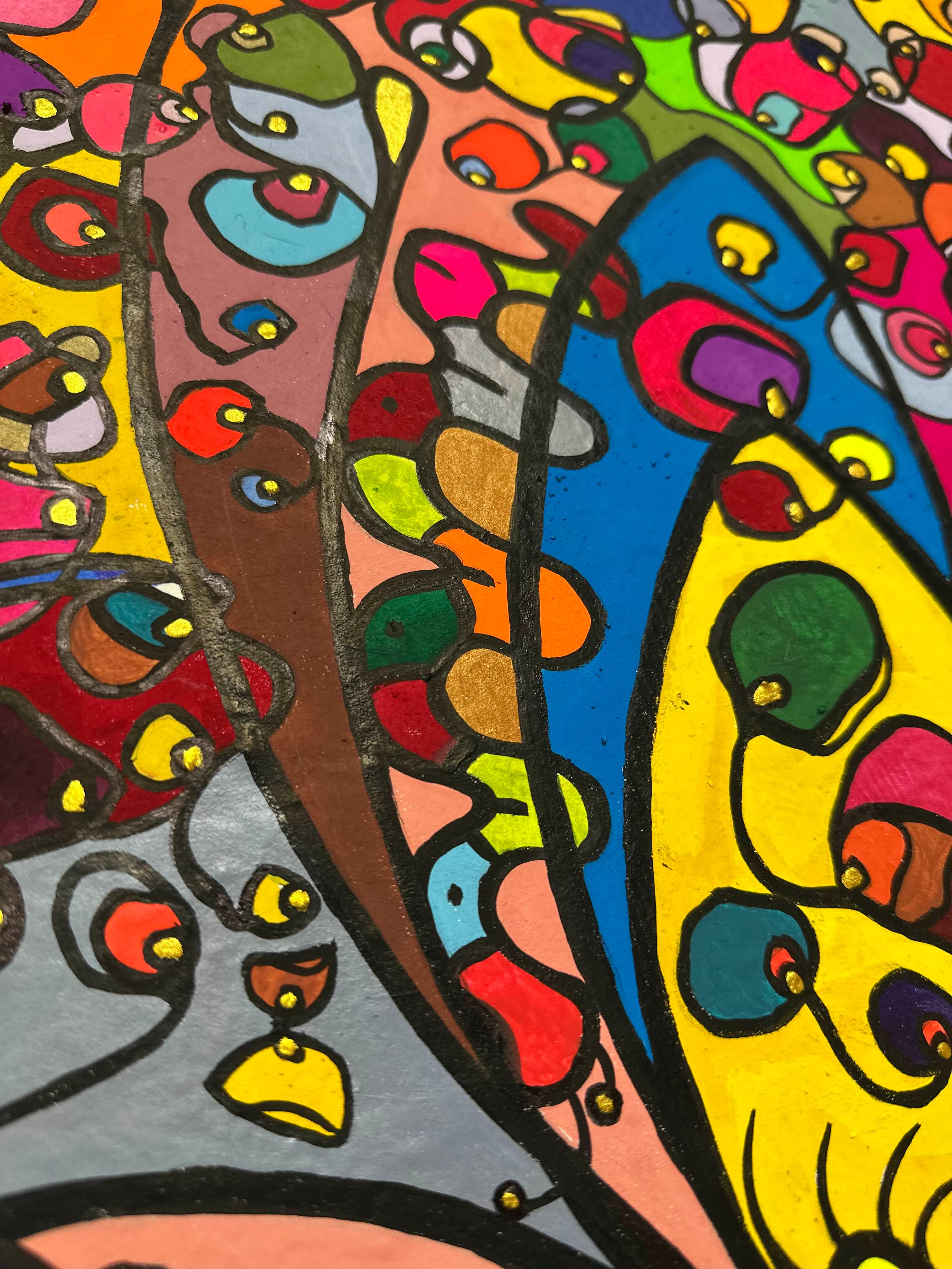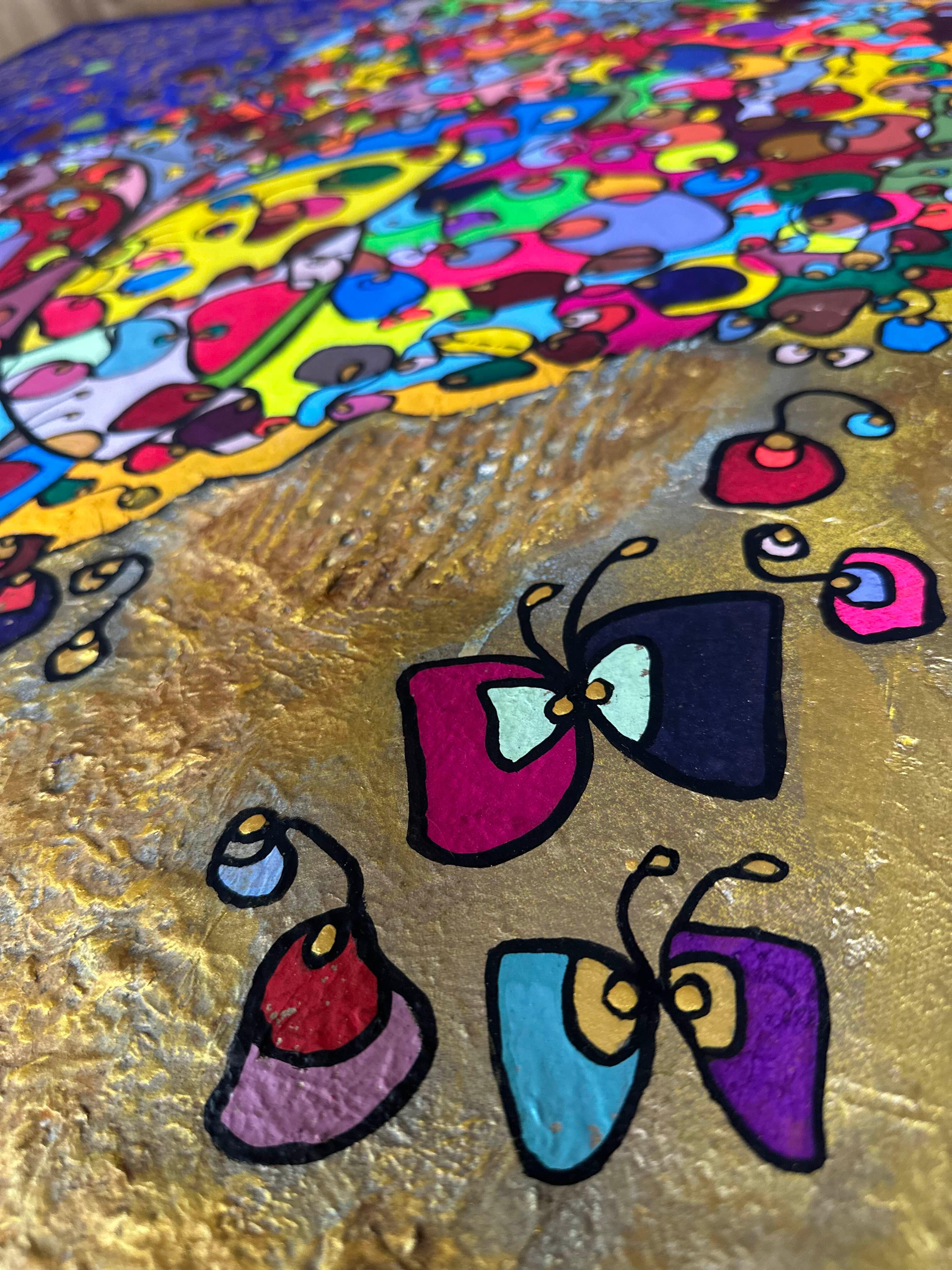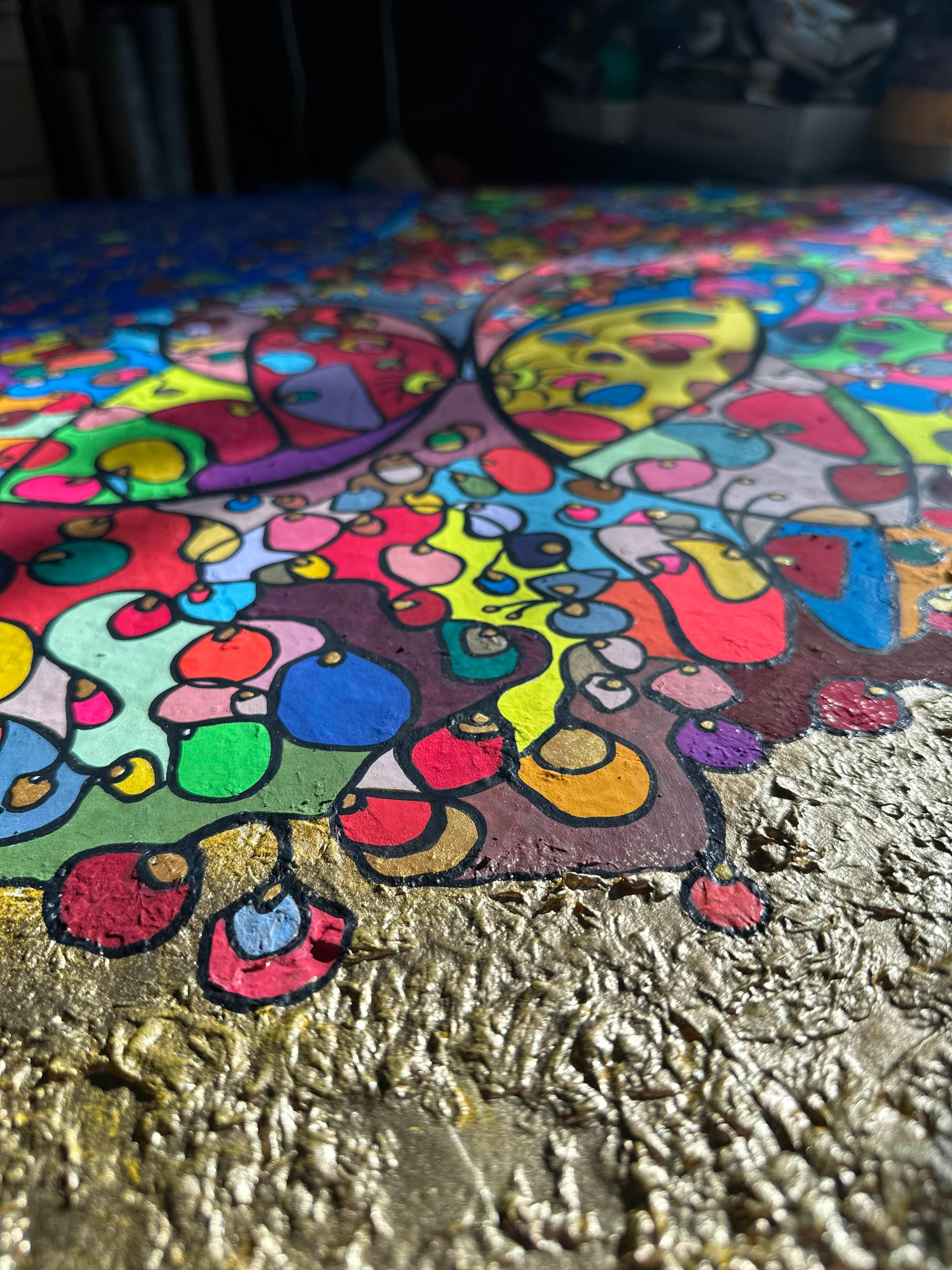 This work explores the temporal turning points of human consciousness through material metaphor. The corroded gold leaf at the bottom reveals the duality of the premodern era, compressing earth pigments to induce cracks that embody the sublimity and oppression of theocentric authority. From these fissures emerges the first resistant flutter of wings. The central section manifests the dynamic evolution of modern humanism, where individuality becomes a civilizational force. Confident ink strokes form a cellular matrix, with colors breathing in unique rhythms. Dripping traditional mineral pigments onto wetted hanji sparks spontaneous interactions, reflecting consciousness’s emergent nature and metaphysical resonance. Each cell spans the spectrum of metamorphosis—from ova to chrysalis. Golden points signify pure essence, yet their resonance through a black neural network reveals the paradox that individuality thrives only in relational contexts. The upper section shifts to a new temporal register, where cobalt powder and glue suggest technopia’s allure alongside a warning of algorithmic standardization. Materials—dismantled hanji, transformed Styrofoam—testify to time, posing the question: In which stratum does your consciousness reside, and do its golden points still hold wings of metamorphosis?
