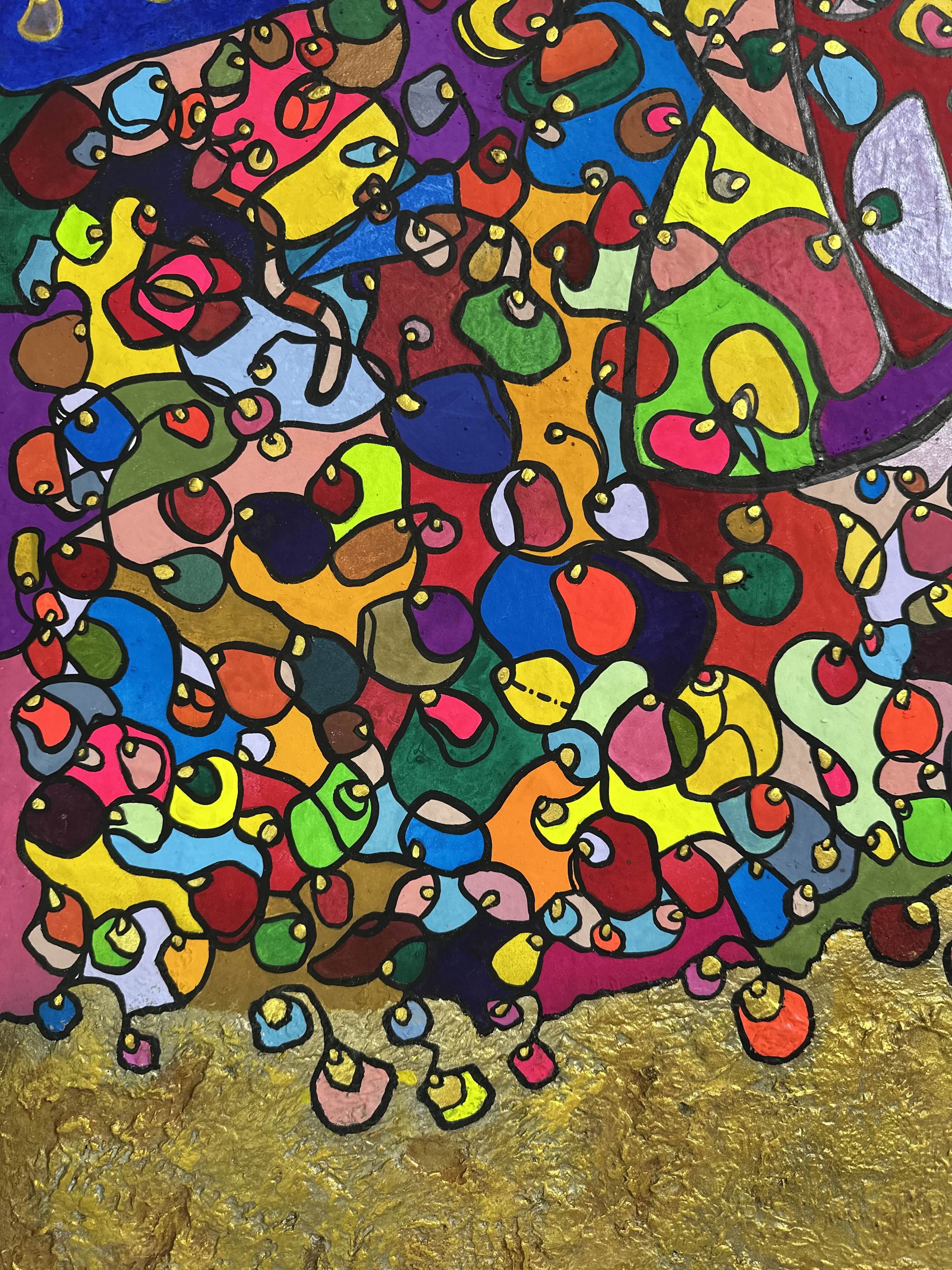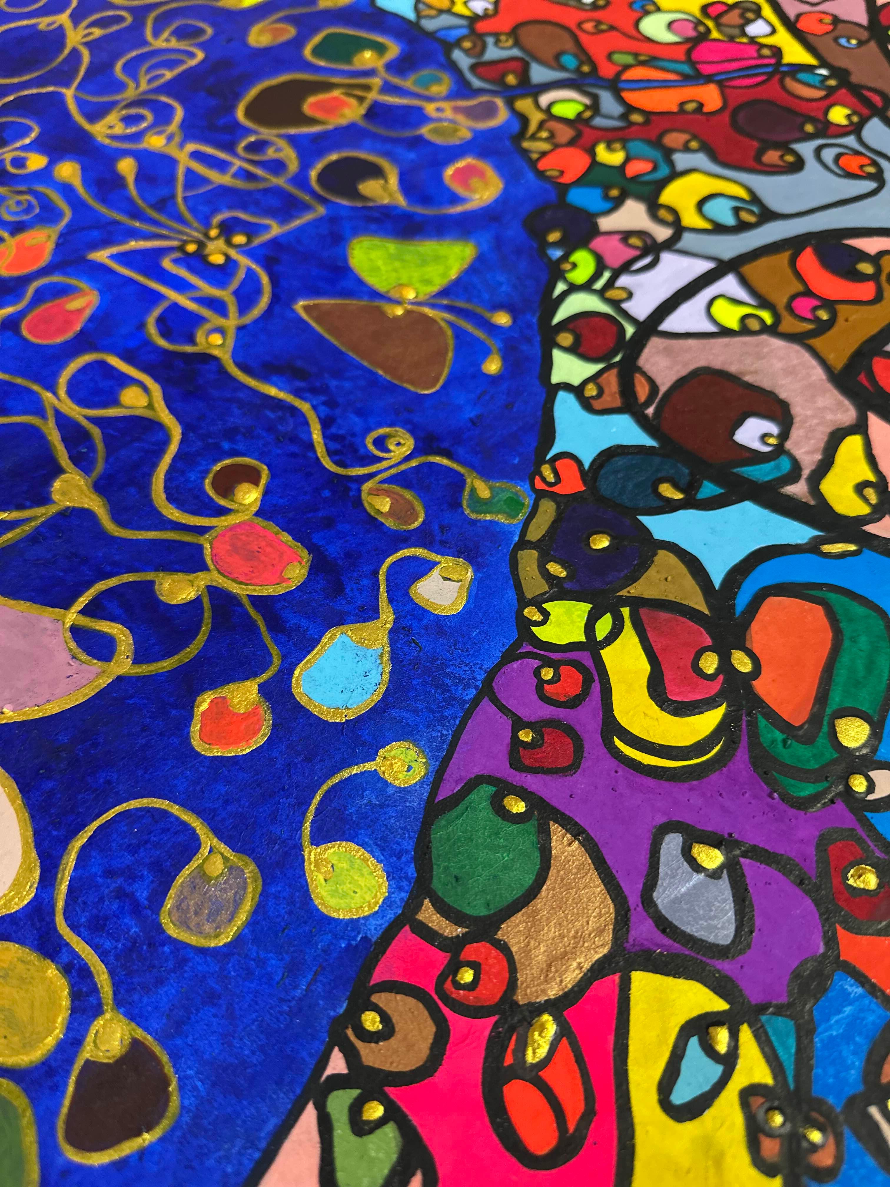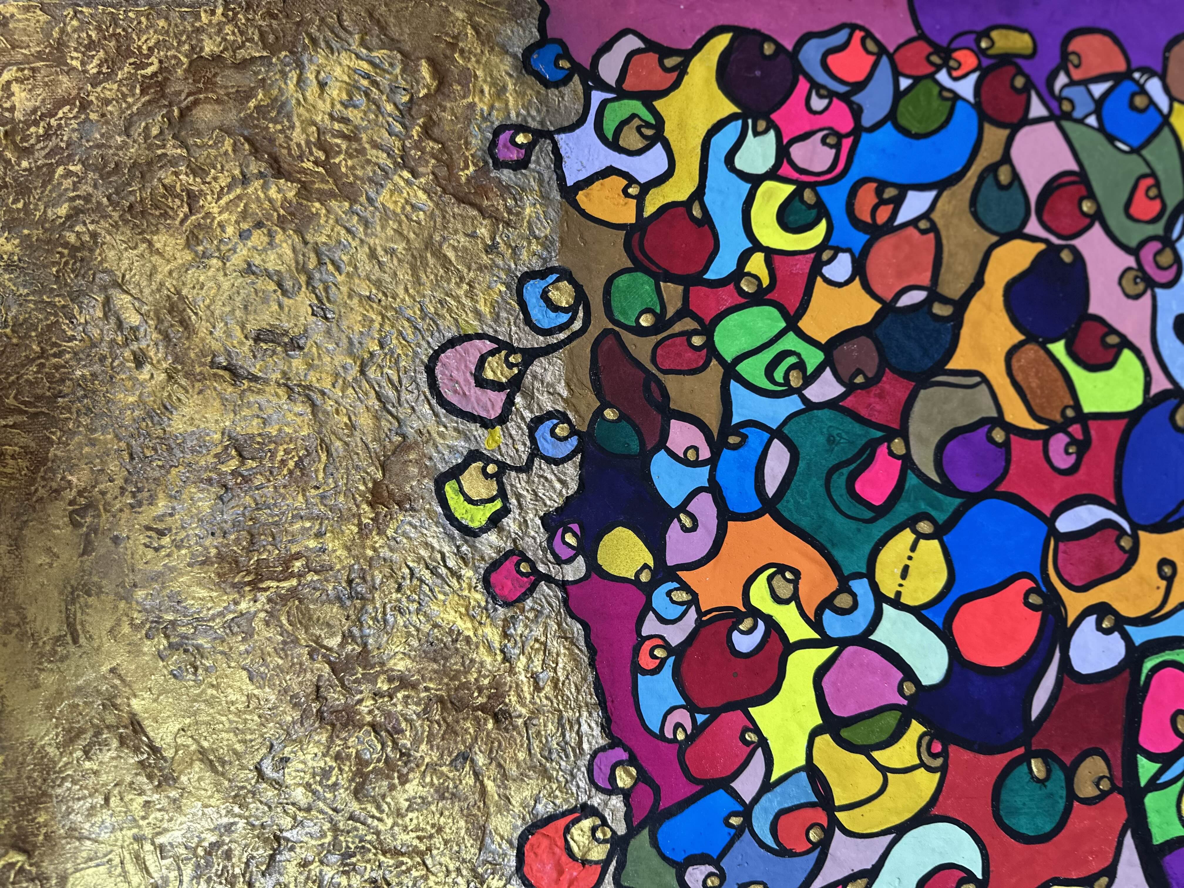 중앙부는 근현대 휴머니즘의 역동적 폭발이다. 먹선으로 구축된 세포적 매트릭스 안에서 개별성이 문명적 동력으로 전환하는 순간을 포착한다. 적신 한지 위에서 전통 석채는 자발적으로 상호작용하며, 난자, 유충, 송충이, 용화에 이르는 변용의 전 스펙트럼을 공존시킨다. 순수한 에센스를 표상하는 황금점들과 이들을 잇는 검은 신경망은 진정한 개별성이 관계 속에서만 실현된다는 존재론적 역설을 드러낸다. 상단의 감청색 번짐은 테크노피아의 유혹적 약속 속에 은밀한 경고를 내장한다. 알고리즘적 중재가 개별성을 표준화하고, 인간성의 황금점들이 공허해지는 종말적 전망이다. 당신의 의식은 어느 지층에 정박해 있는가. 그 심연의 에센스는 아직 변용의 날개를 품고 있는가.