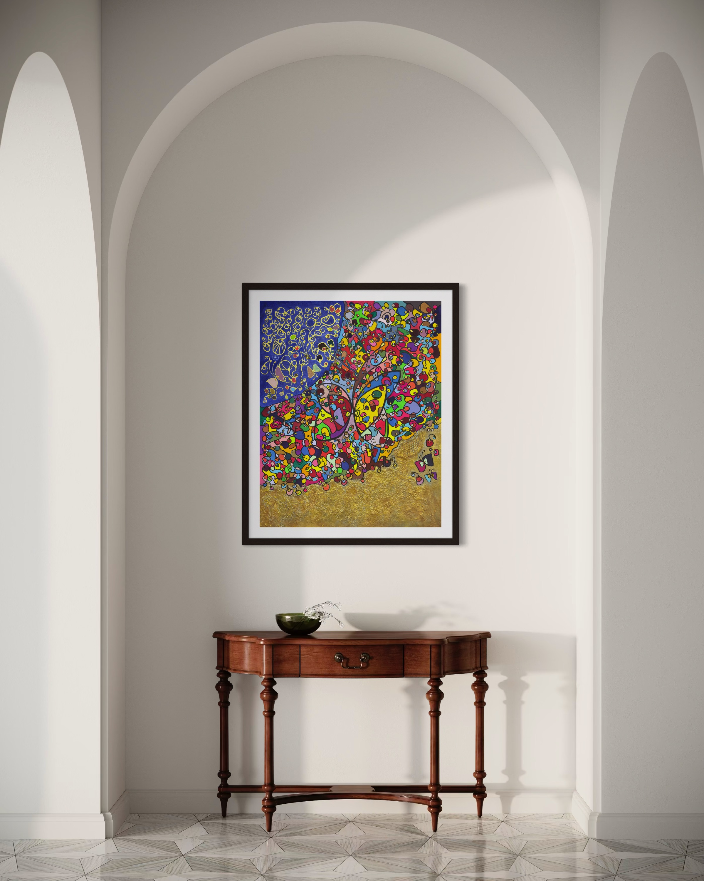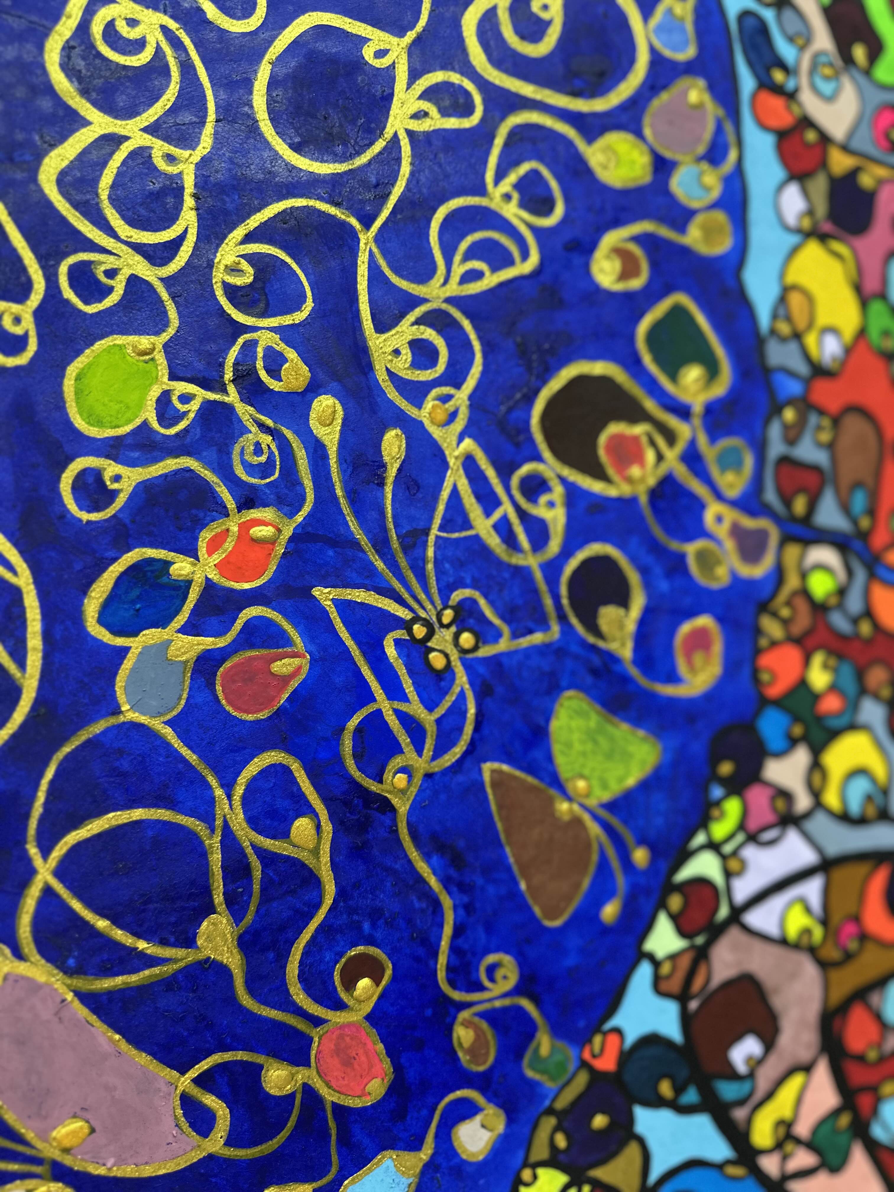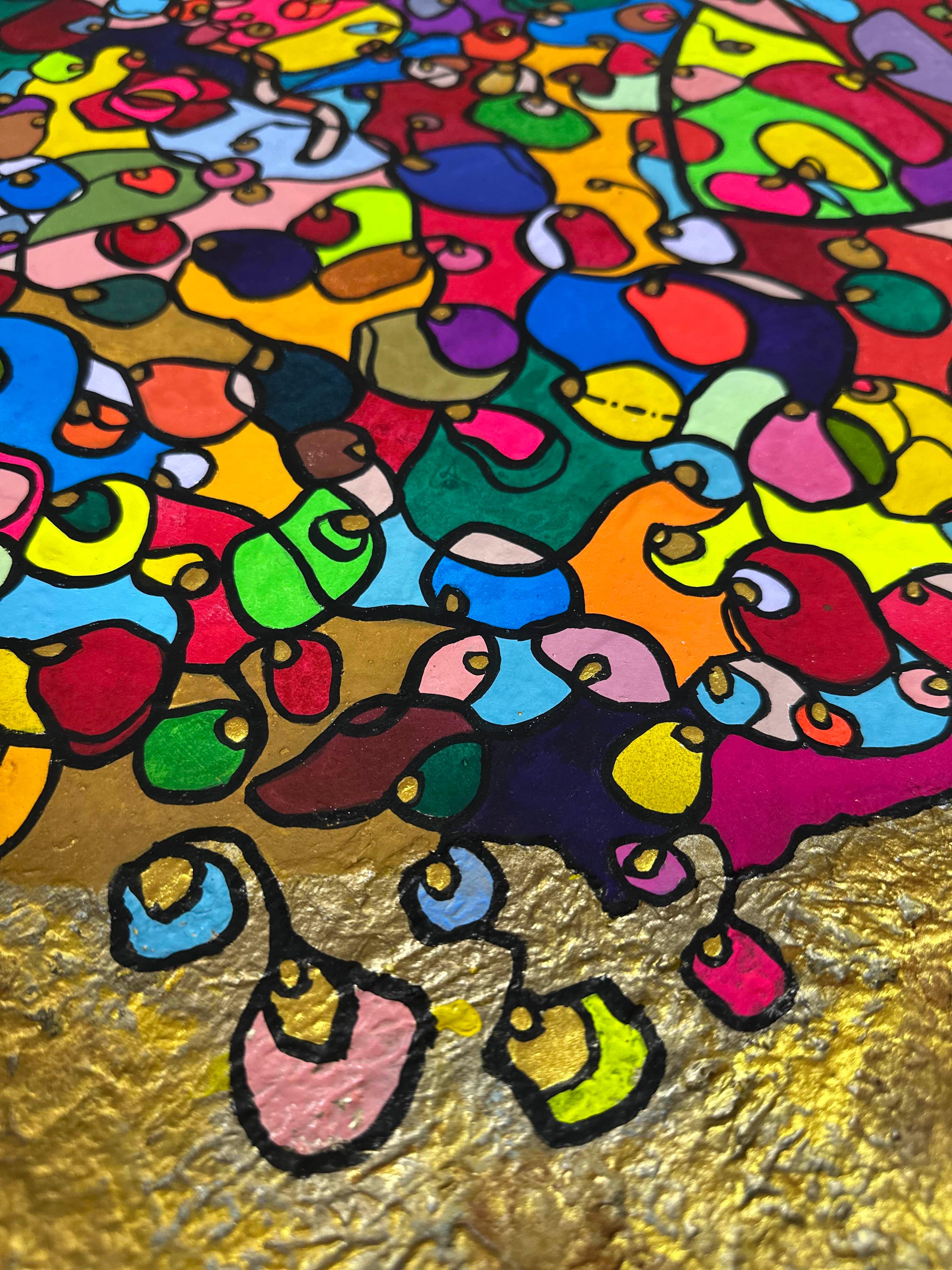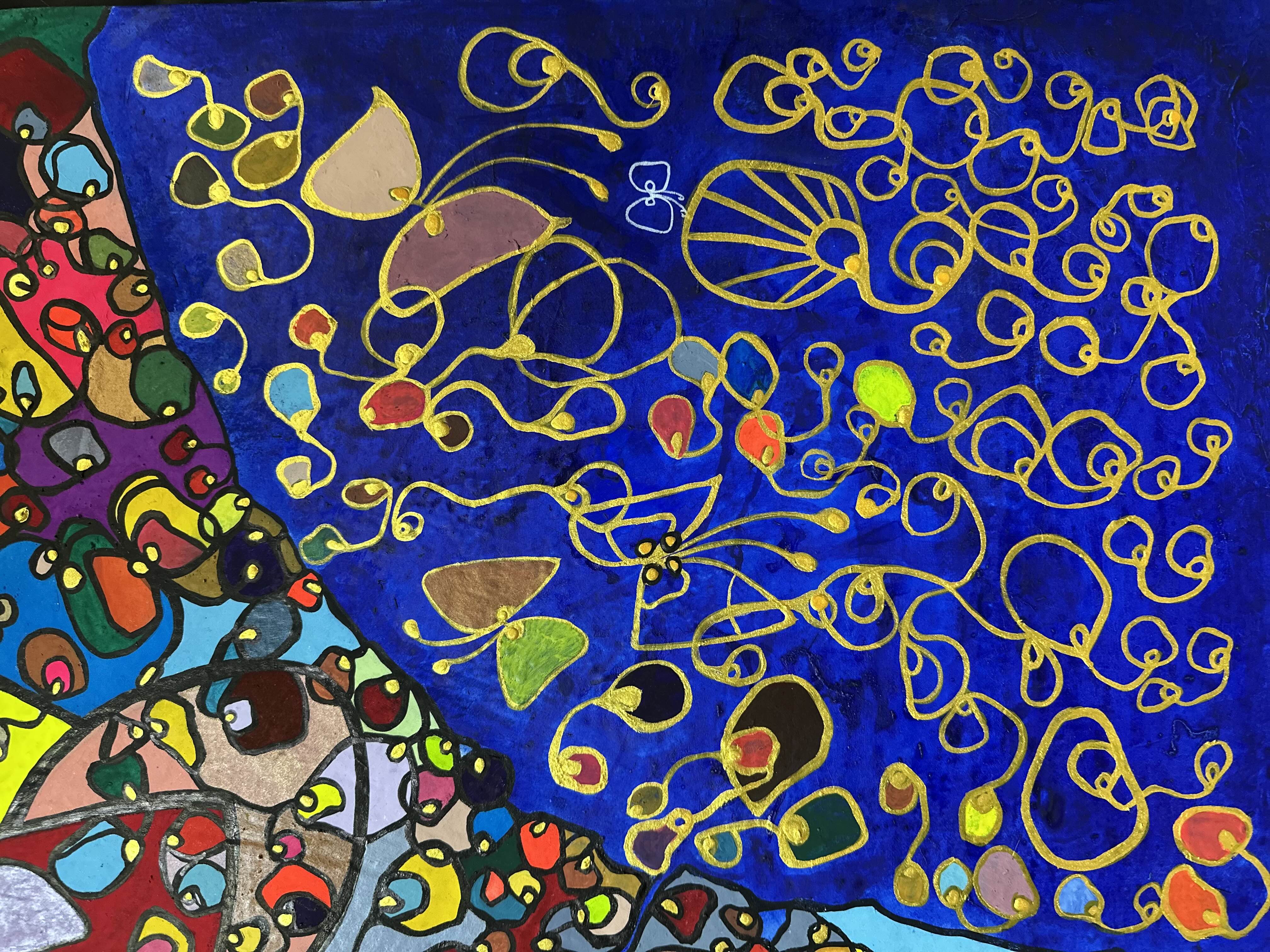 중앙부는 근현대 휴머니즘의 역동적 폭발이다. 먹선으로 구축된 세포적 매트릭스 안에서 개별성이 문명적 동력으로 전환하는 순간을 포착한다. 적신 한지 위에서 전통 석채는 자발적으로 상호작용하며, 난자, 유충, 송충이, 용화에 이르는 변용의 전 스펙트럼을 공존시킨다. 순수한 에센스를 표상하는 황금점들과 이들을 잇는 검은 신경망은 진정한 개별성이 관계 속에서만 실현된다는 존재론적 역설을 드러낸다. 상단의 감청색 번짐은 테크노피아의 유혹적 약속 속에 은밀한 경고를 내장한다. 알고리즘적 중재가 개별성을 표준화하고, 인간성의 황금점들이 공허해지는 종말적 전망이다. 당신의 의식은 어느 지층에 정박해 있는가. 그 심연의 에센스는 아직 변용의 날개를 품고 있는가.