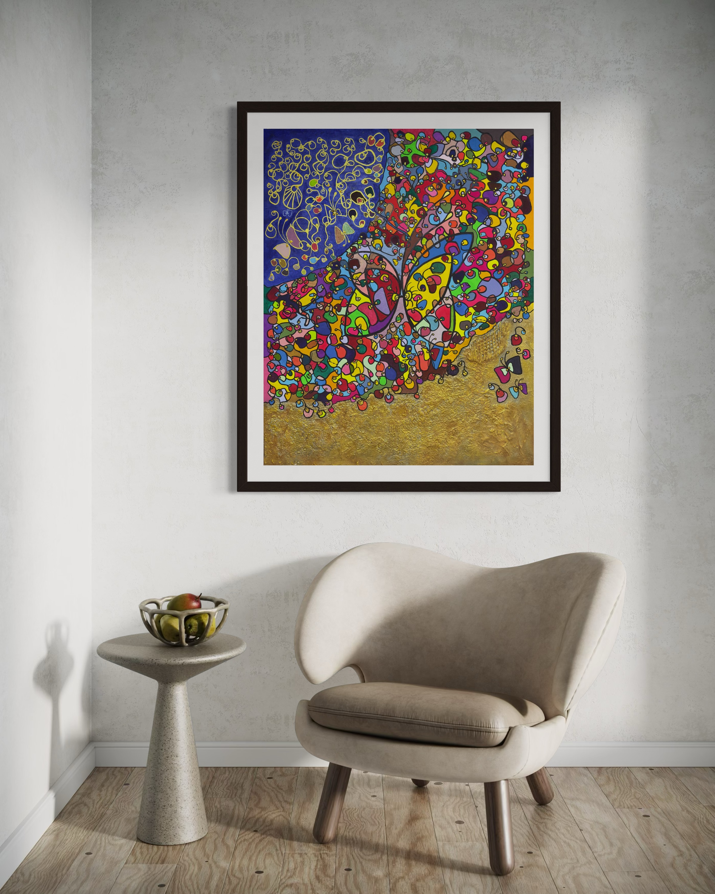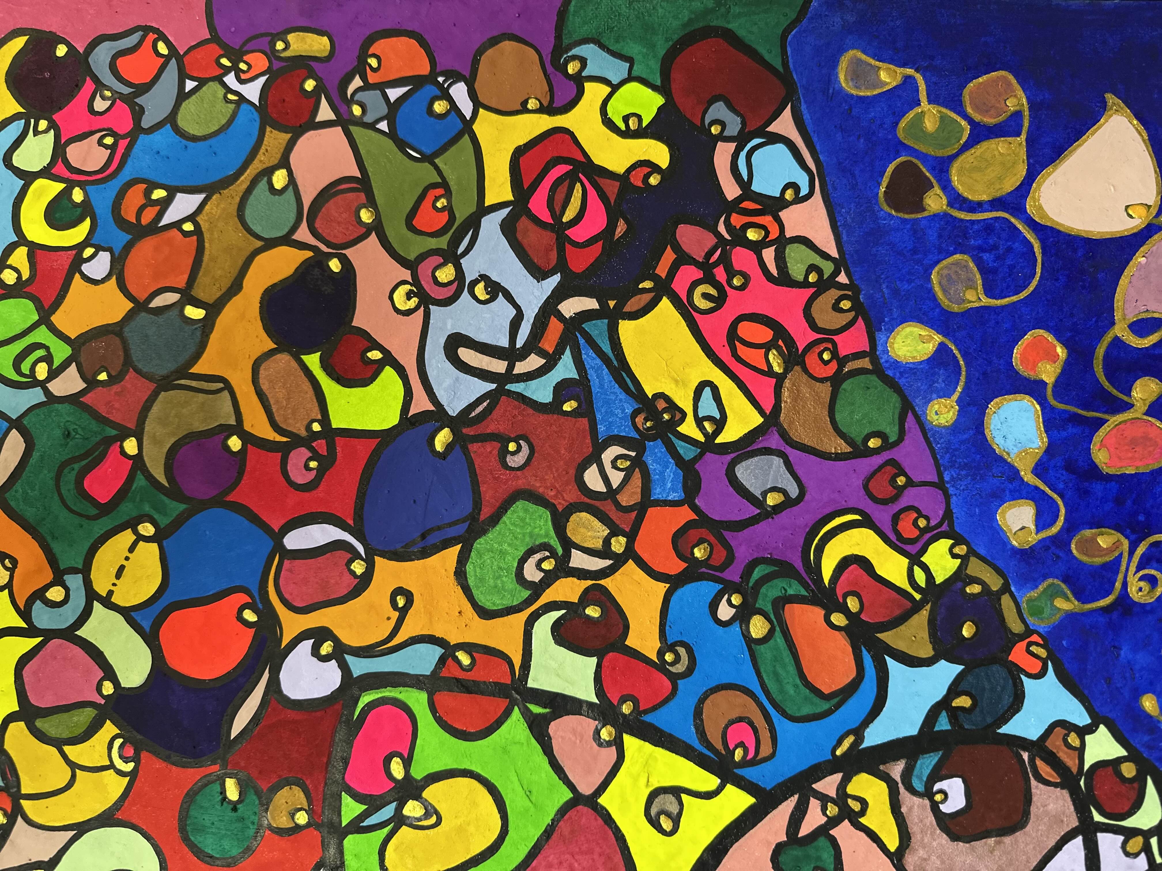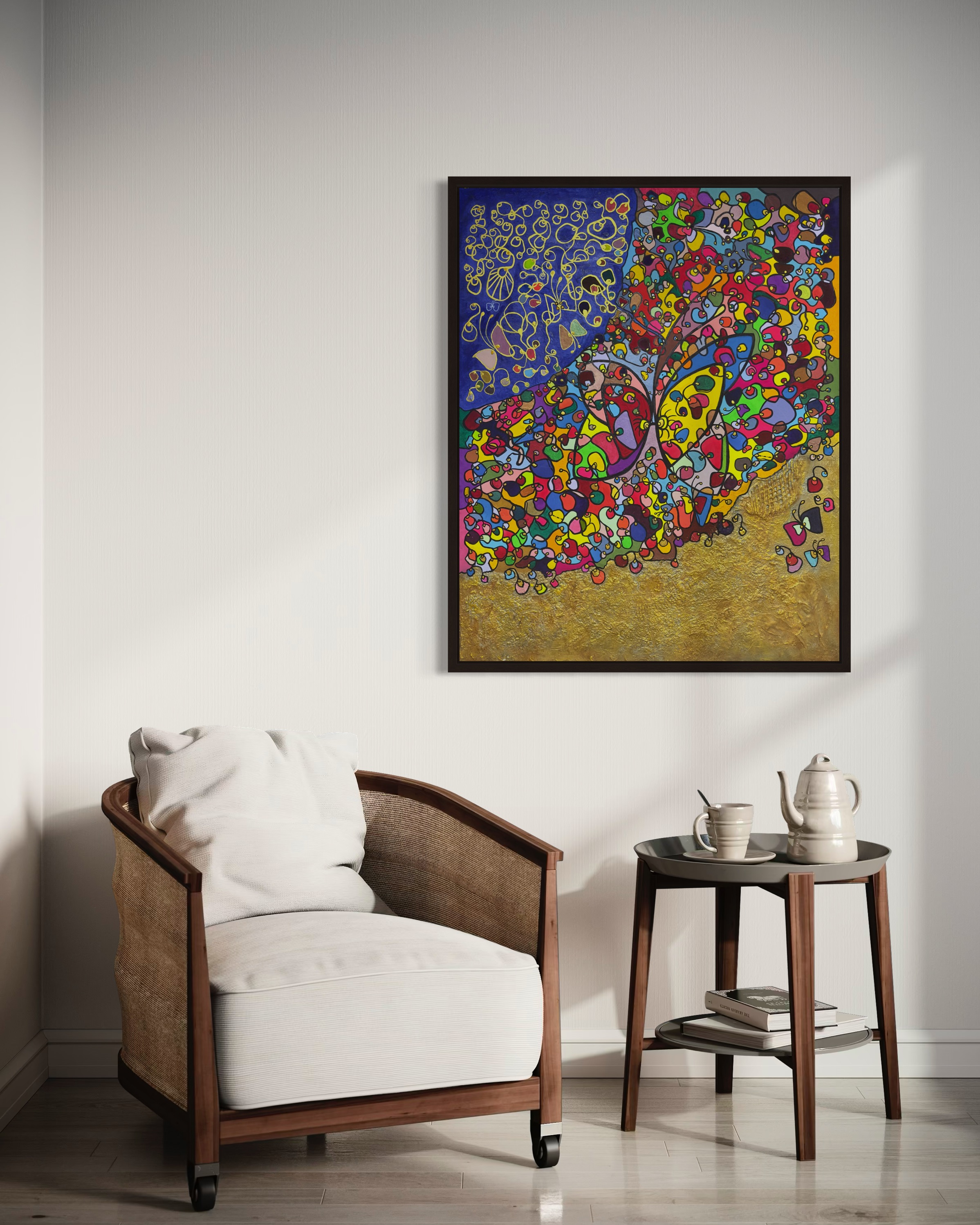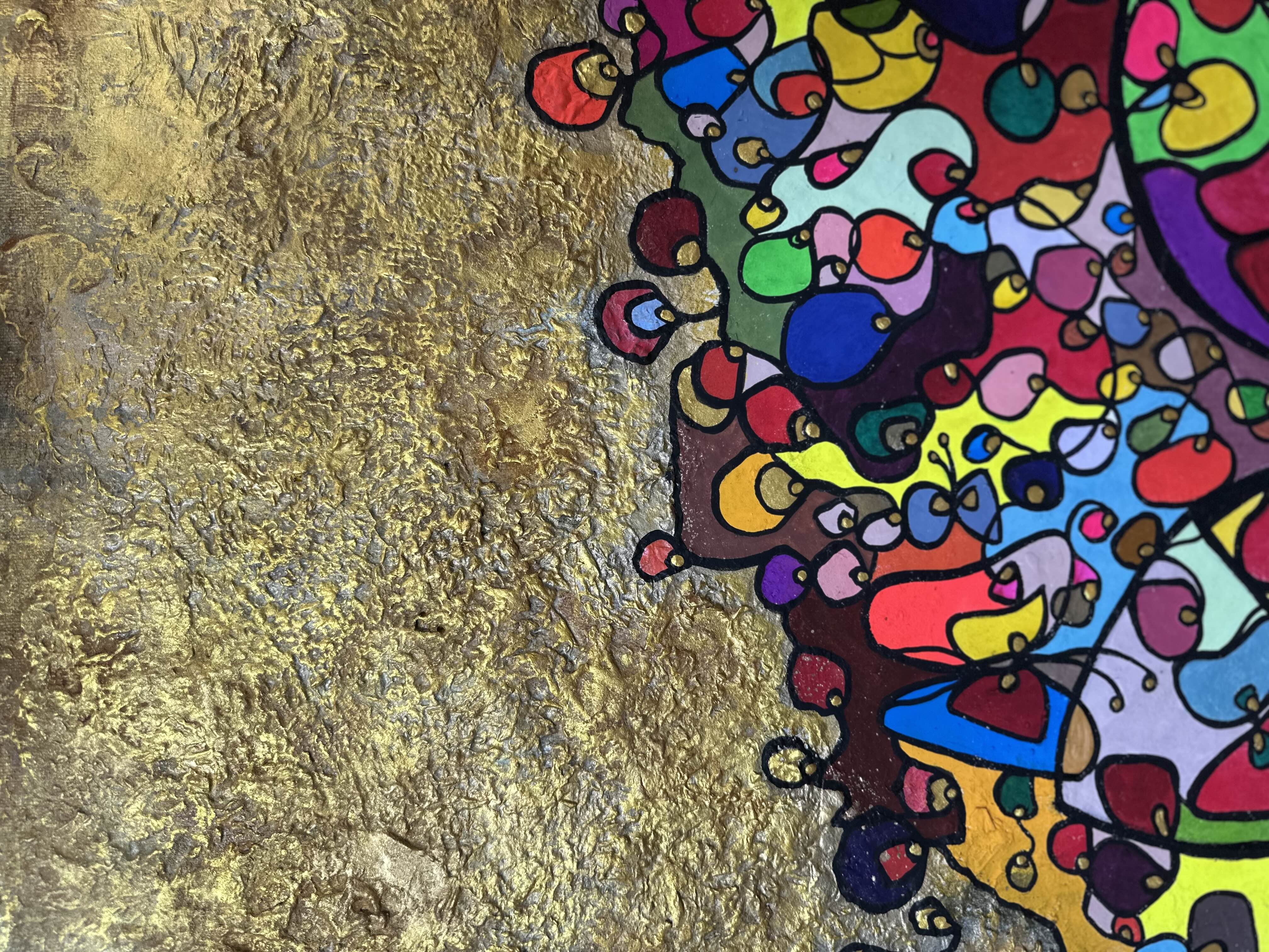 이 영역의 회화적 실현에서는 기법과 사유가 하나로 수렴한다. 충분히 적신 한지 위에 전통 석채를 떨어뜨리면 물성들이 자발적으로 상호작용을 일으킨다. 이렇게 생성된 예측 불가능한 색채의 변주들은 의식의 자연발생적 출현과 형이상학적 상응을 이룬다. 각 세포는 잠재하는 난자에서 각성하는 유충, 탐식하는 송충이를 거쳐 침묵하는 용화에 이르기까지, **변용(變容)**의 전 스펙트럼을 내포한다. 핵심은 개별적 에센스를 표상하는 황금점들이다. 이는 외적 조건과 무관하게 지속하는 순수한 동기의 결정체다. 그러나 이들은 고립된 모나드가 아니다. 작품은 이 황금점들이 검은 신경망을 통해 공명하며, 진정한 개별성이란 관계적 맥락 속에서만 온전히 실현된다는 존재론적 역설을 시각화한다.