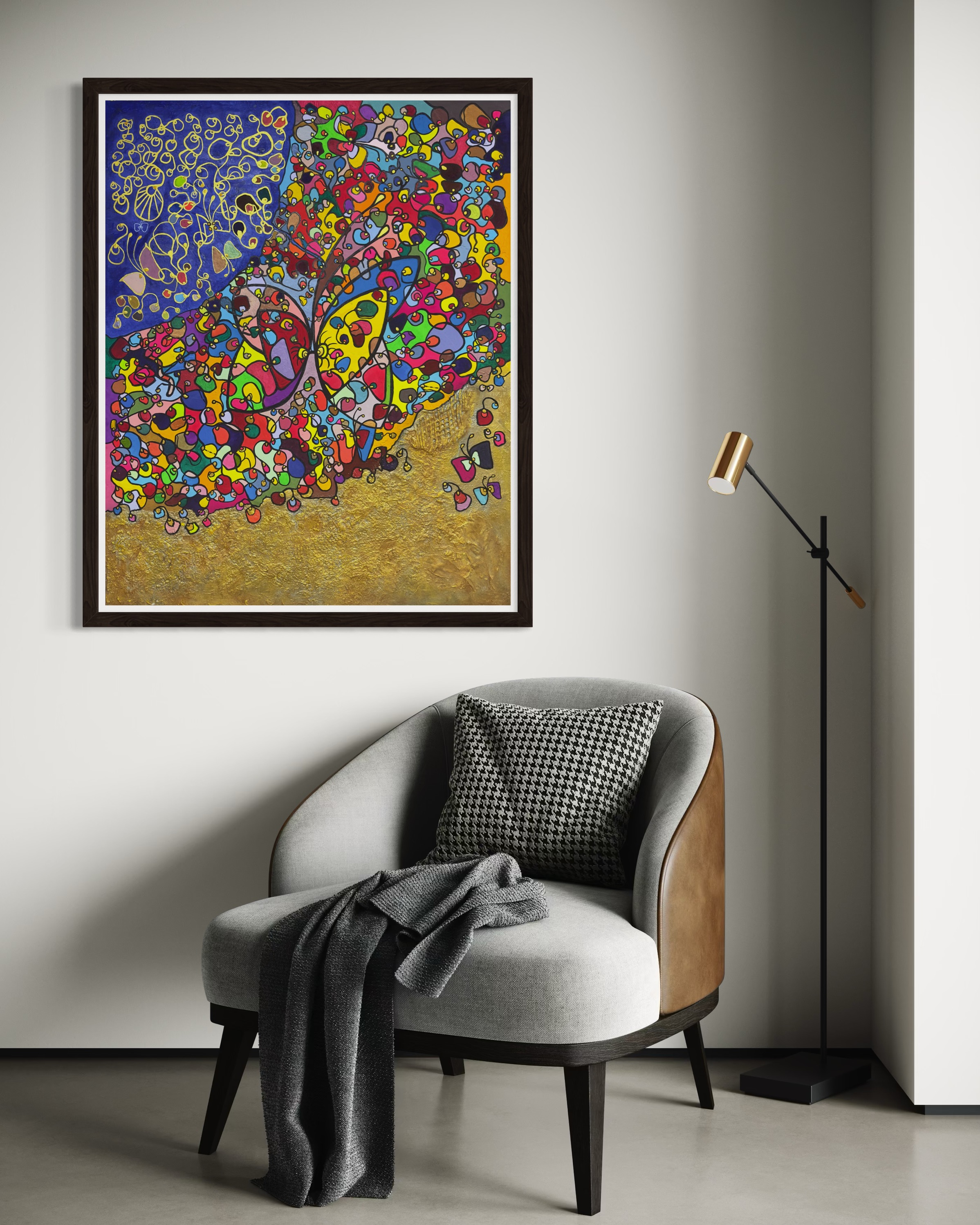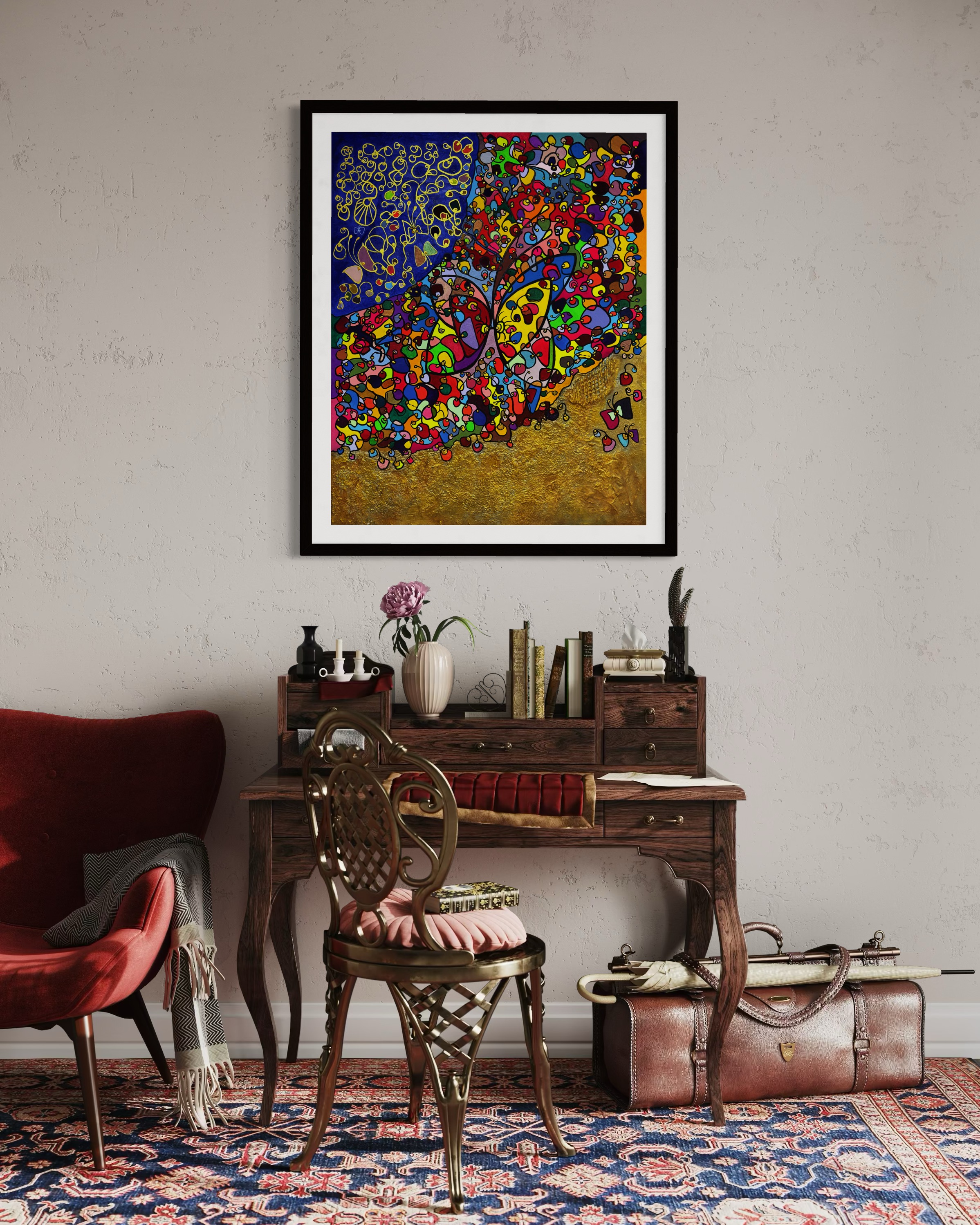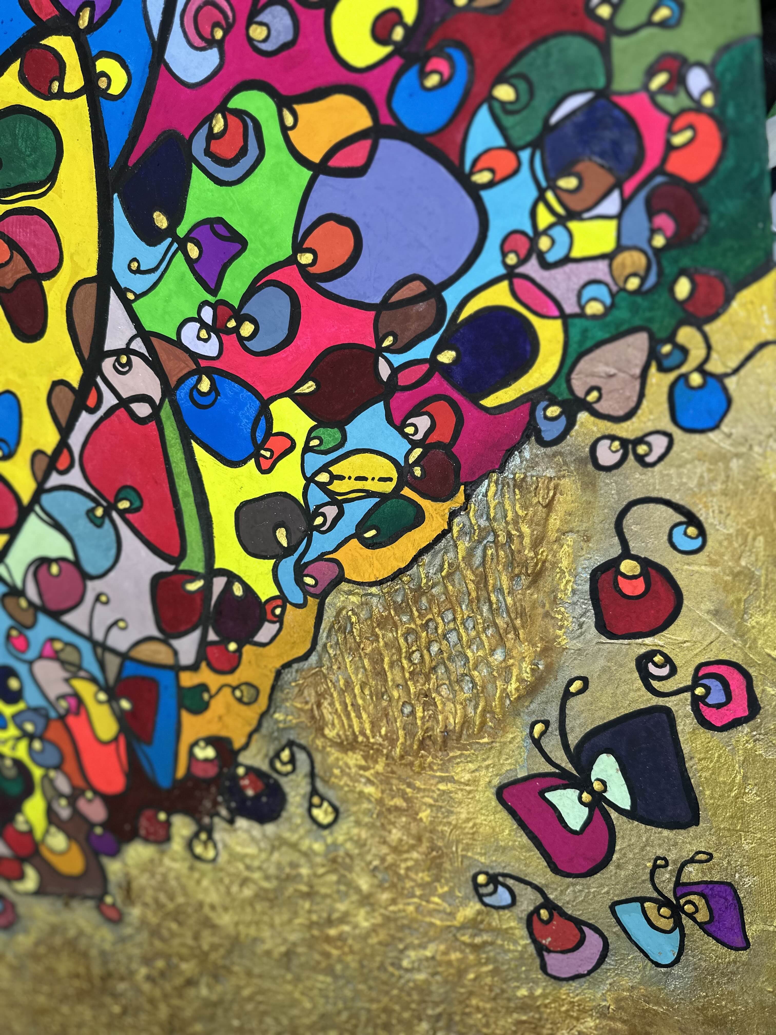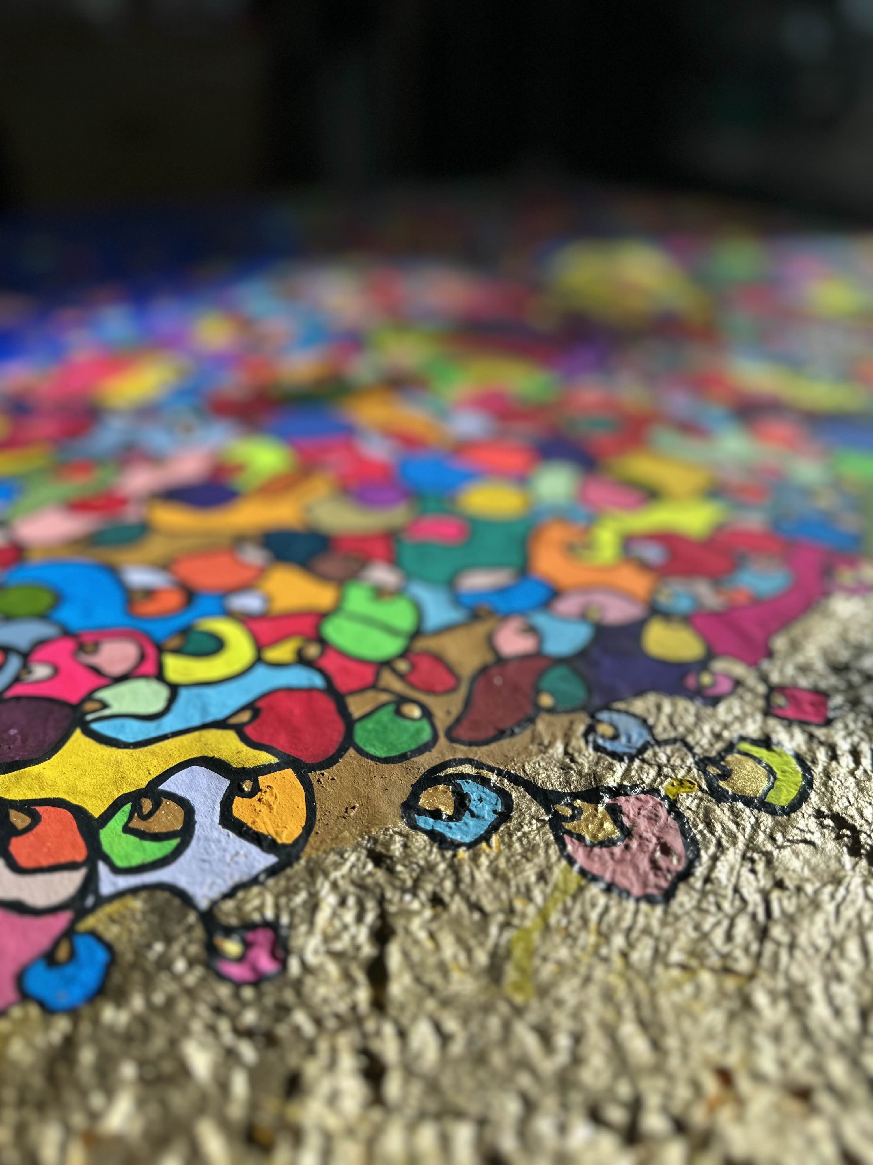 이 영역의 회화적 실현에서는 기법과 사유가 하나로 수렴한다. 충분히 적신 한지 위에 전통 석채를 떨어뜨리면 물성들이 자발적으로 상호작용을 일으킨다. 이렇게 생성된 예측 불가능한 색채의 변주들은 의식의 자연발생적 출현과 형이상학적 상응을 이룬다. 각 세포는 잠재하는 난자에서 각성하는 유충, 탐식하는 송충이를 거쳐 침묵하는 용화에 이르기까지, **변용(變容)**의 전 스펙트럼을 내포한다. 핵심은 개별적 에센스를 표상하는 황금점들이다. 이는 외적 조건과 무관하게 지속하는 순수한 동기의 결정체다. 그러나 이들은 고립된 모나드가 아니다. 작품은 이 황금점들이 검은 신경망을 통해 공명하며, 진정한 개별성이란 관계적 맥락 속에서만 온전히 실현된다는 존재론적 역설을 시각화한다.