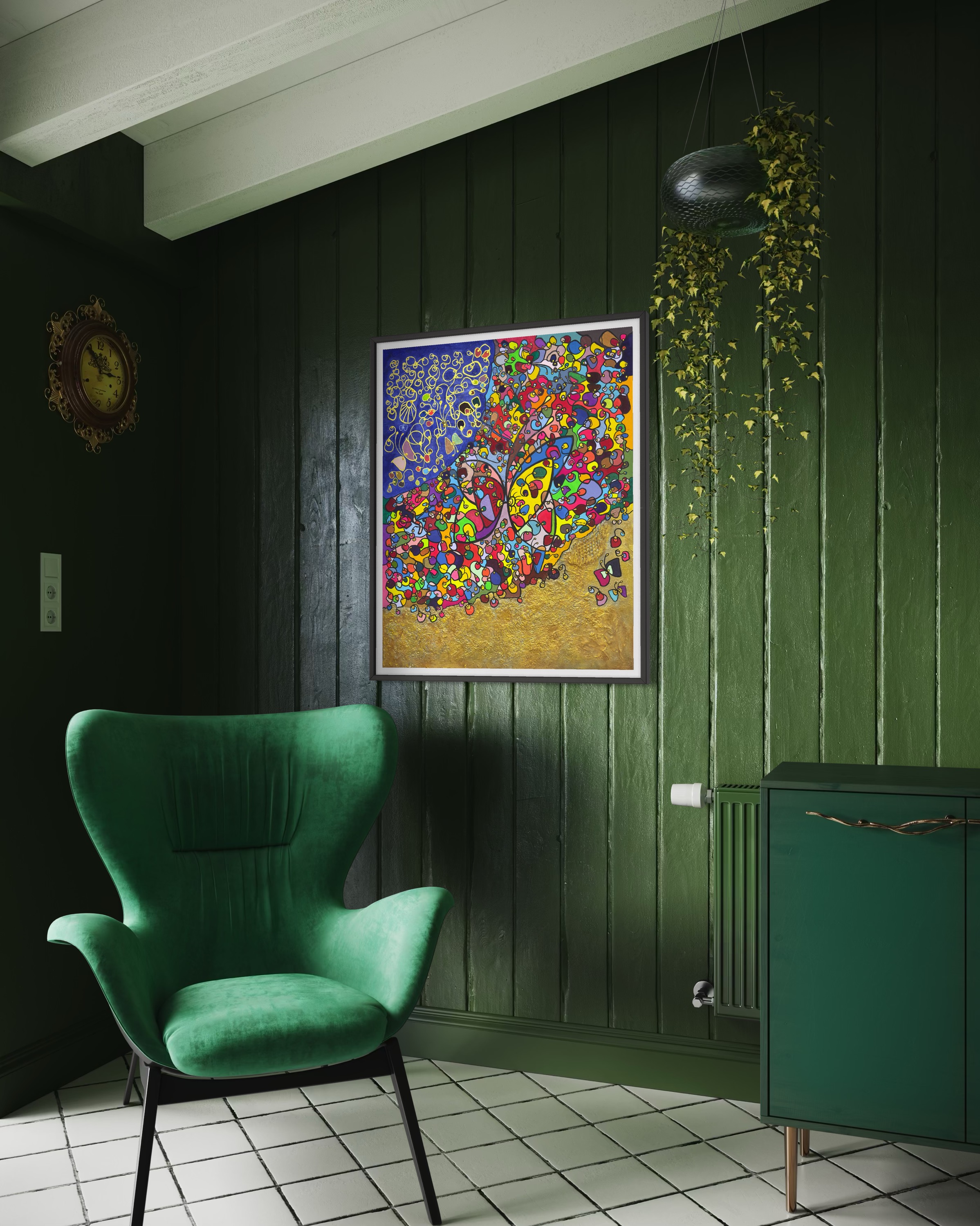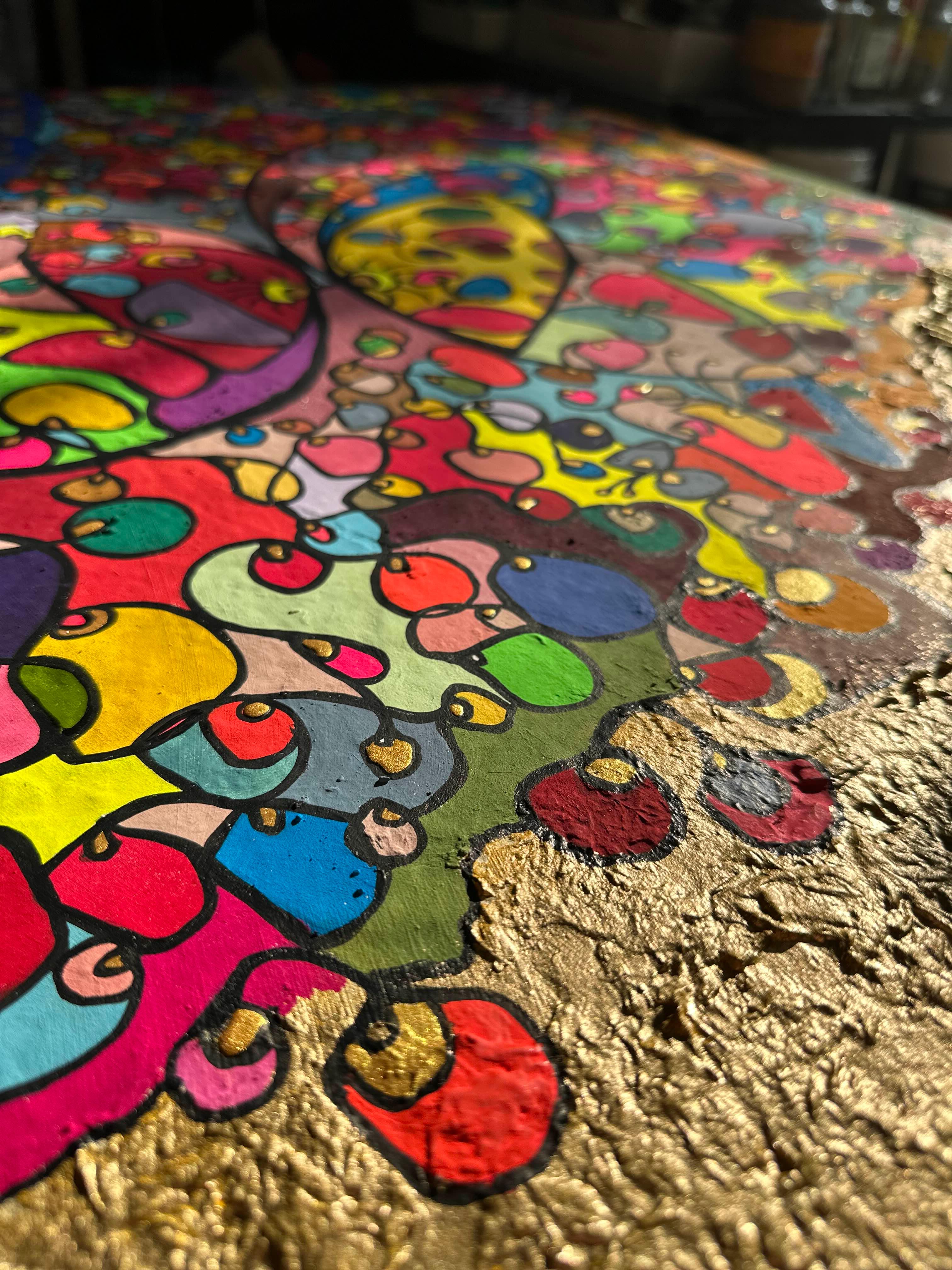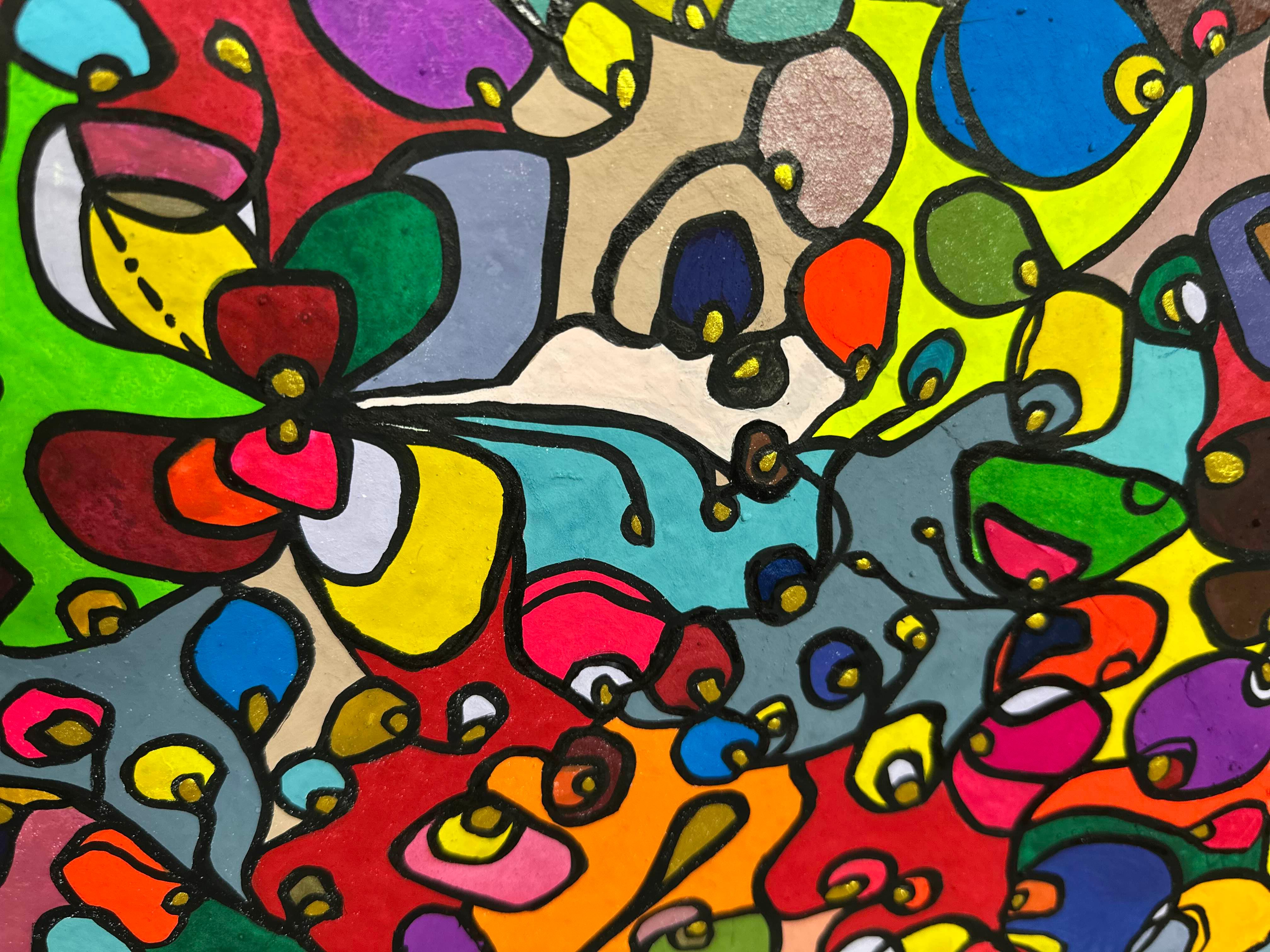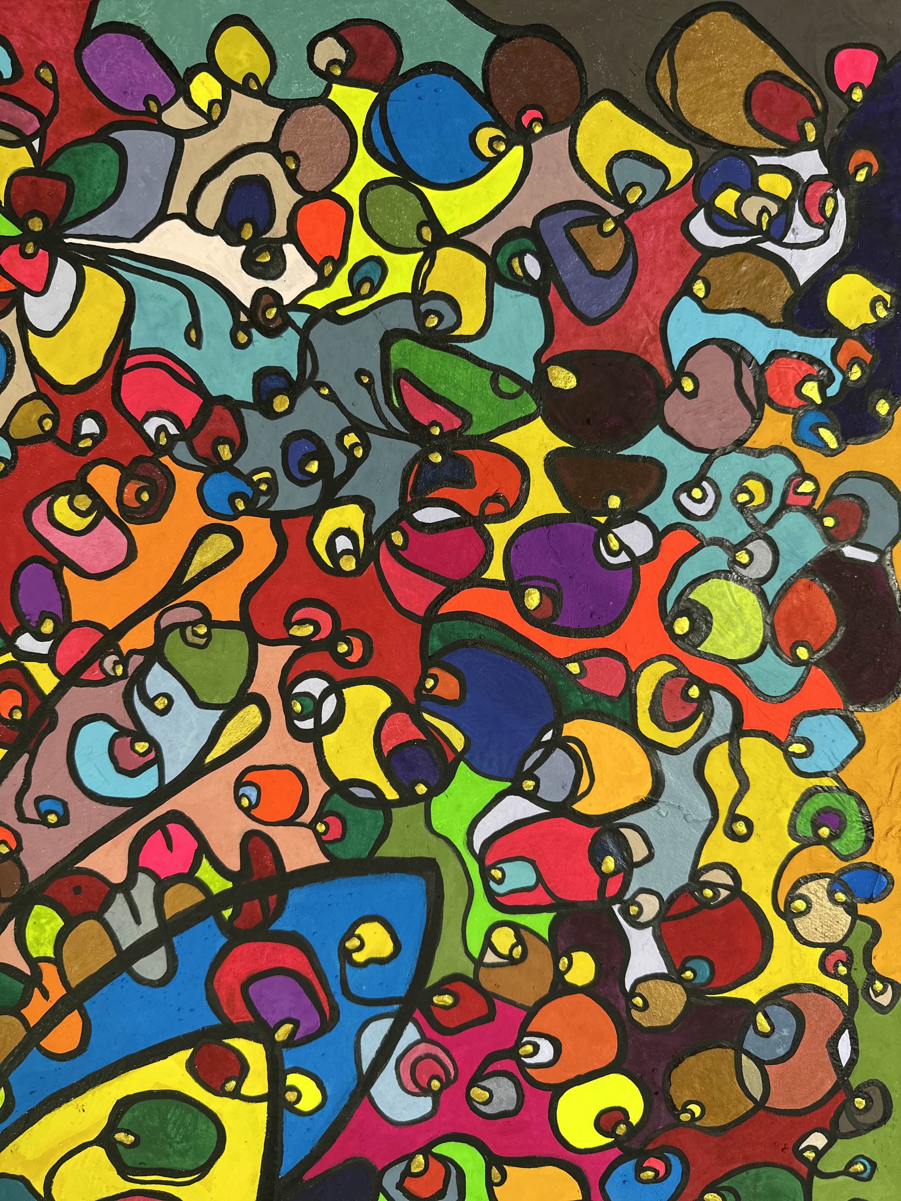 이 영역의 회화적 실현에서는 기법과 사유가 하나로 수렴한다. 충분히 적신 한지 위에 전통 석채를 떨어뜨리면 물성들이 자발적으로 상호작용을 일으킨다. 이렇게 생성된 예측 불가능한 색채의 변주들은 의식의 자연발생적 출현과 형이상학적 상응을 이룬다. 각 세포는 잠재하는 난자에서 각성하는 유충, 탐식하는 송충이를 거쳐 침묵하는 용화에 이르기까지, **변용(變容)**의 전 스펙트럼을 내포한다. 핵심은 개별적 에센스를 표상하는 황금점들이다. 이는 외적 조건과 무관하게 지속하는 순수한 동기의 결정체다. 그러나 이들은 고립된 모나드가 아니다. 작품은 이 황금점들이 검은 신경망을 통해 공명하며, 진정한 개별성이란 관계적 맥락 속에서만 온전히 실현된다는 존재론적 역설을 시각화한다.