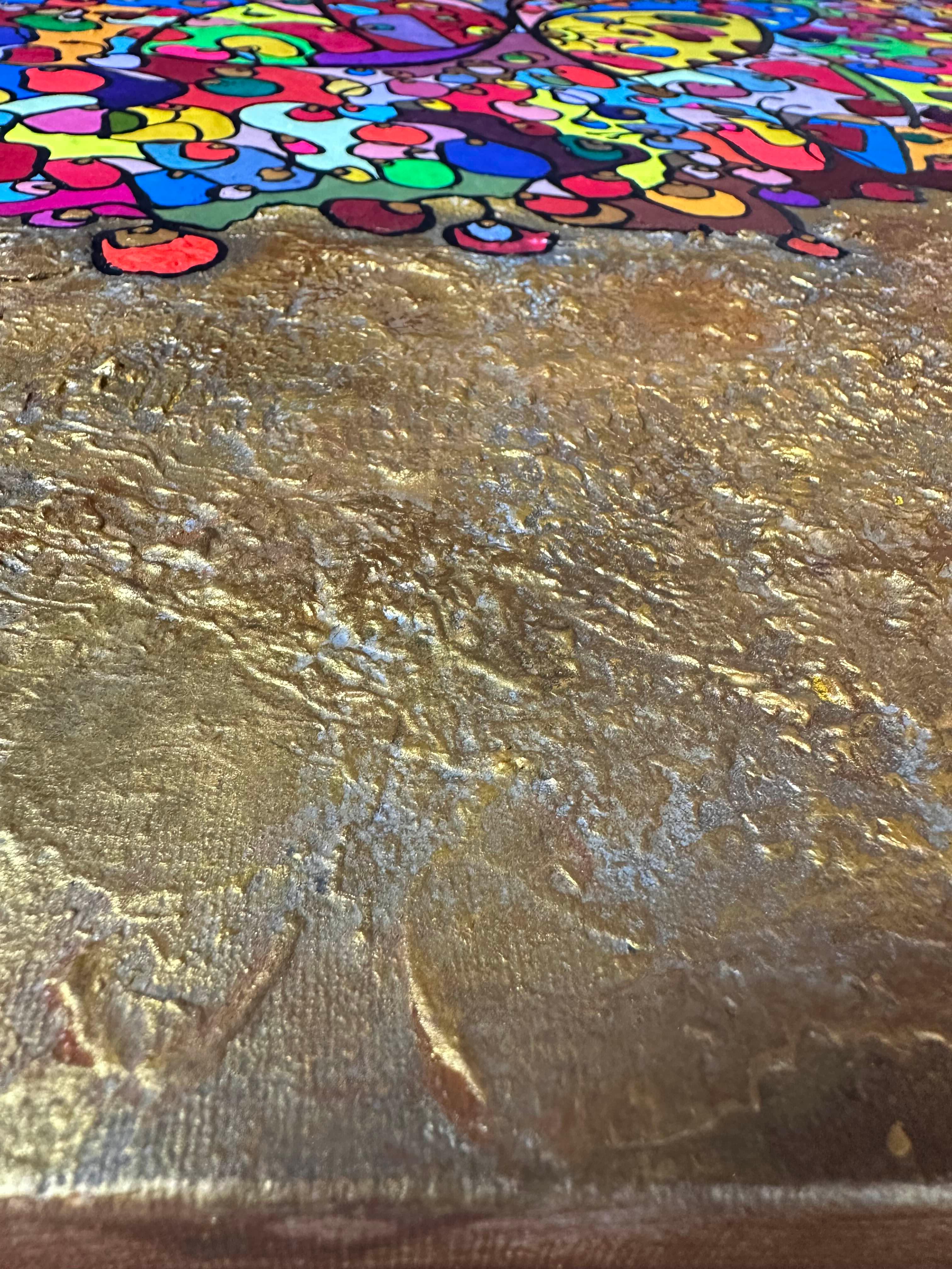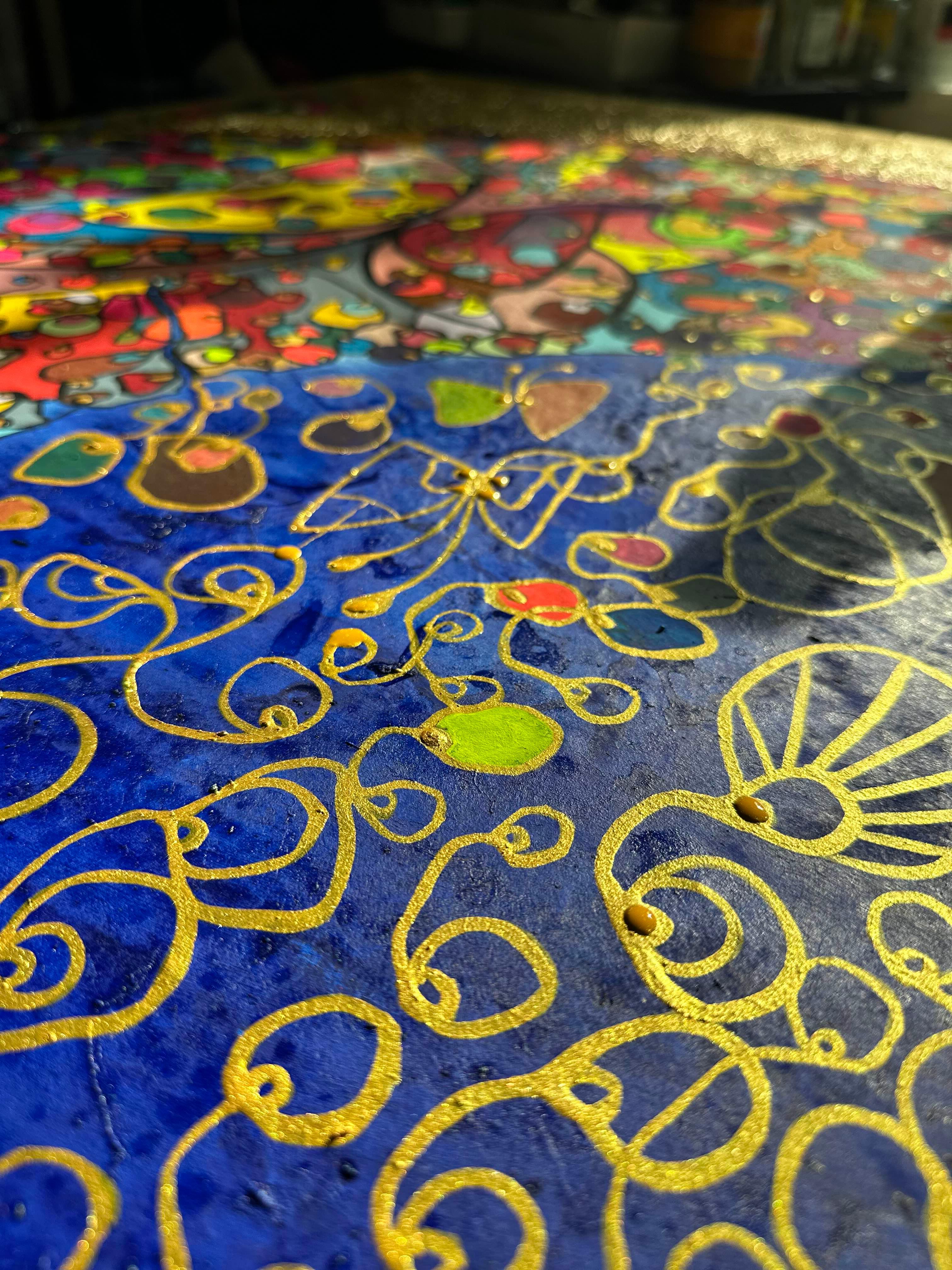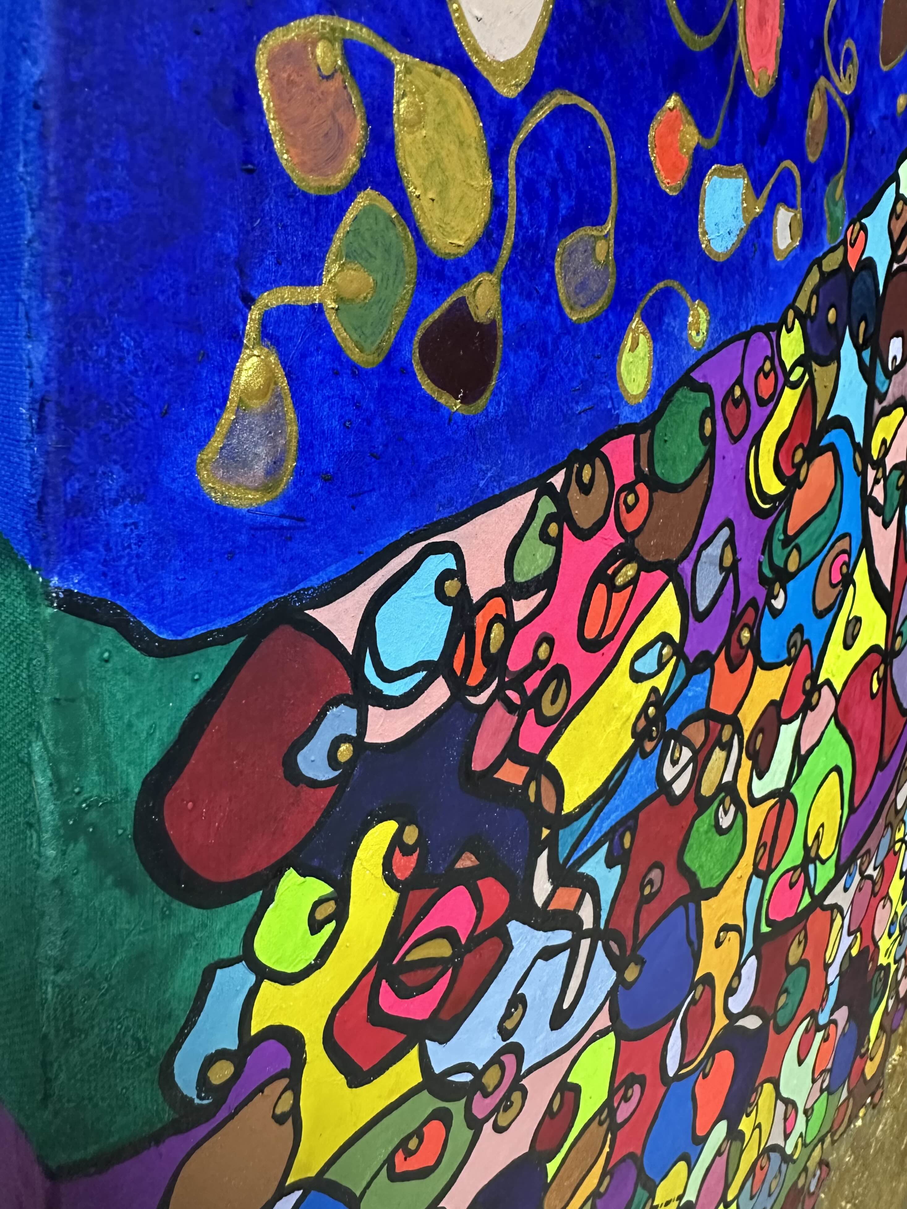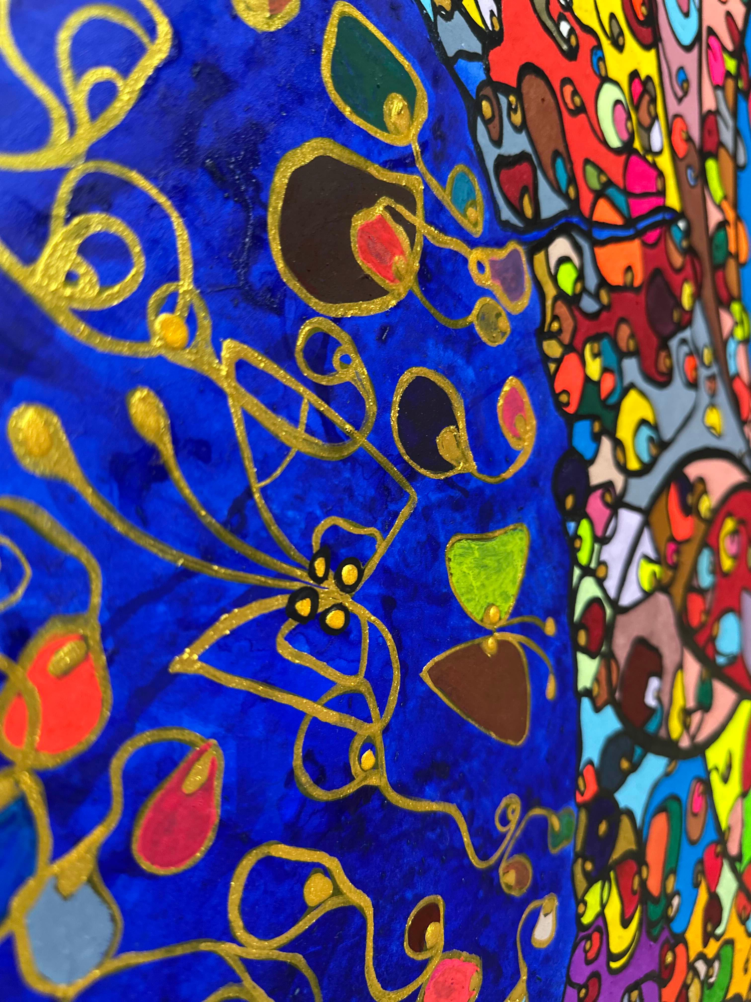 At its core are the golden points, representing the pure essence of individuality—crystallizations of motive persisting beyond external conditions. Yet, they are not isolated monads. Resonating through a black neural network, they visualize the existential paradox that true individuality is fully realized only within a relational context. As the composition ascends, the canvas shifts to a different temporal register. The luminous diffusion of cobalt powder and glue evokes the seductive promises of technopia, yet harbors a subtle warning: the risk of algorithmic mediation standardizing even individual expression, and the potential for digital efficiency to hollow out the humanistic essence. Here, golden lines no longer signify human achievement but mechanical optimization, while the golden points—core to humanity—stand empty, their spectrum of individuality converging into monochrome.