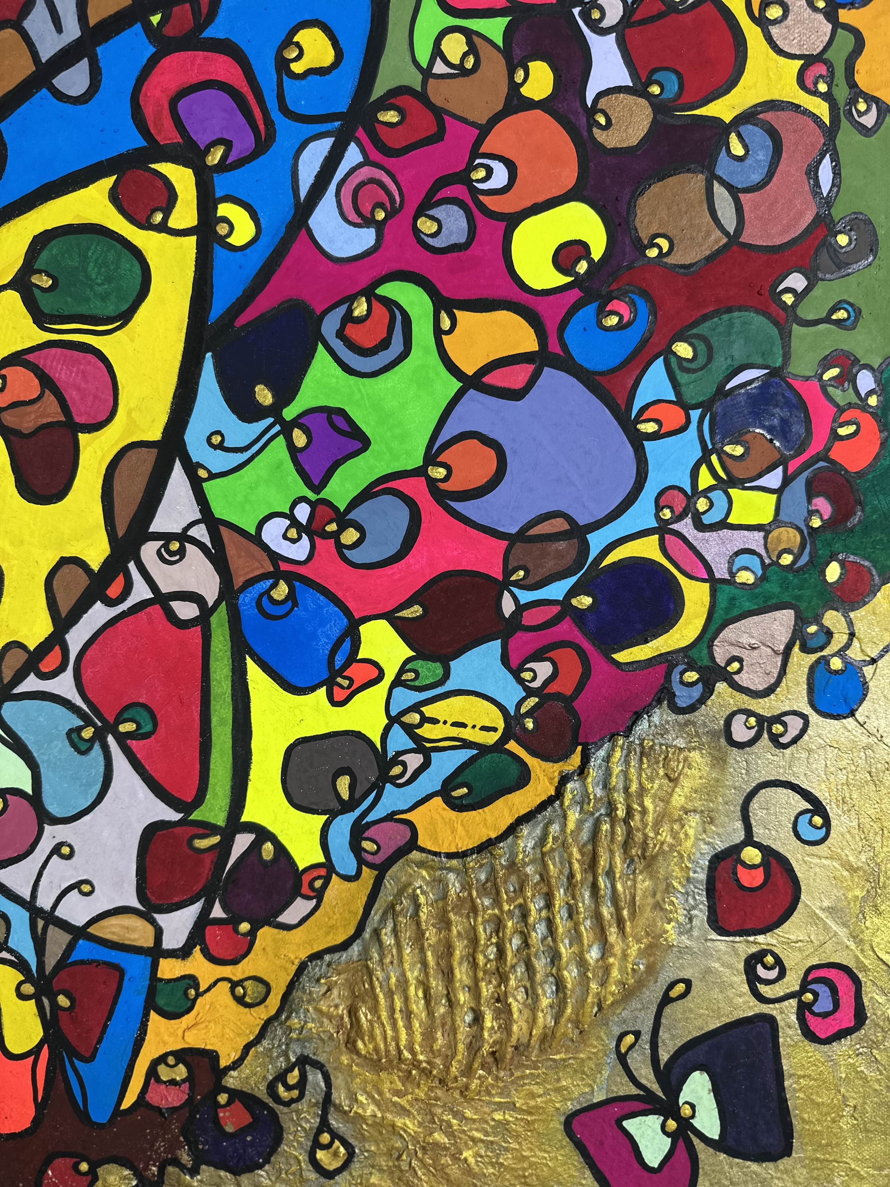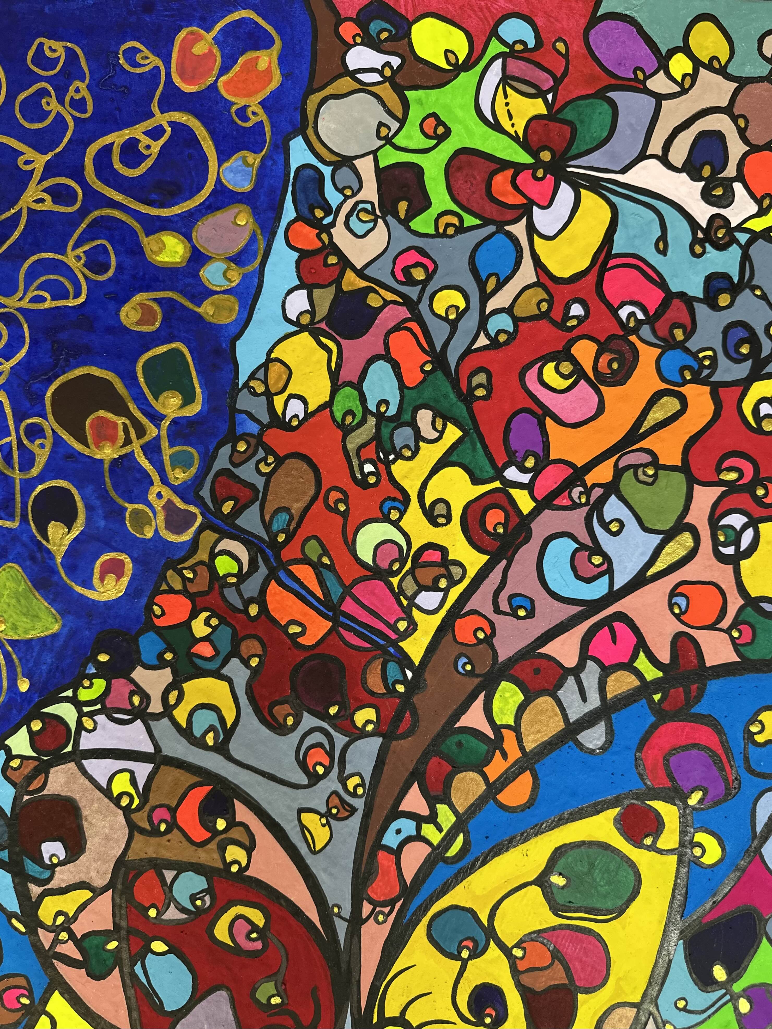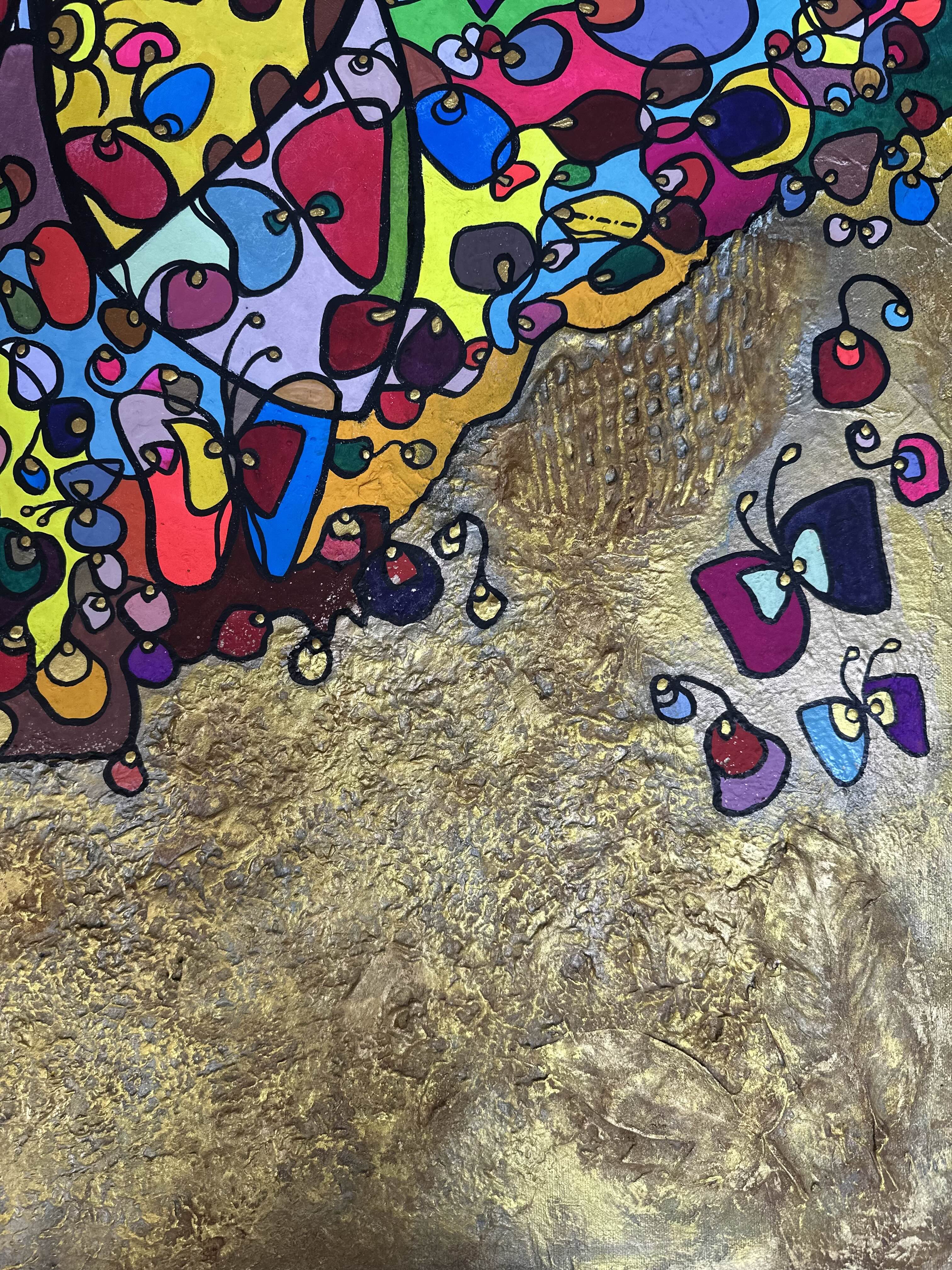 Medium: Mixed Media on Hanji Canvas—Oriental pigments, natural leaves, Styrofoam packaging, wet torn Korean paper with modeling paste