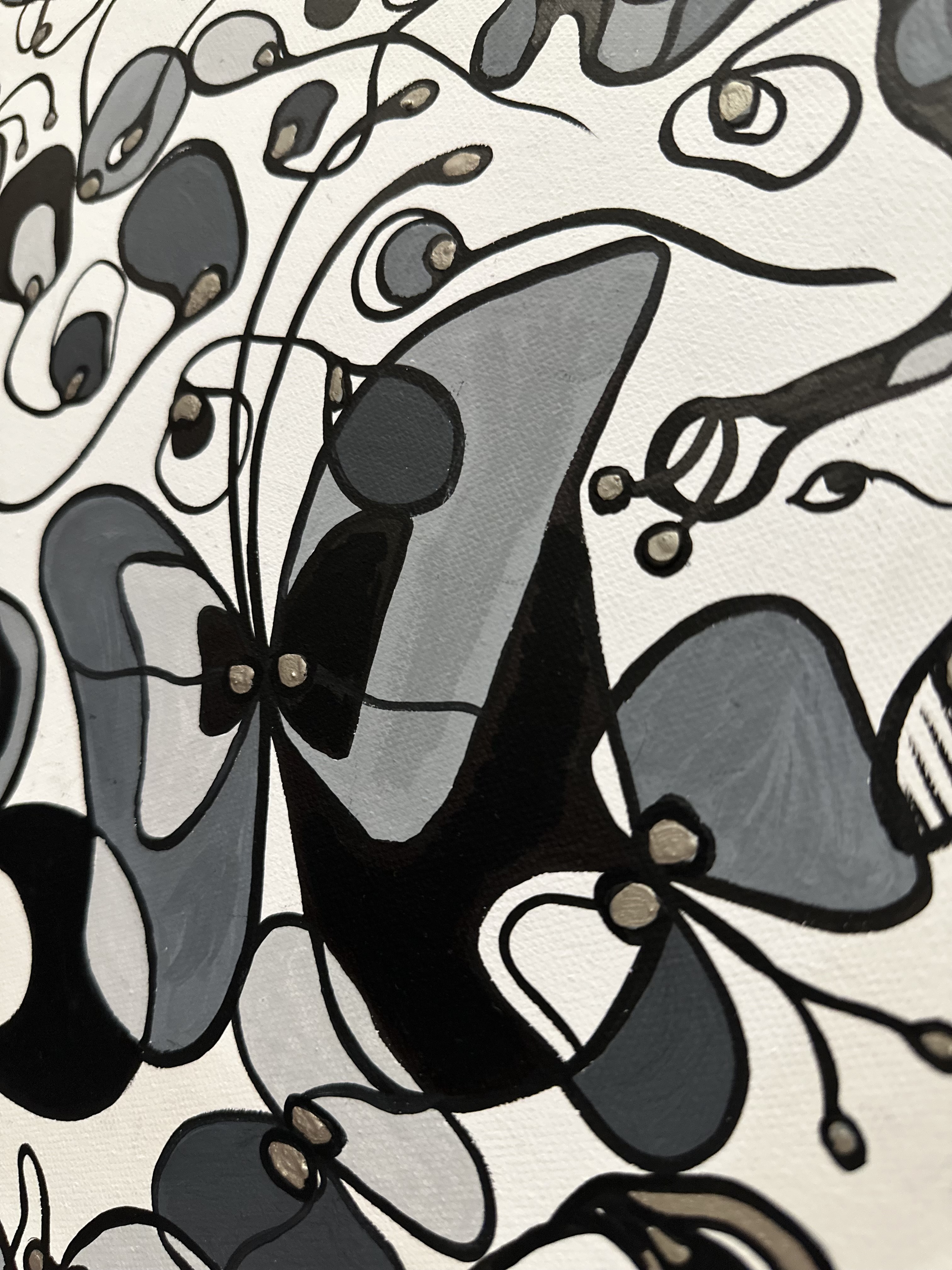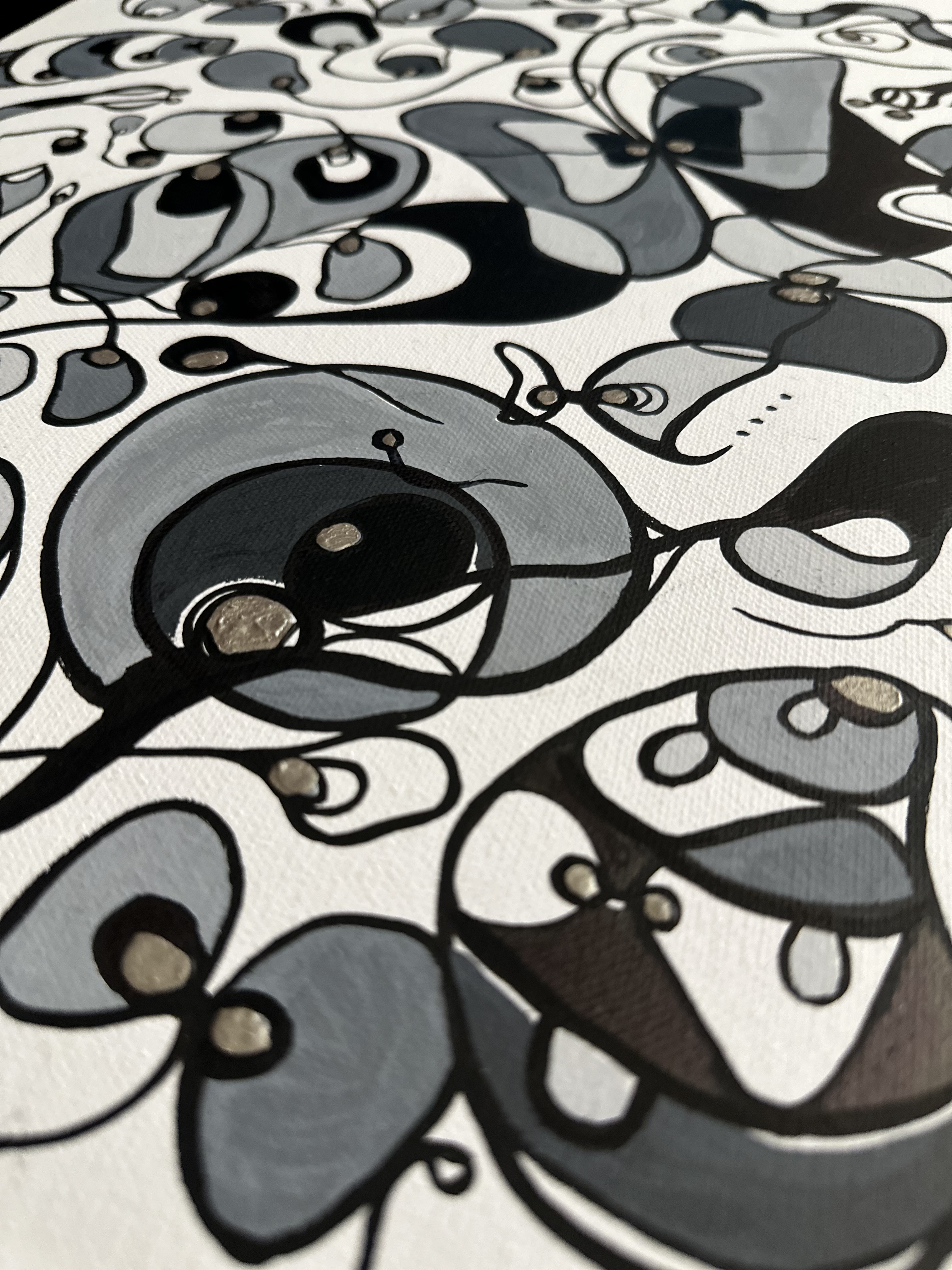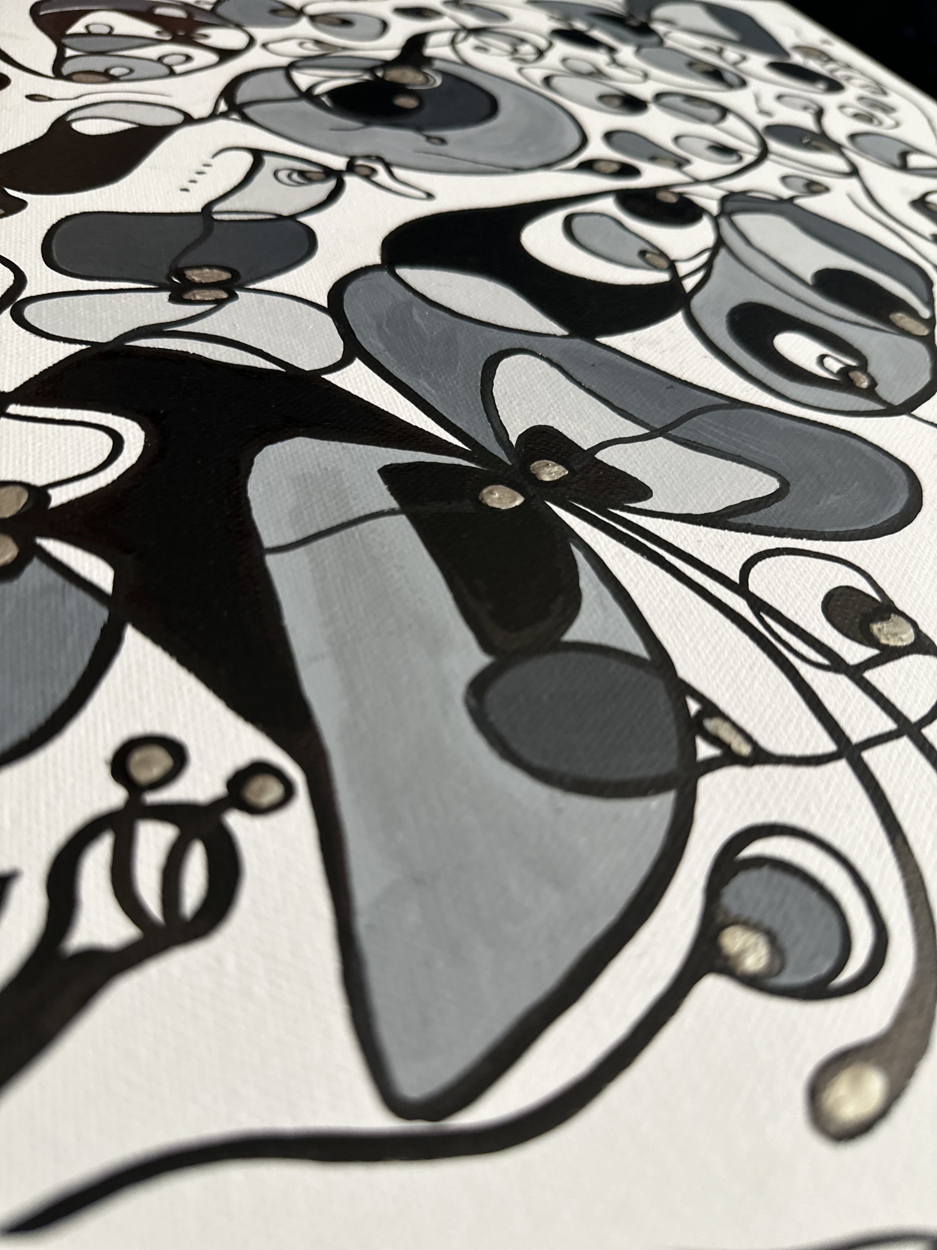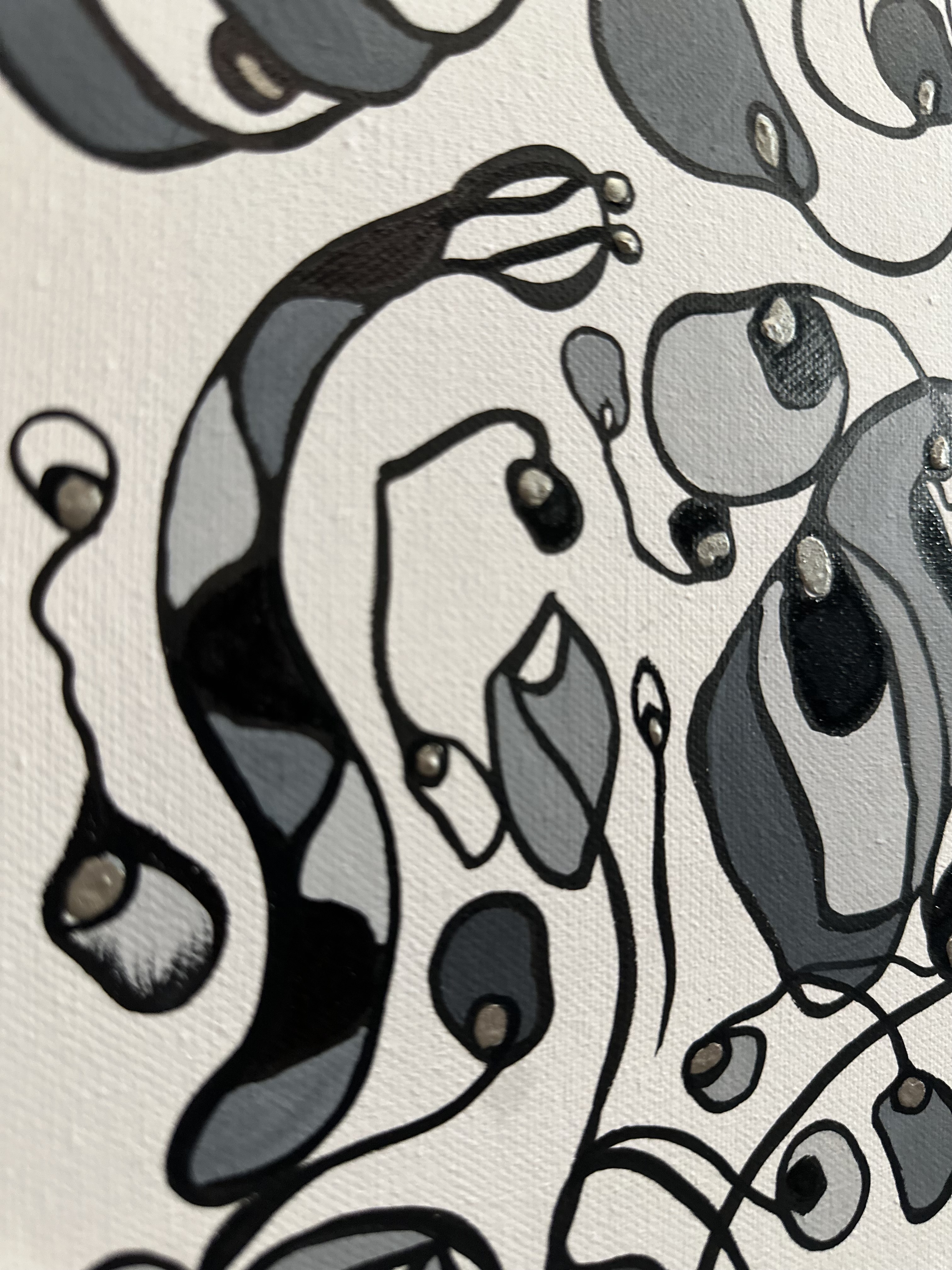 Oriental Ink, white pigment, silver powder, gold powder on canvas