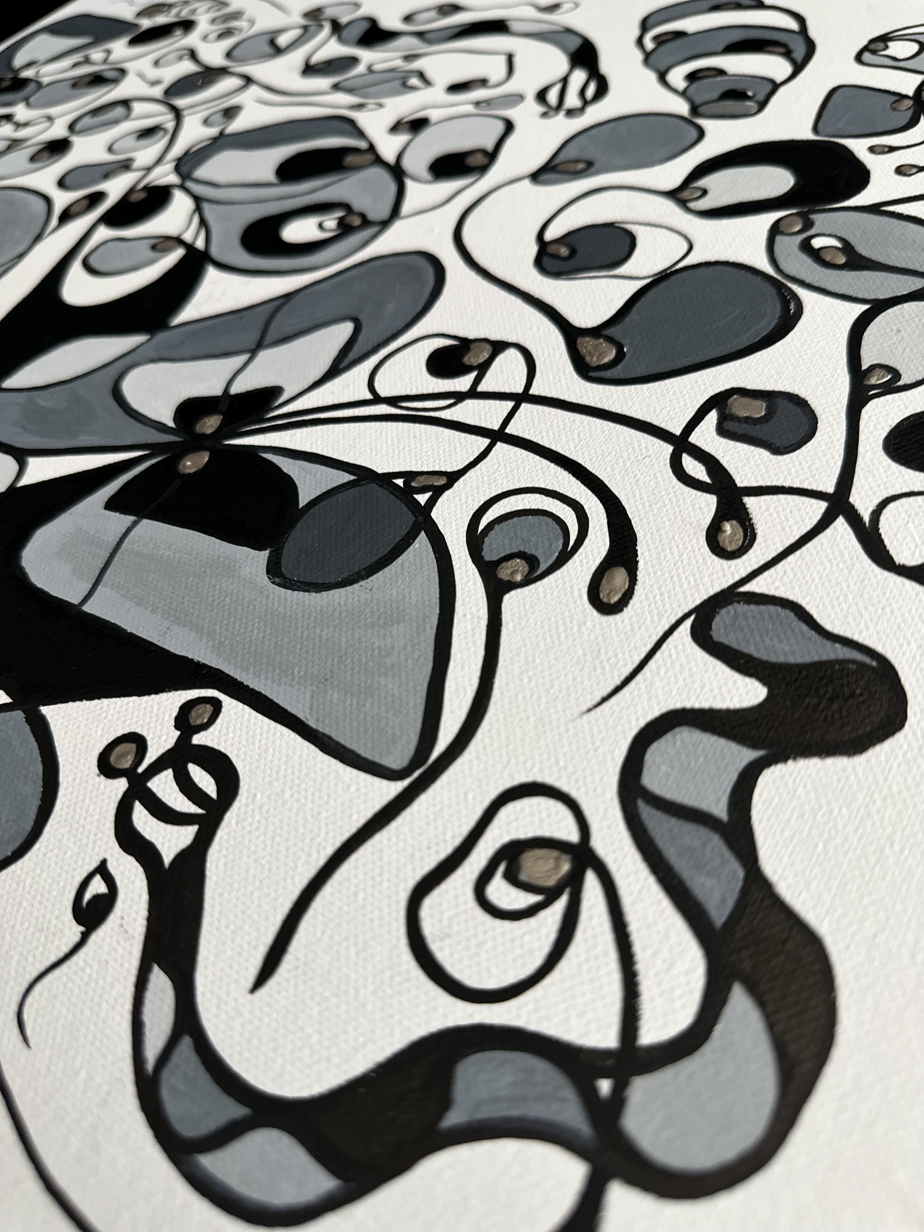 여기서 주목할 점은 작가가 '자연발생한 필연성'이라고 표현한 선들의 위계다. 계획된 구도라기보다는 즉흥적이고 유기적으로 생성된 듯한 이 질서는, 생명 경쟁의 예측 불가능성과 그 속에서 발현되는 생존의 법칙을 동시에 느끼게 한다. 각각의 형태는 고유한 존재론적 강도를 지니지만, 결국 거대한 흐름 속에서 서로에게 영향을 미치며 하나의 거대한 서사를 구축한다.