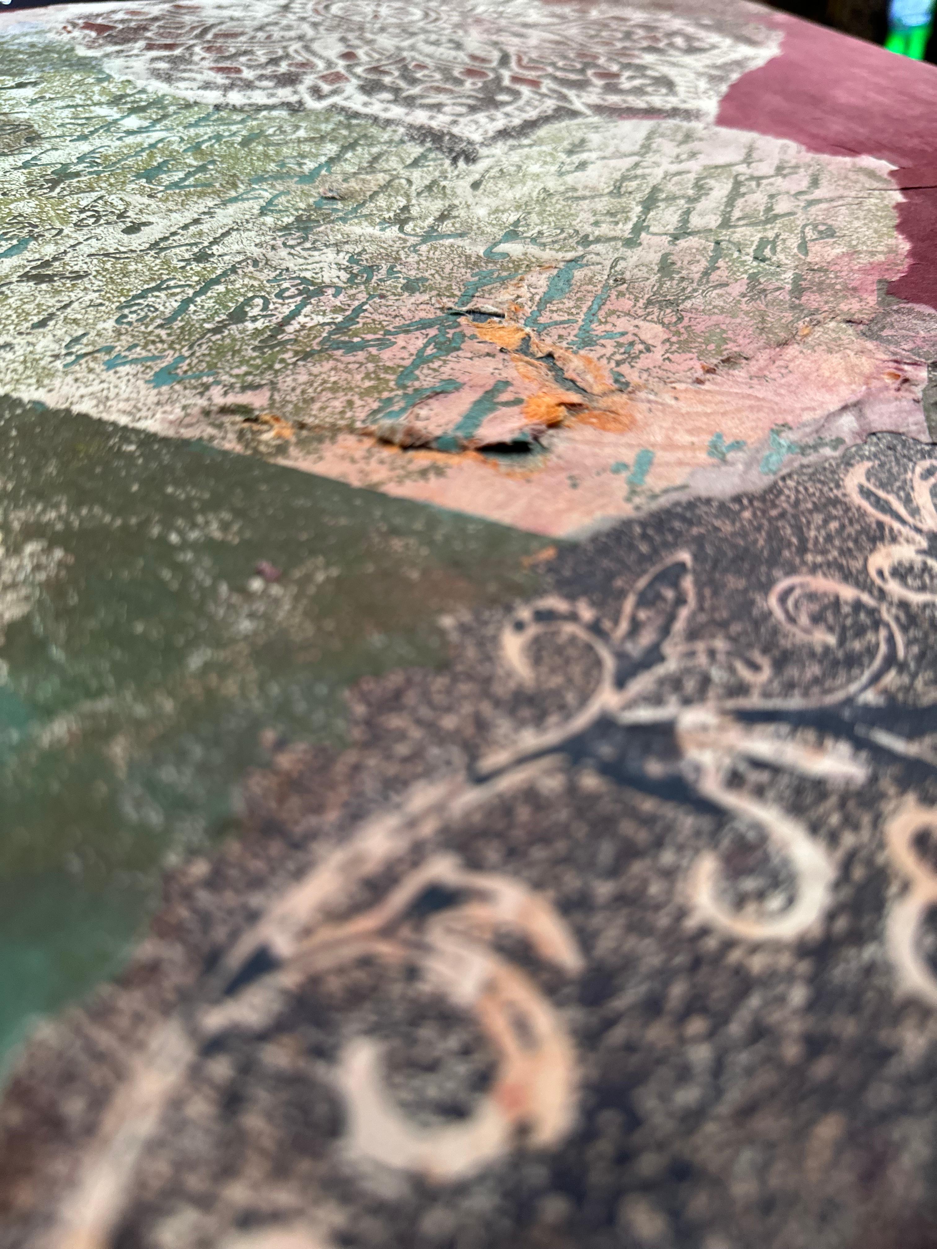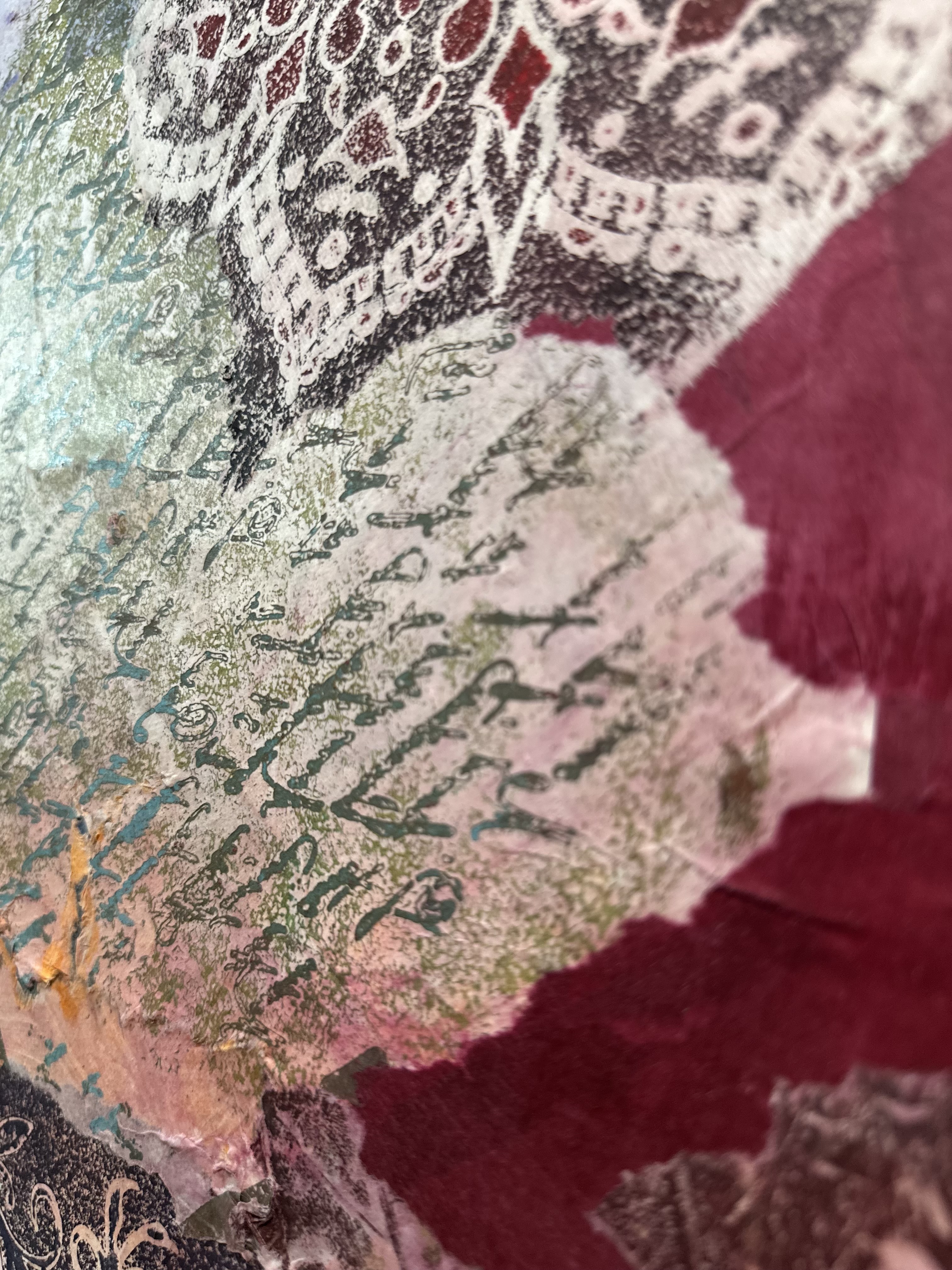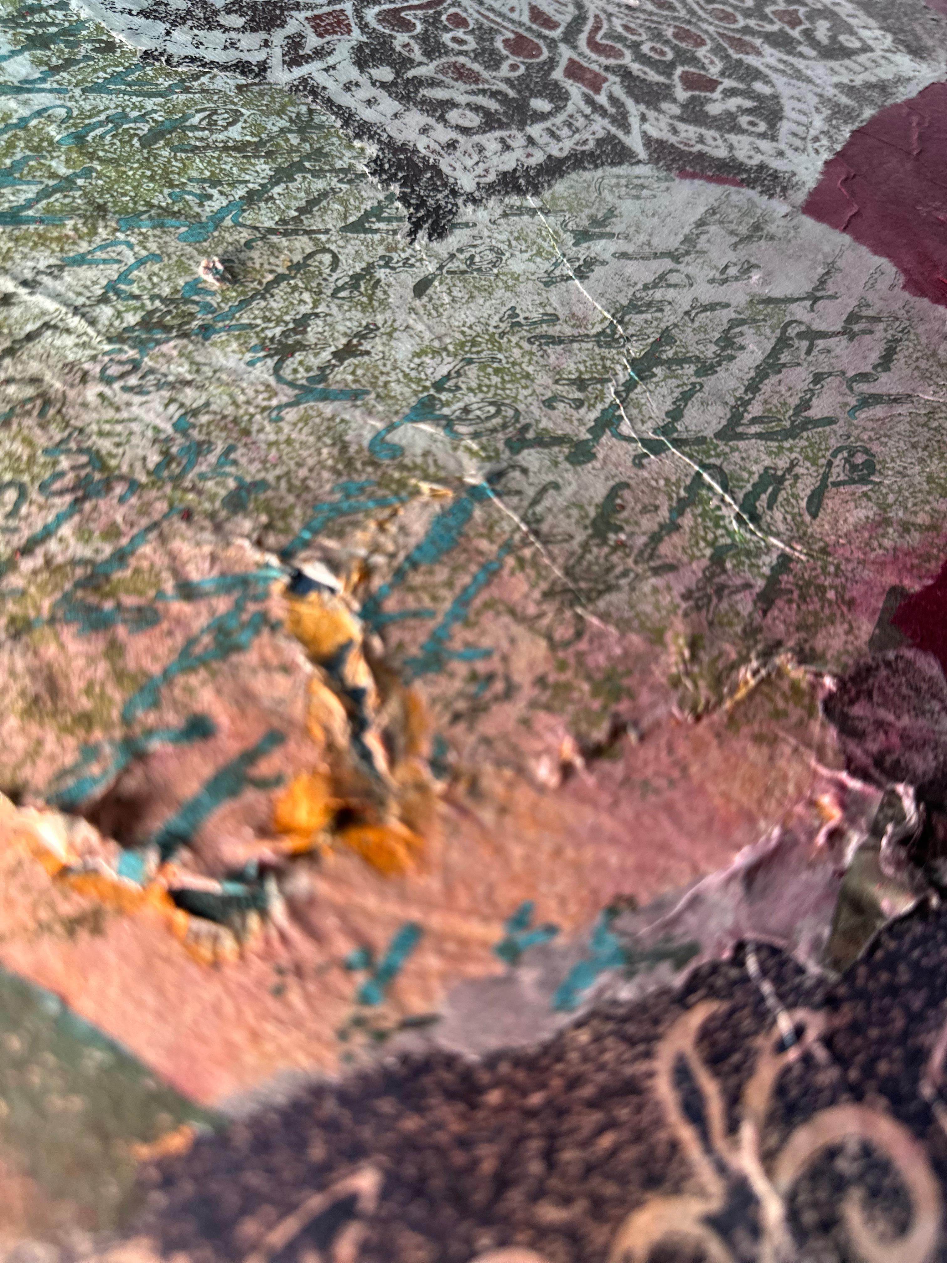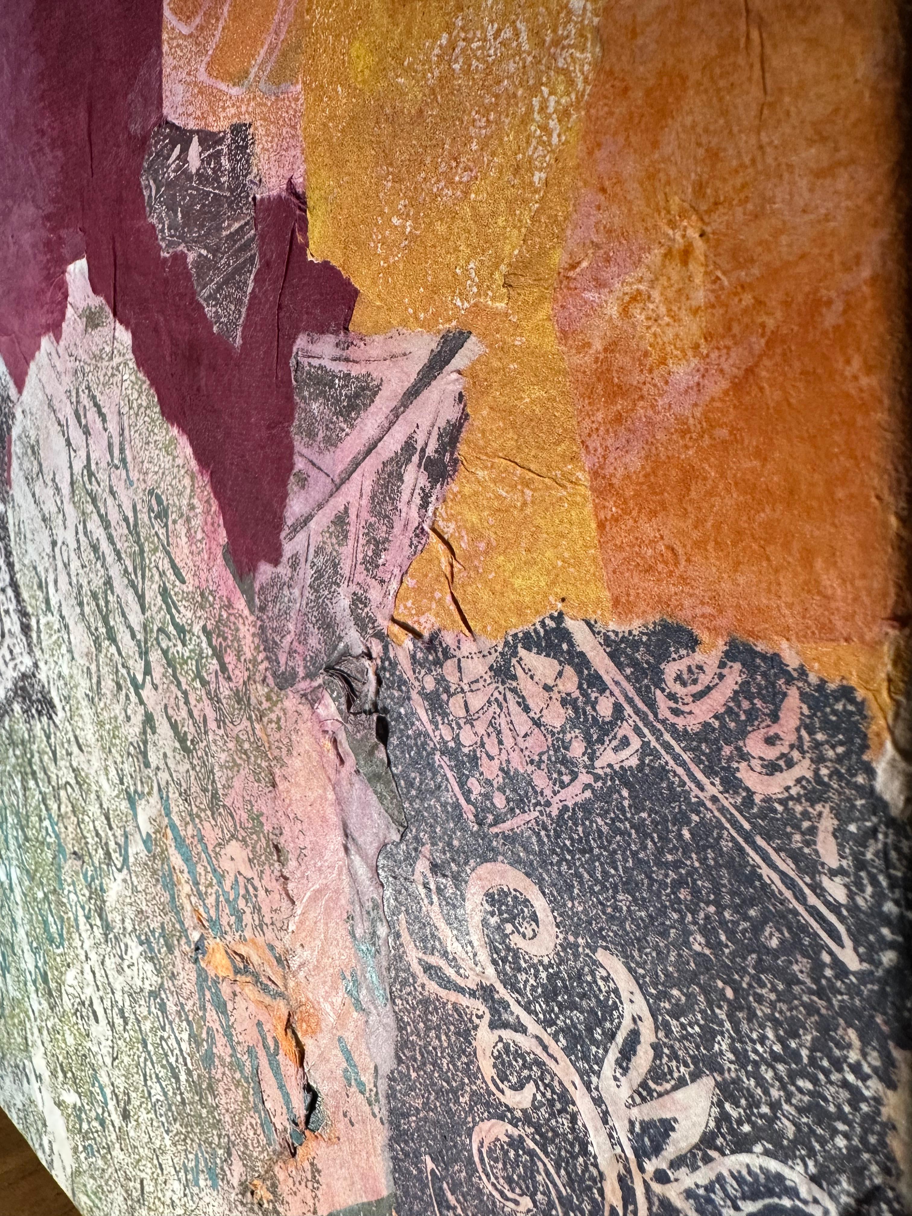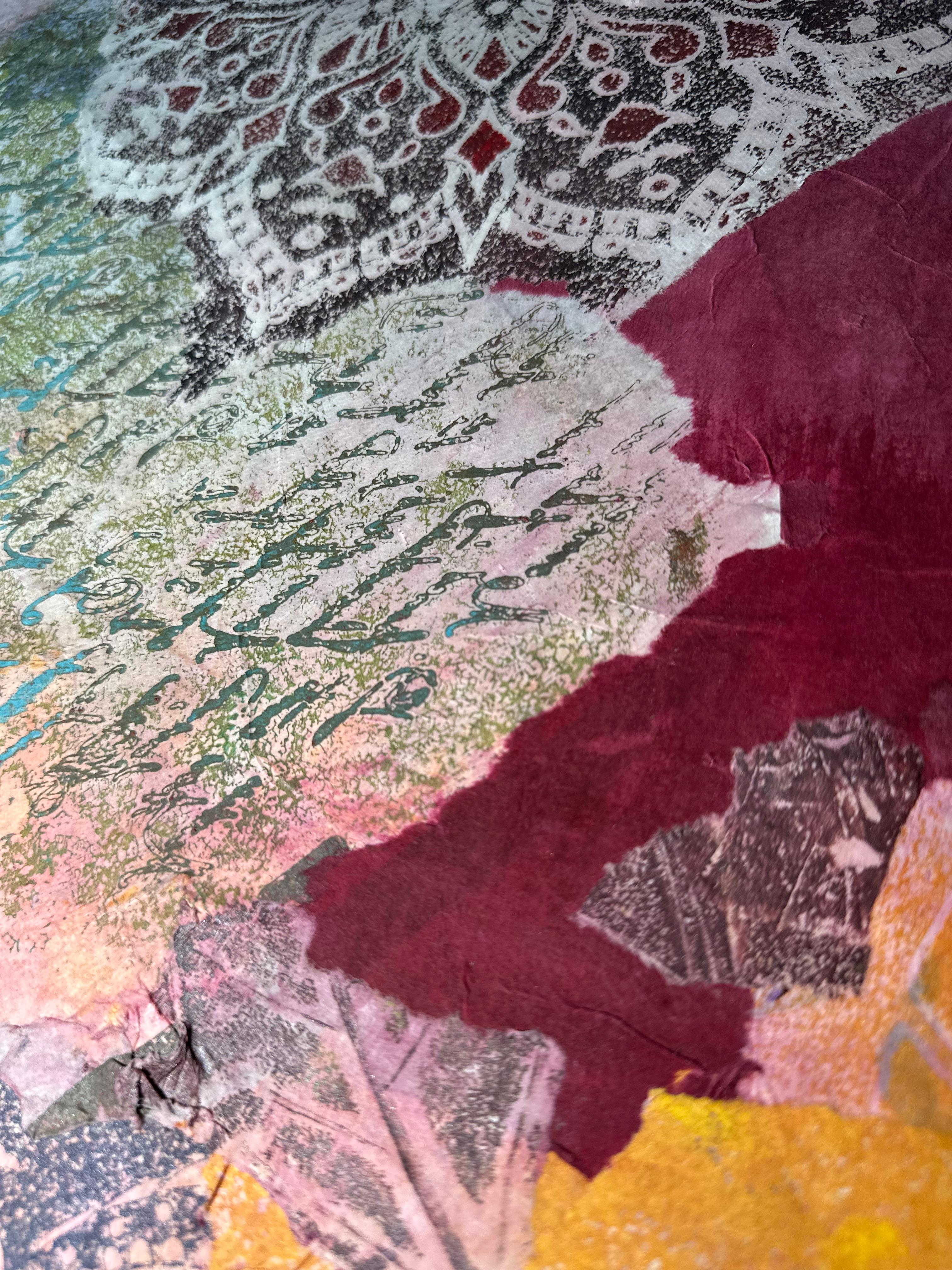 The work invites a different kind of perception. Instead of a fixed composition, there is a field of possibility where the eye can wander, connecting traces and textures. A translucent layer whispers of an earlier color, a bold shape asserts itself against a subtle pattern, and a torn edge reveals an unexpected layer of pigment. Each fragment holds its own world, a small moment of exchange between my hands and the material.