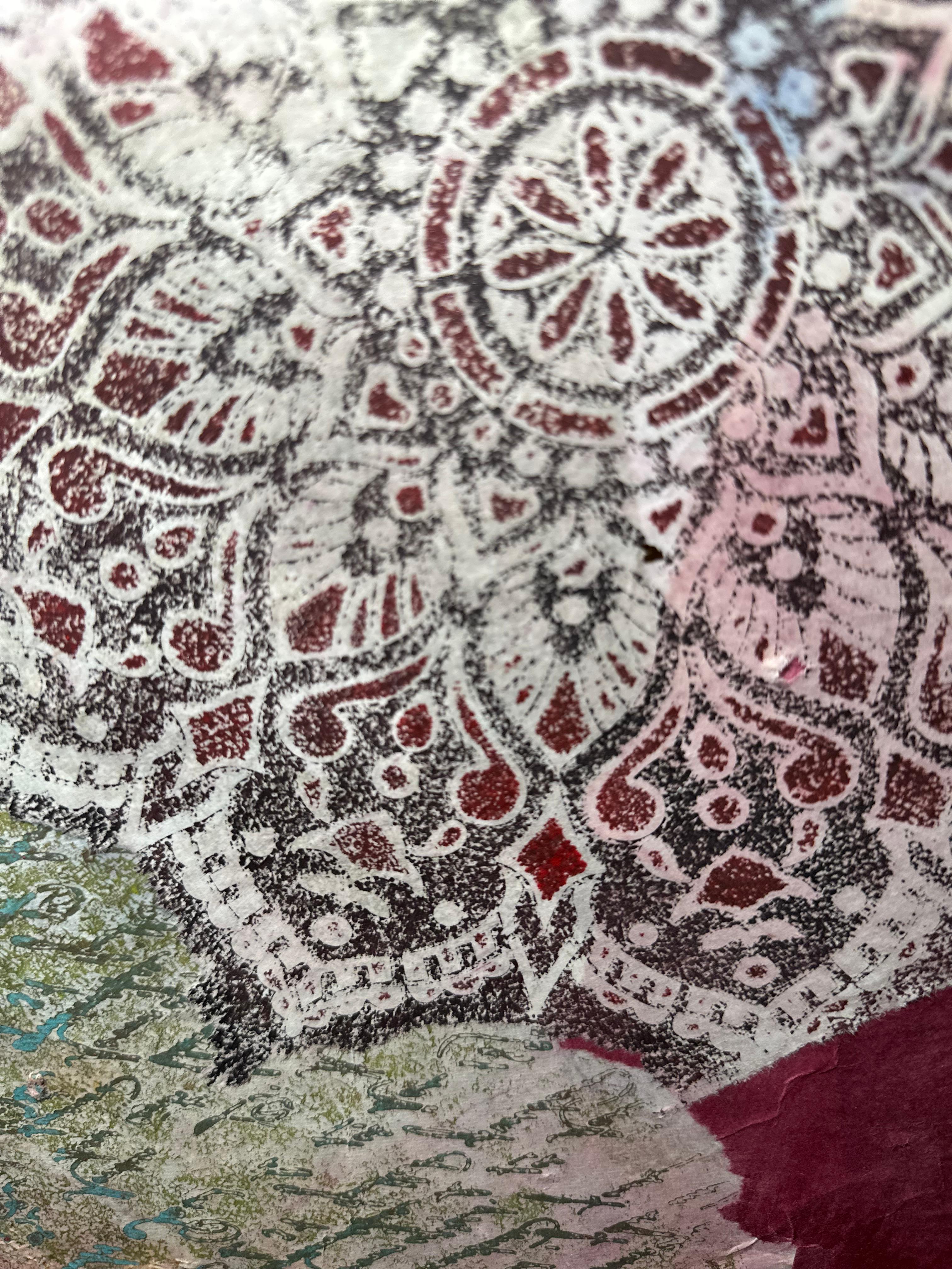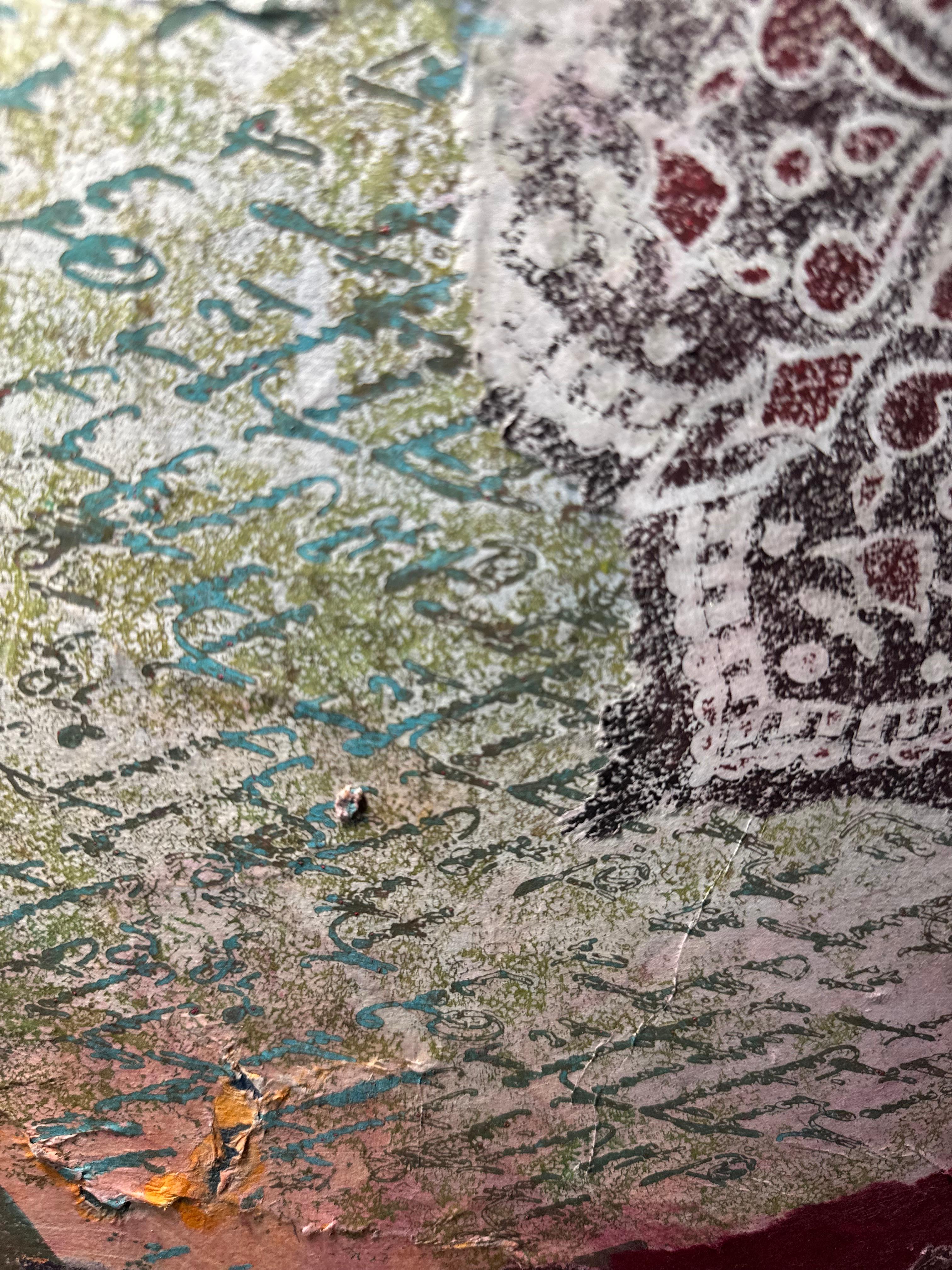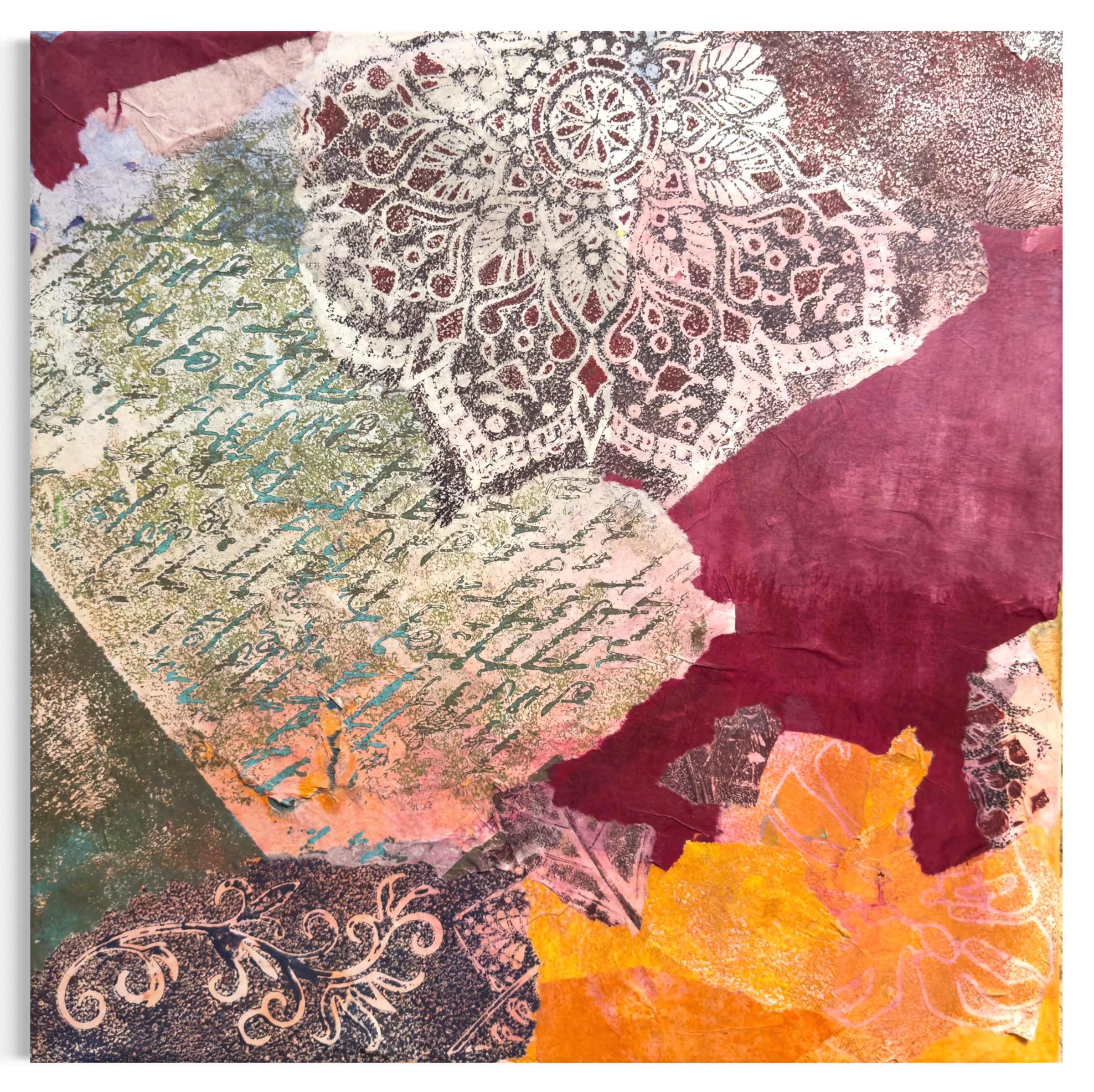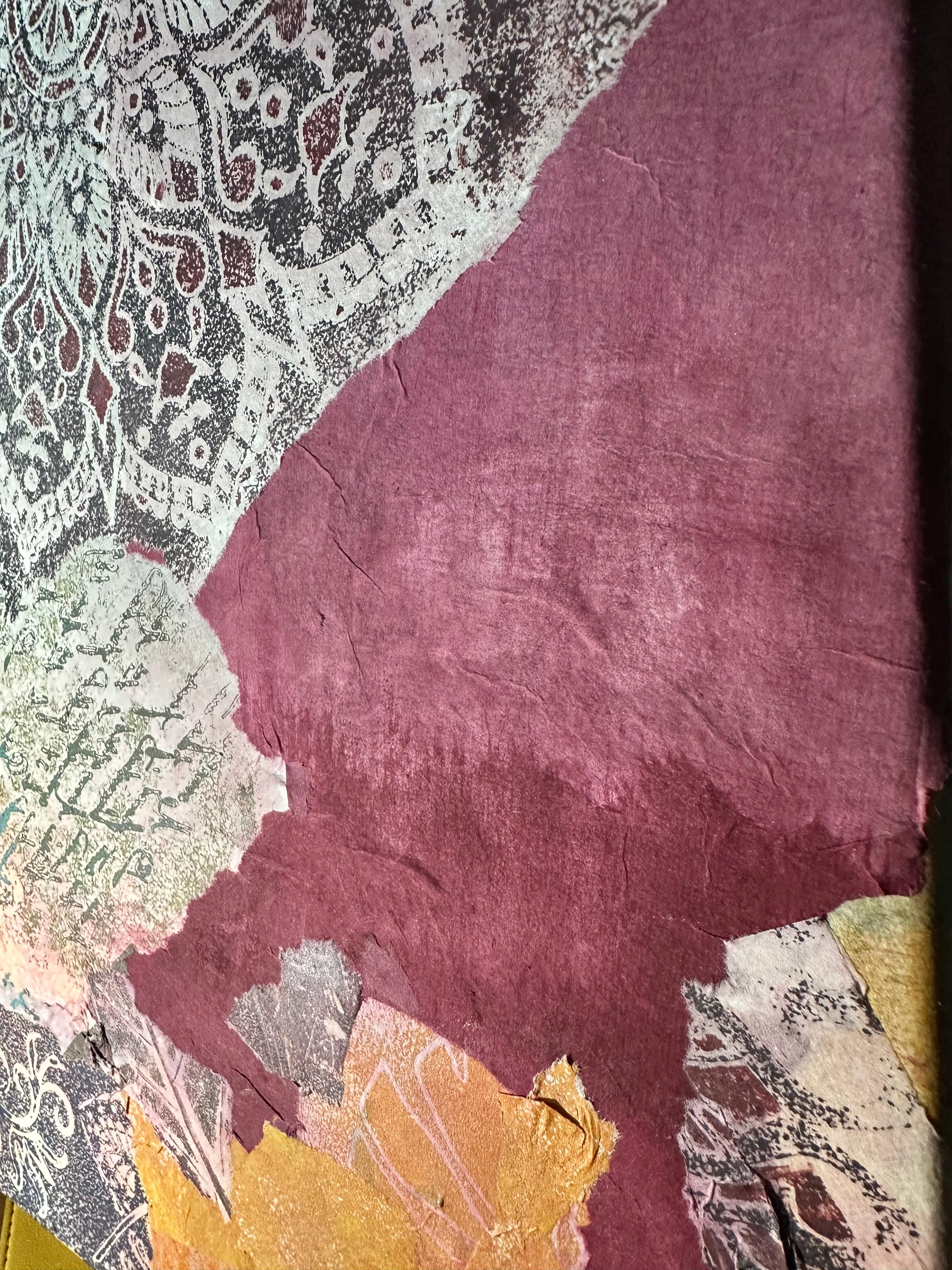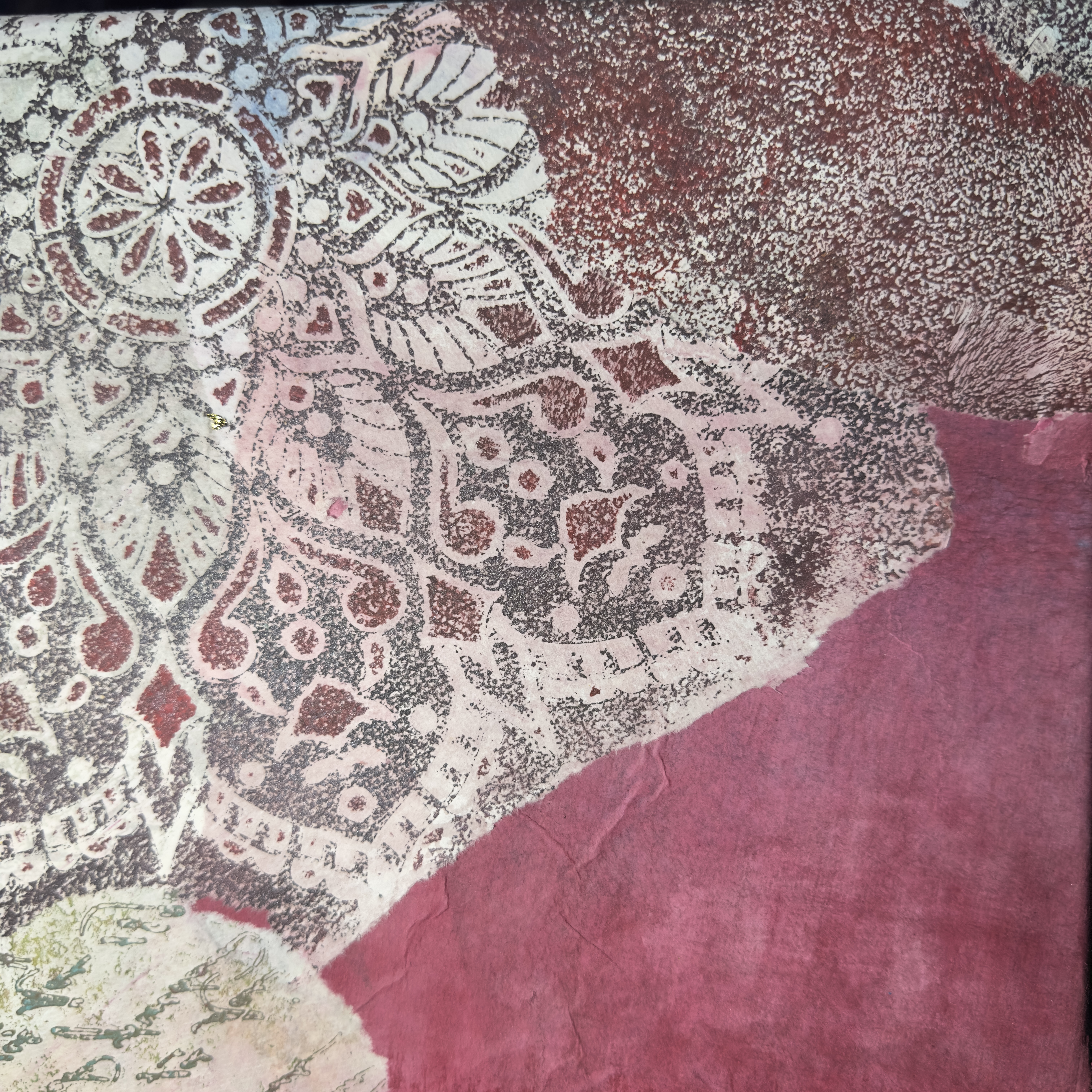 This work is a conversation between materials, a space where fragments remain free. It does not follow a fixed plan, but instead invites a different kind of perception. Layers of hanji, pigment, and print exist together, each with its own memory and texture. A bold shape asserts itself against a subtle pattern, and a torn edge reveals an unexpected layer. The eye can wander, connecting traces and sensations. What is seen and felt is enough.