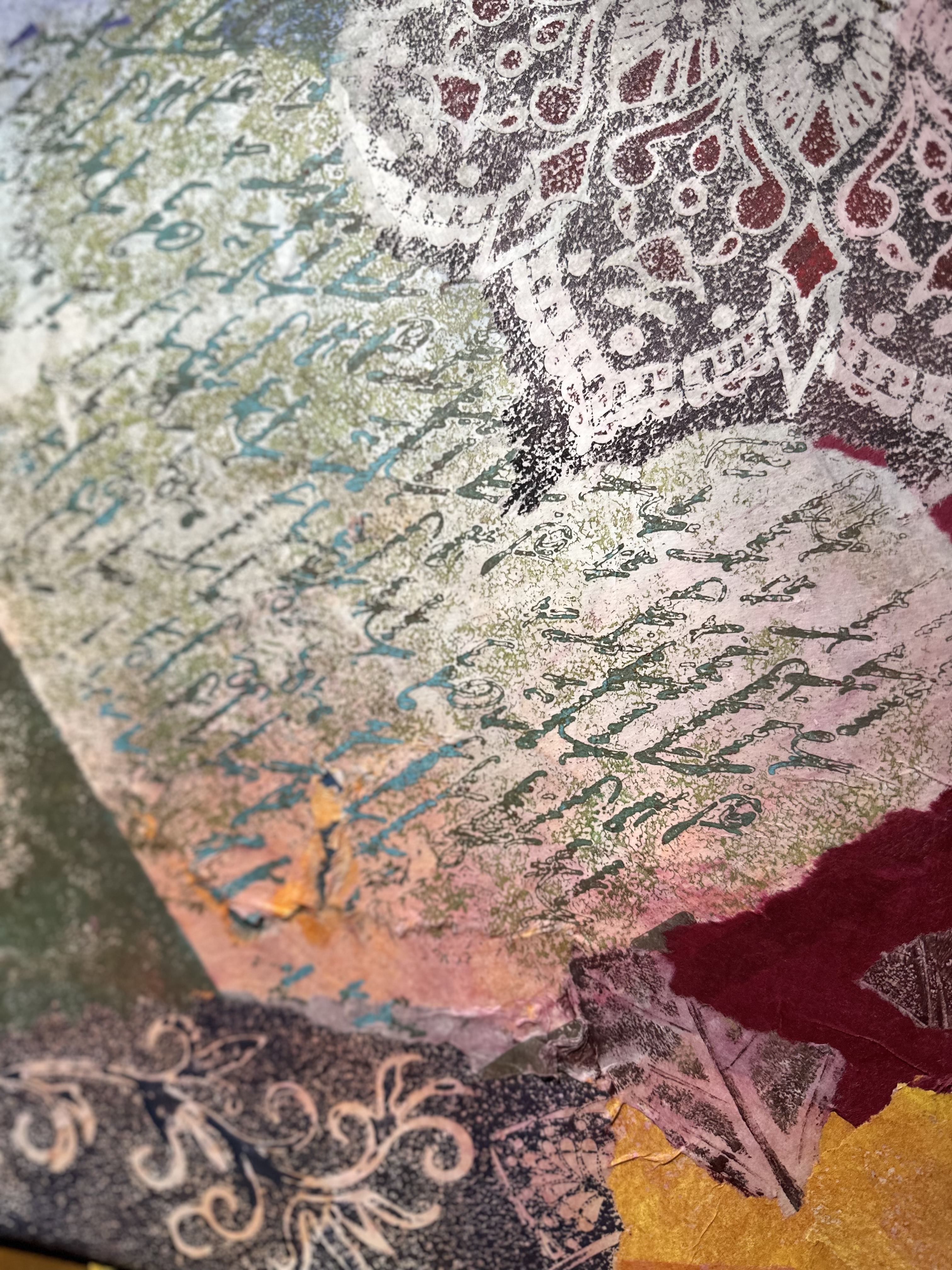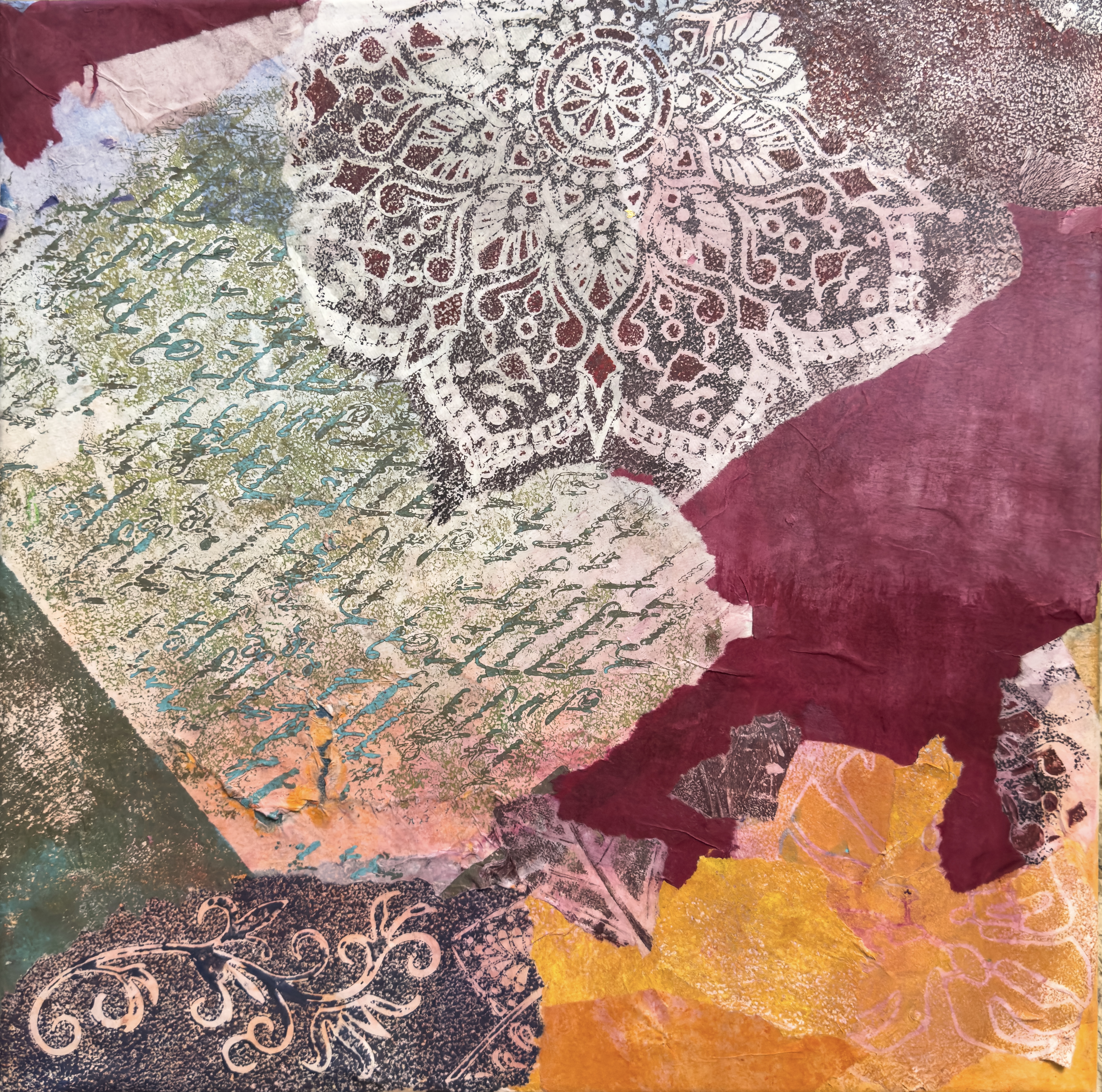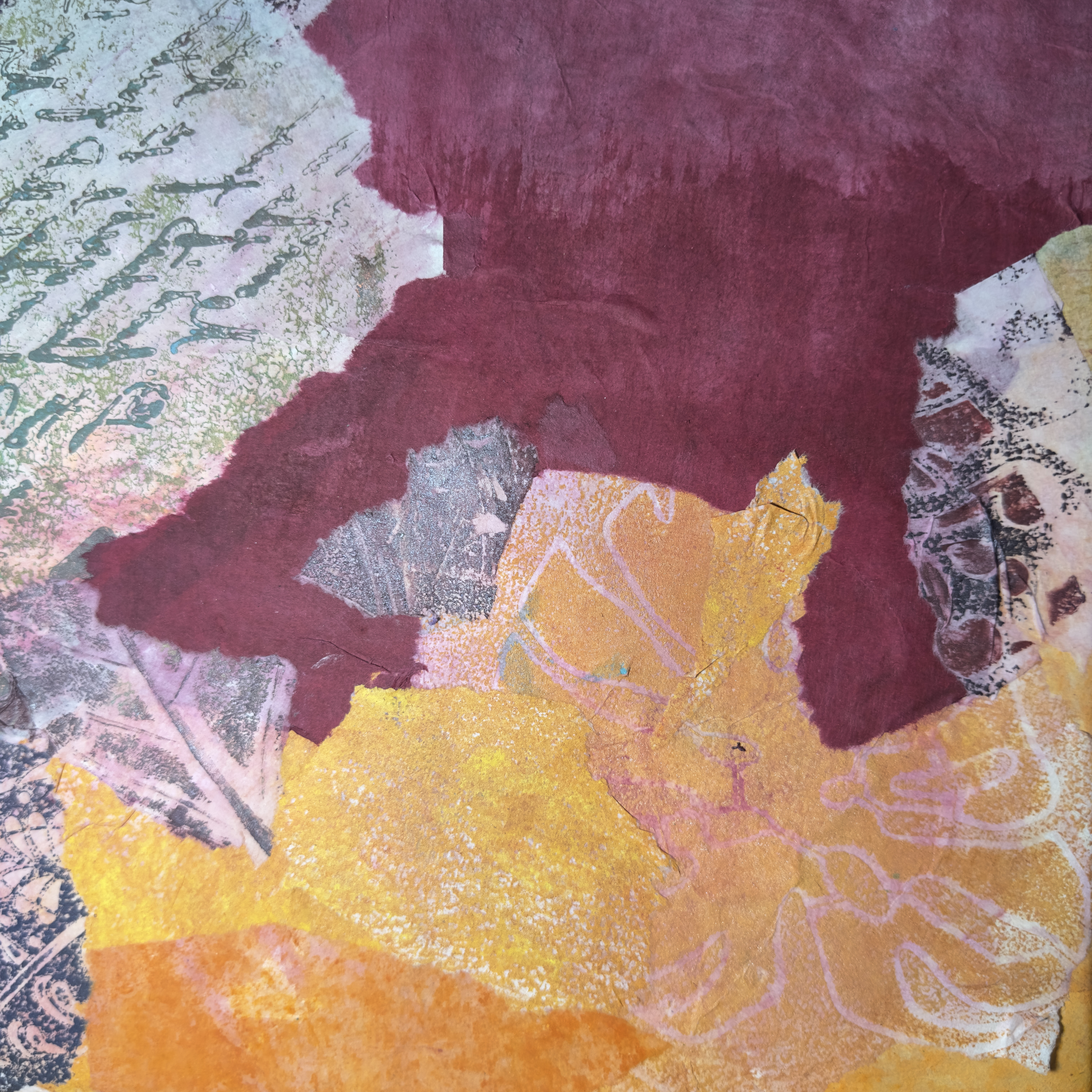Oriental pigments on hanji canvas, gel printing, collage / 한지캔버스 위 동양화 안료, 젤 프린팅, 콜라주