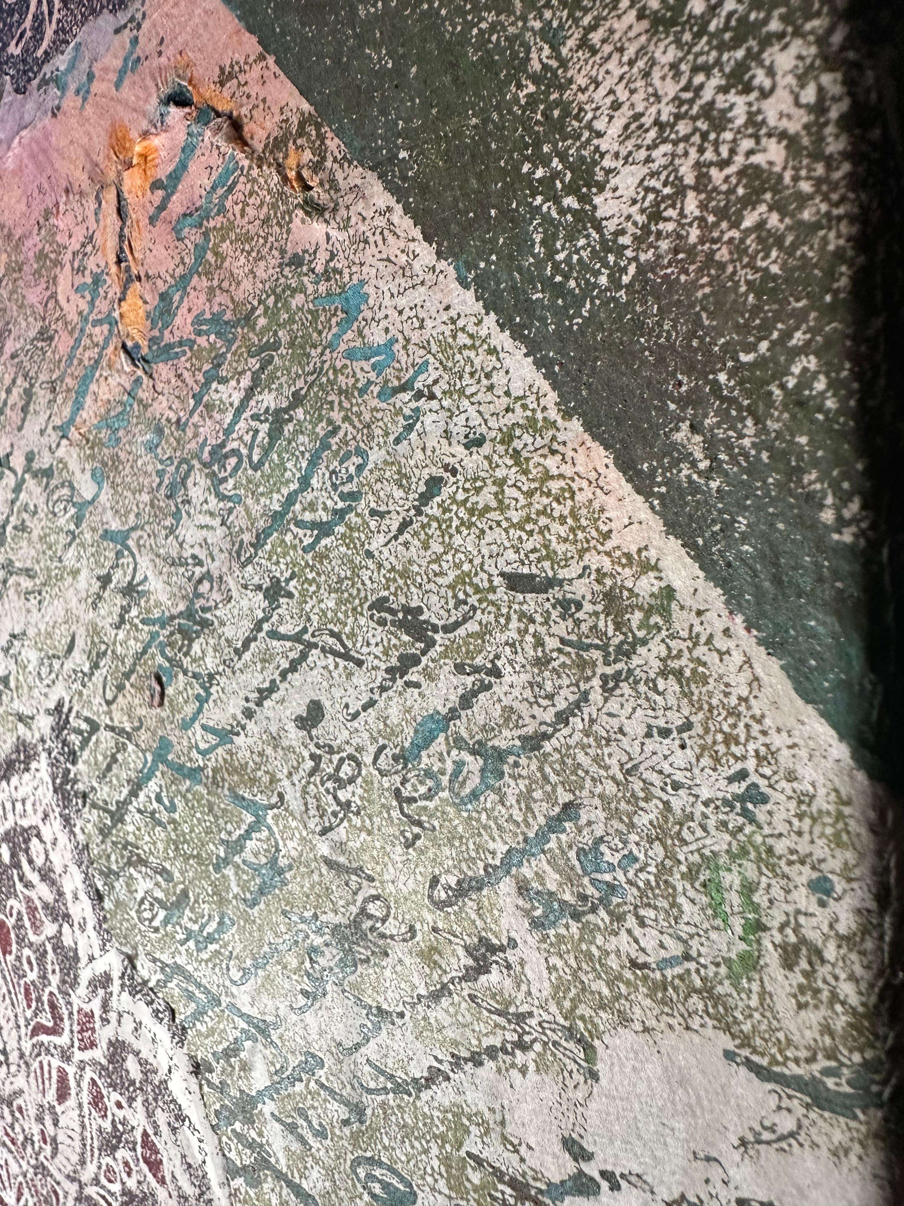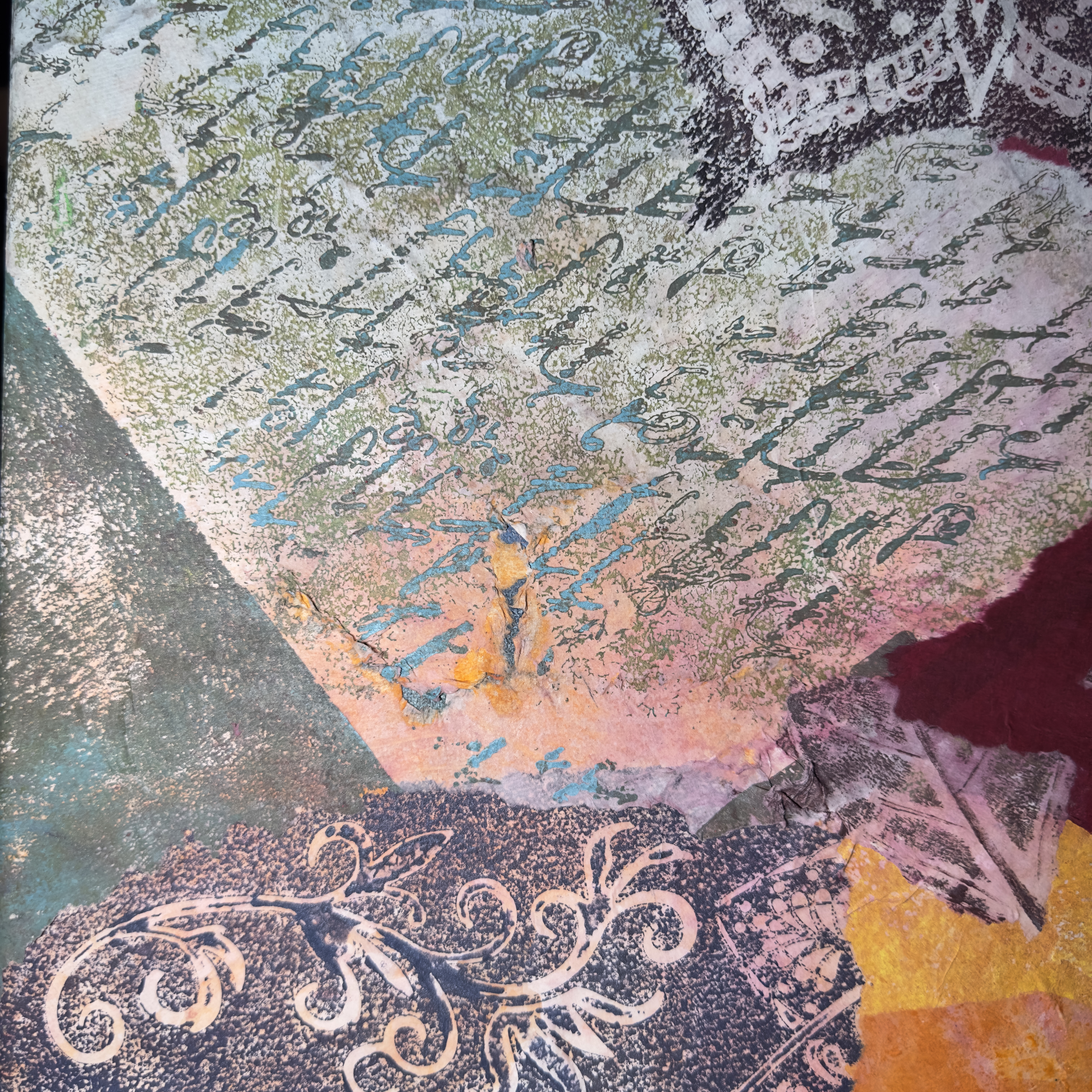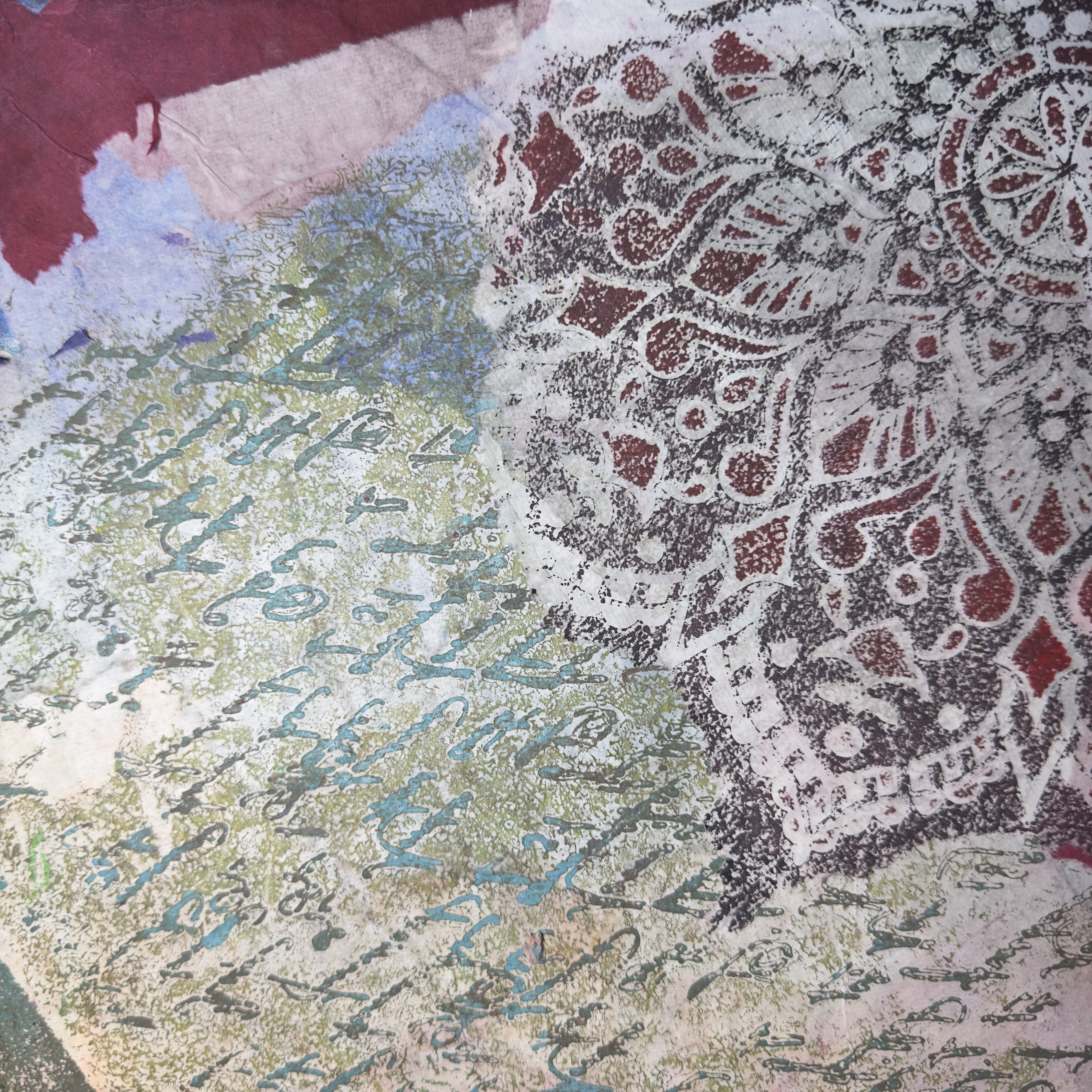 Oriental pigments on hanji canvas, gel printing, collage / 한지캔버스 위 동양화 안료, 젤 프린팅, 콜라주