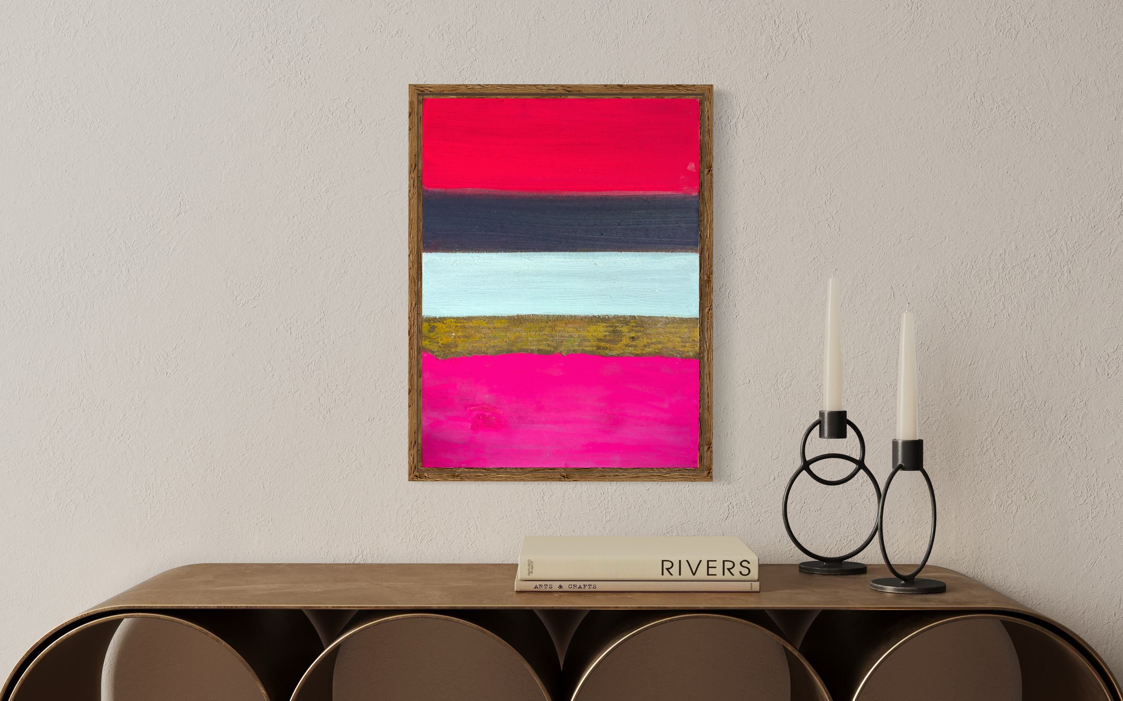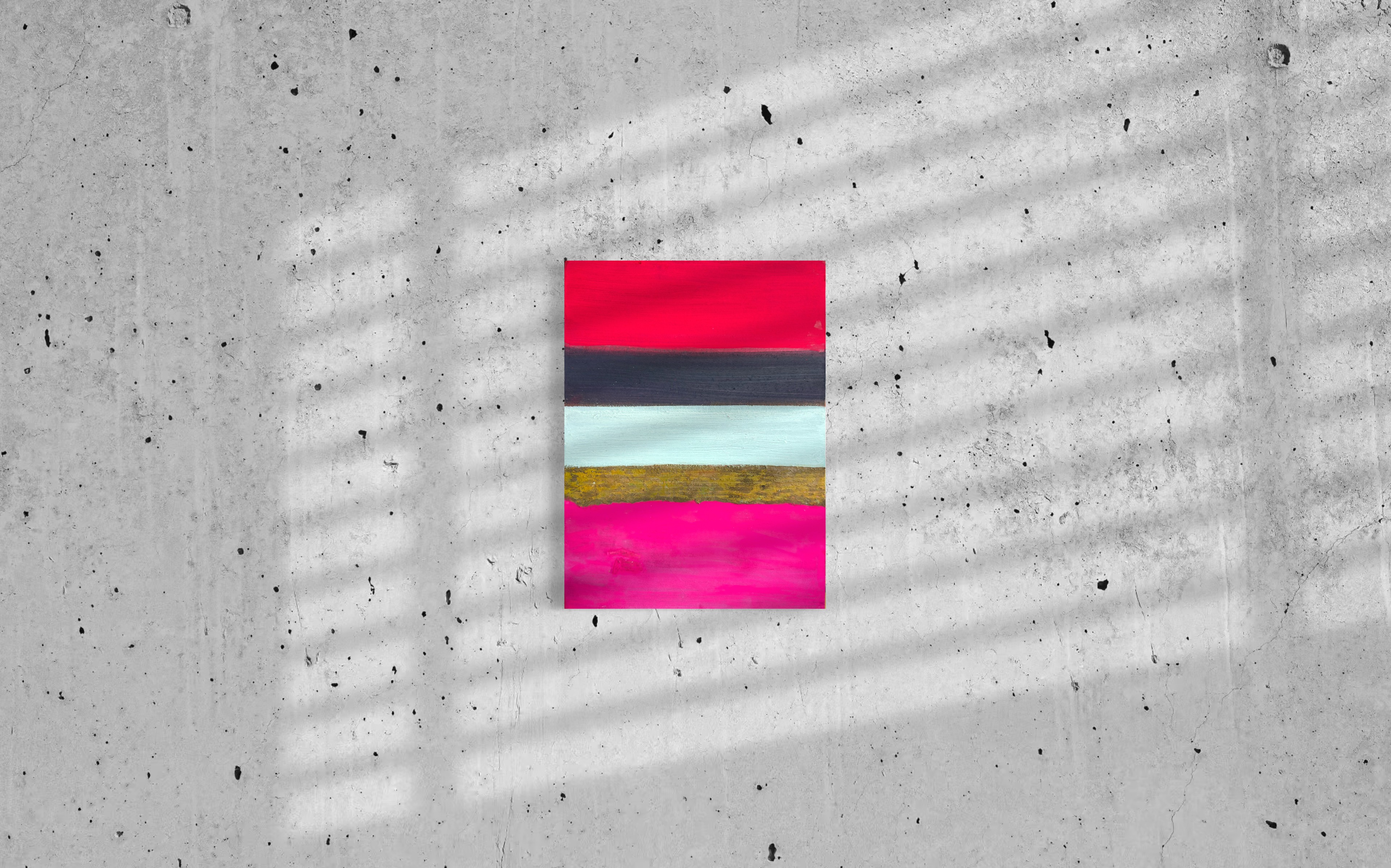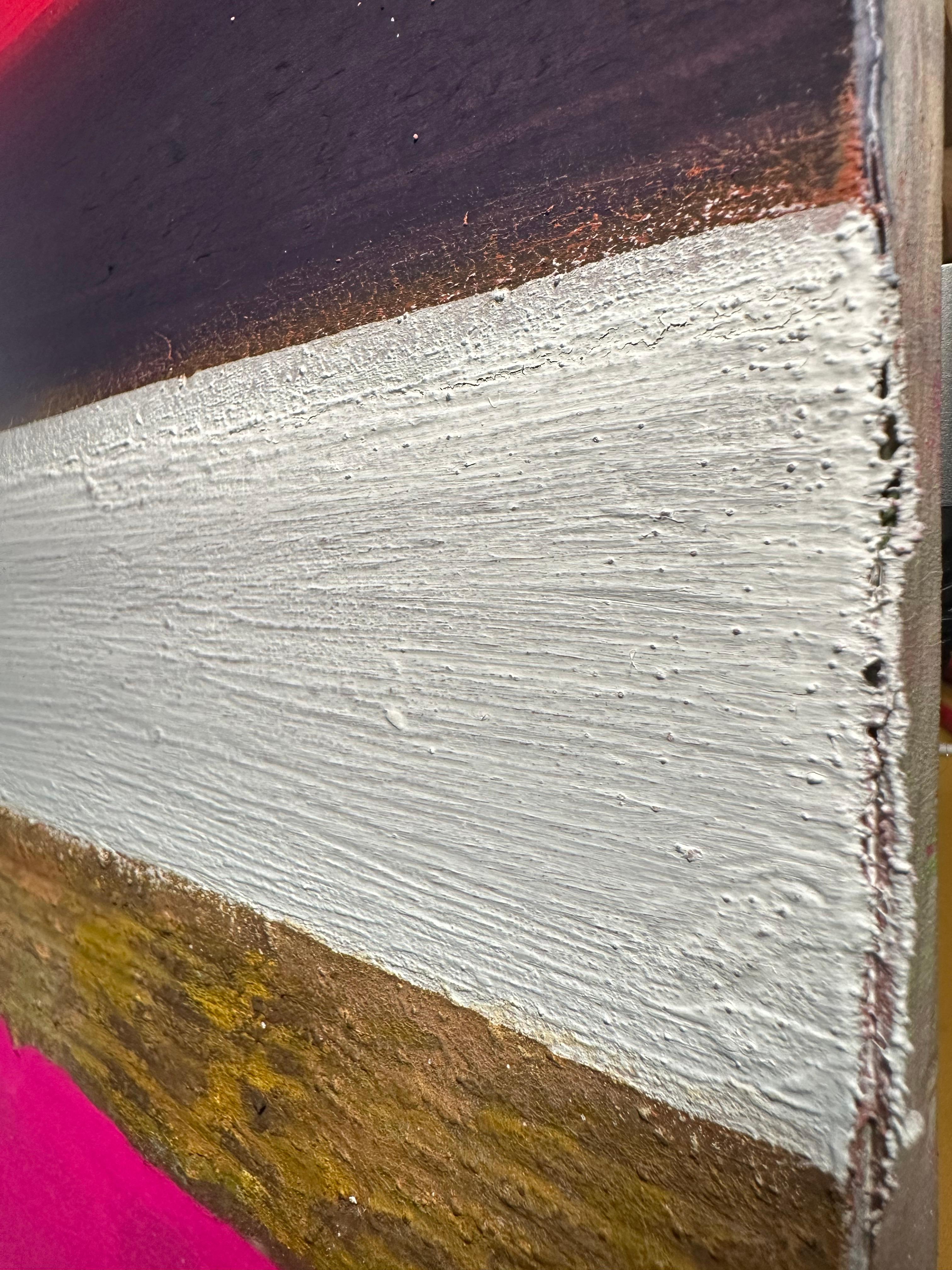 Within this compact format, intense chromatic contrasts compress into concentrated visual tension. The work refuses hierarchical relationships between elements; instead, each band maintains its independence while contributing to a larger compositional dynamic. The irregular protrusions of the oxidized surface catch and redirect light, creating shadows that shift with viewing angle and time of day.