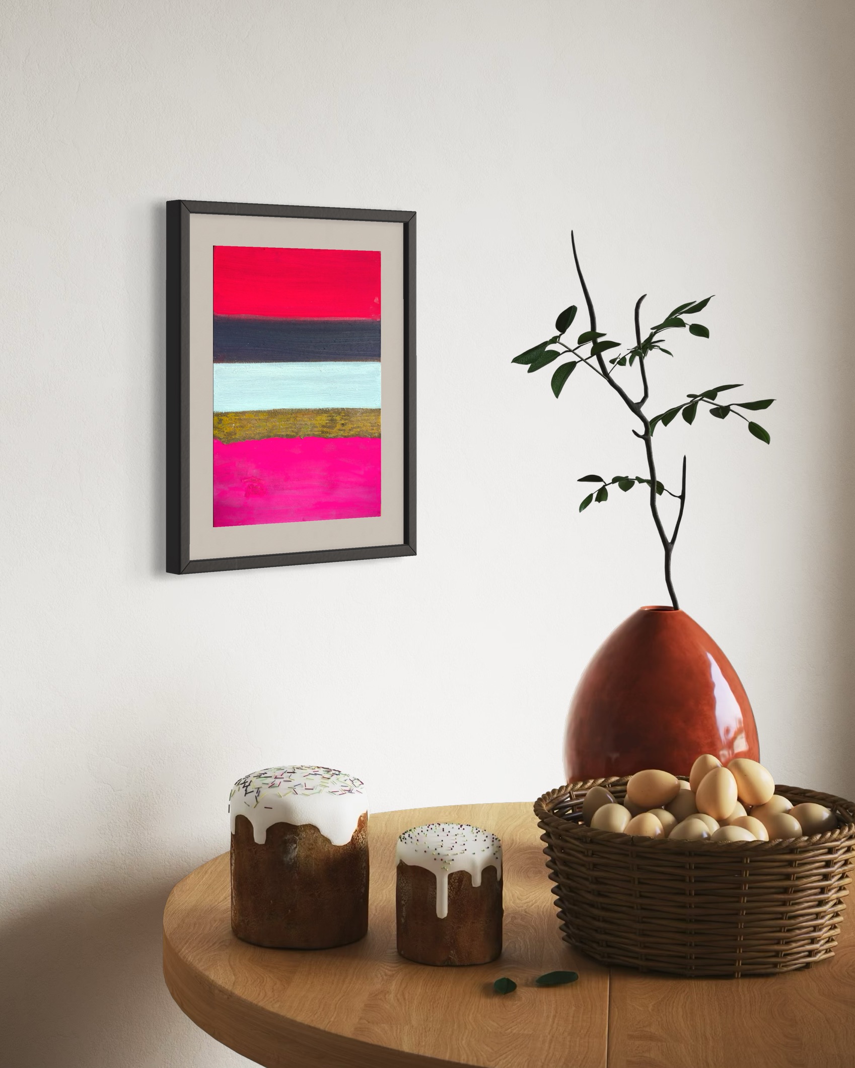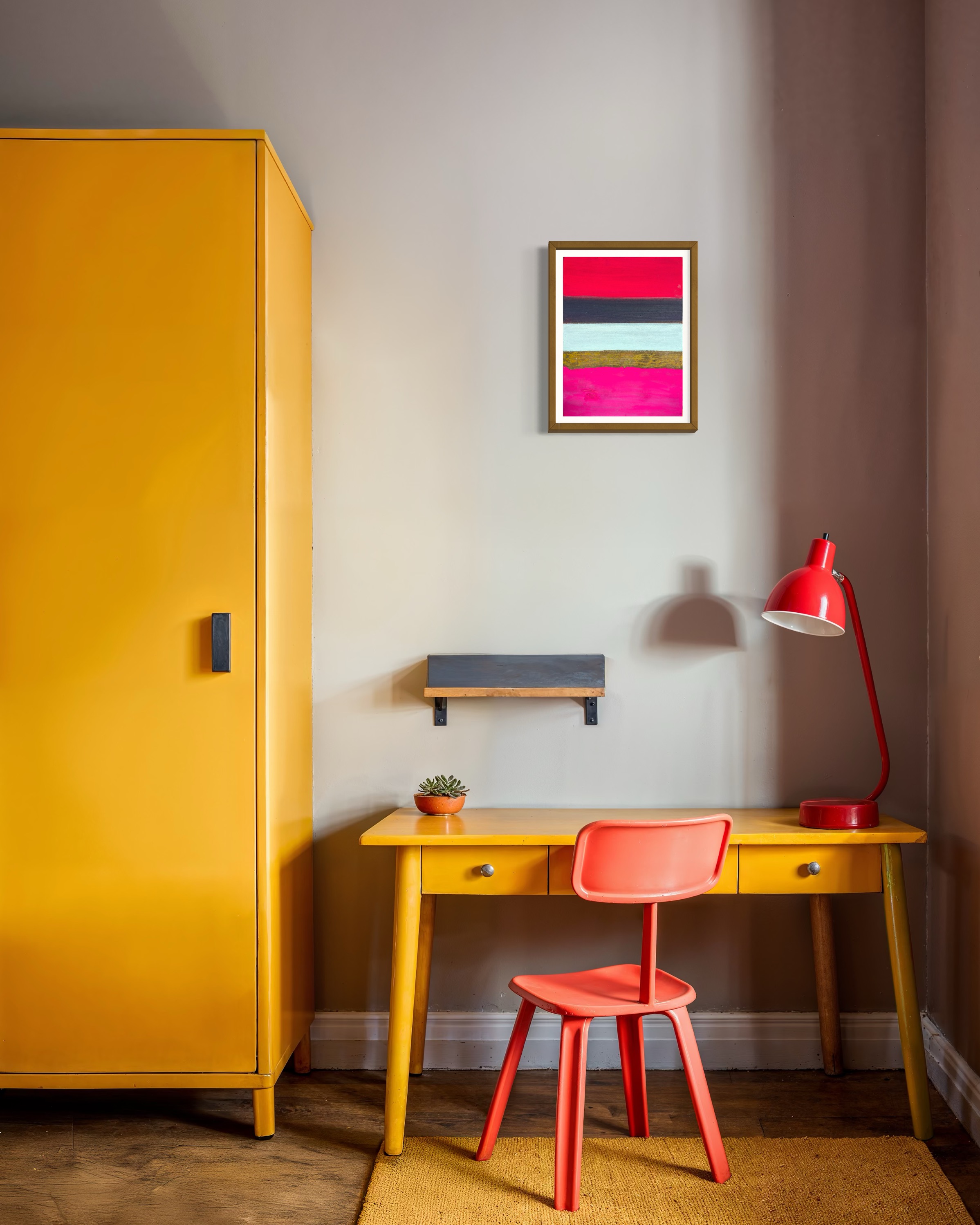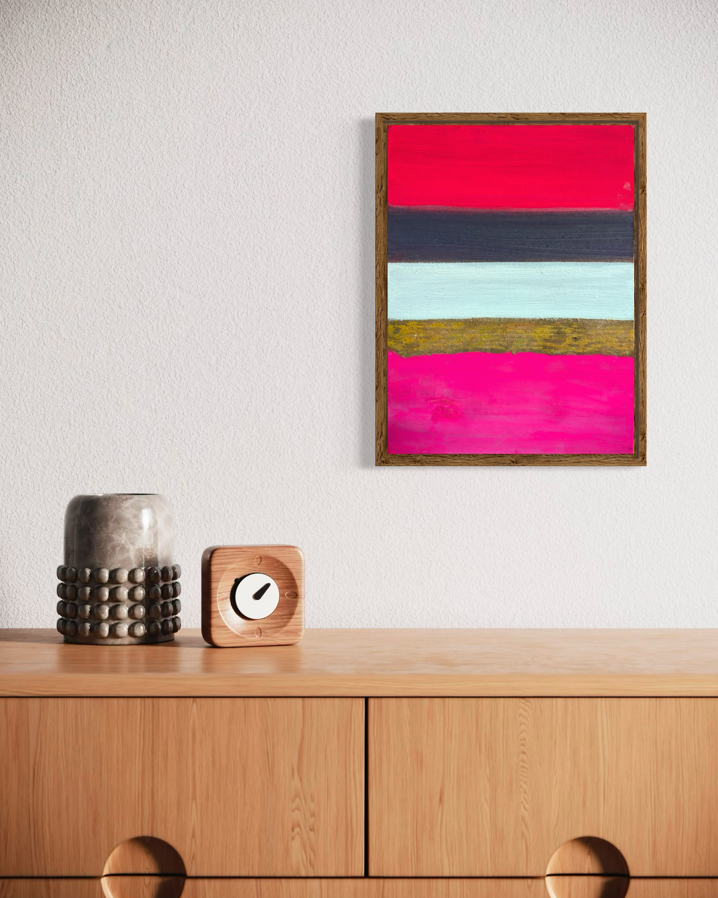 Within this compact format, intense chromatic contrasts compress into concentrated visual tension. The work refuses hierarchical relationships between elements; instead, each band maintains its independence while contributing to a larger compositional dynamic. The irregular protrusions of the oxidized surface catch and redirect light, creating shadows that shift with viewing angle and time of day.