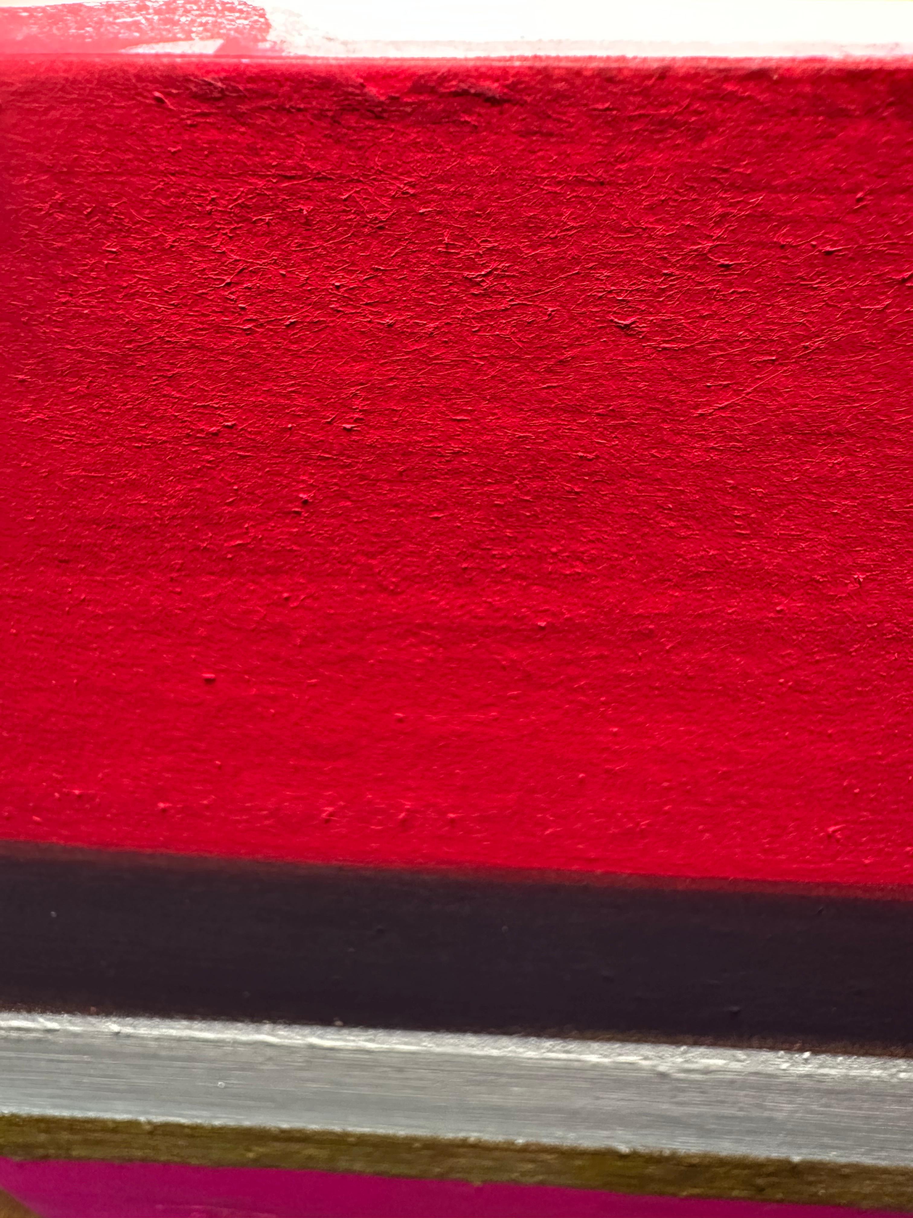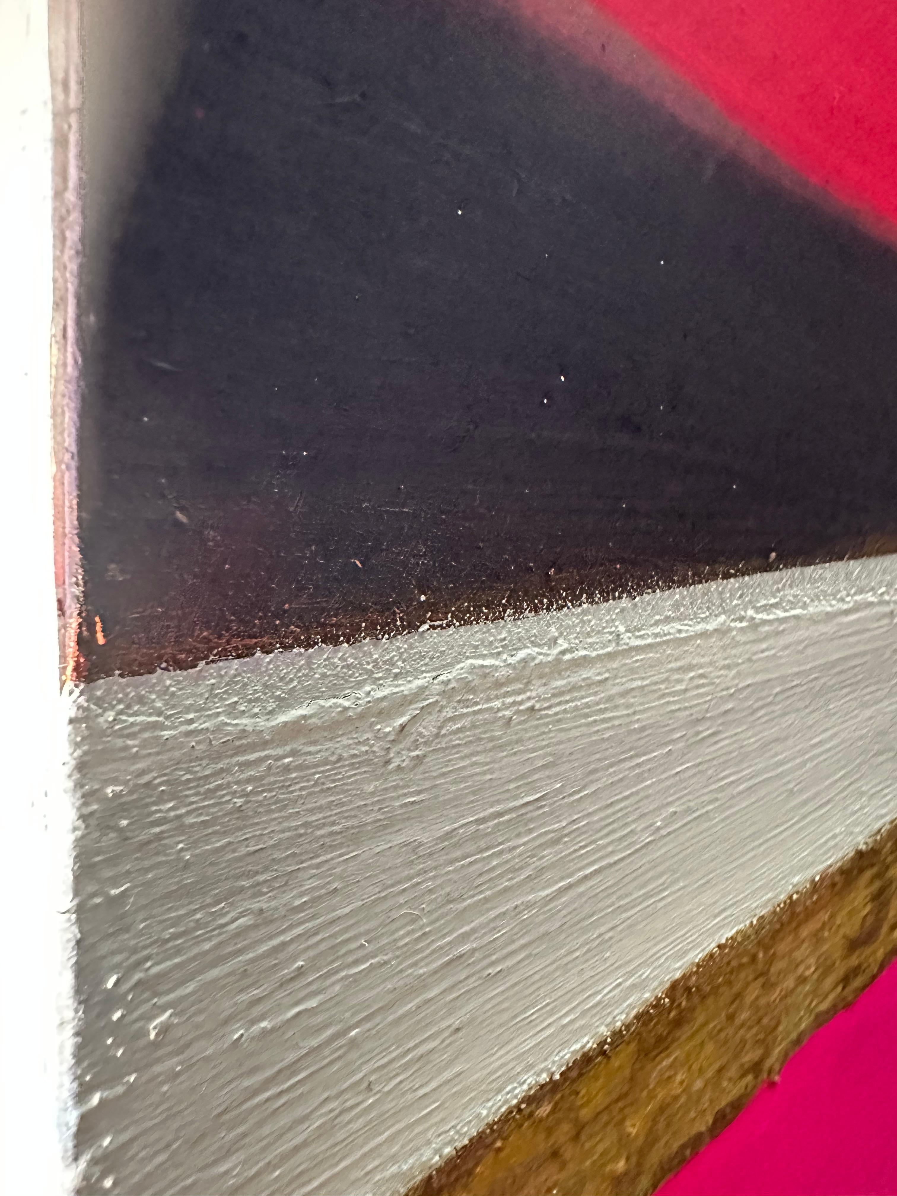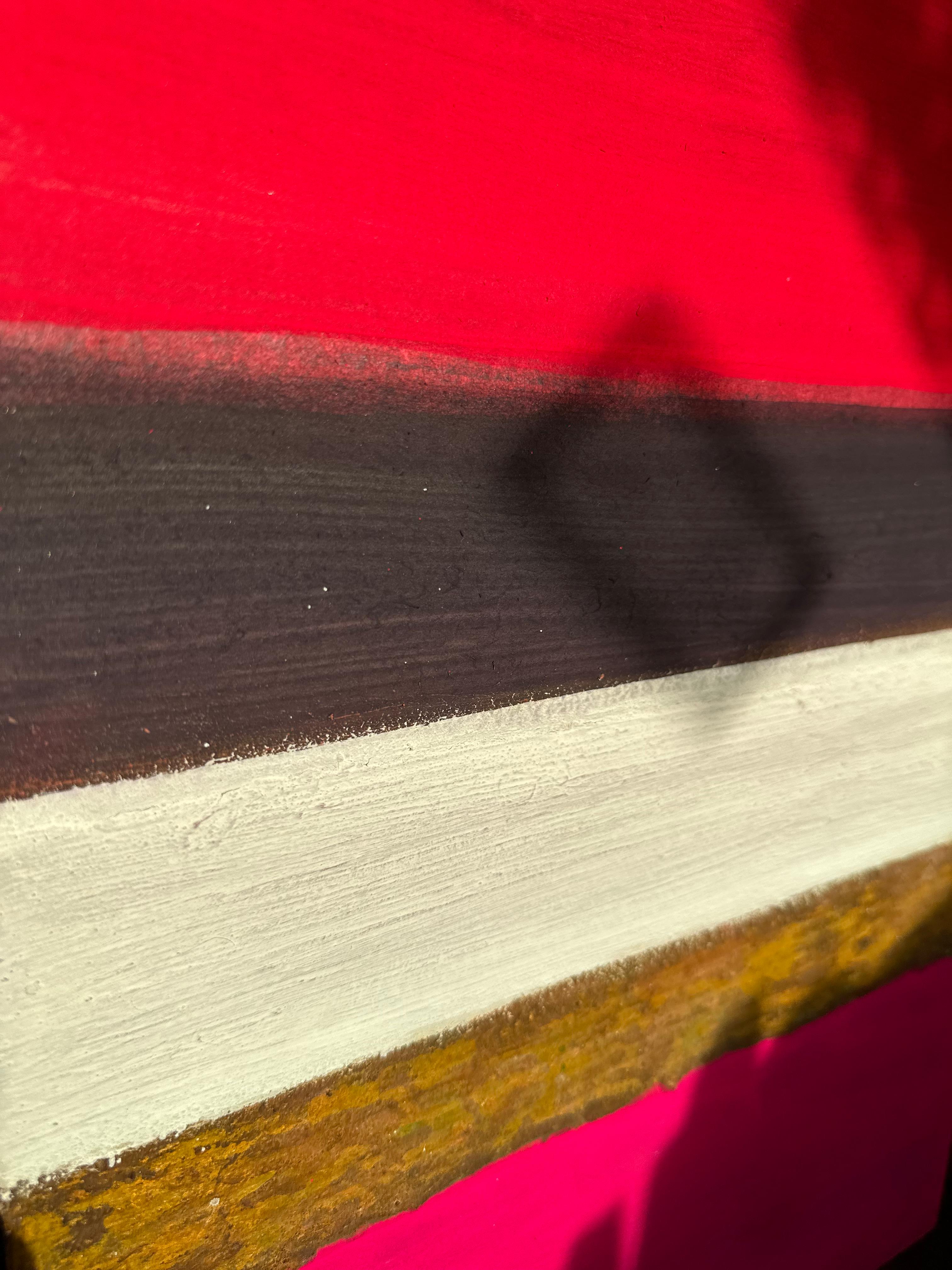 이 작은 형식 안에서 강렬한 색채 대비는 응축된 시각적 긴장으로 압축된다. 작품은 요소들 간의 위계적 관계를 거부한다. 대신 각 띠는 독립성을 유지하면서도 더 큰 구성적 역동성에 기여한다. 산화된 표면의 불규칙한 돌출부들은 빛을 포착하고 방향을 바꾸며, 관찰 각도와 시간에 따라 변하는 그림자를 만든다.
