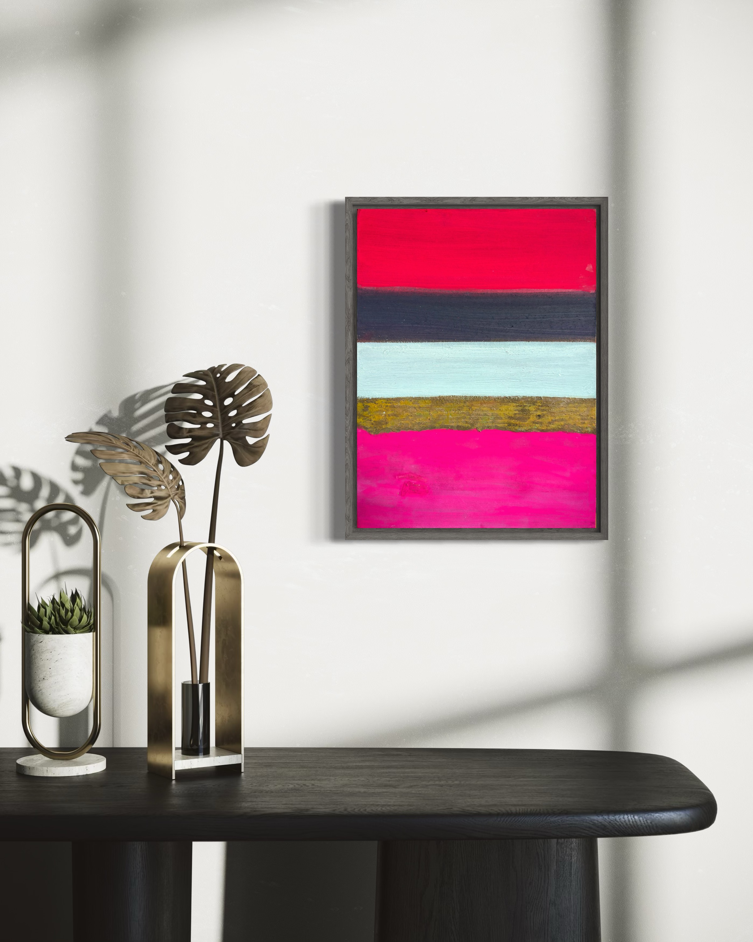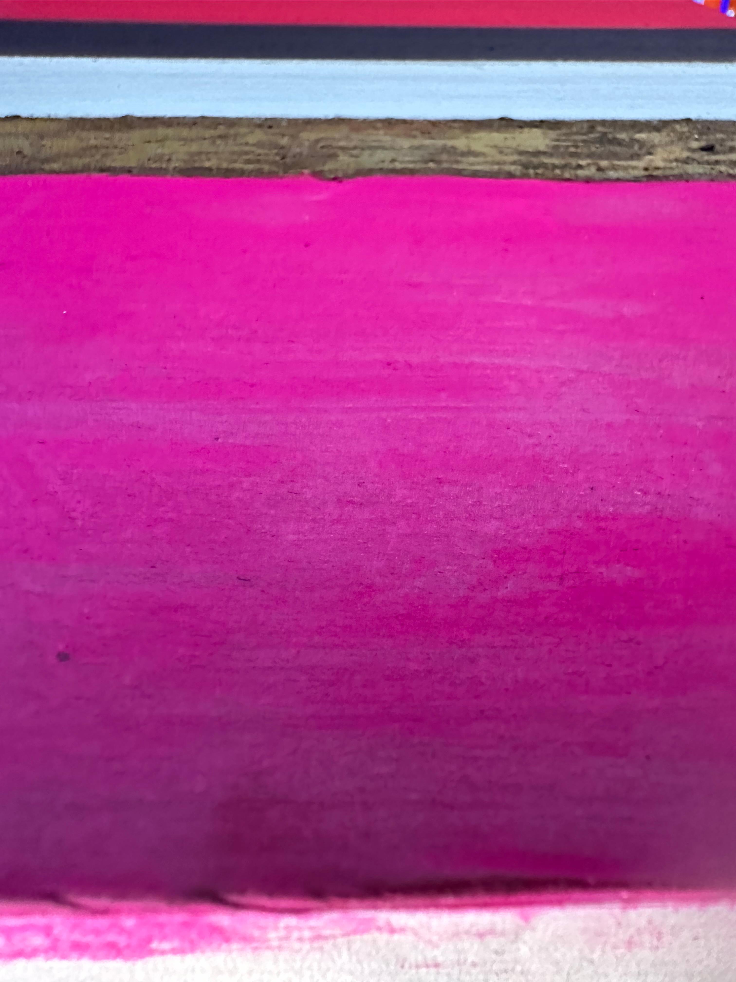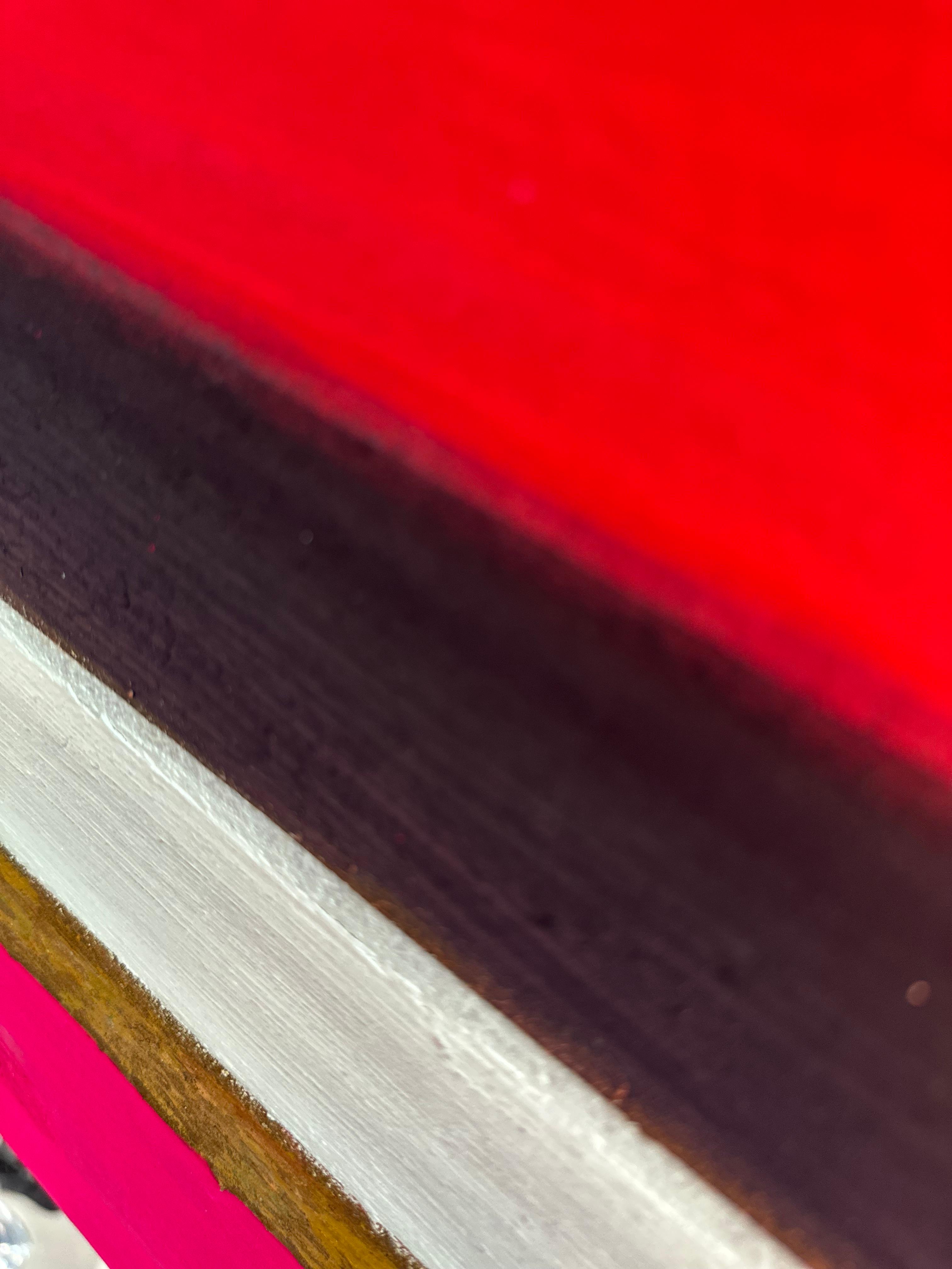 이 작은 형식 안에서 강렬한 색채 대비는 응축된 시각적 긴장으로 압축된다. 작품은 요소들 간의 위계적 관계를 거부한다. 대신 각 띠는 독립성을 유지하면서도 더 큰 구성적 역동성에 기여한다. 산화된 표면의 불규칙한 돌출부들은 빛을 포착하고 방향을 바꾸며, 관찰 각도와 시간에 따라 변하는 그림자를 만든다.