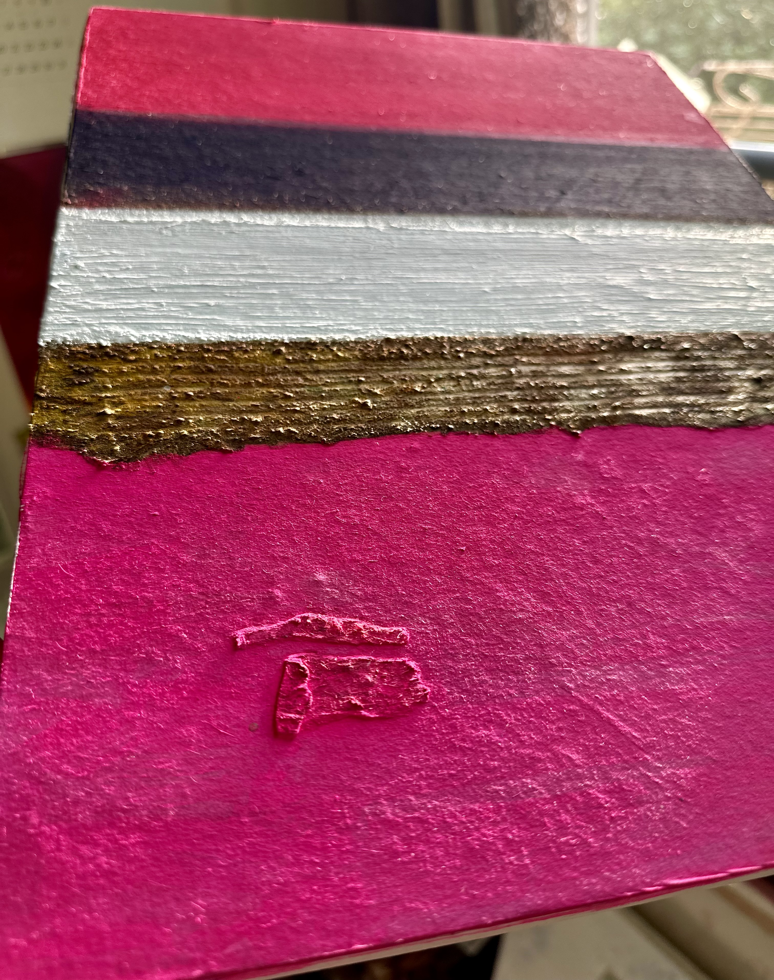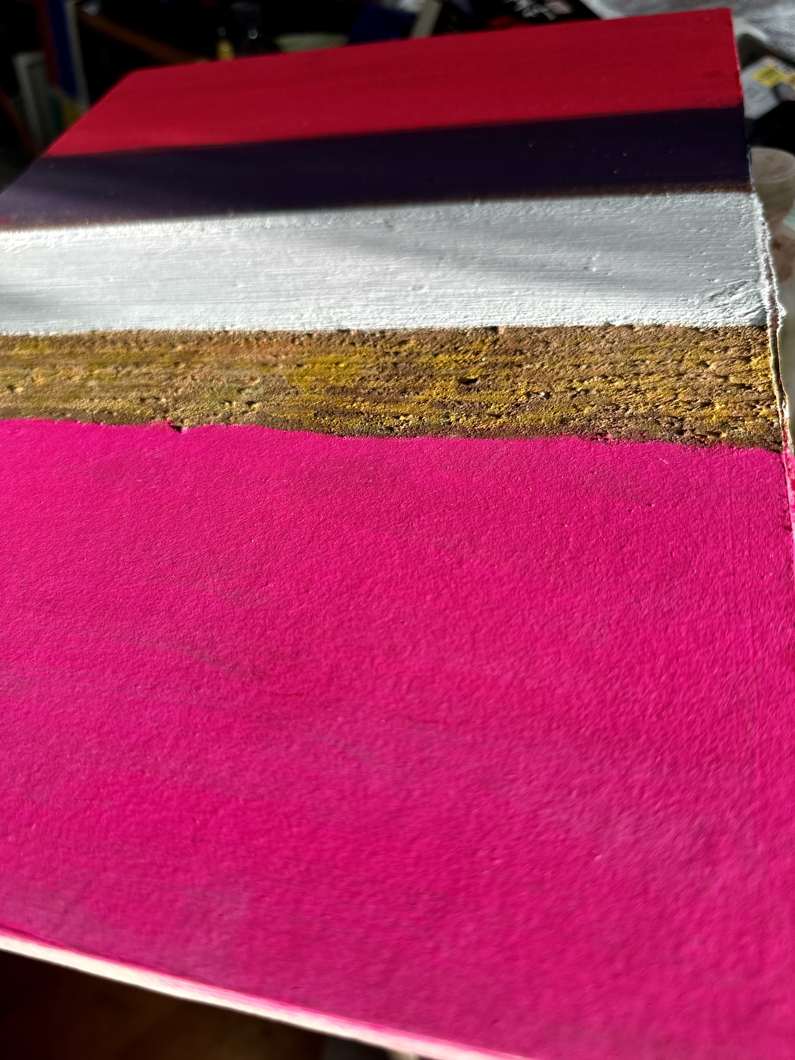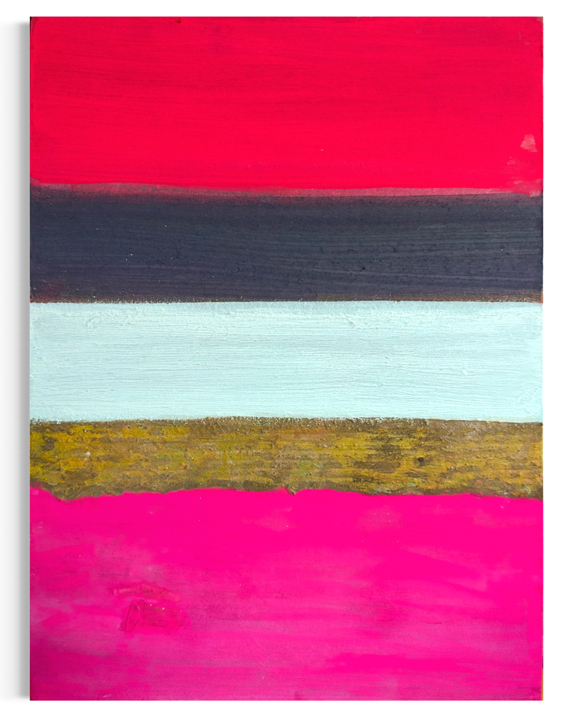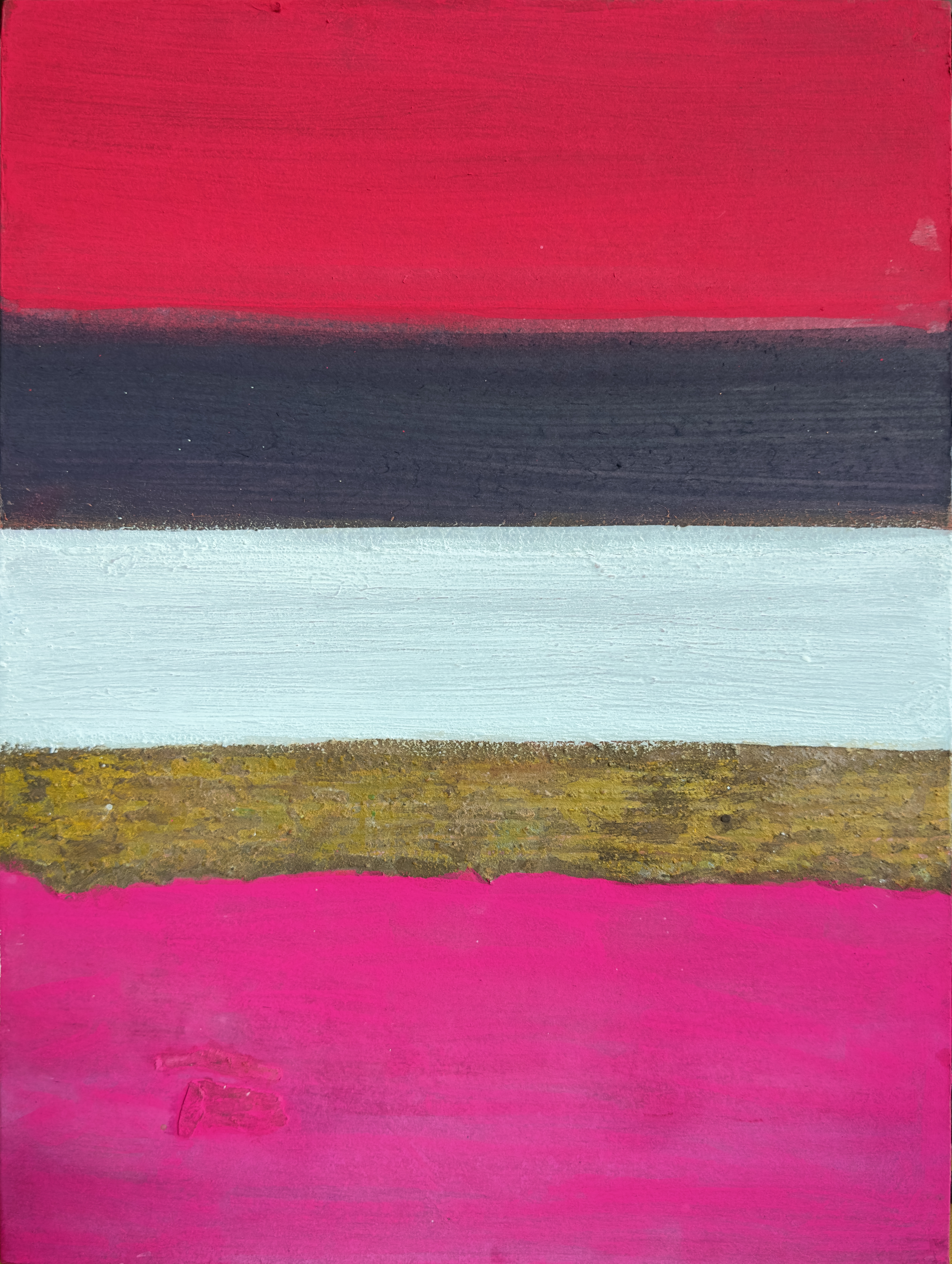 This 40×30cm work on hanji board presents a deliberate collision between two-dimensional painting and three-dimensional materiality. Five horizontal bands traverse the surface, each asserting its distinct physical presence while engaging in visual dialogue with adjacent elements.